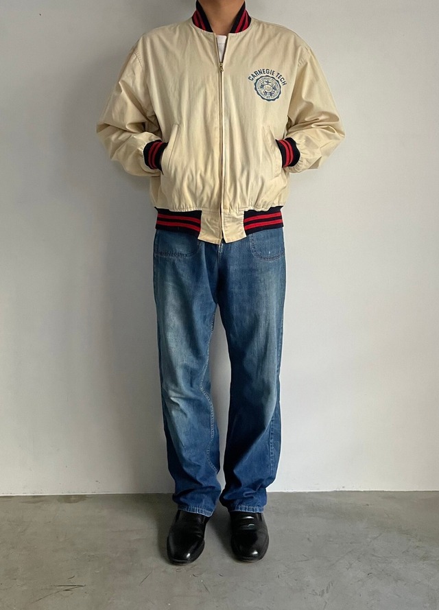 ABOUT 1960’s JOHN TRAINING SCHOOL レイカーズカラーの様なパープルとビビットなイエローが特徴的。 コンパクト、ミニシルエットのビンテージスウェットです。 ジップの走りが短いため着用時に前のジップを開けるとなんだかシャツのボタンを開けて来ている時のような首周りシルエットになります。それが素敵。 至極アメリカンなアイテムな筈ですが、サイズや色味からでしょうか何処かまた違う新鮮な印象を受けるのは気のせいですかね?なににせよかっこいいスウェットです。 SIZE 肩幅48.5 身幅49 着丈49.5 袖丈43 (cm) 着用身長161cm CONDITION 左肩上、穴 前身、ロゴ下に薄くシミ