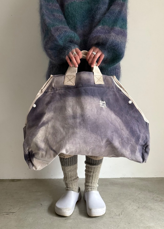 ABOUT 1940’s- ビーントートやツールバックの様な中厚手位のキャンバス生地です。 とってもとってもとっても、かっこよく褪色したラグキャリーバッグをアメリカで見つけたので何とか街で使って少しの違和感!くらいに収まるようにならないか工夫しました。 先ず使用にあたって大き過ぎる間口をスナップボタンで調節できる様にドッドボタンと余り部分にリベットを付けました。 確かに普段使いには大きいですが、そのぐらいのちょっと不便を楽しむ。みたいな気持ち忘れない様にしたいですね。何でもかんでもコスパ!って古着には余りそぐわない気がします。 古いベルシステムのカバンの派生,そんな雰囲気を感じられます。 スタイリングを作る上でとっても重要な要素の一つになる事ができる、そんな存在感のある古いカバンです。 SIZE 縦45.5 横32〜69 持ち手26 (cm) 着用身長161cm CONDITION FADED 使用に際して不便になる様な不備はありません。
