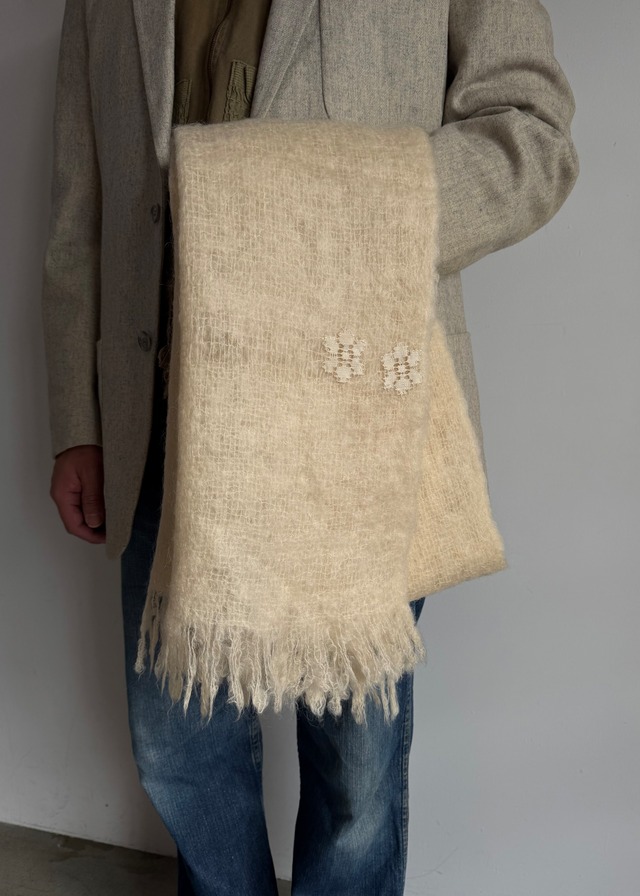 ABOUT 1960-70’s Mohair Scarf 少し大判のクリーム色モヘアスカーフ パッチワークの様に古いレースの生地でリペアをしました。とっても素敵なセンス。 古い服は綺麗に見せてくれるし、新しい服にはちょっと古いエッセンスを加えてくれますよ。 SIZE 全長172 幅45 フリンジ7 (cm) 着用身長172cm CONDITION GOOD