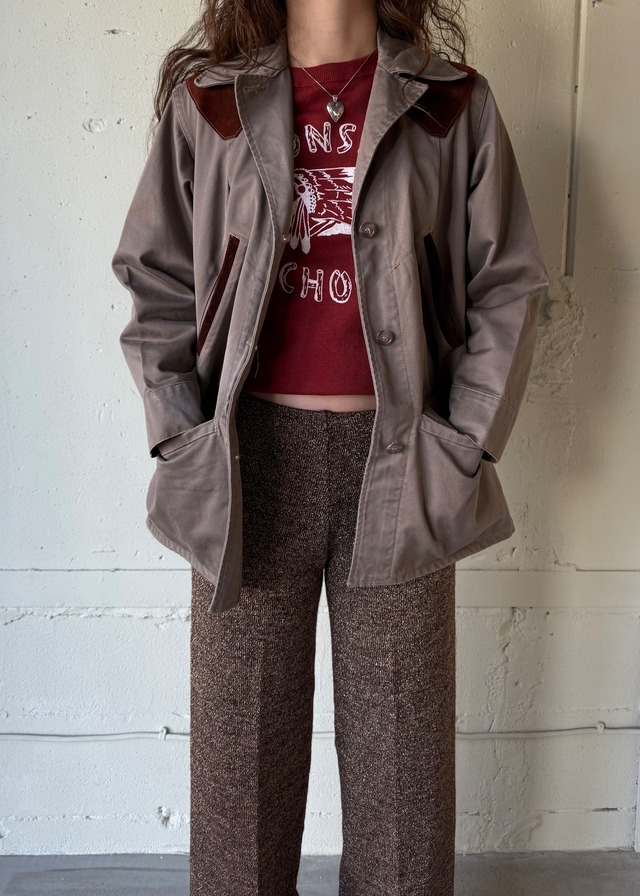 ABOUT 1960-70’s STEIN’S クリーム色とグレーの混じった様な色です。ポケットのカットがスクエアになっていまして、ジャケットながらも優しいイメージです。 ハンティングのベストに合わせていますがフットボールシャツに合わせるなどもいいですね。 状態もとっても綺麗!ではないので寧ろ雑に使ってみるなんていうのはどうでしょう。 SIZE 肩幅45 身幅53 着丈79 袖丈63 (cm) 着用身長172cm CONDITION 左肩裏と左ポケットに薄く色焼けがあります。