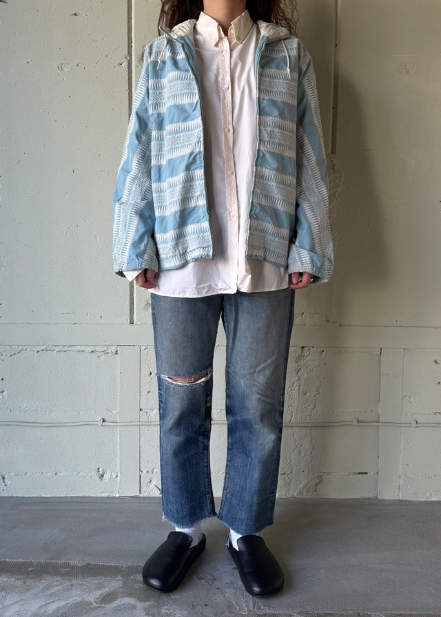 ABOUT 1970’s Patchwork アメリカの中西部の地名が書いたものが多いです。カンザス州あたりに住んでいた方のメモリアルジャケットの様なものです。 パッチの配置も綺麗です。 薄い古いナイロン SIZE 肩幅49 身幅57.5 着丈63 袖丈60.5 (cm) CONDITION 前身右下に薄くシミ