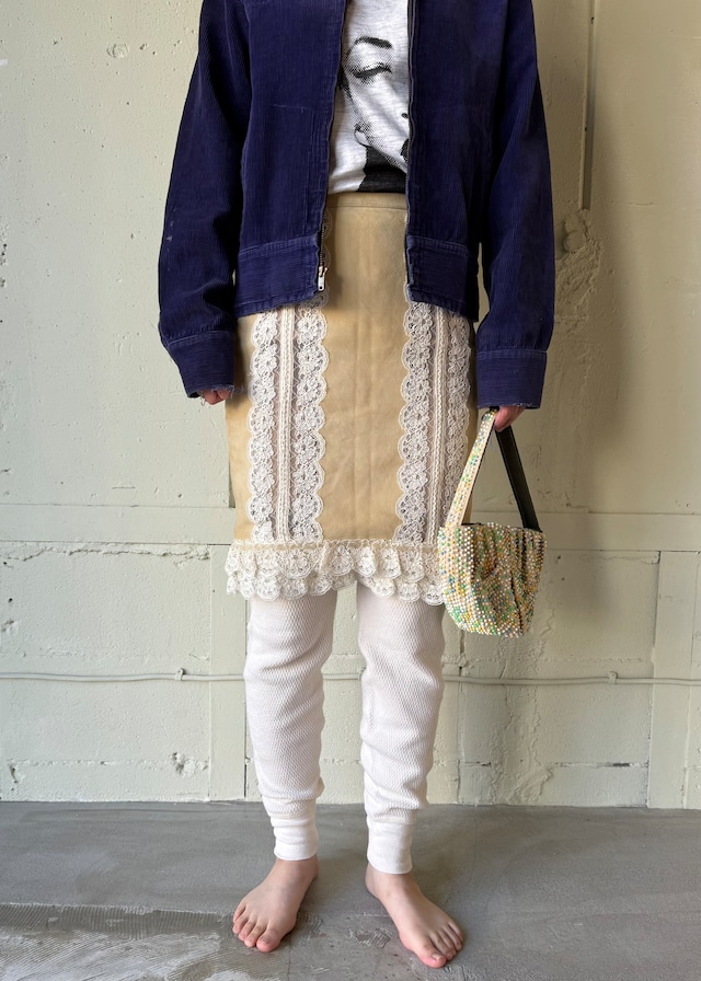 ABOUT VALENTINO Suede midi. skirt 可愛いと思って手に取ったらこちらでした。 デザインこそ入っていますが、合わせているセットアップがduofoldとサーマルパンツのアンダーウェアのセットなのに何処か品を感じます。 ビンテージを楽しく,古着をより楽しく着るアイデアが浮かぶ服ですよ。 SIZE W68 L52 裾幅41 ヒップ84 (cm) 着用身長161cm CONDITION 前身上部中央にスレ ウエスト周り、スウェードサイドシーム周りにややスレによる黒ずみ