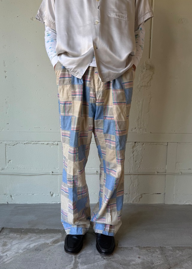 ABOUT 1970-80’s MURRAY’s Toggery Shop NANTUCKET ISLAND Patch-work pants ブルー、ピンク、砂の色まさにゆったりとした雰囲気の良いリゾートの様なカラーですね。 マサチューセッツ、ナンタケットアイランドのお店のパンツです。このくらいの年代のインディアンマドラスを使用したパッチワークパンツの気になる柄のものにはナンタケット島のテーラーのタグがついていることが多いです。 ナンタケットアイランドというと、昔からアメリカの東海岸の富裕層がバカンスに訪れる島で大きなお金を使う人が多い分質の良い服が沢山作られたのでしょうか。 Willie WrightのNantucket Islandという曲もかっこいいので聴いてみてください。行ったことはないですがきっとこの曲の様な雰囲気なのでしょう。 SIZE W104 L110.5 股下78.5 ワタリ33 裾幅26 (cm) 着用身長172cm CONDITION 左ポケット横、薄くシミ