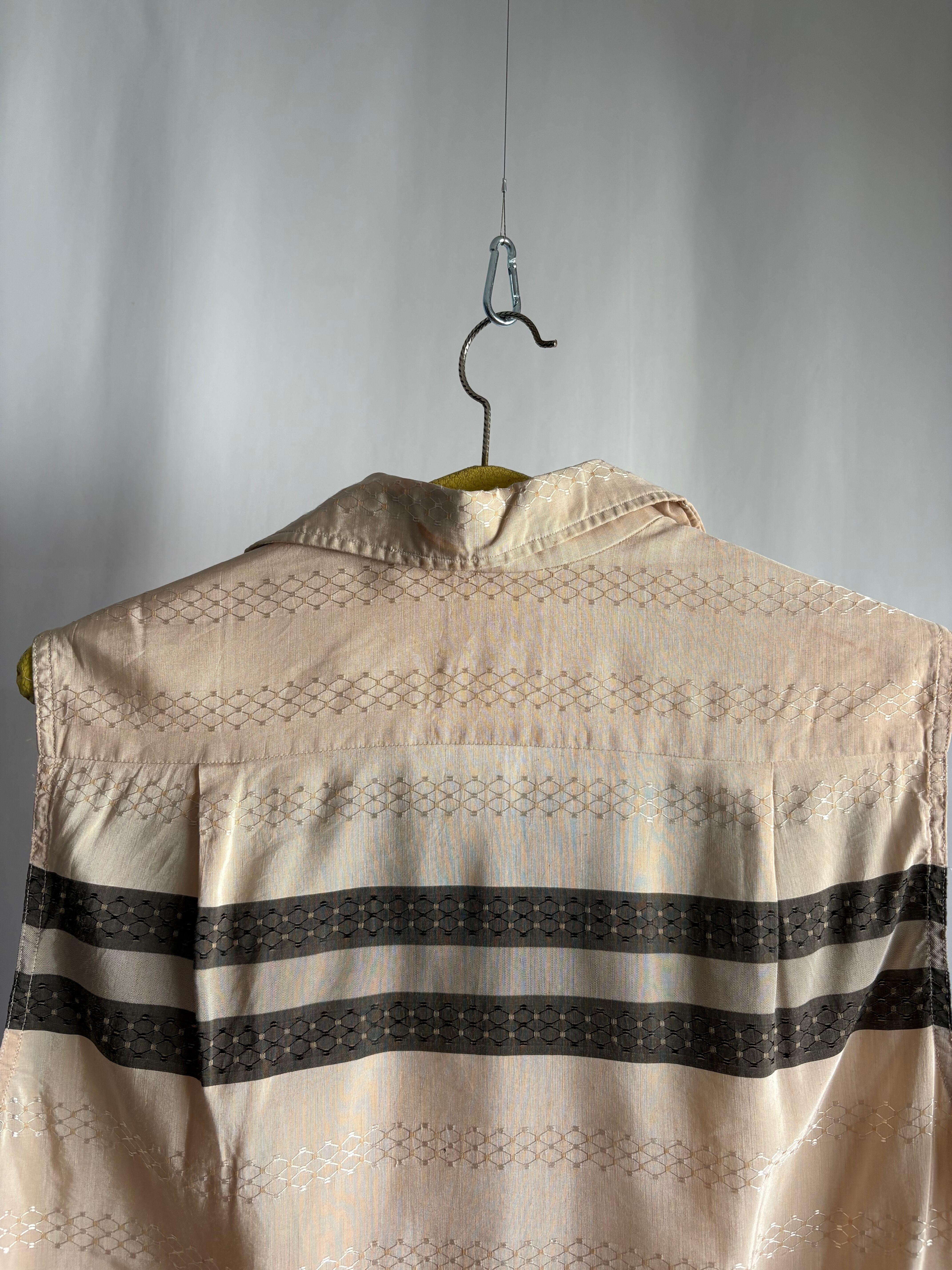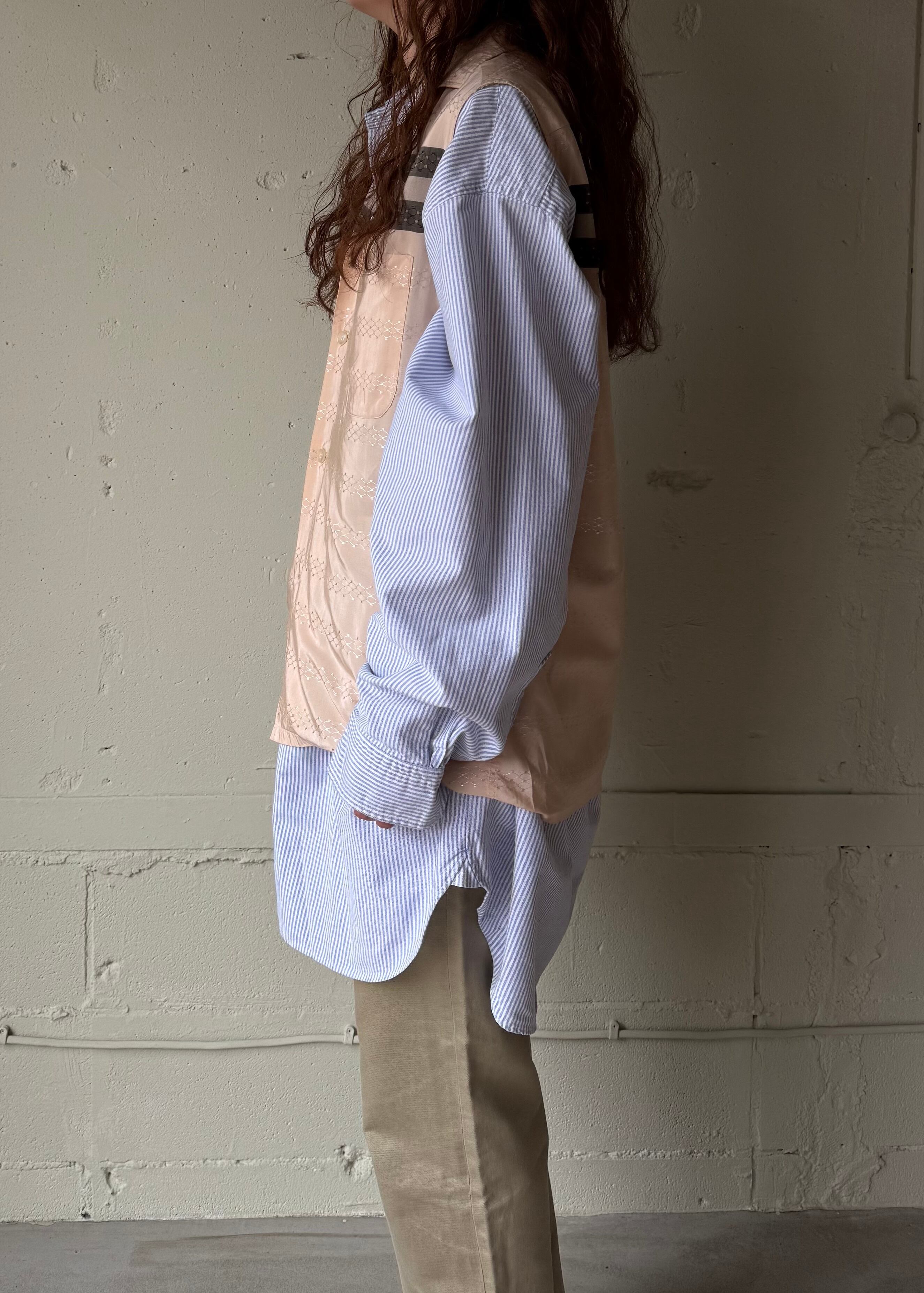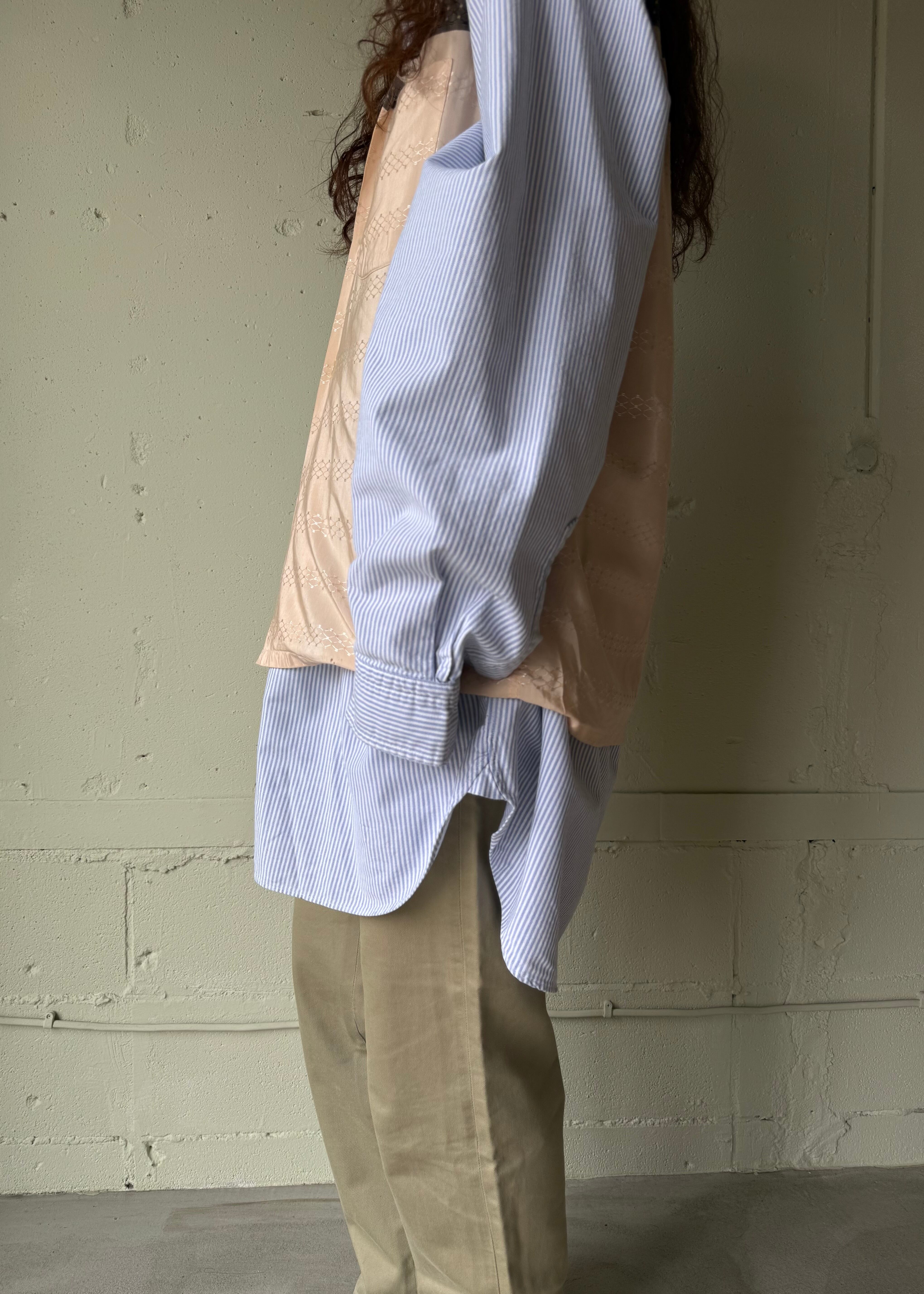 変わった生地のシャツ、袖が見事に切られています。