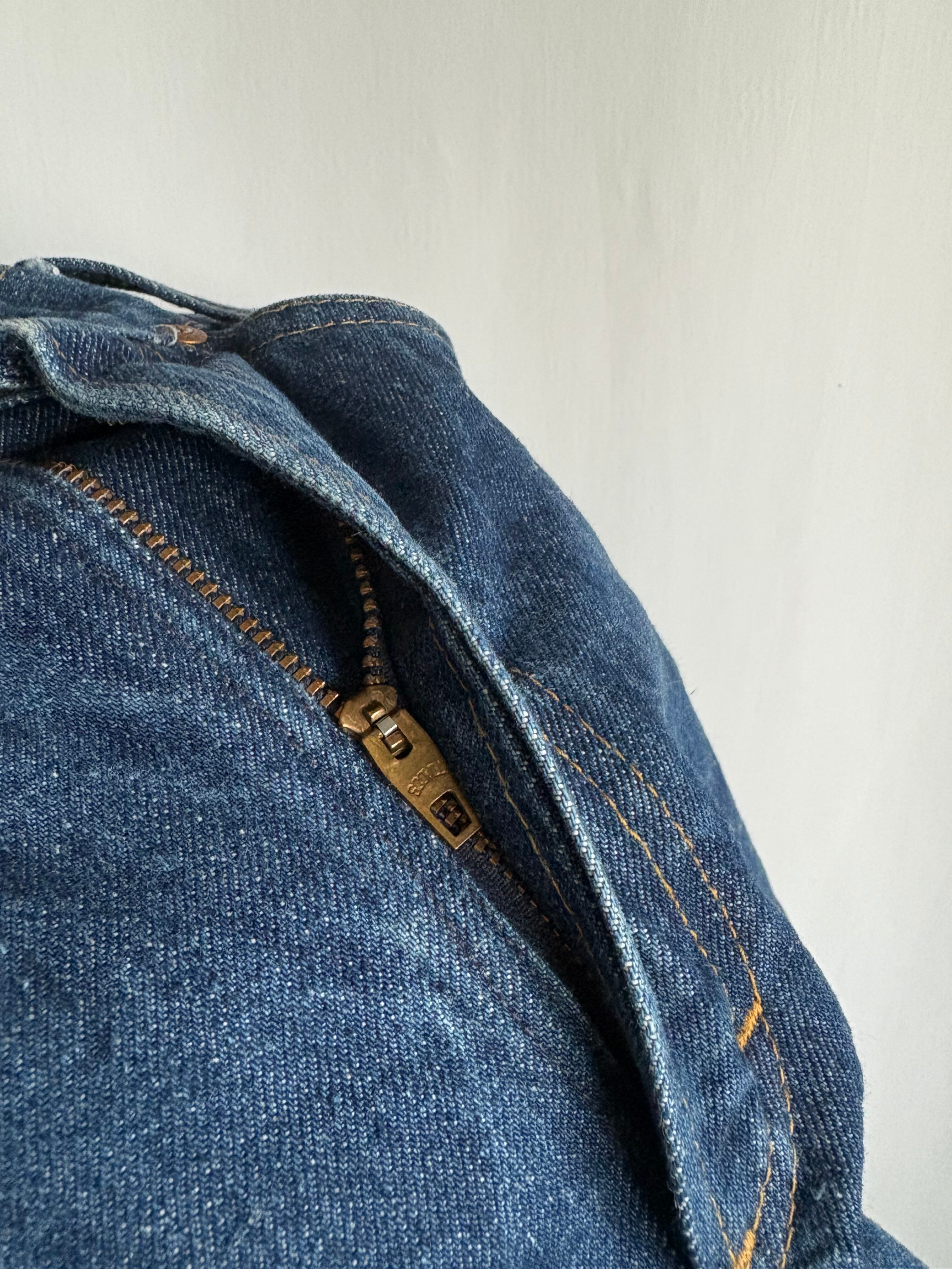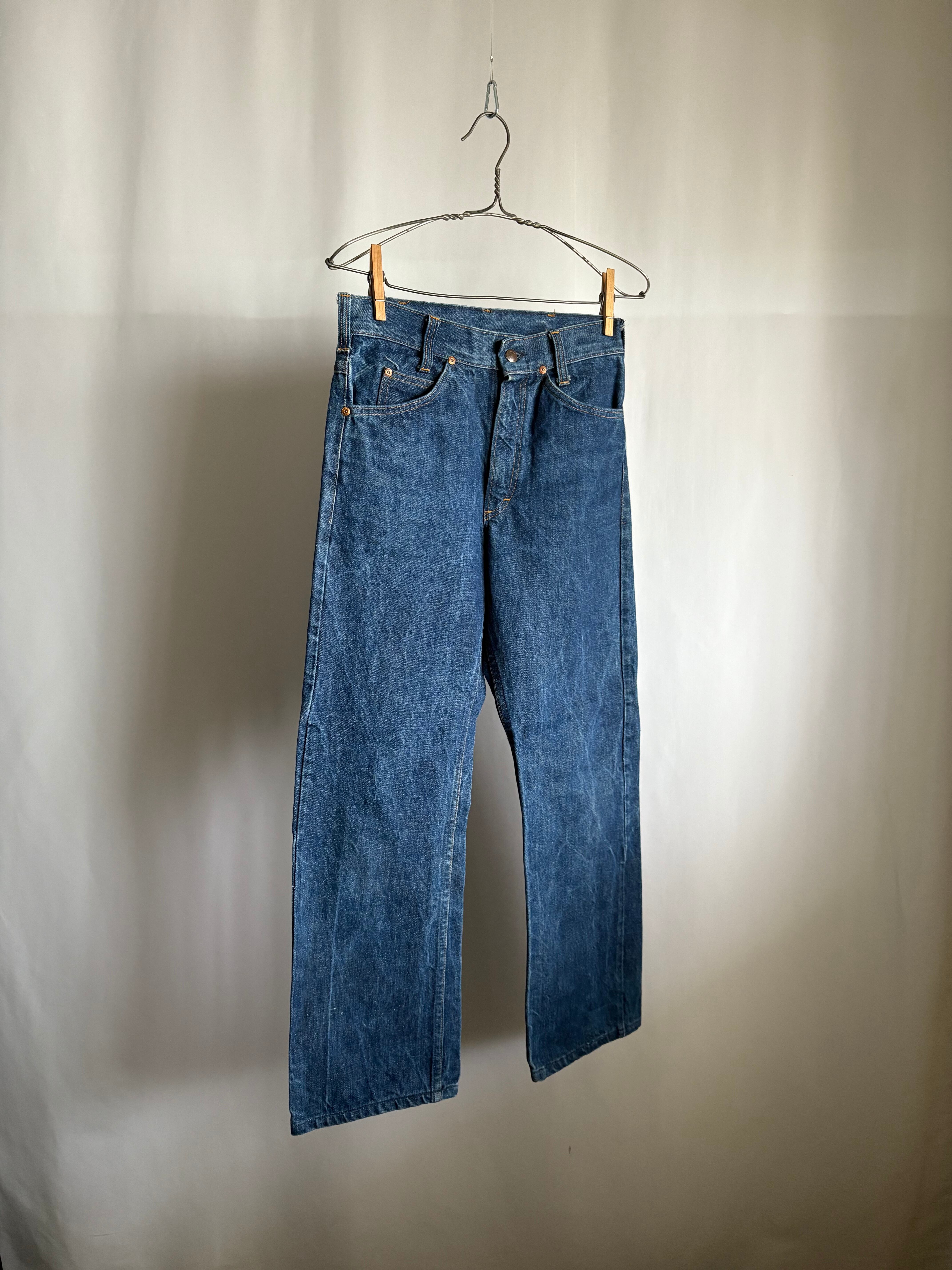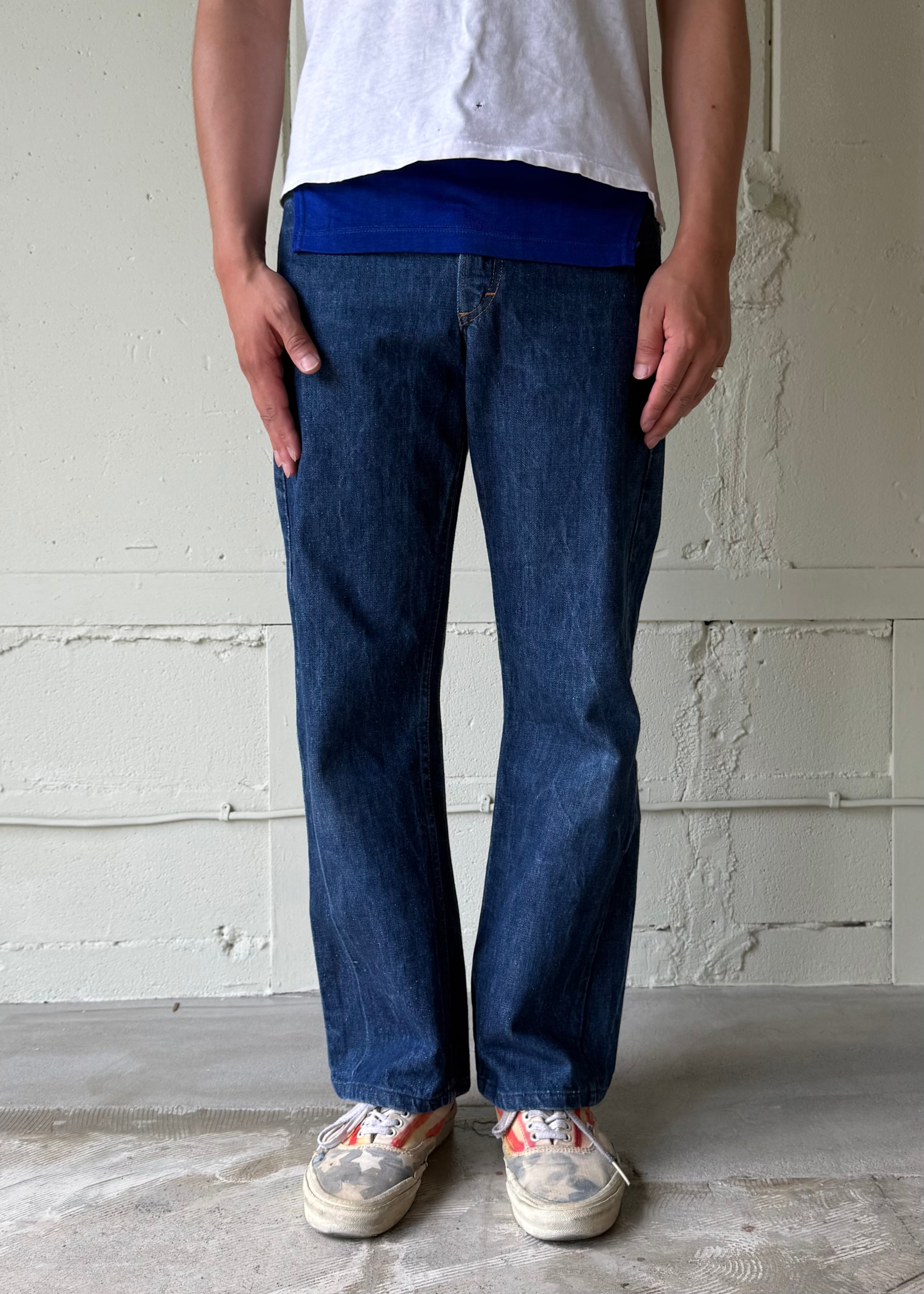 リーバイスよりもラングラーなどのウエスタンウェアに近いデニムのシルエットです。ストレートでこの濃い色、とても綺麗です。