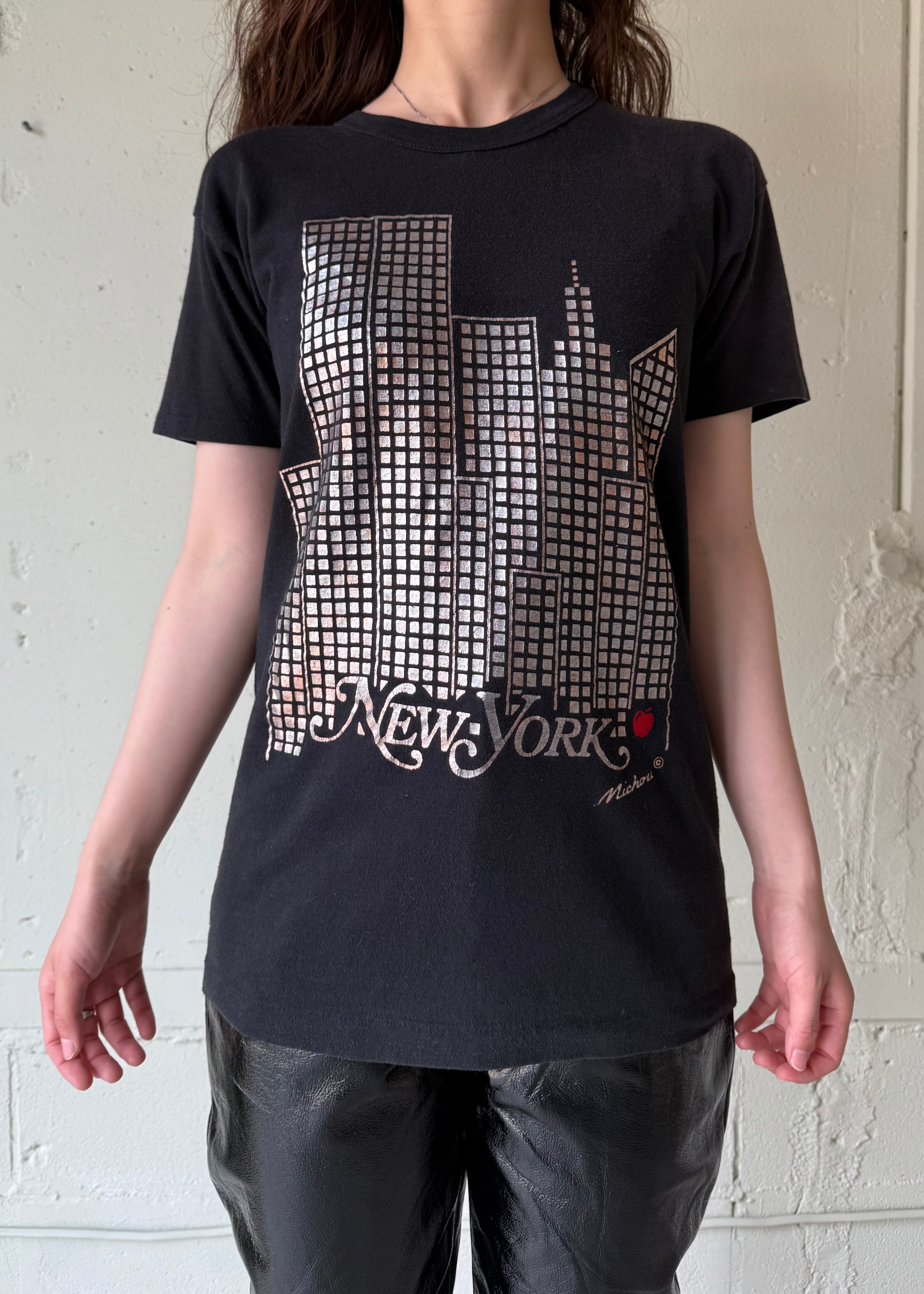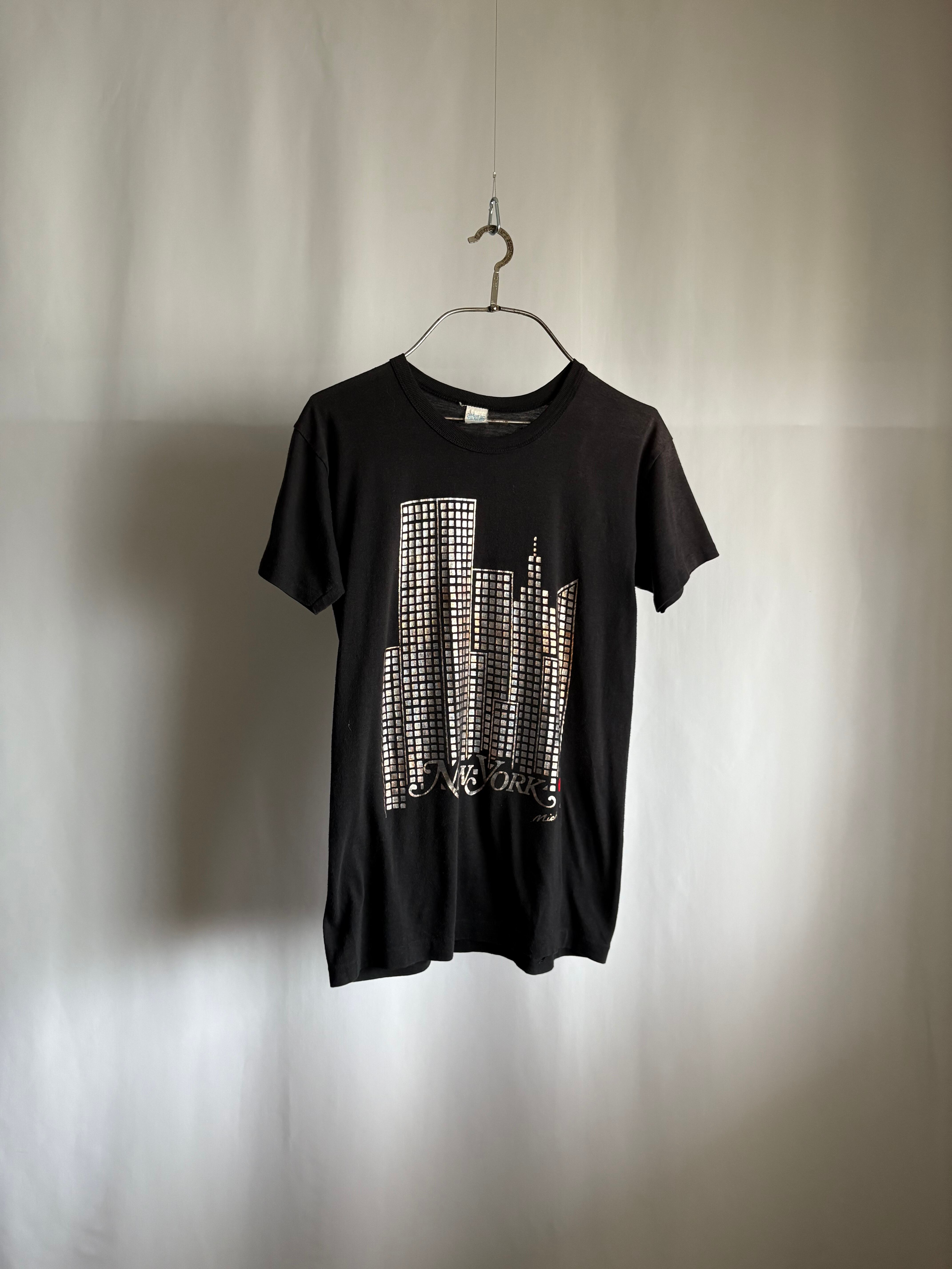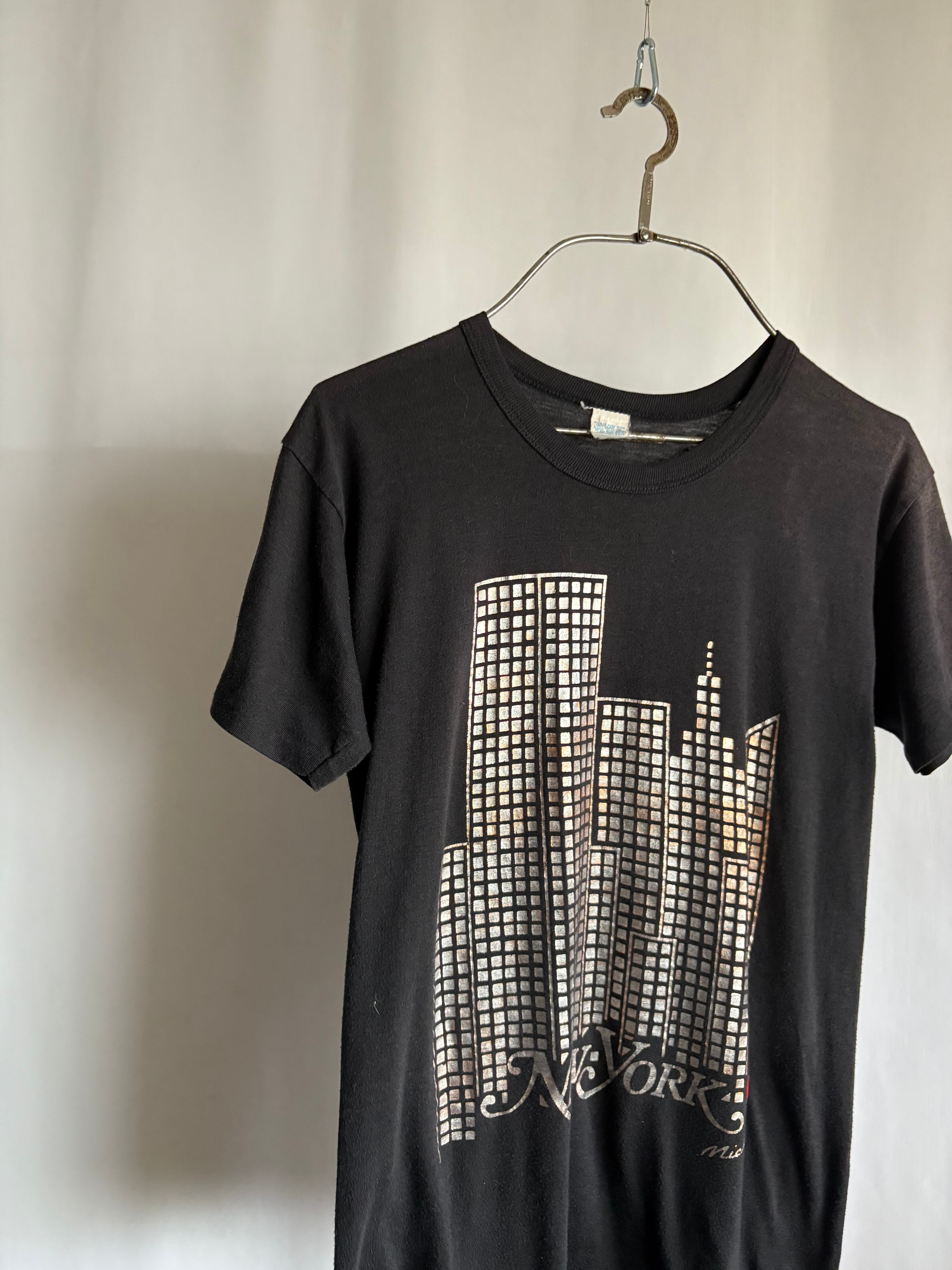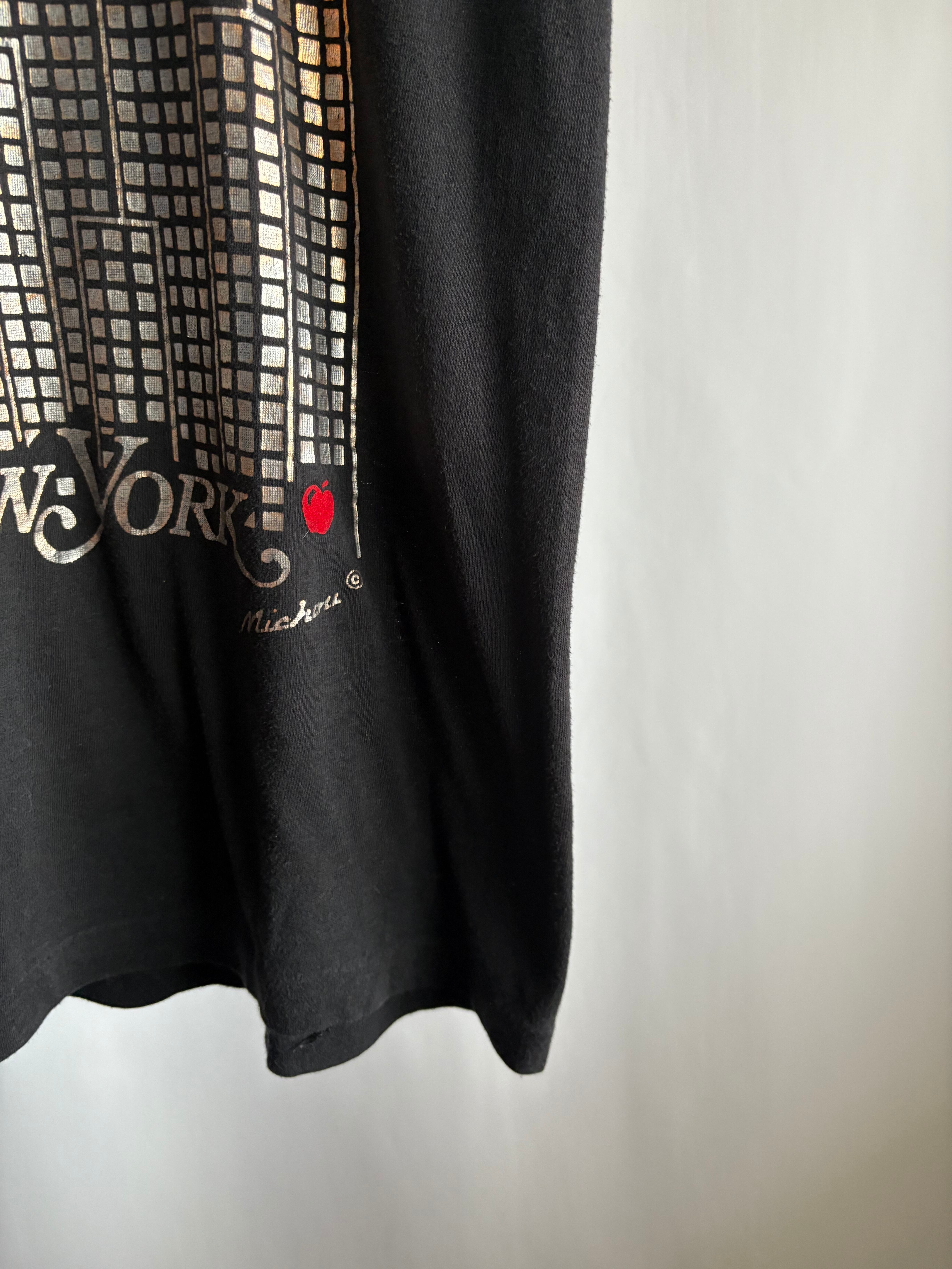 ブラックの薄めのTシャツボディーにキラキラのプリントです。ニューヨークが好きでニューヨークの古めのTシャツも好きです。