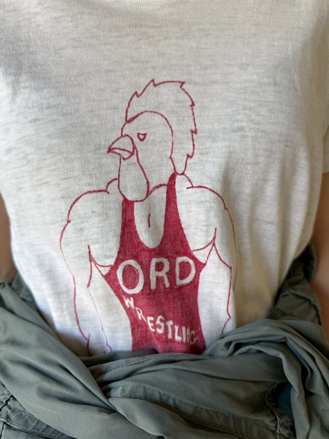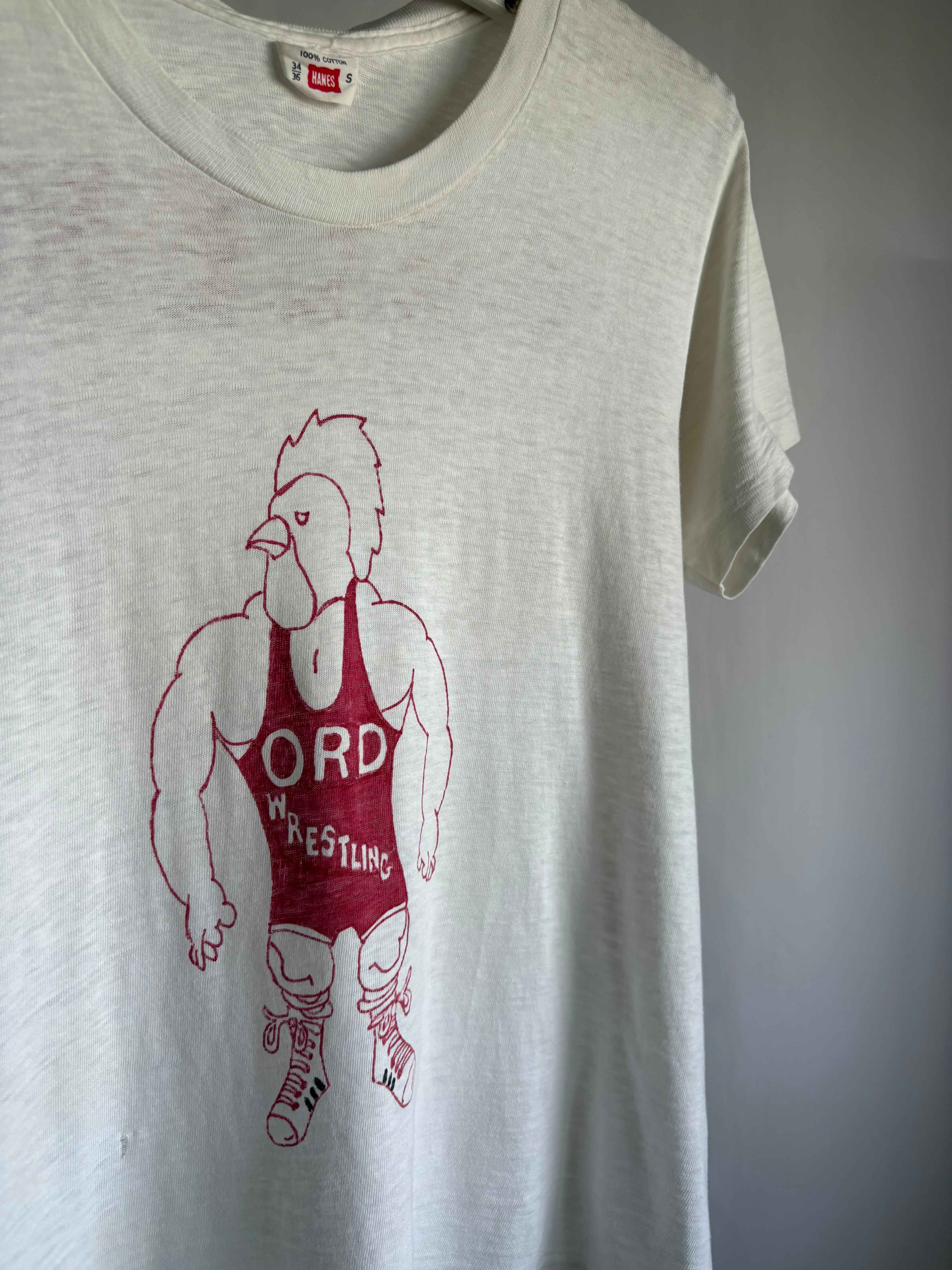 レスリングをするチキンと背面には名前がハンドで描かれています。