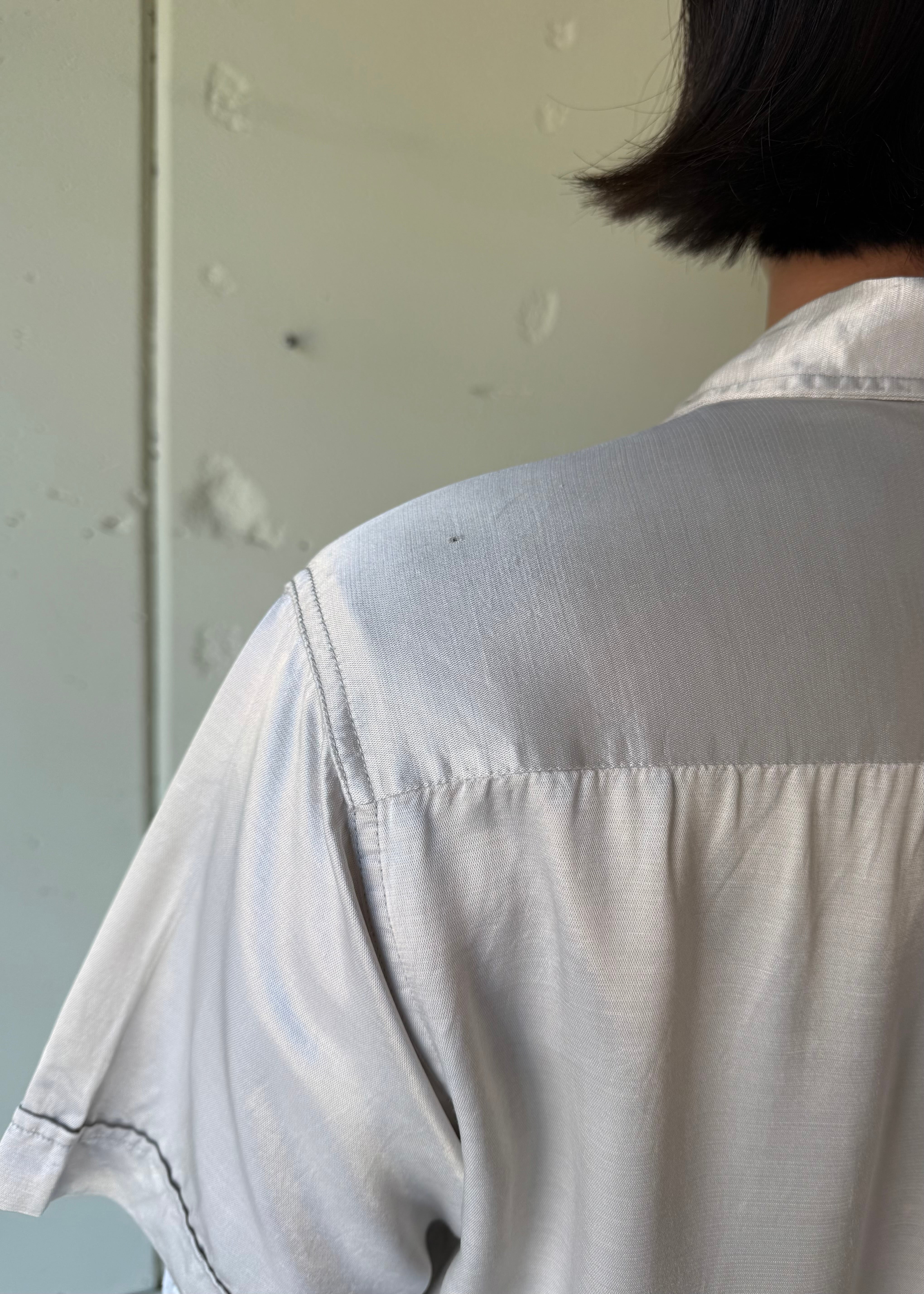 メタリックなシルバーのループカラーシャツ、半袖