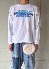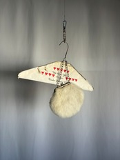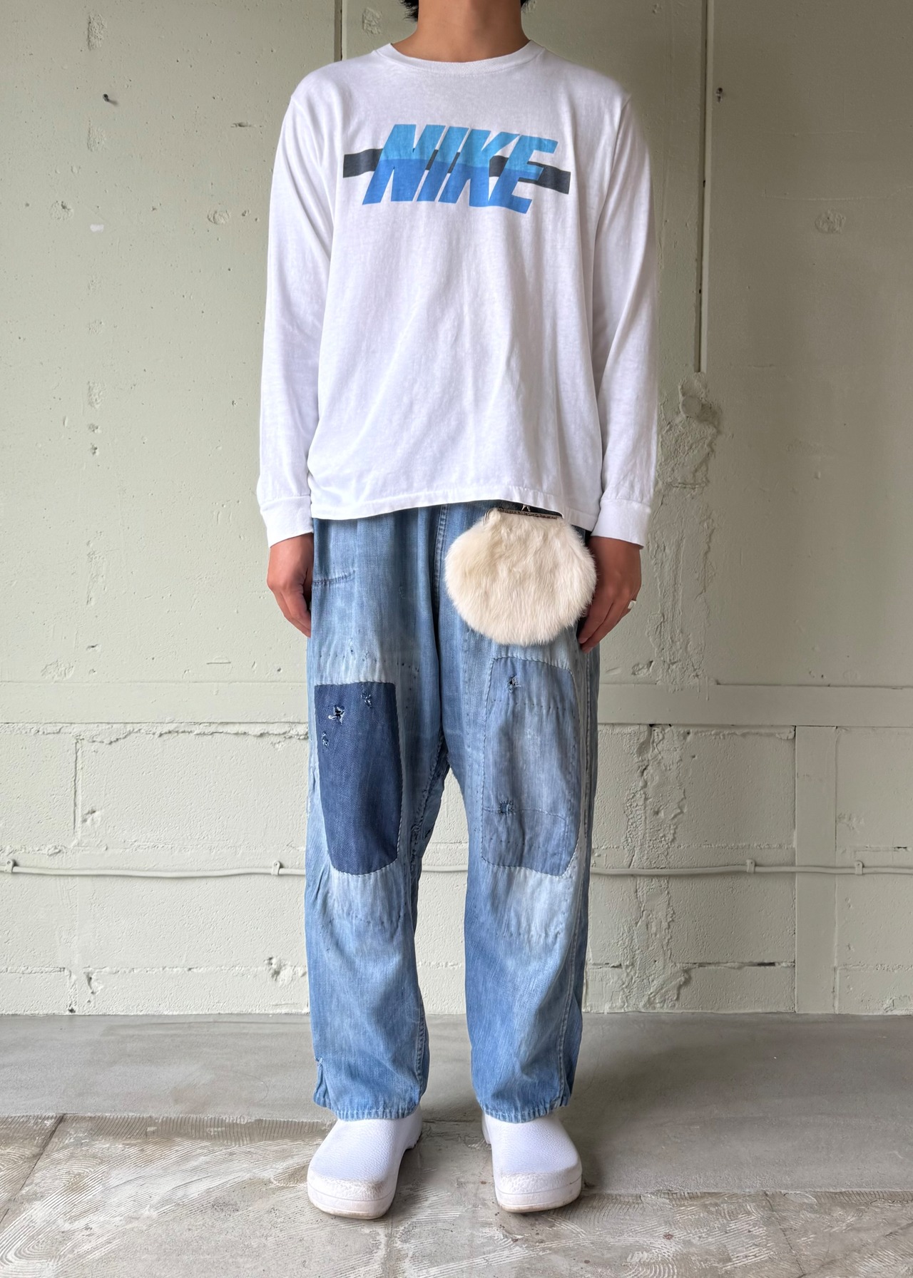 とてもモサモサでふさふさ。チェーンの持ち手付きのポーチですが、ピンで腰につけています。