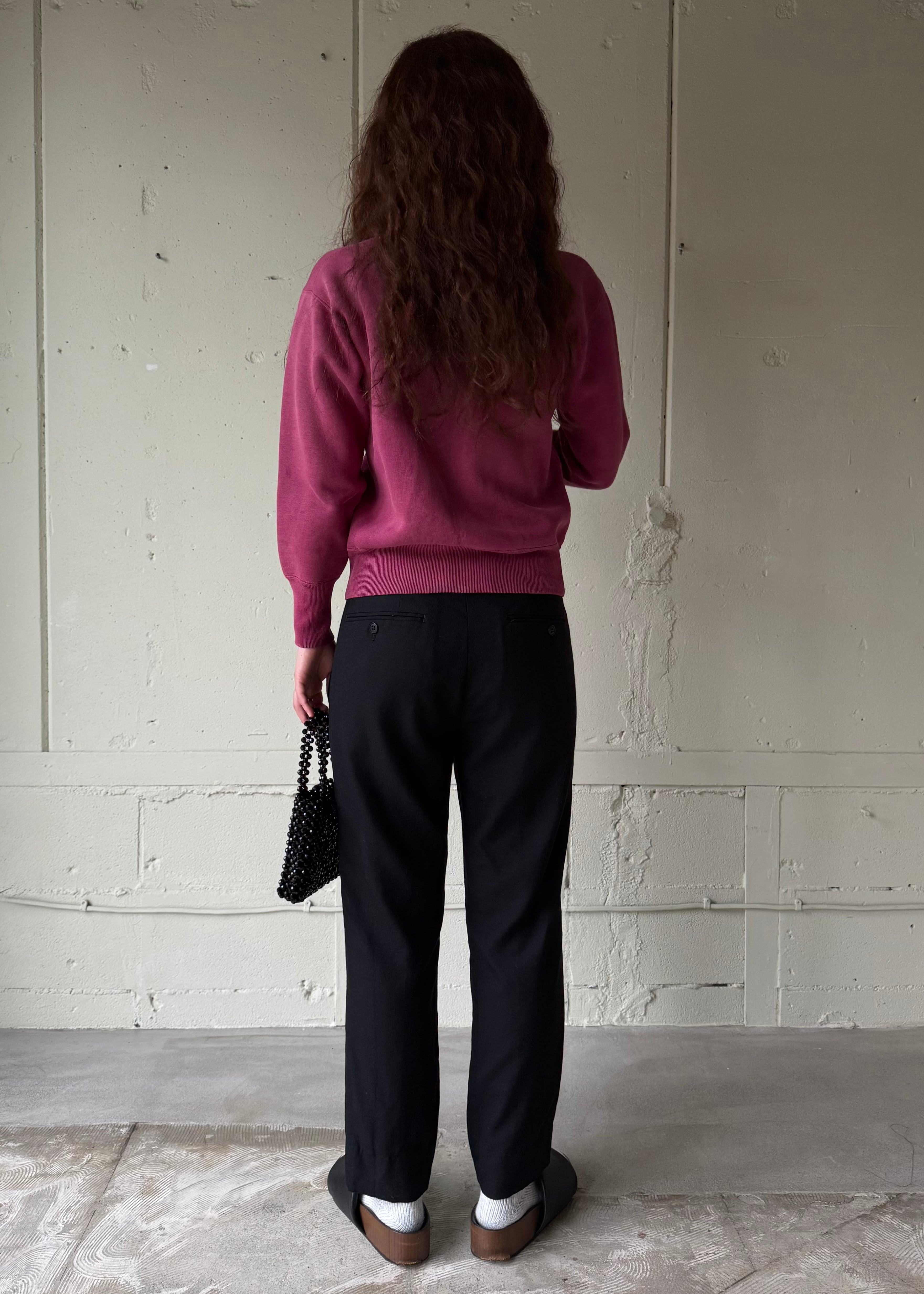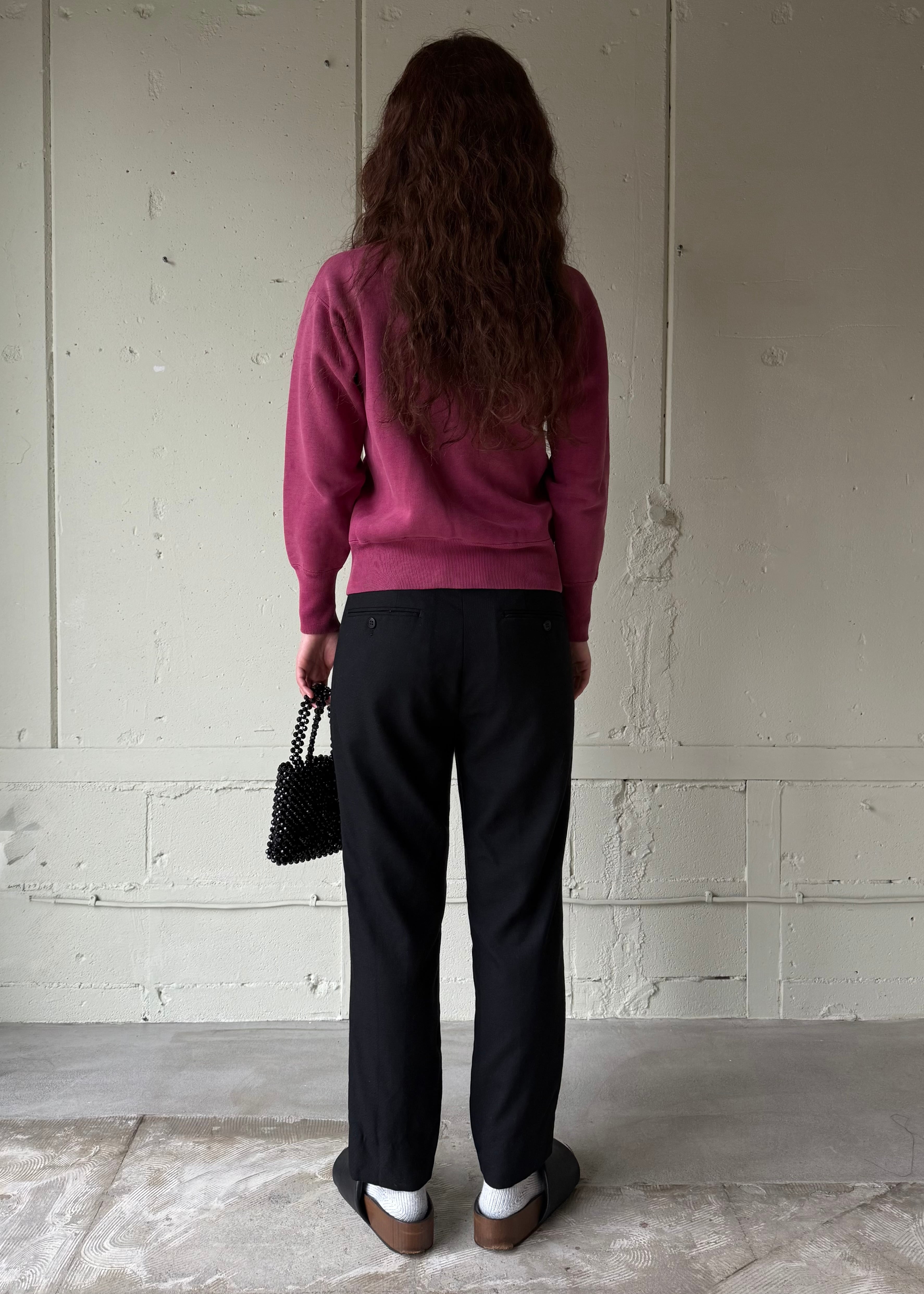 コンパクトなサイズに、地味だけれどいいスラックスを合わせています。主張が激しくないけれども、他にない!そんな魅力的な古い服です。