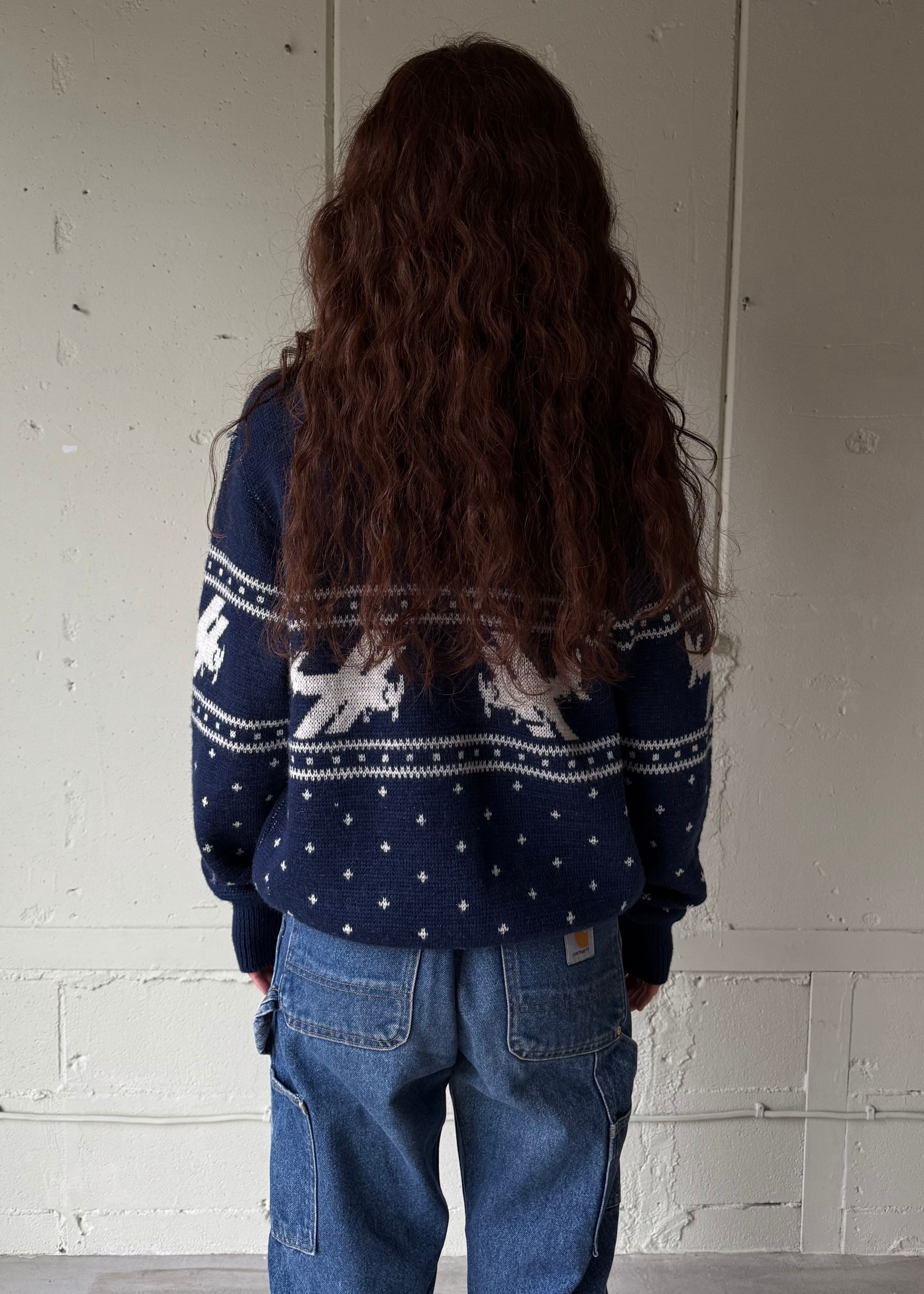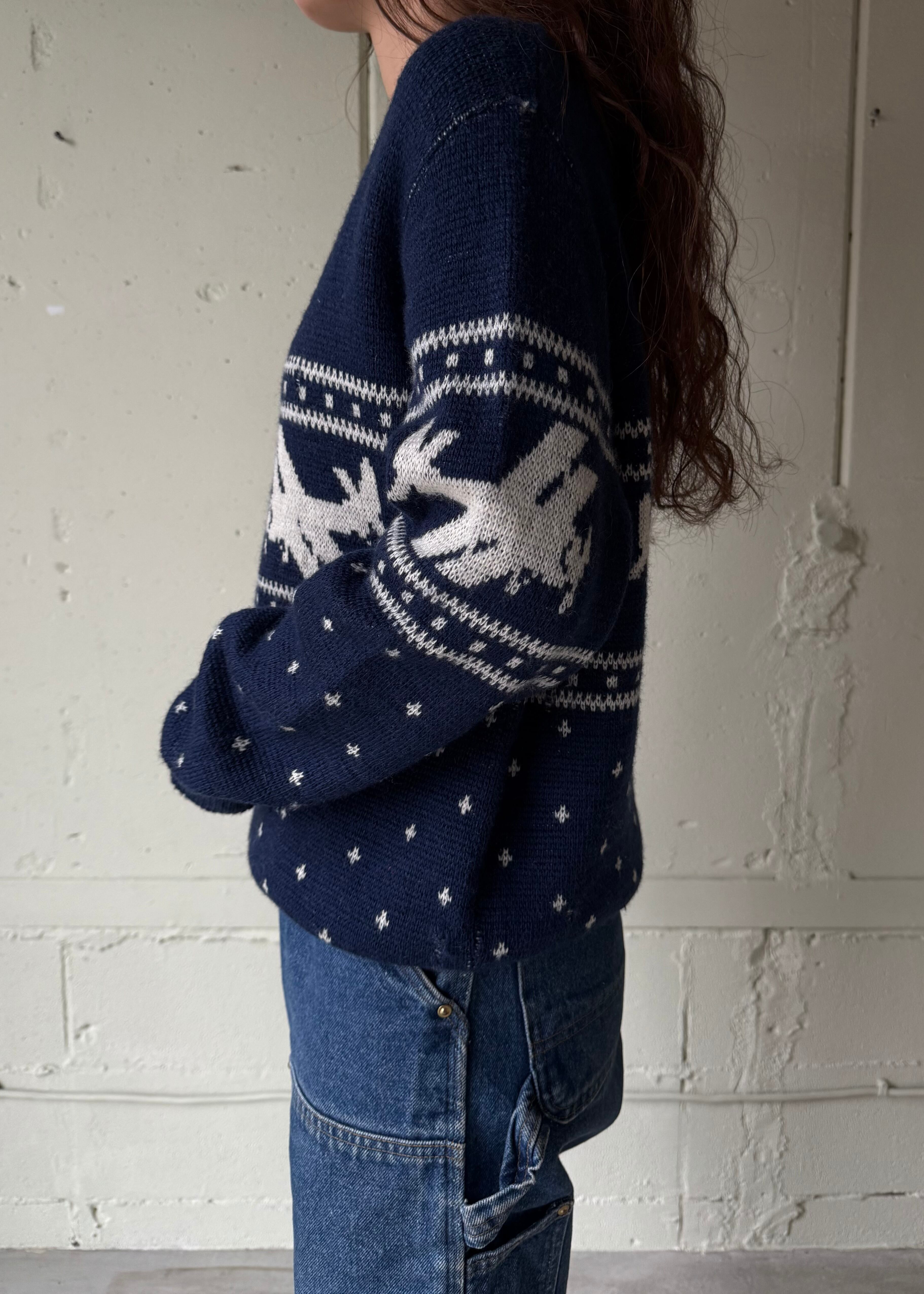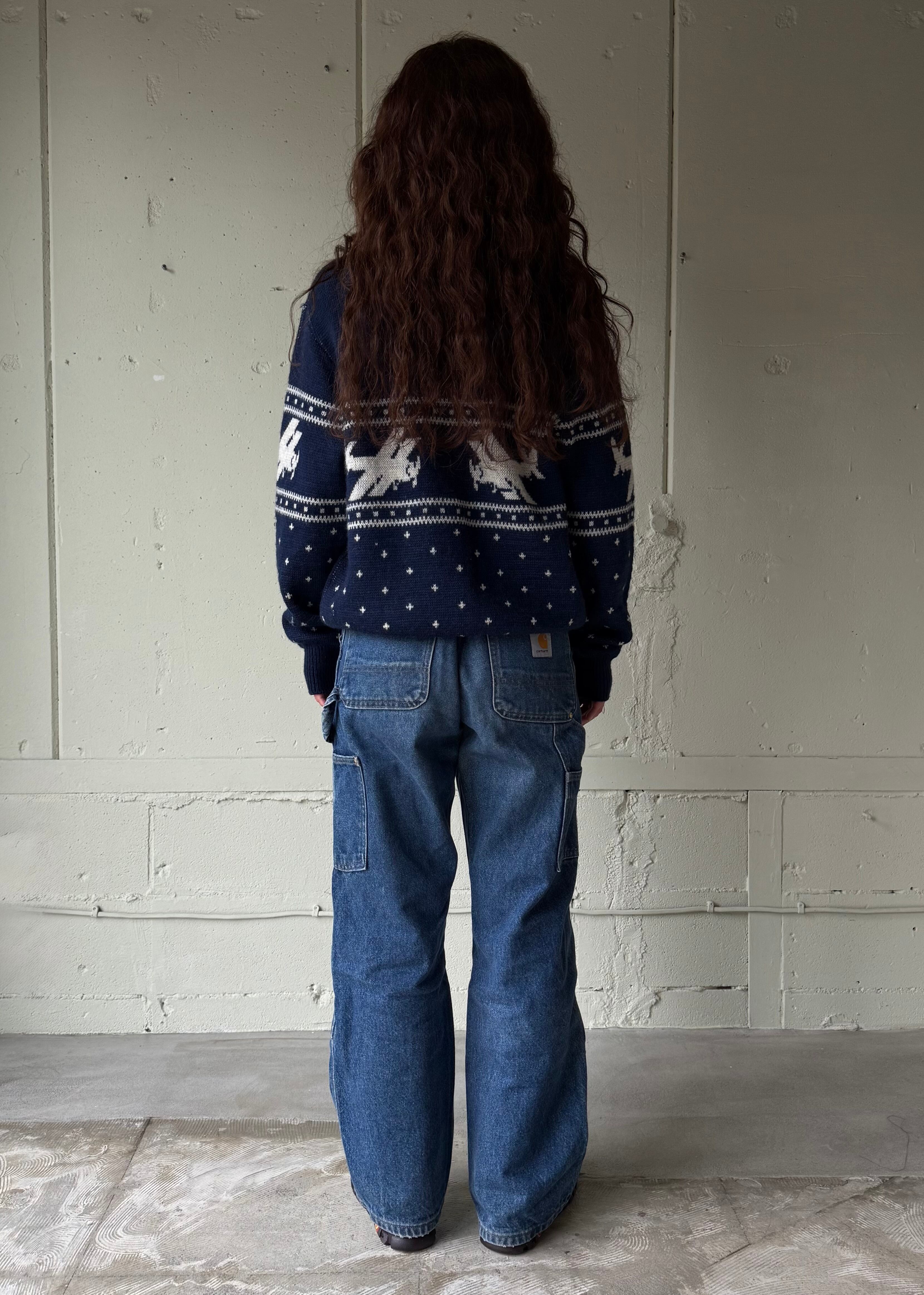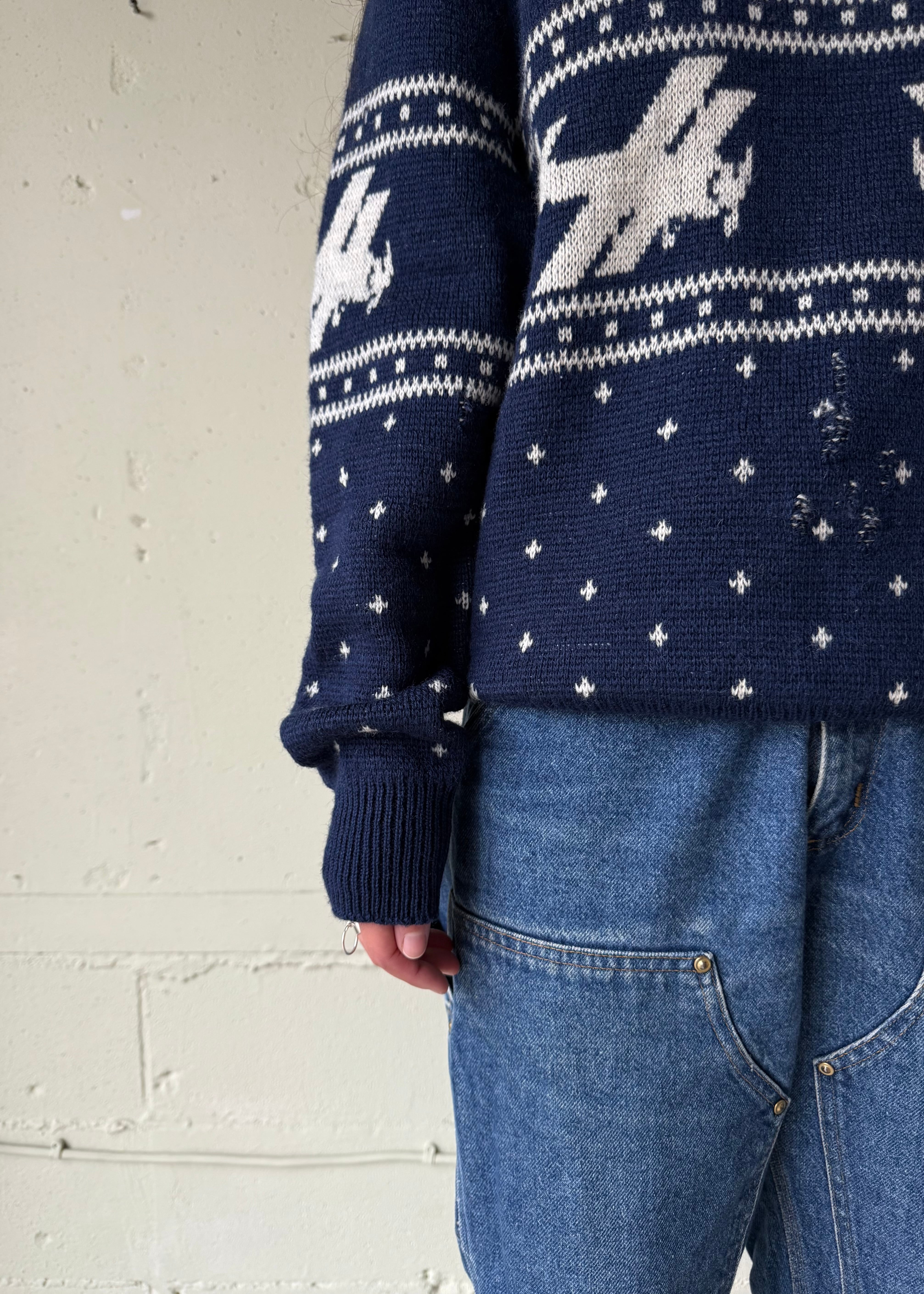 ビンテージのスキーニットなどに見られるこのようなデザインですが,そちらだとどうしても実用性が勝り重ね着が出来るようタイトフィットな作りになります。