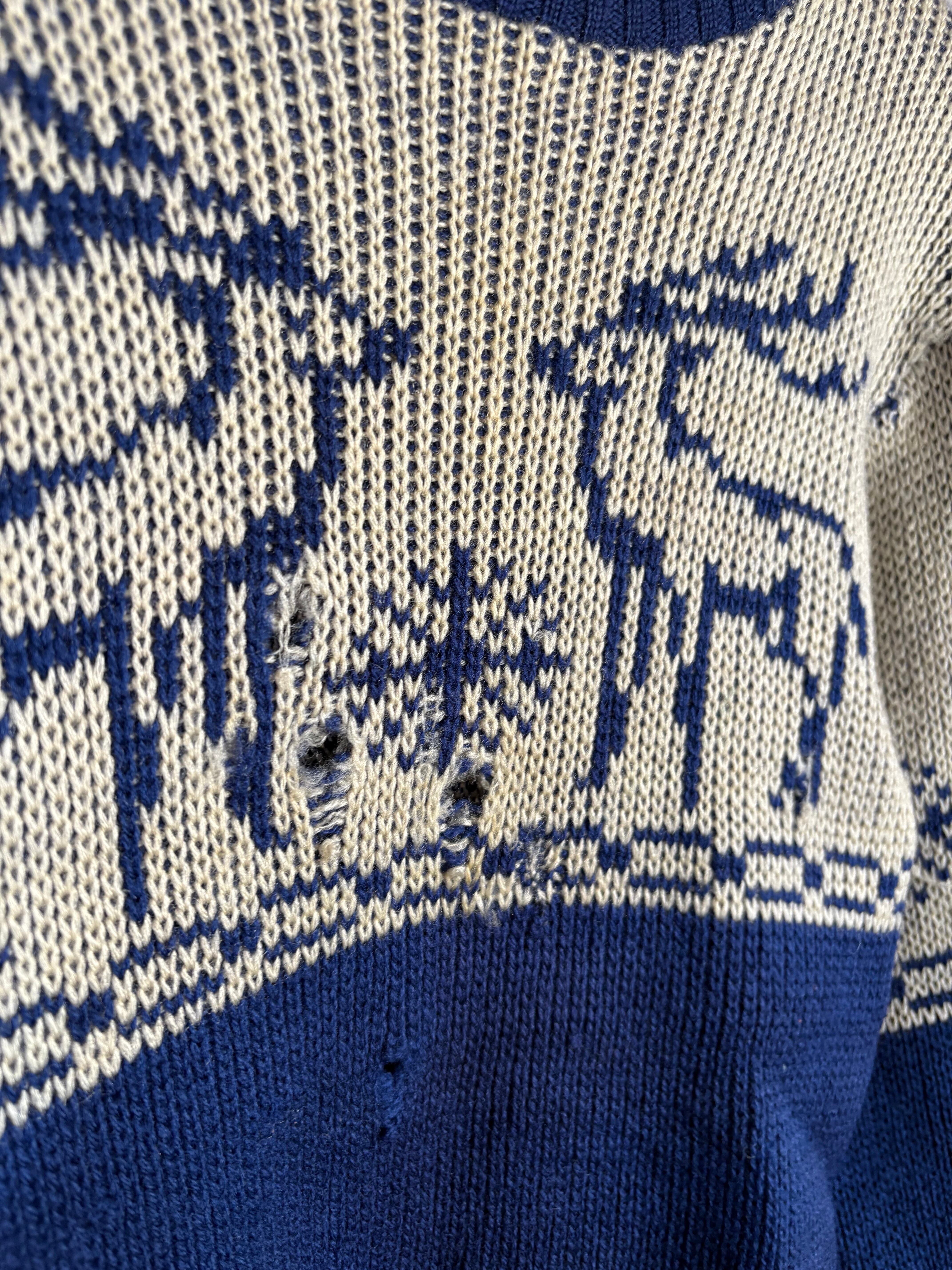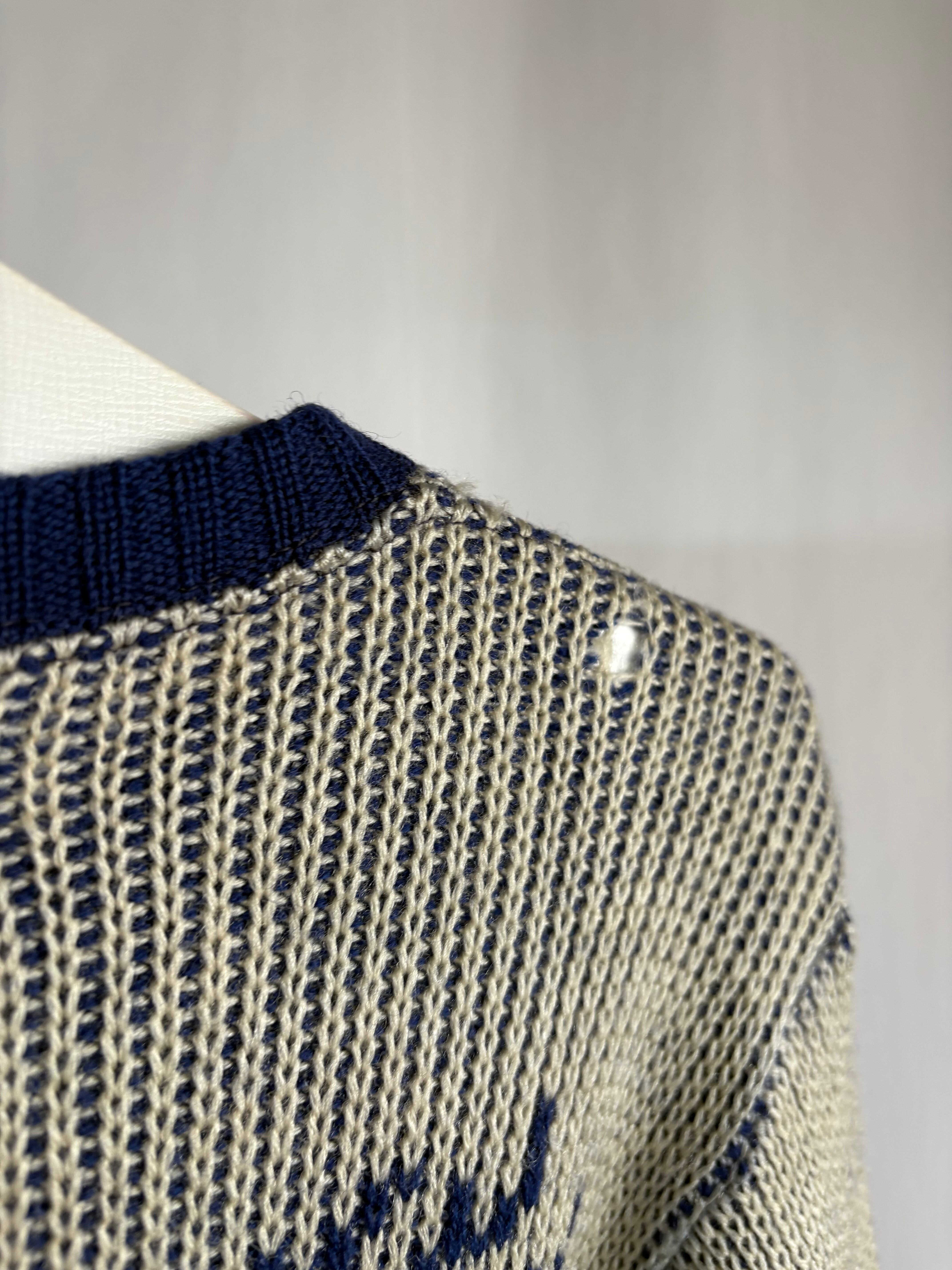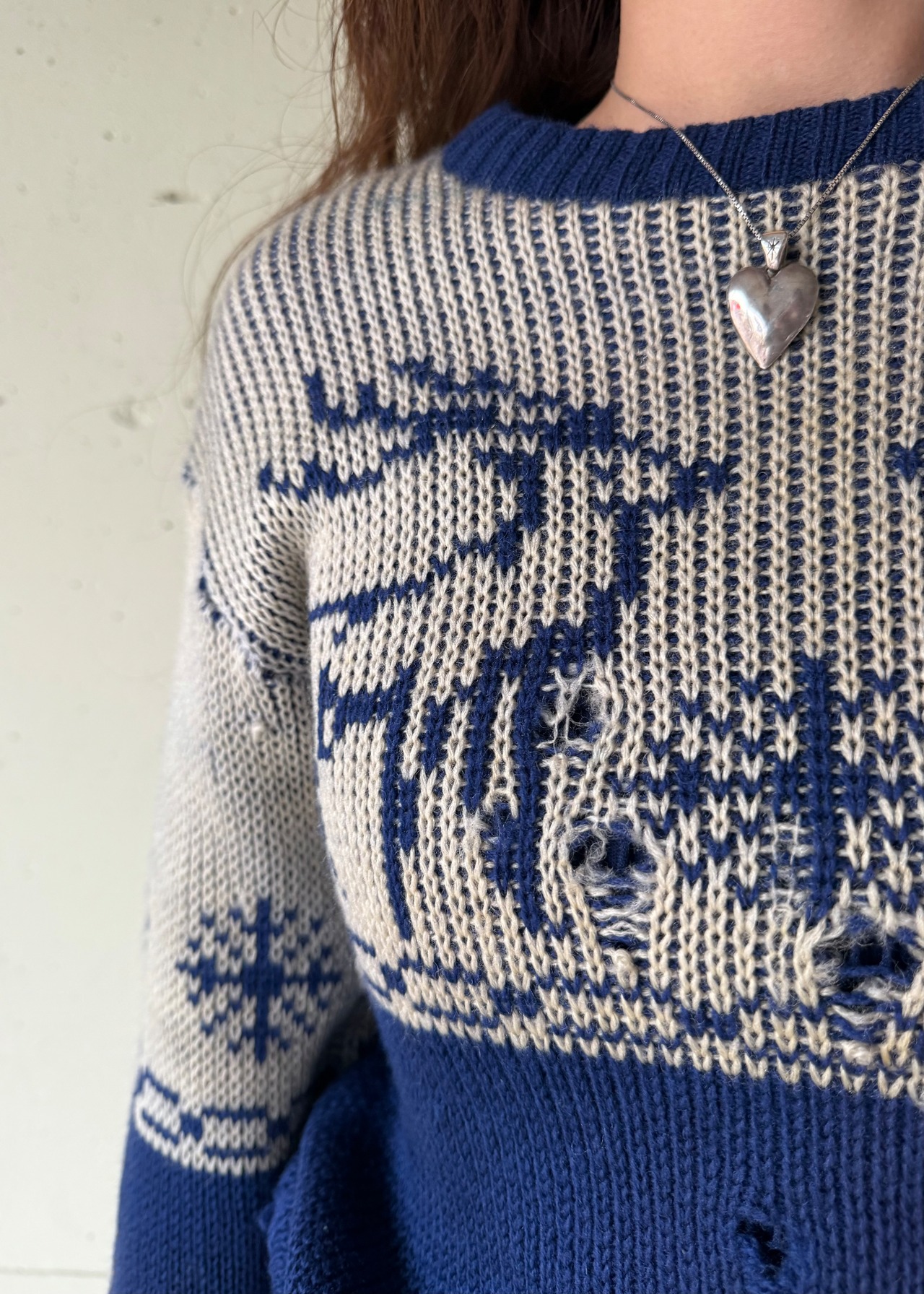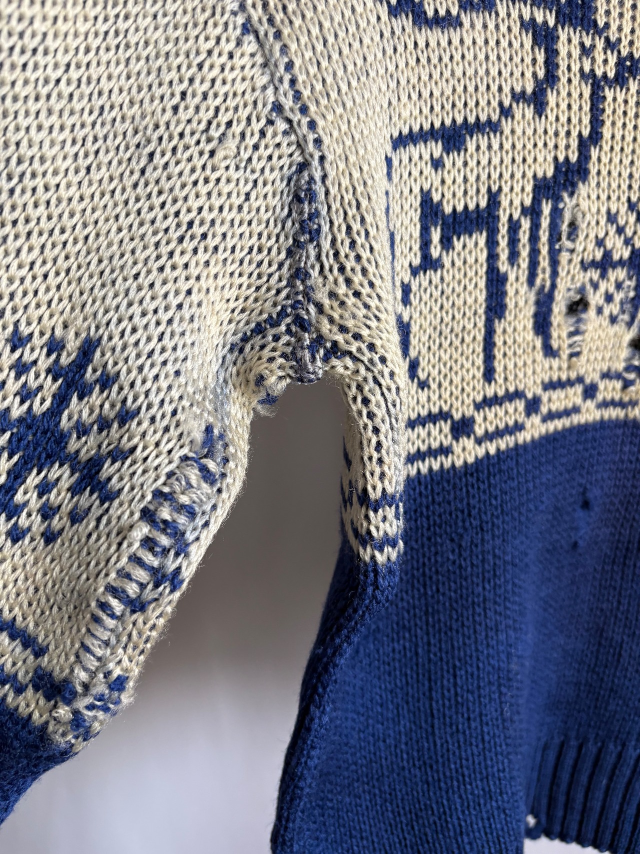 程よいボロ。モチーフ自体はスキーニットやシーズンの柄ですがブルーベースの編み込みですので、ファッション性が高いニットセーターです。