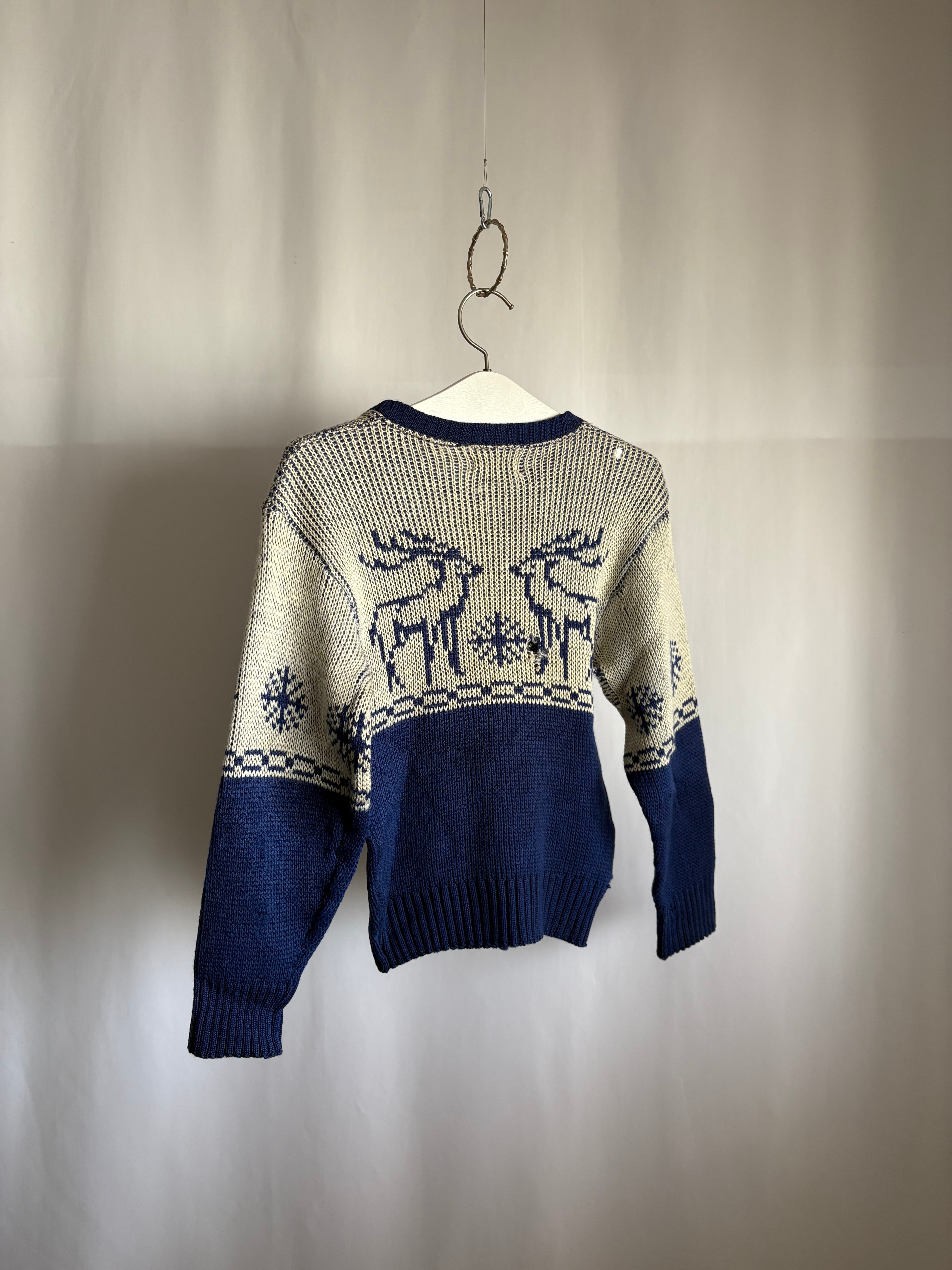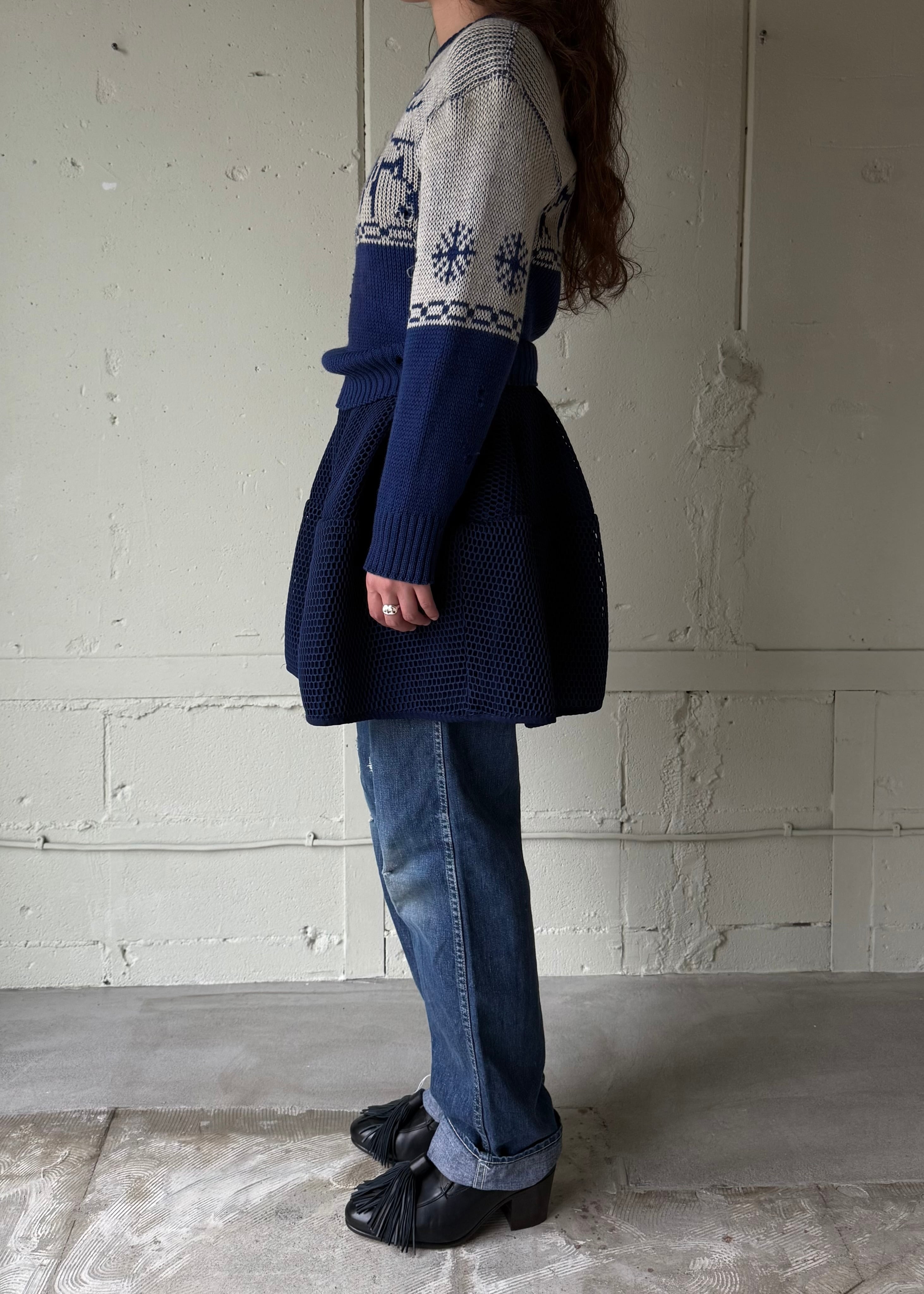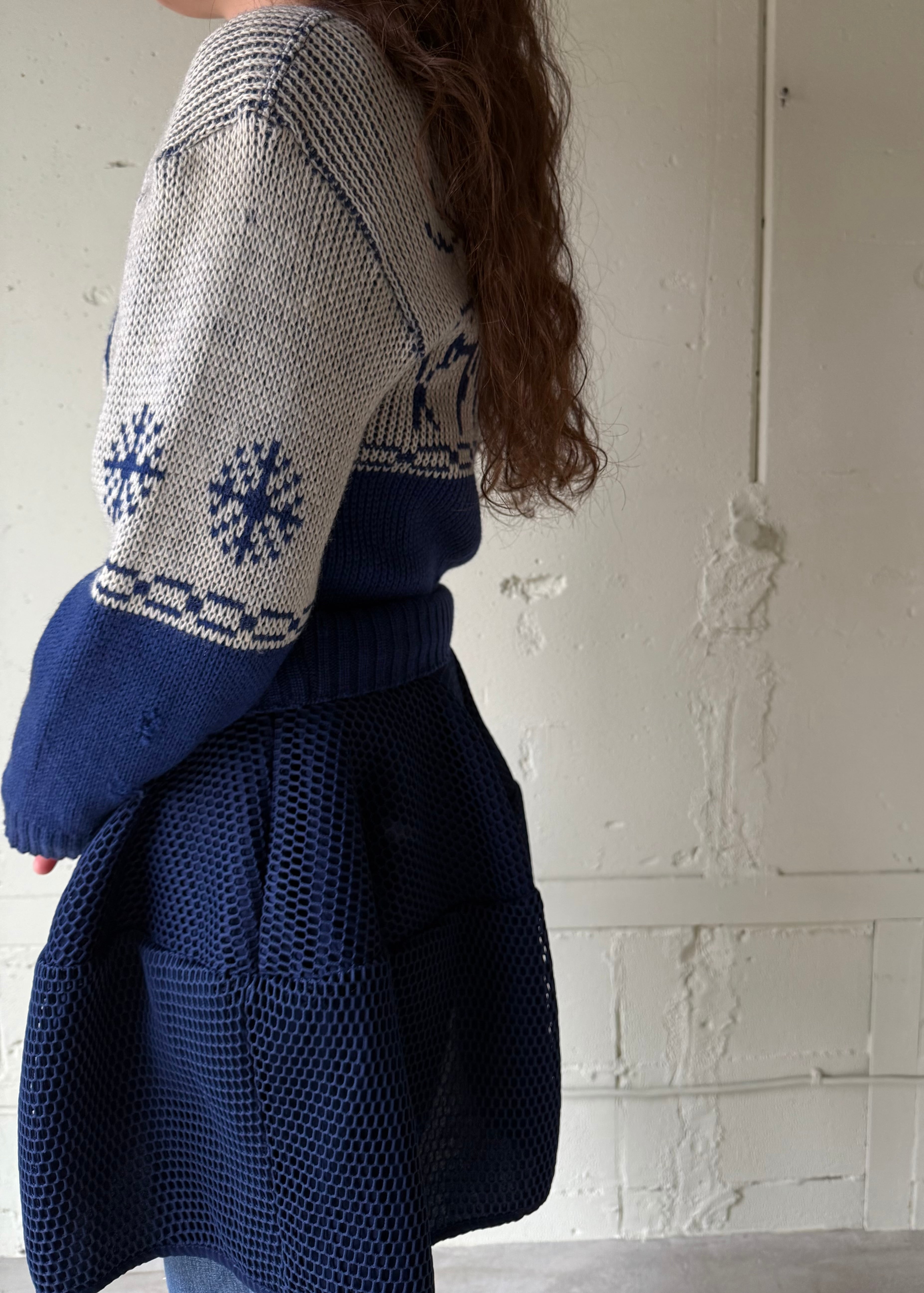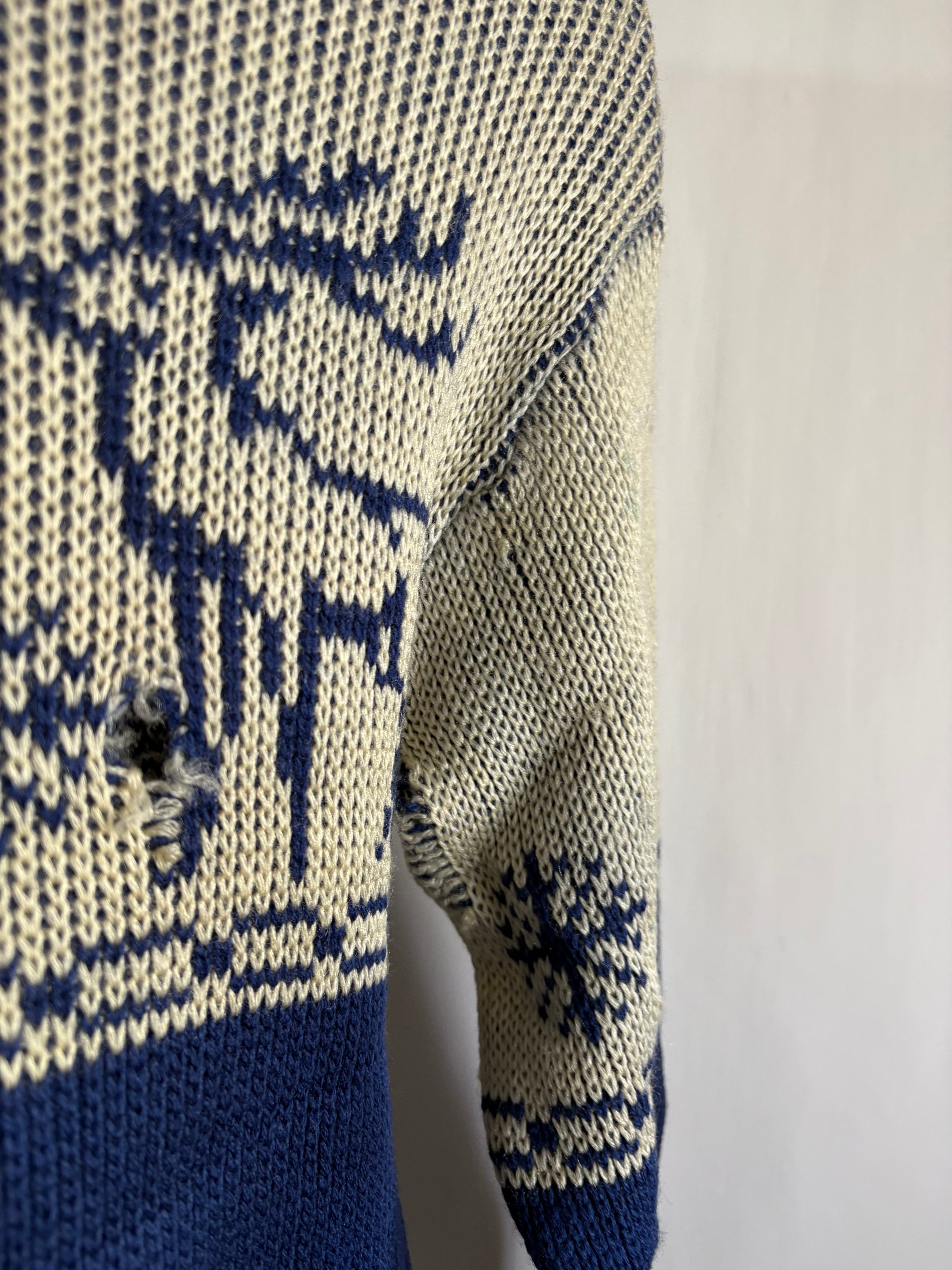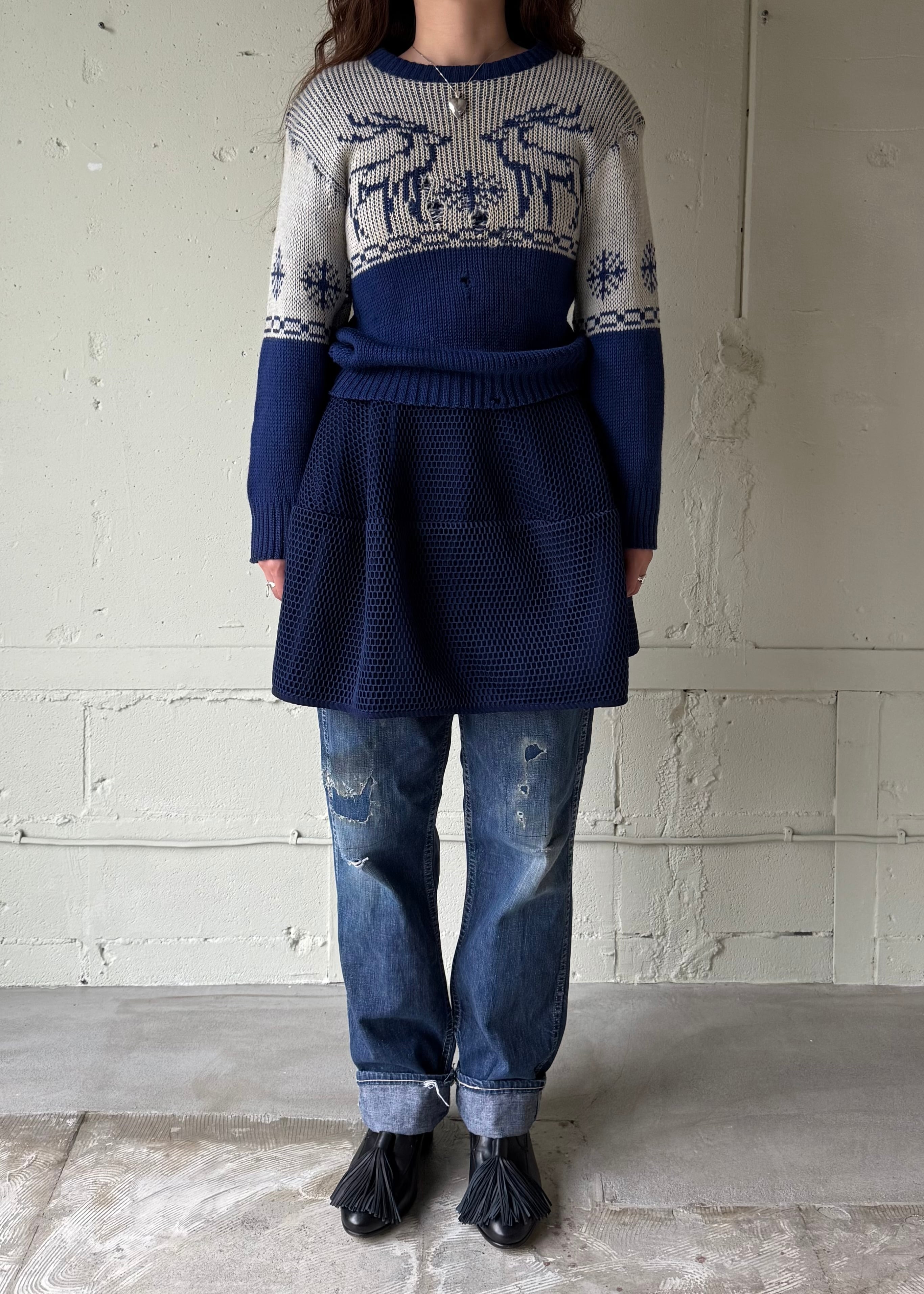 程よいボロ。モチーフ自体はスキーニットやシーズンの柄ですがブルーベースの編み込みですので、ファッション性が高いニットセーターです。