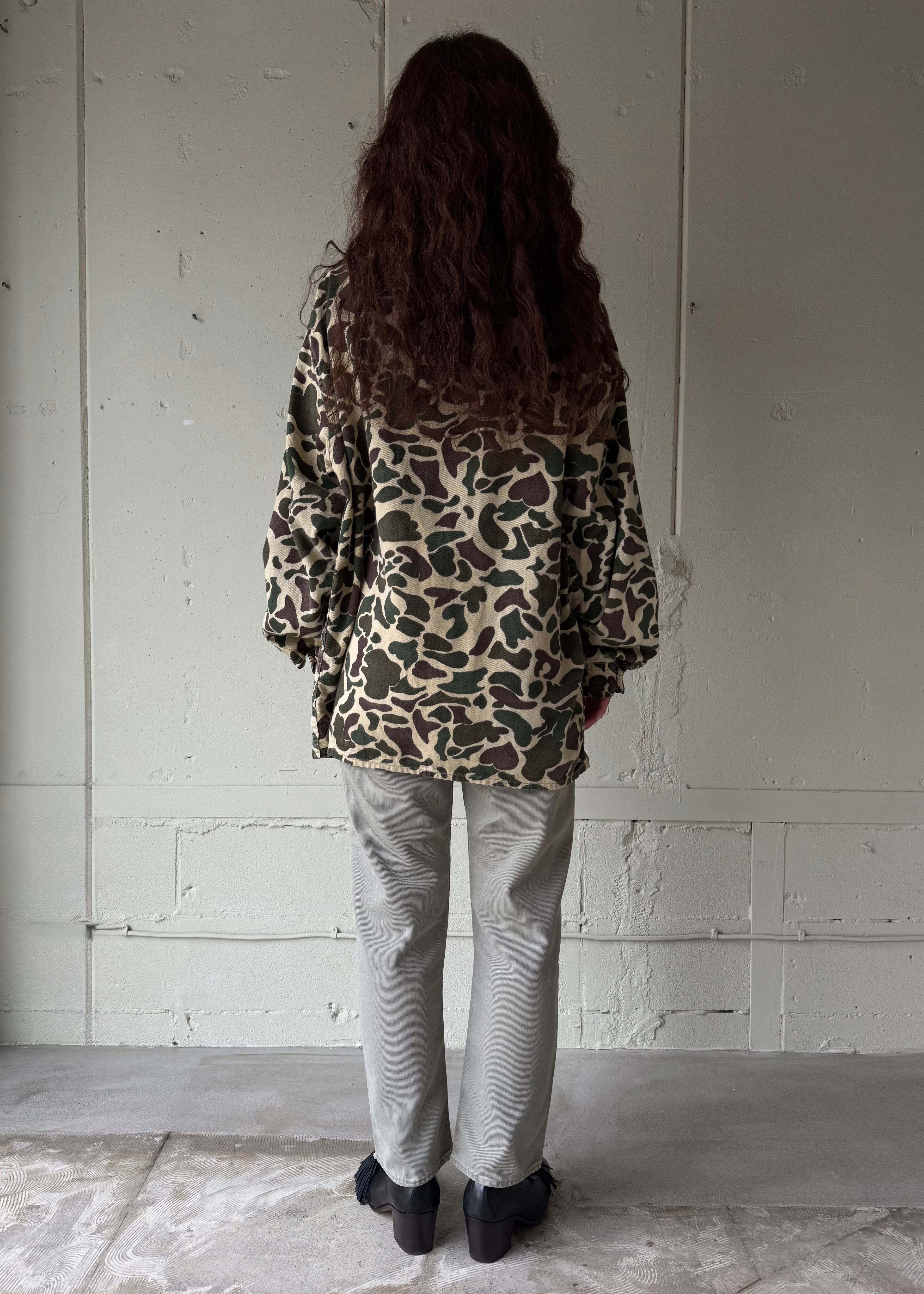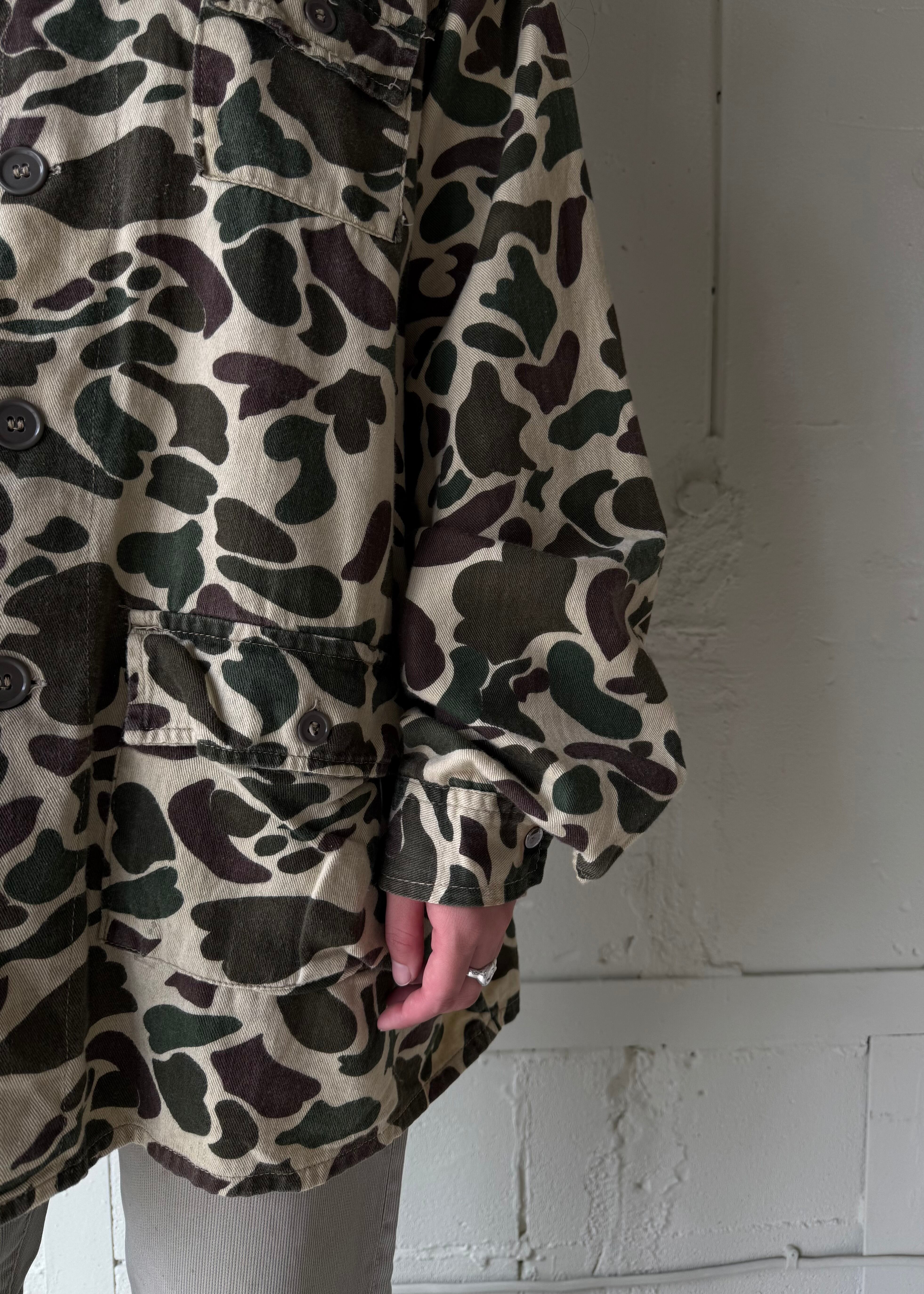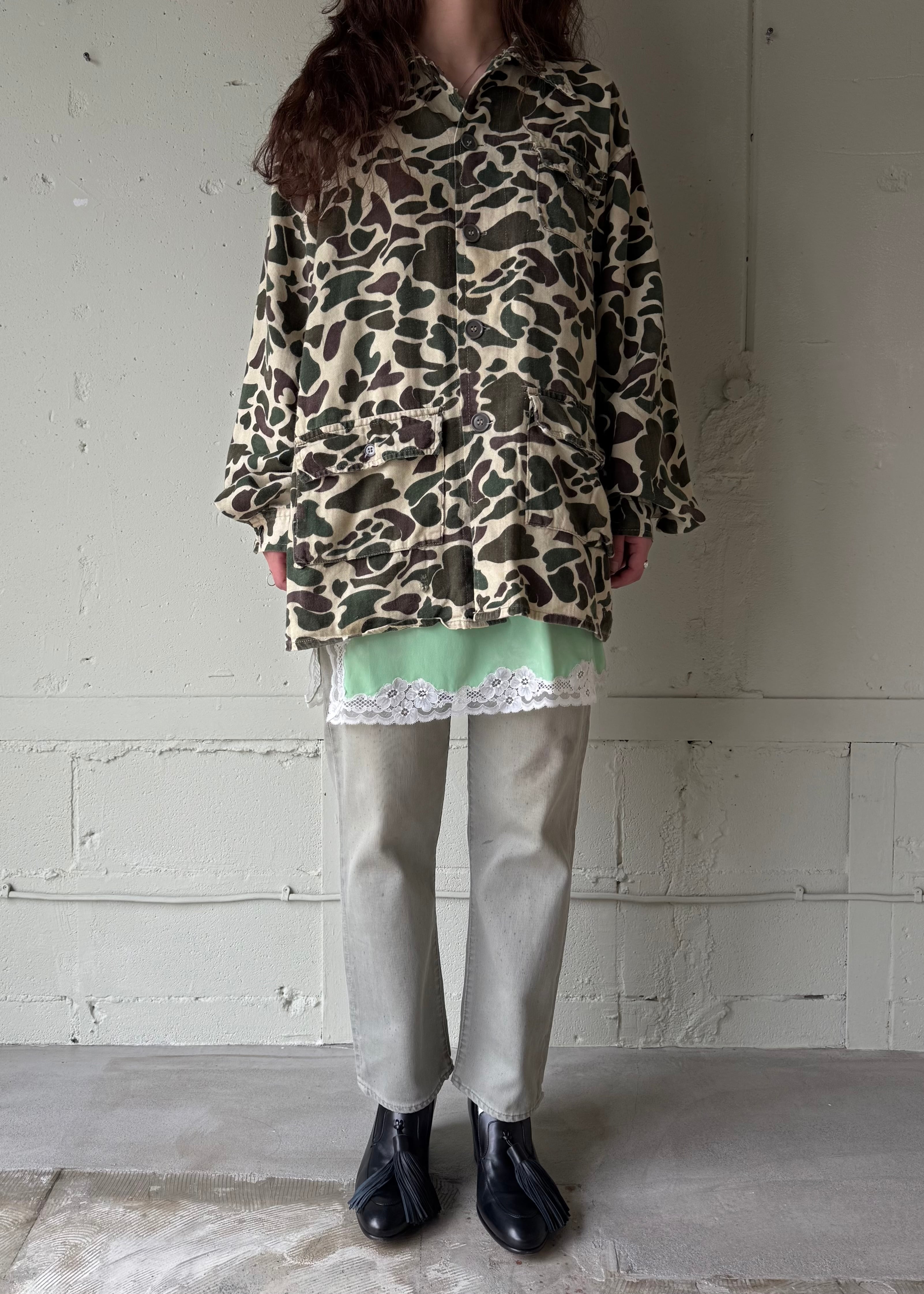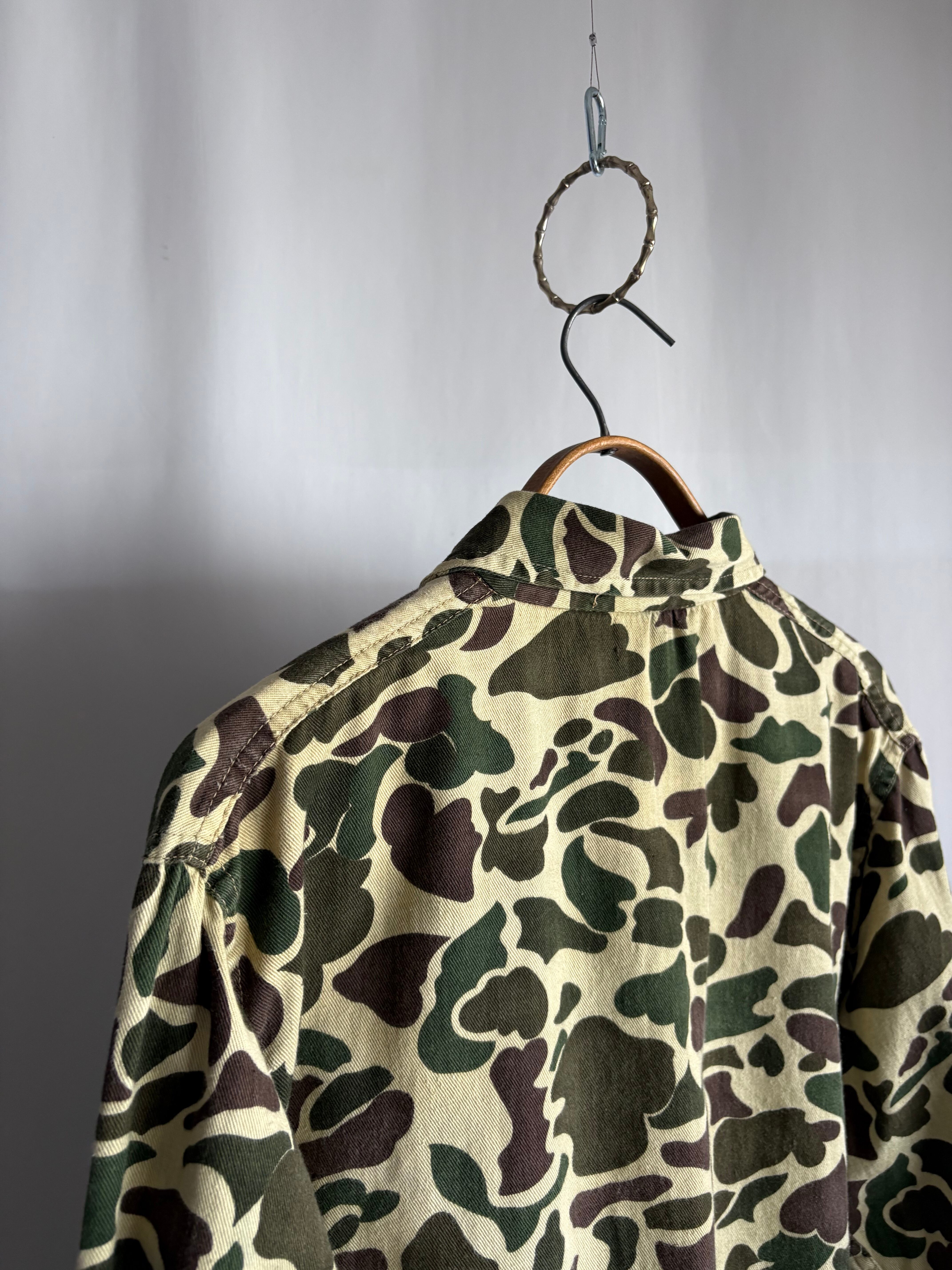 本気のハンティングウェアならダックハンターの生地がこんなに薄いことはないでしょう。薄手の生地と心許ないボタン。けれど街で着るならばこのくらいがベストです。