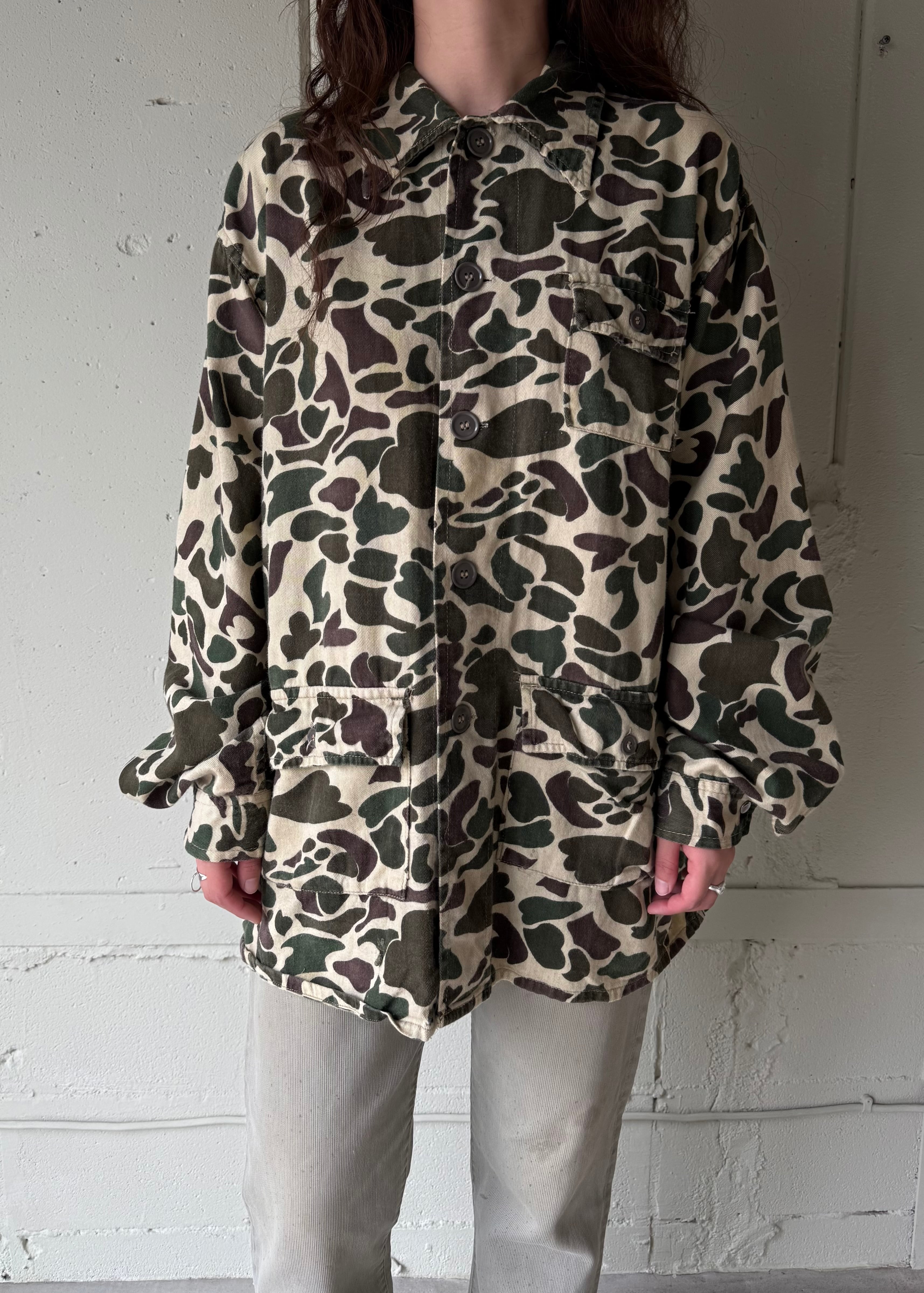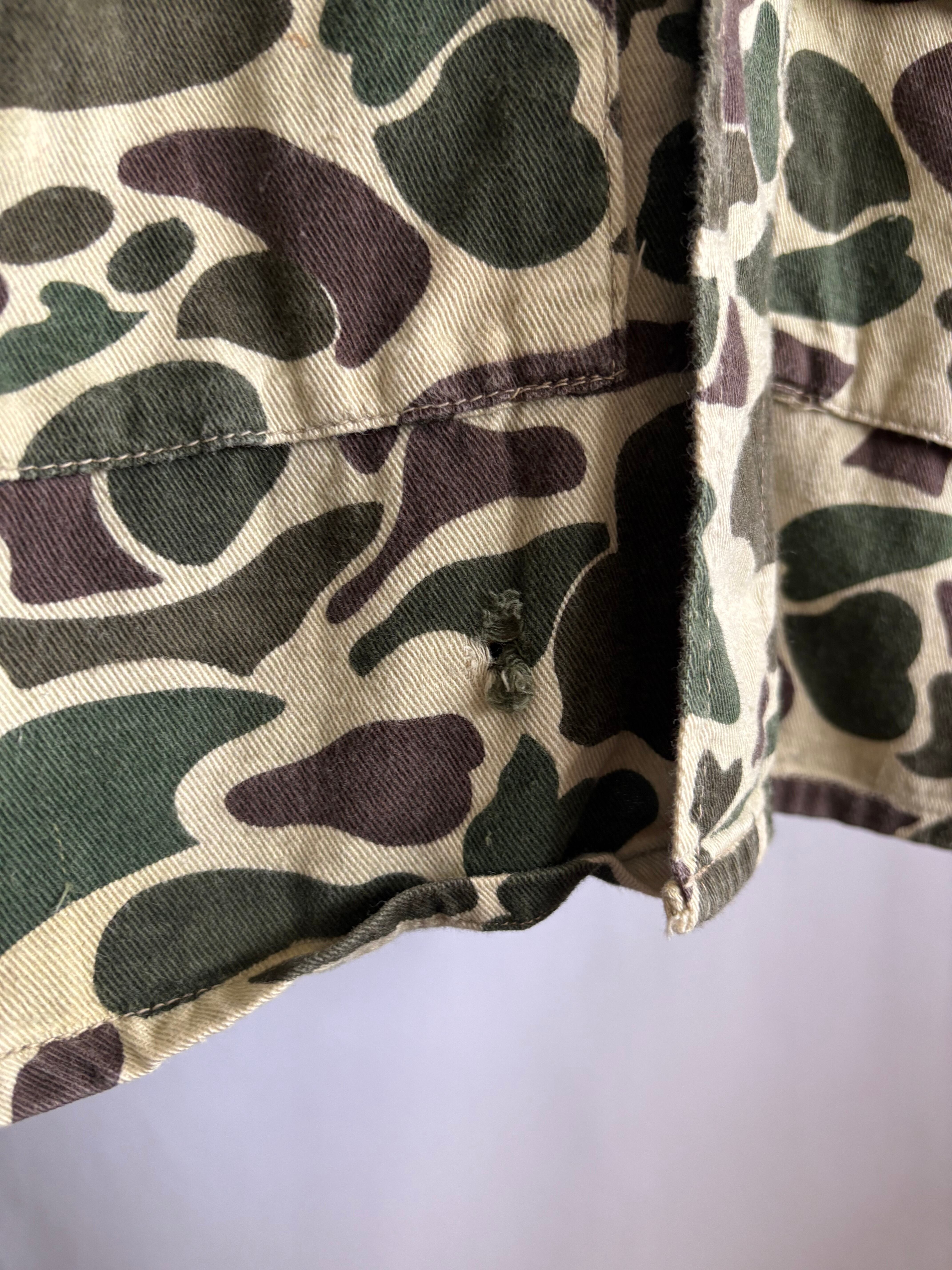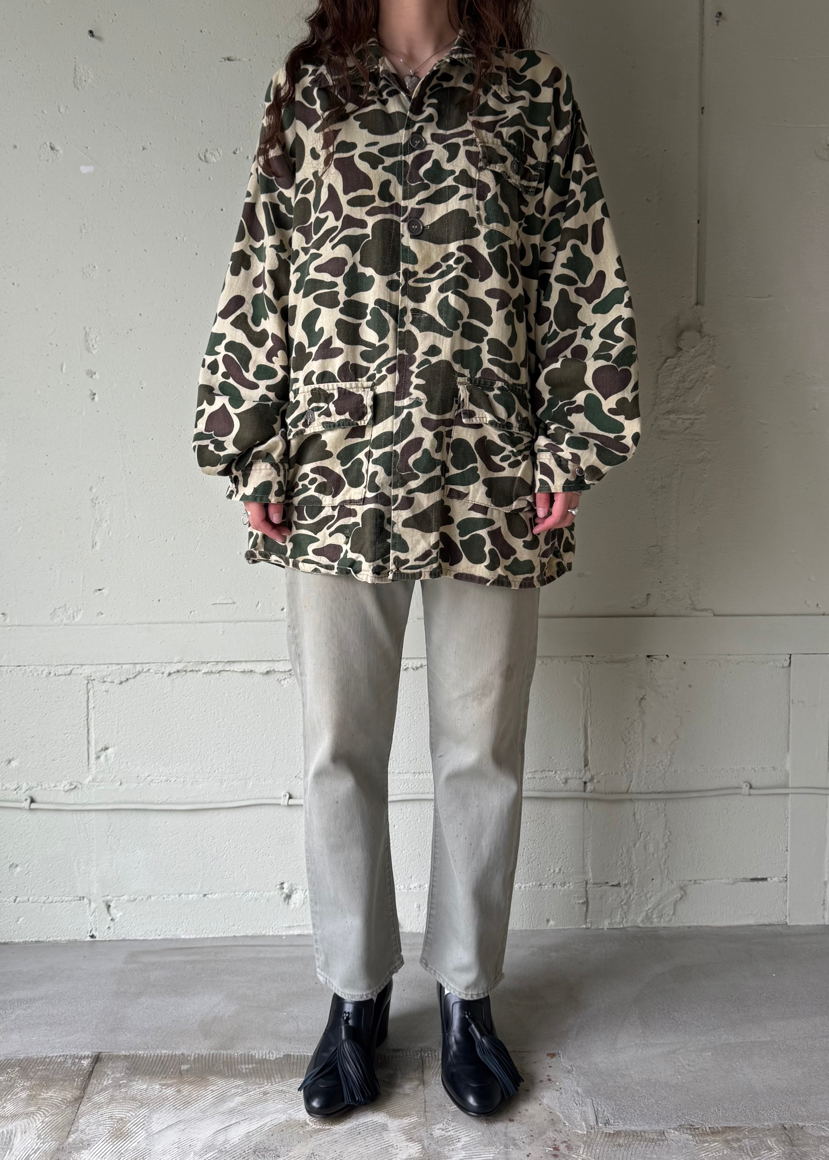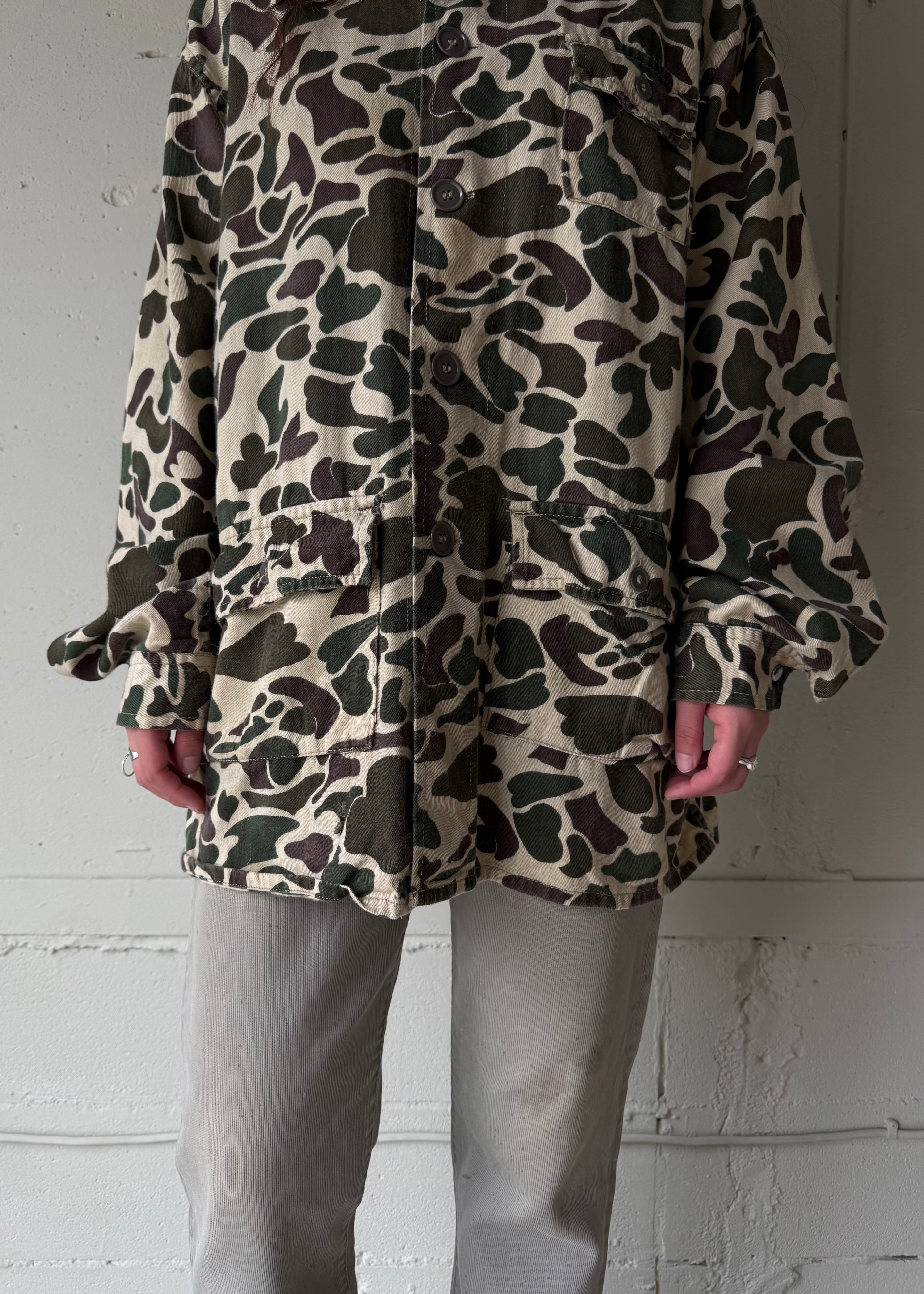 本気のハンティングウェアならダックハンターの生地がこんなに薄いことはないでしょう。薄手の生地と心許ないボタン。けれど街で着るならばこのくらいがベストです。