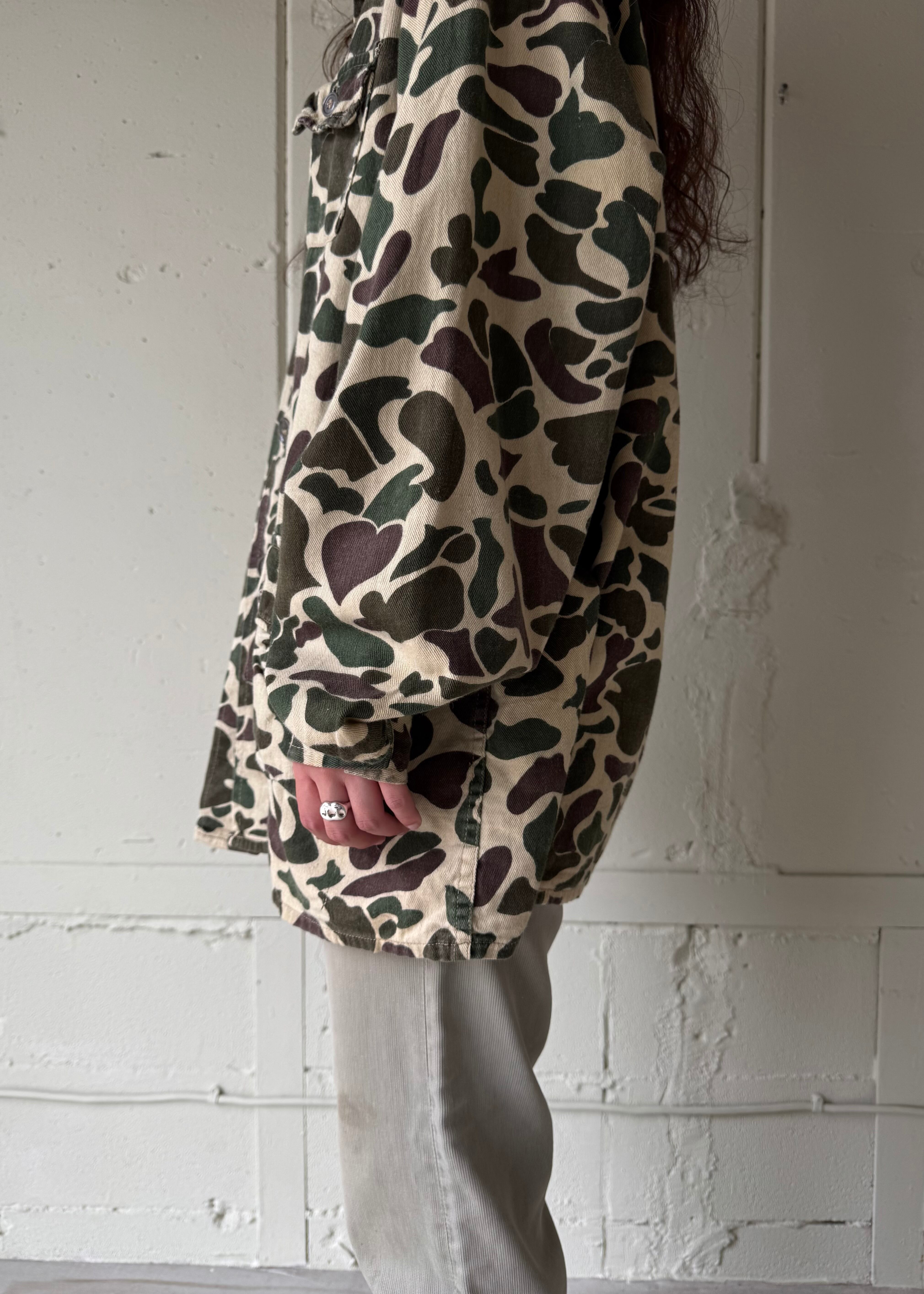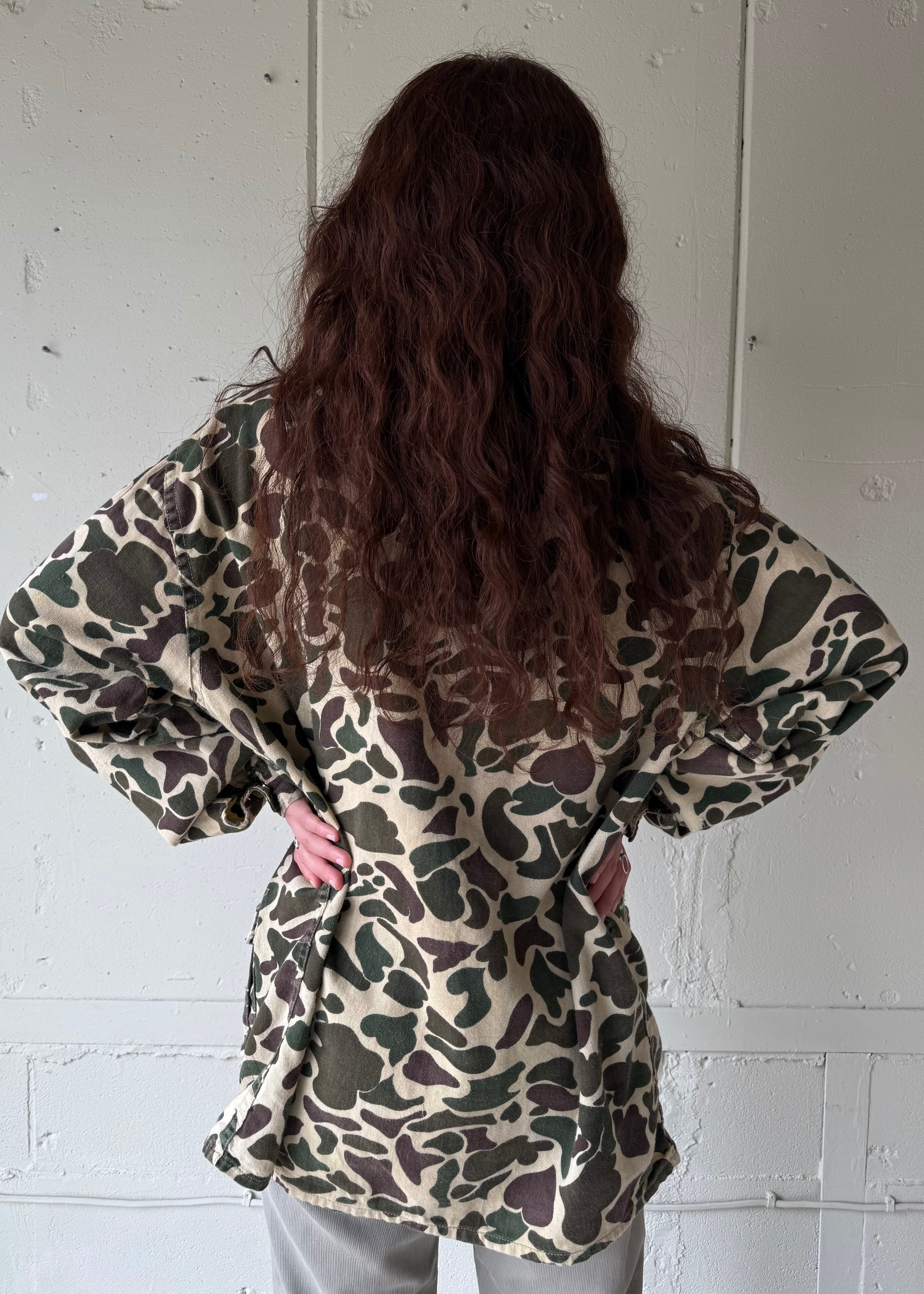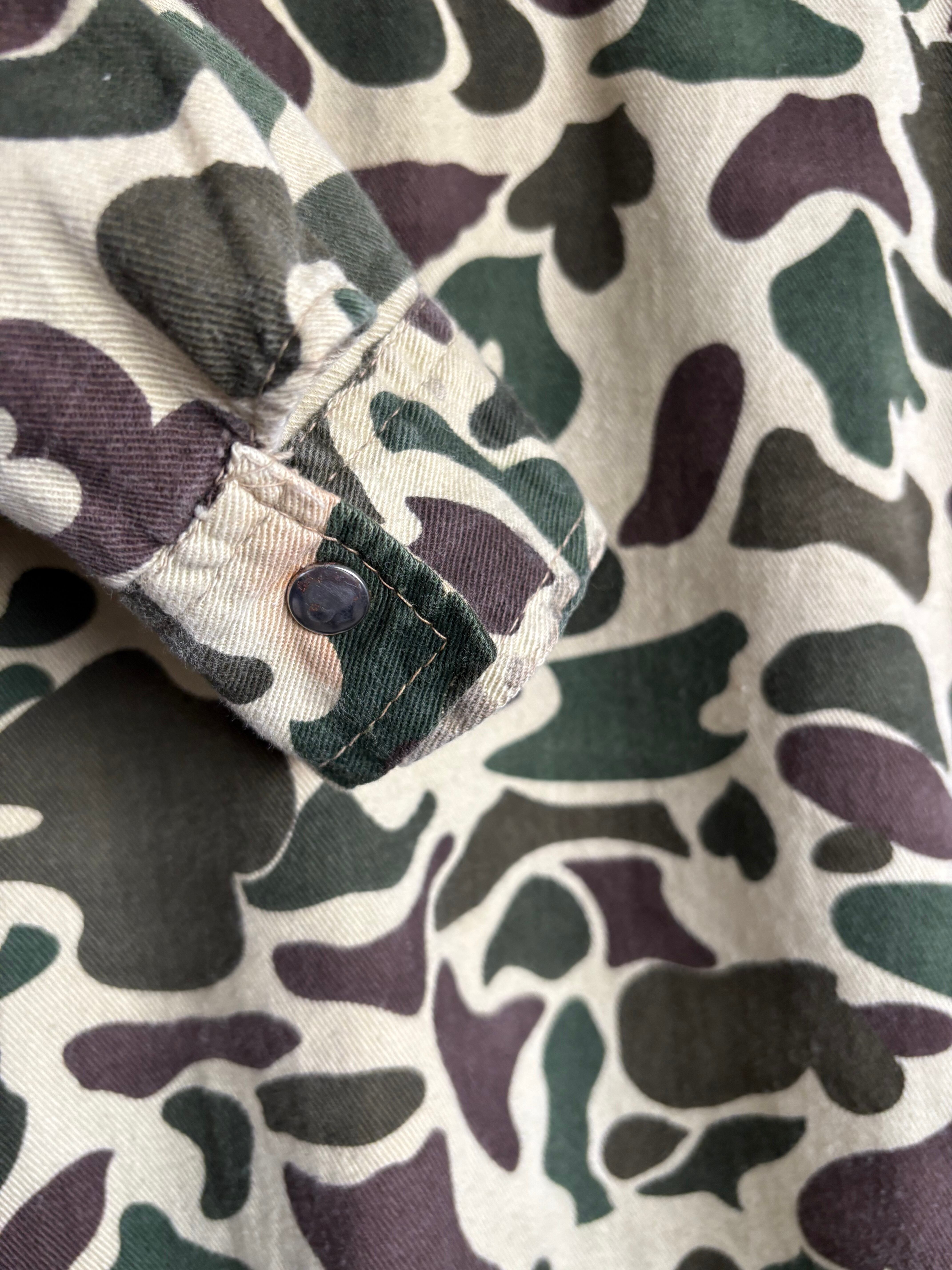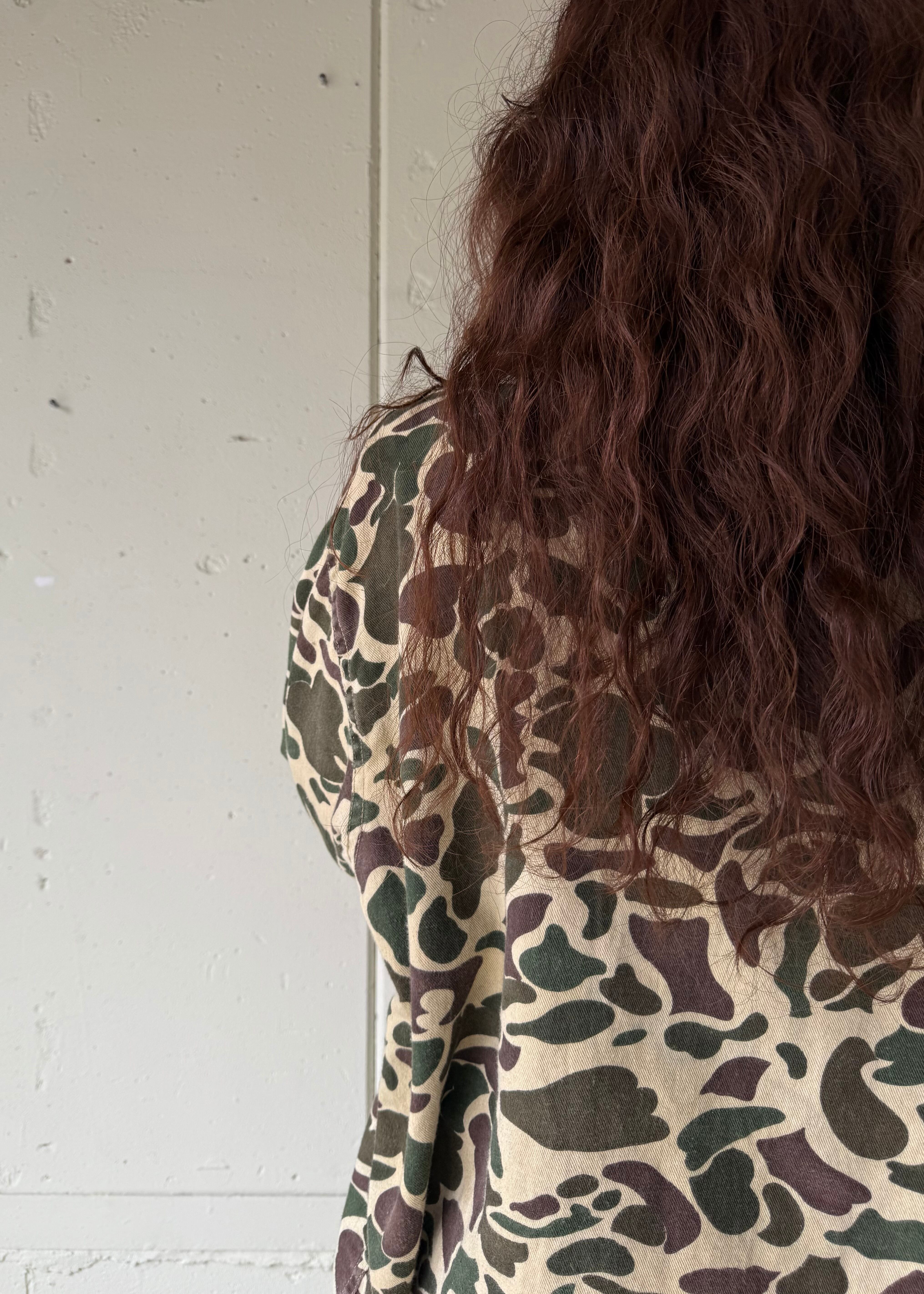 本気のハンティングウェアならダックハンターの生地がこんなに薄いことはないでしょう。薄手の生地と心許ないボタン。けれど街で着るならばこのくらいがベストです。