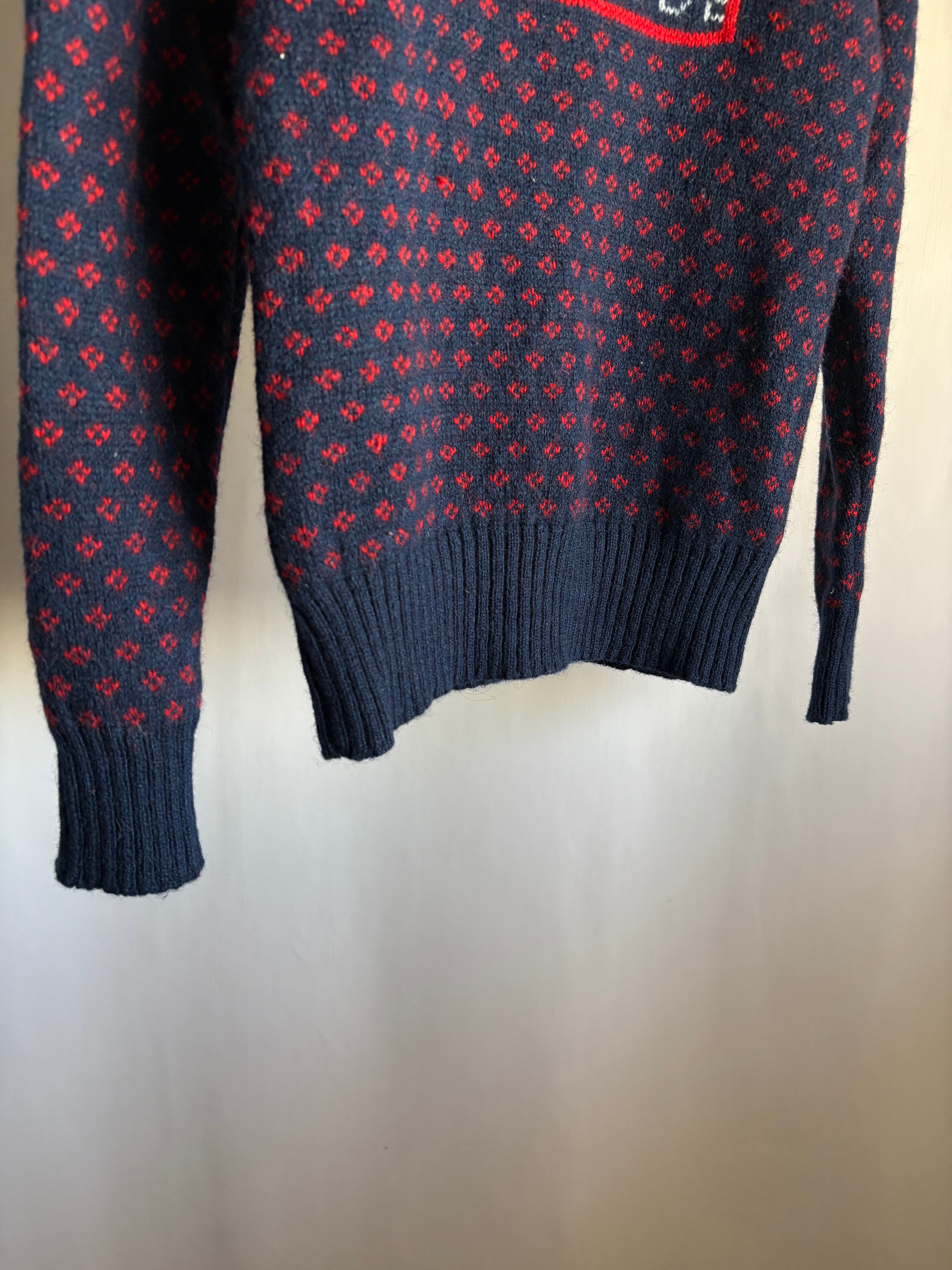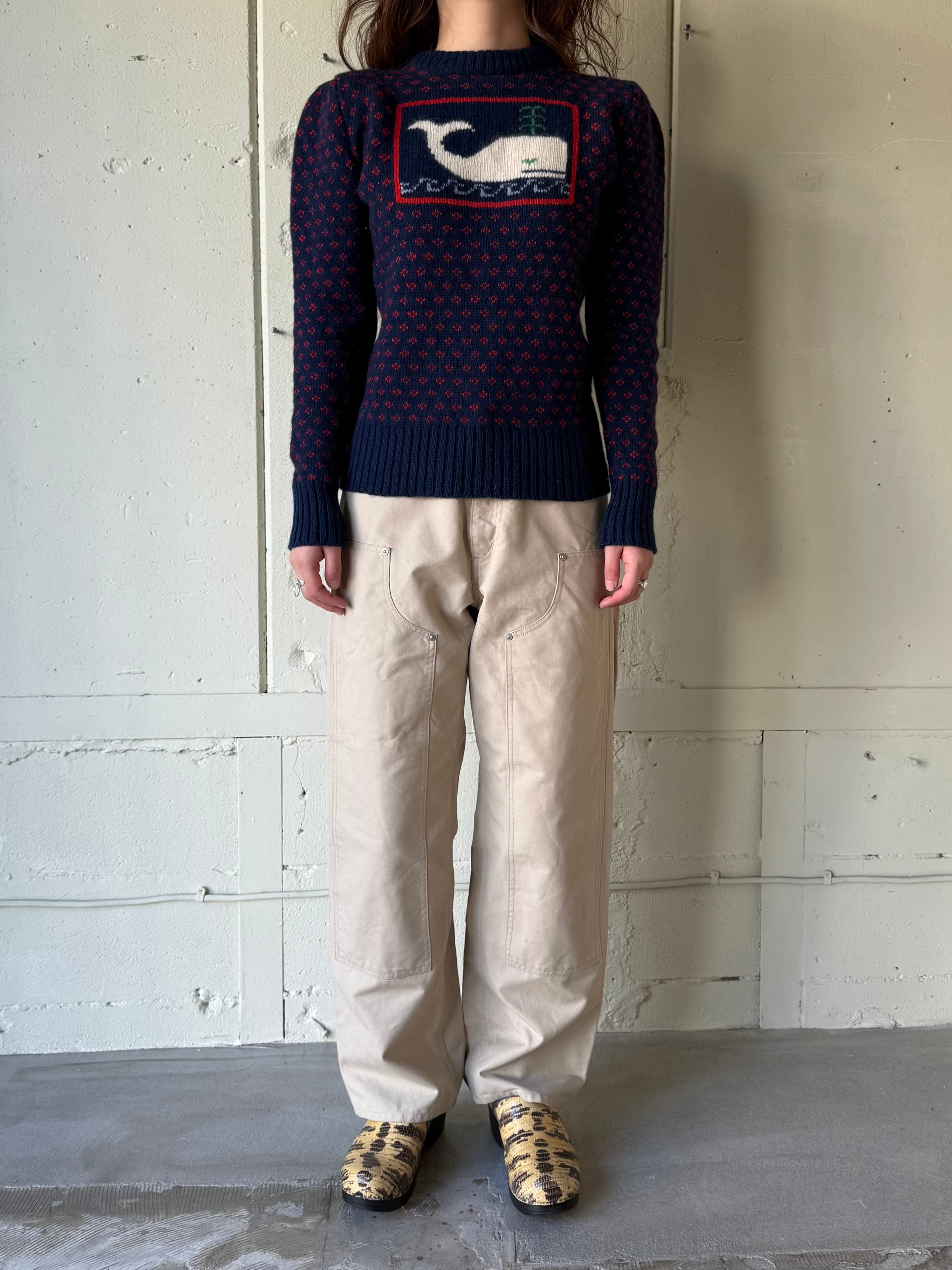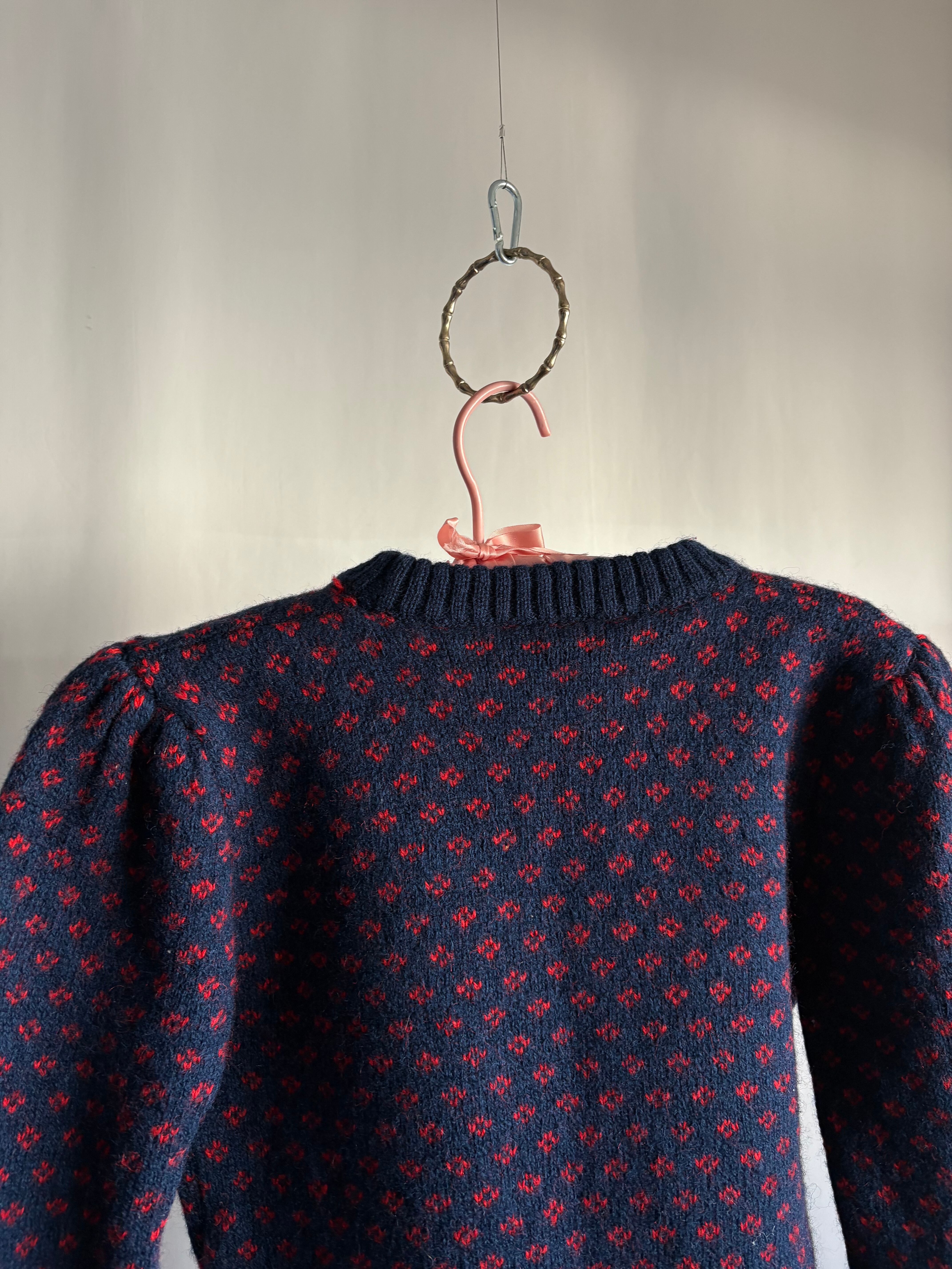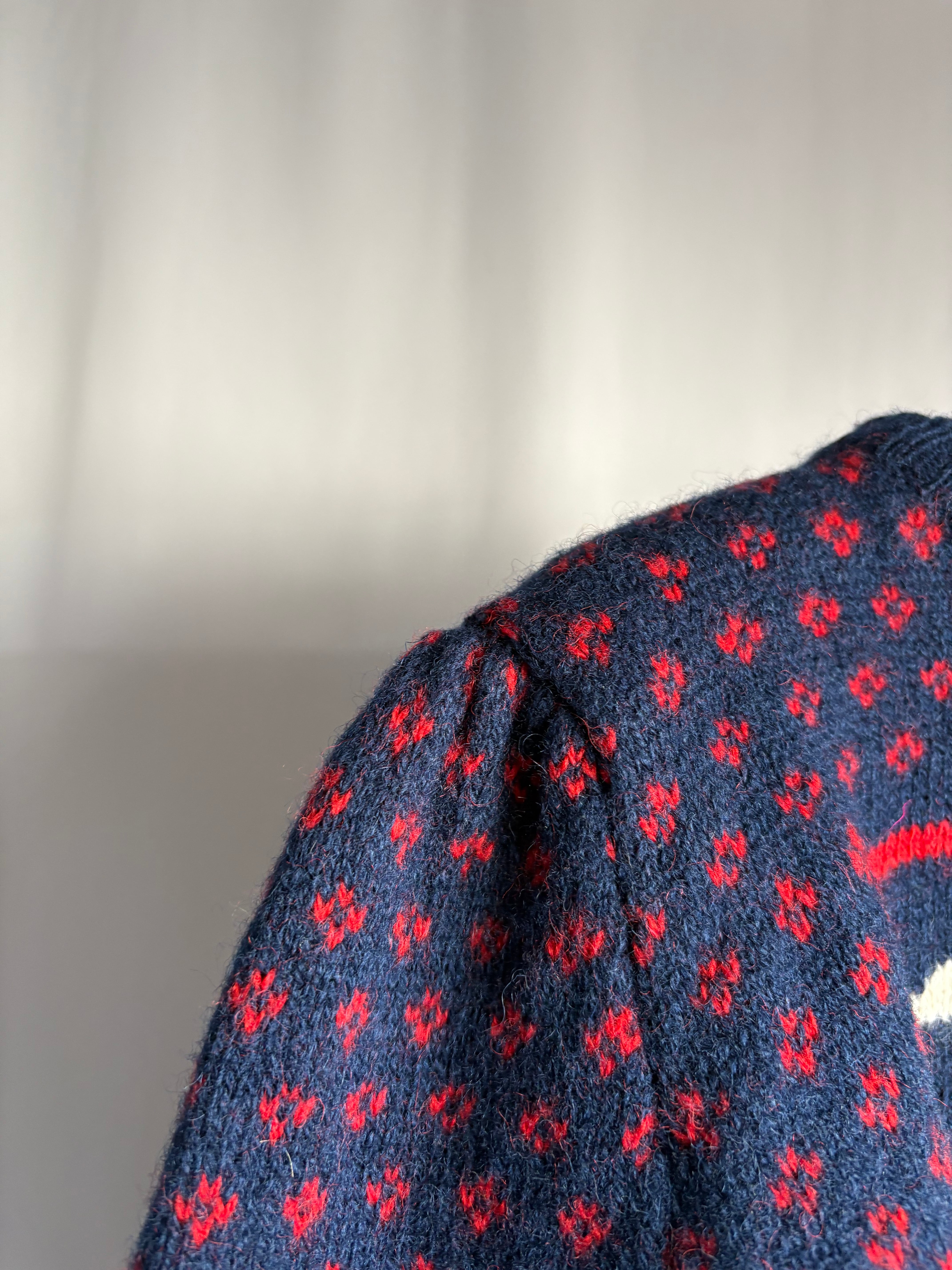 クラシックな古着ならではさを感じるパターンのニットセーターなのですがパフスリーブの様な肩に特徴的なデザインが入っています。