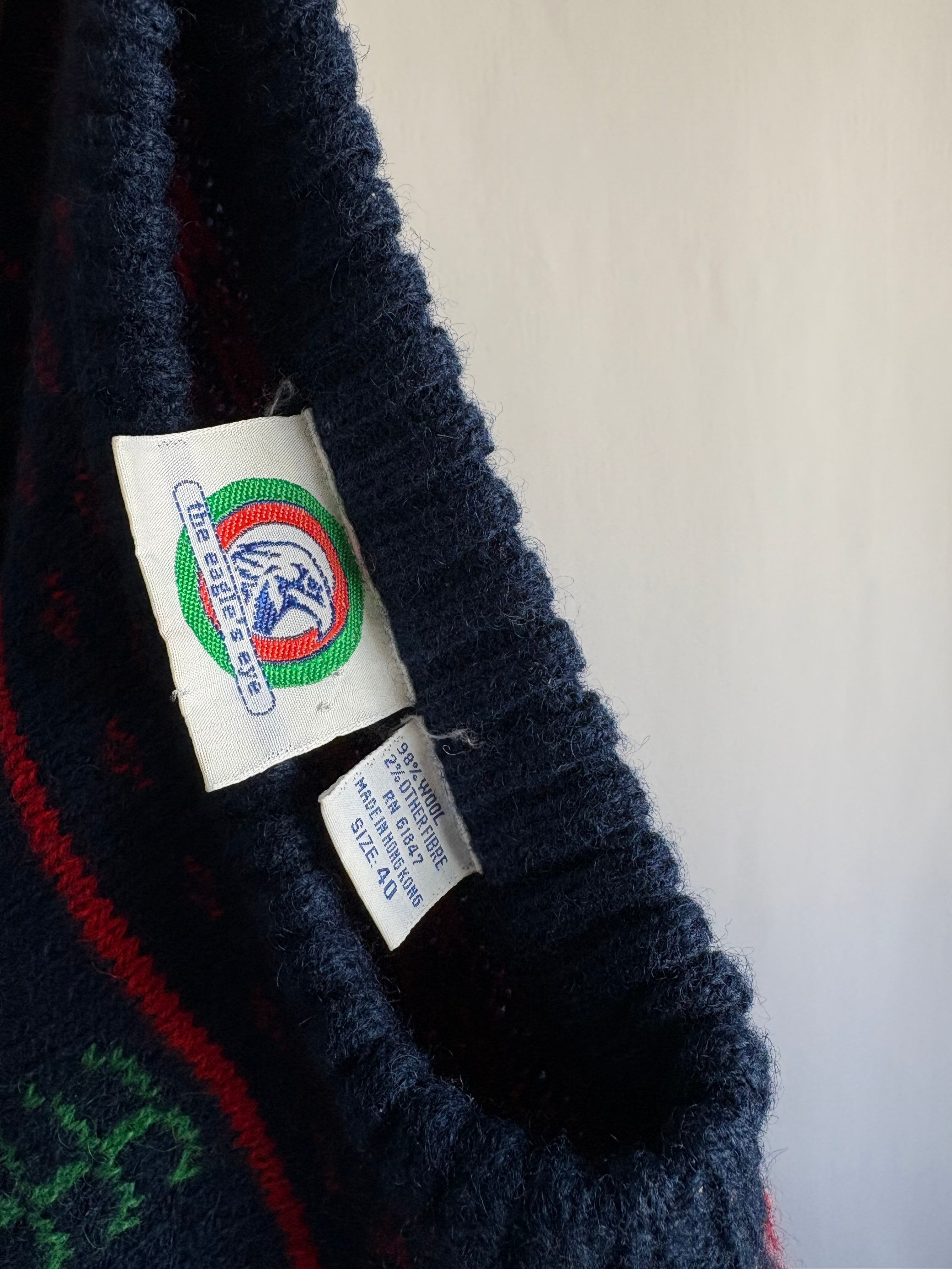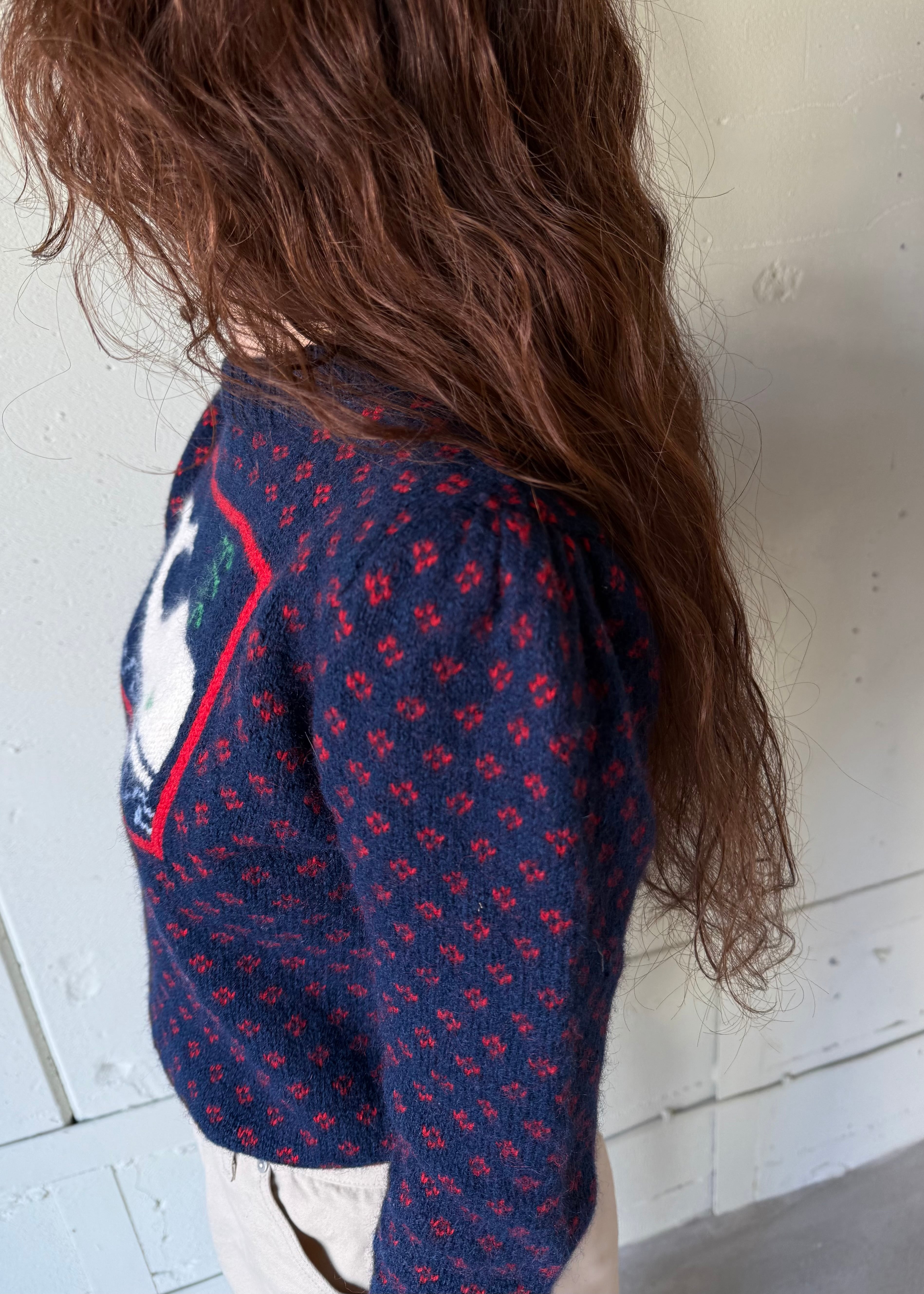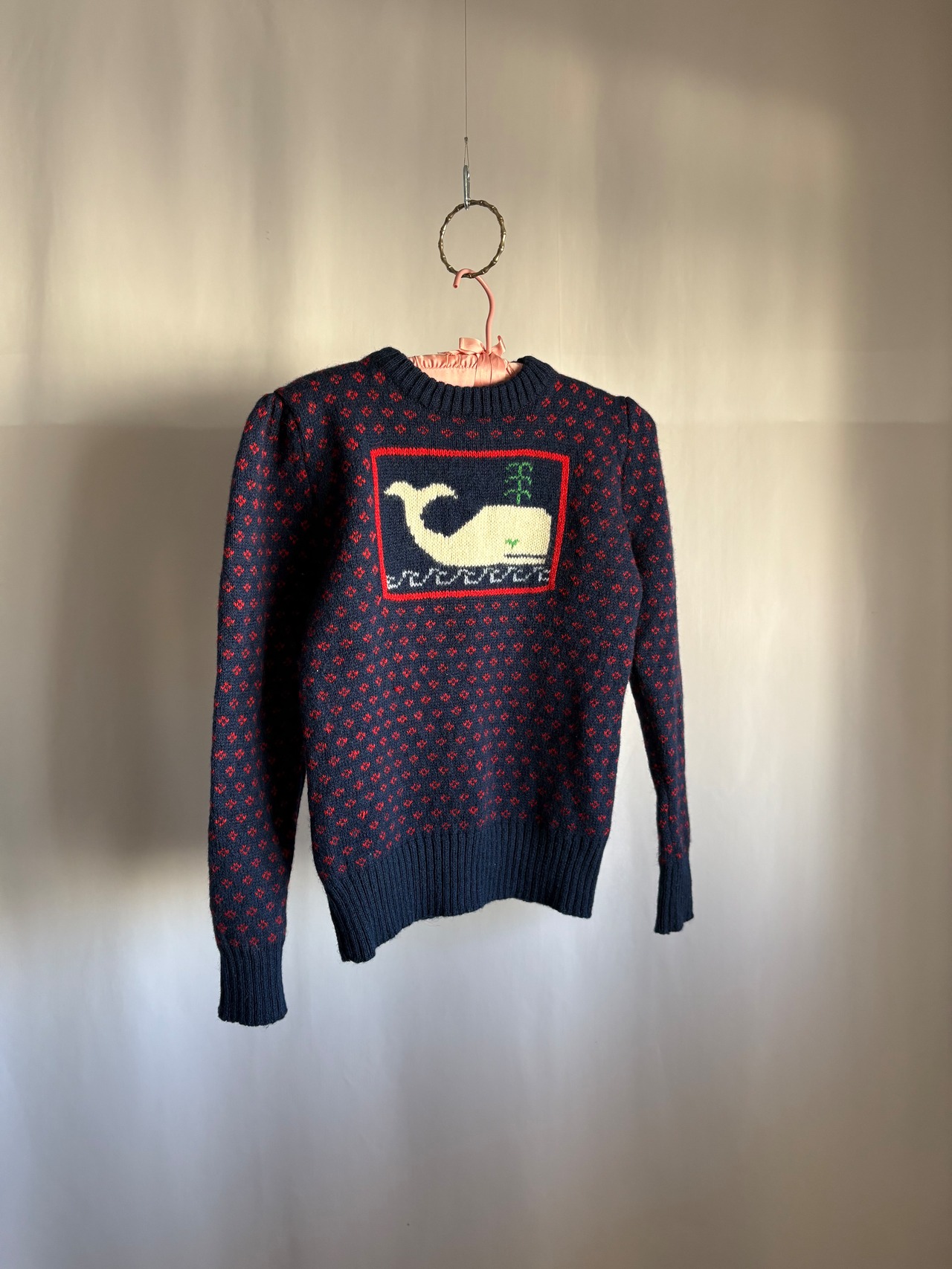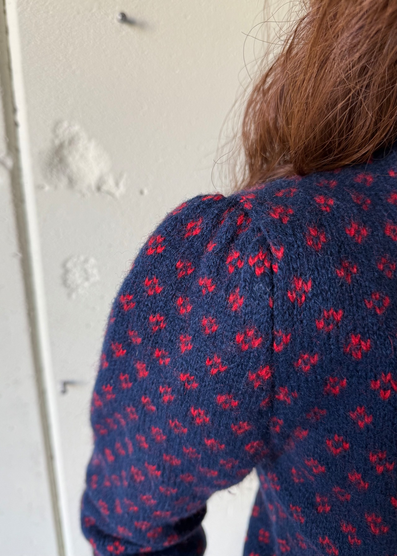 クラシックな古着ならではさを感じるパターンのニットセーターなのですがパフスリーブの様な肩に特徴的なデザインが入っています。