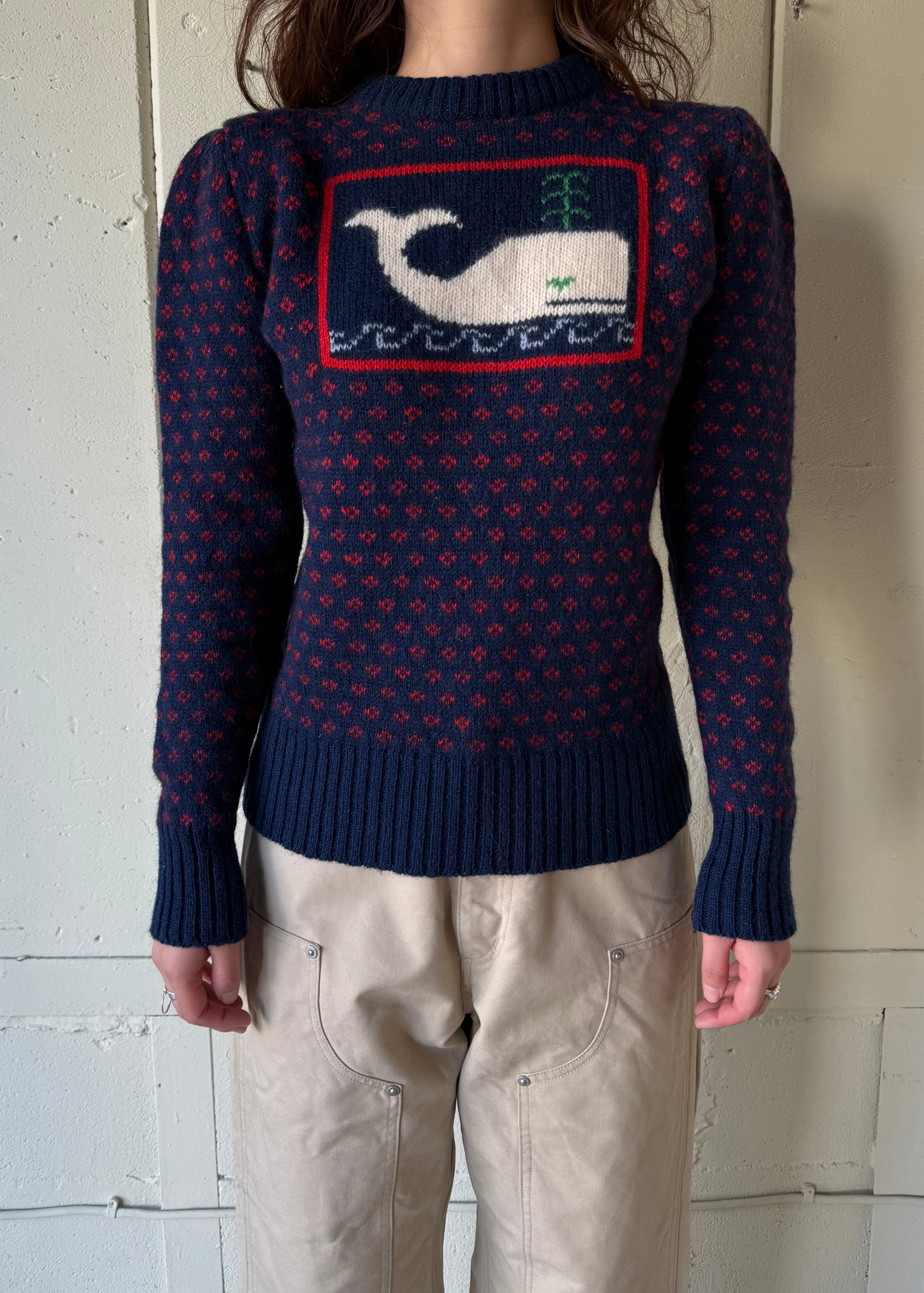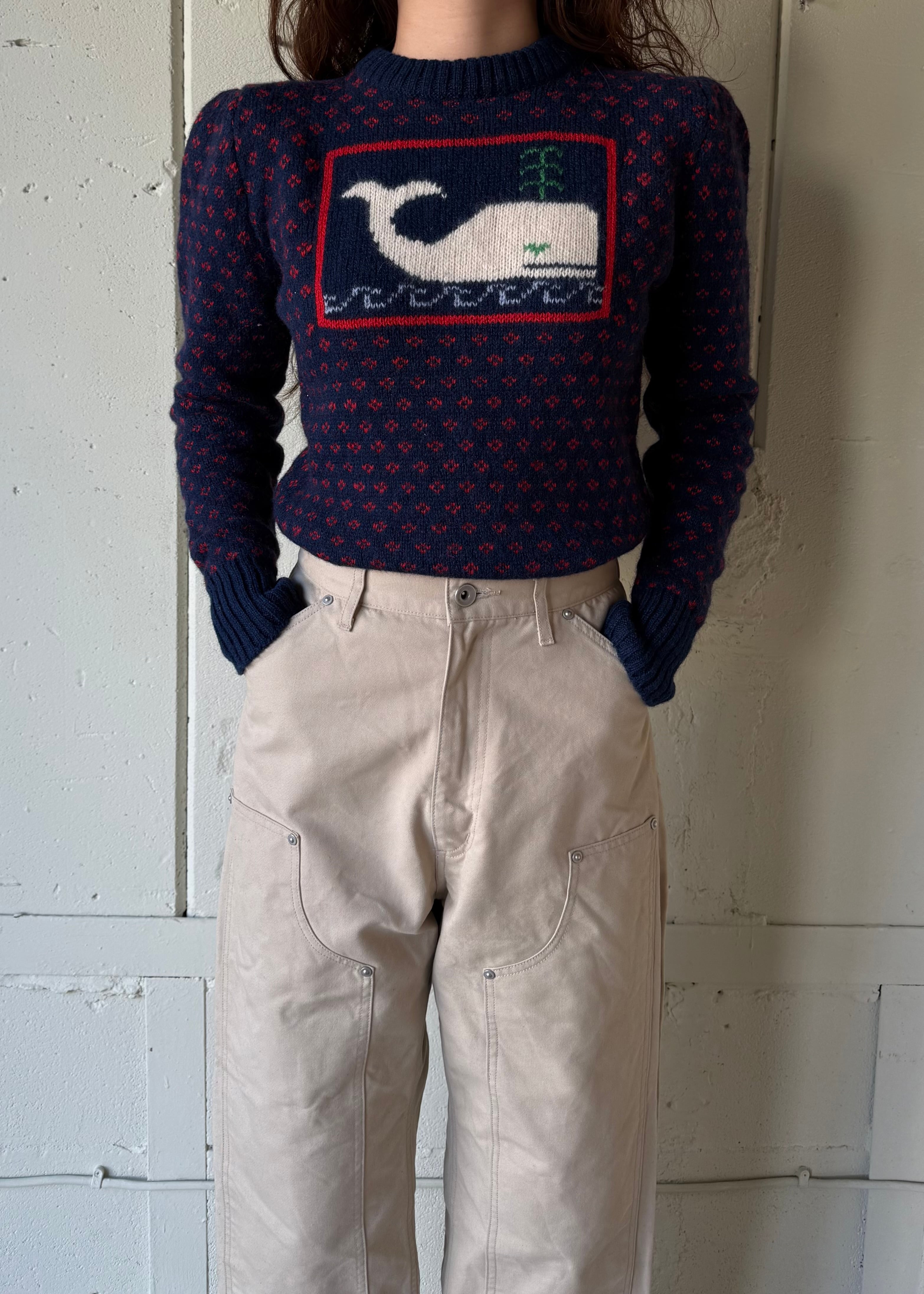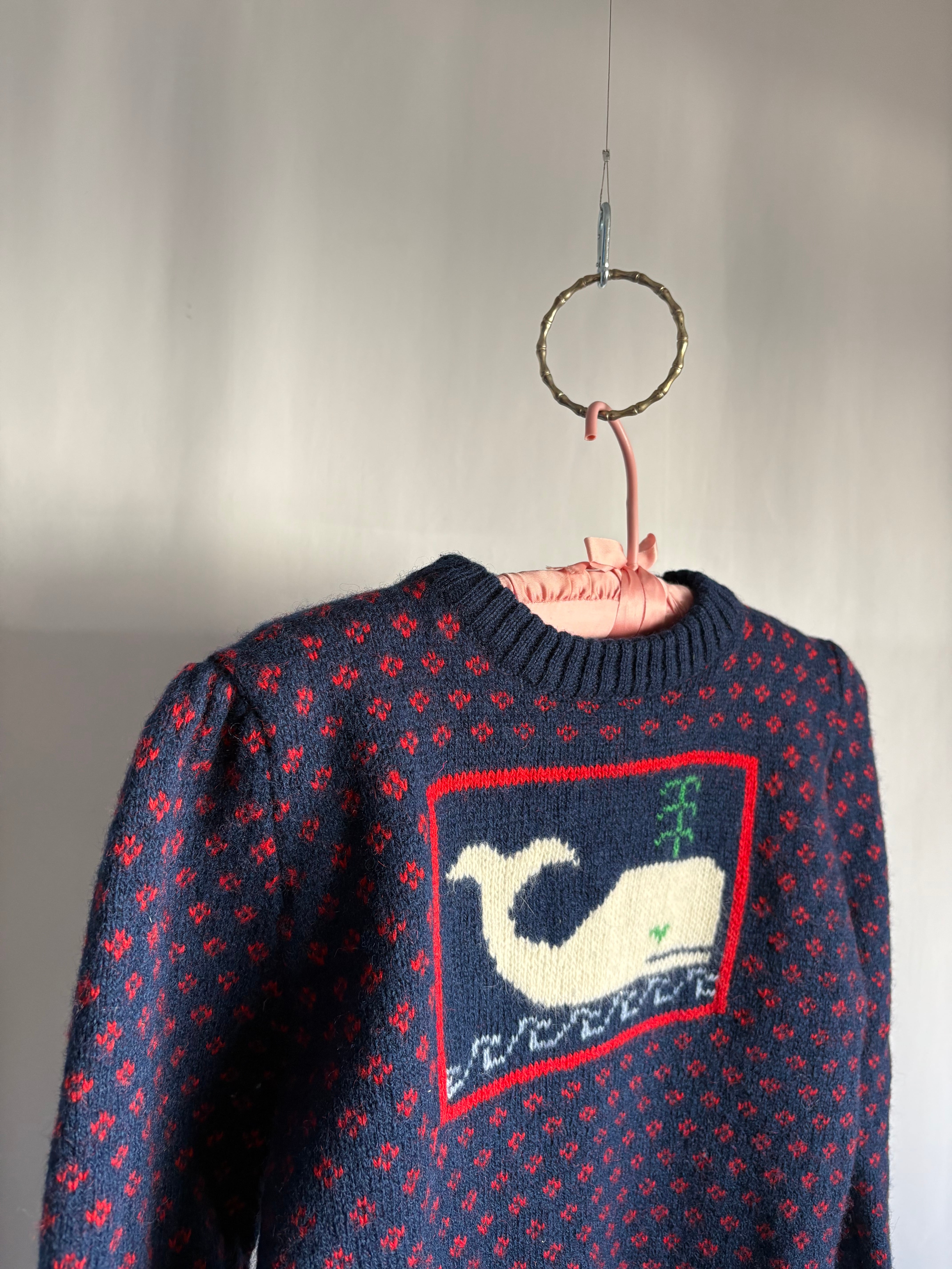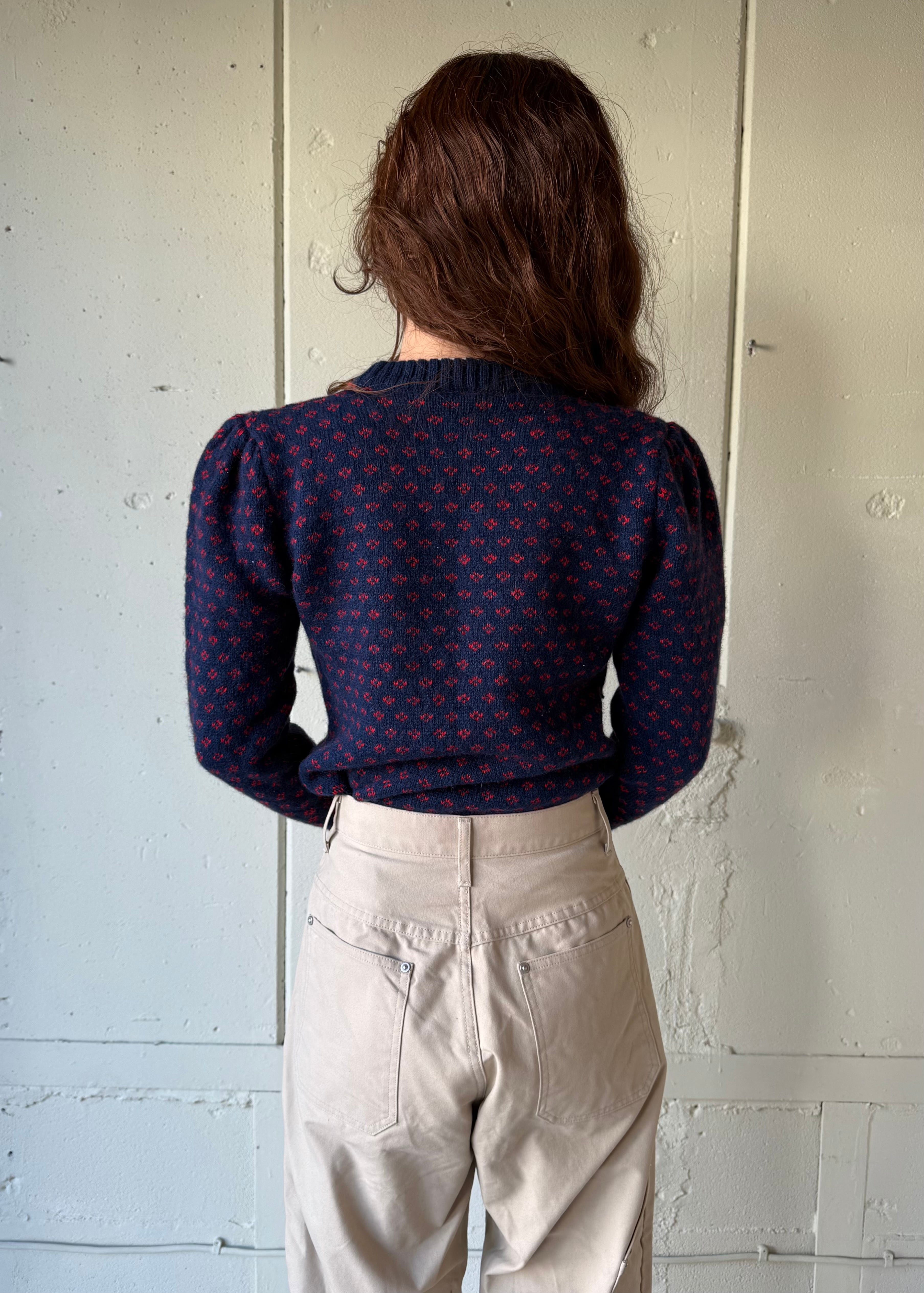 クラシックな古着ならではさを感じるパターンのニットセーターなのですがパフスリーブの様な肩に特徴的なデザインが入っています。