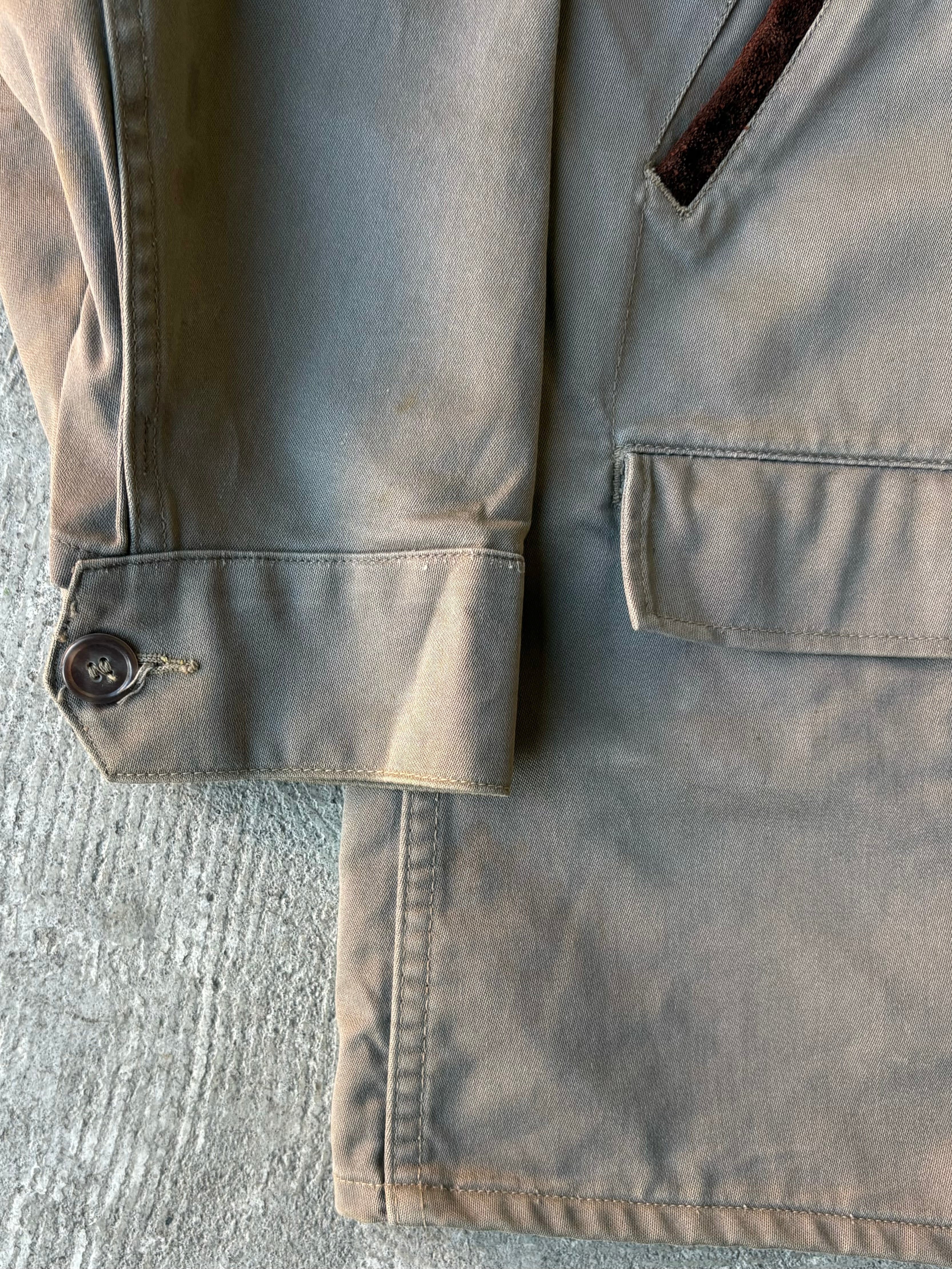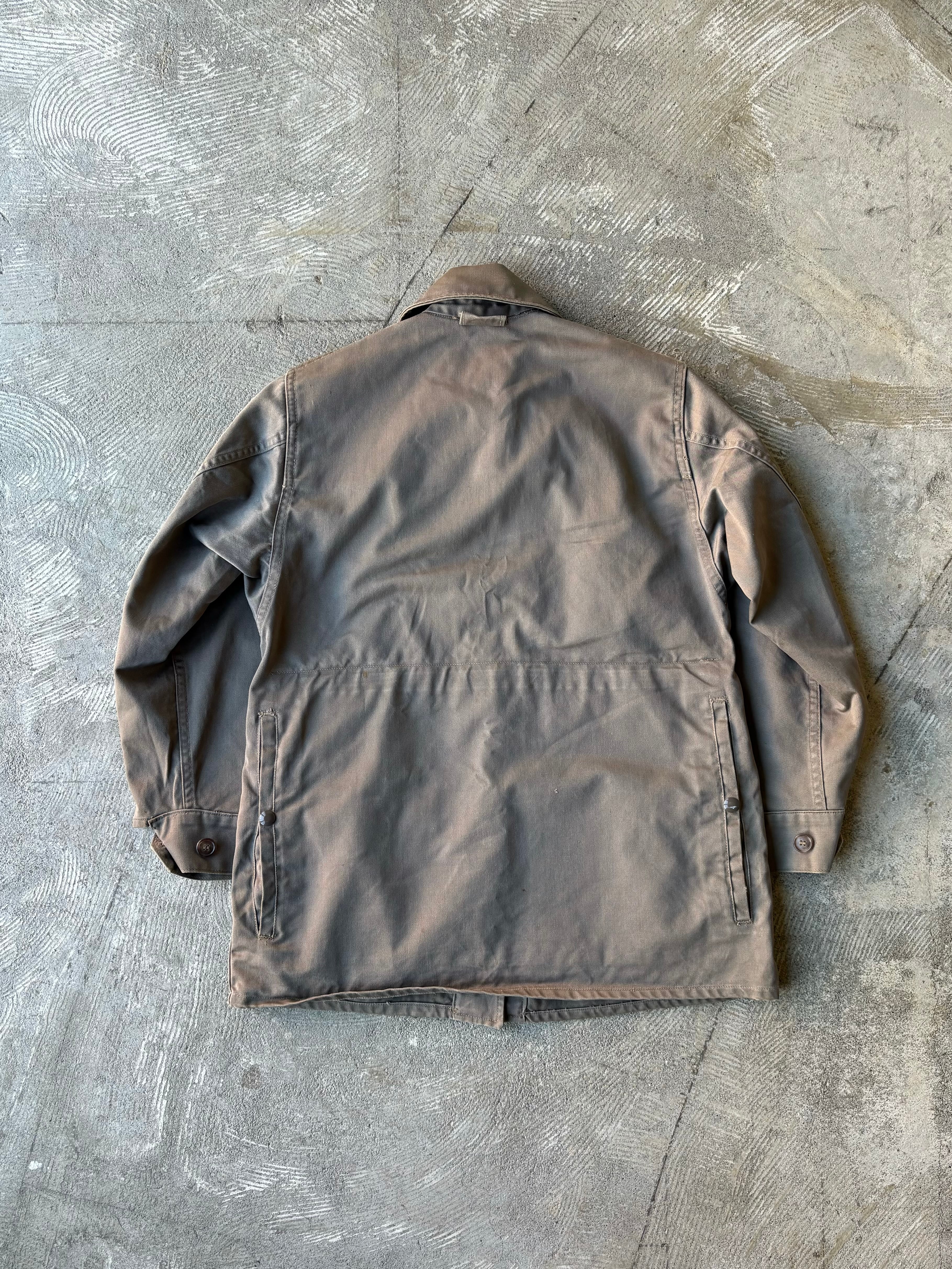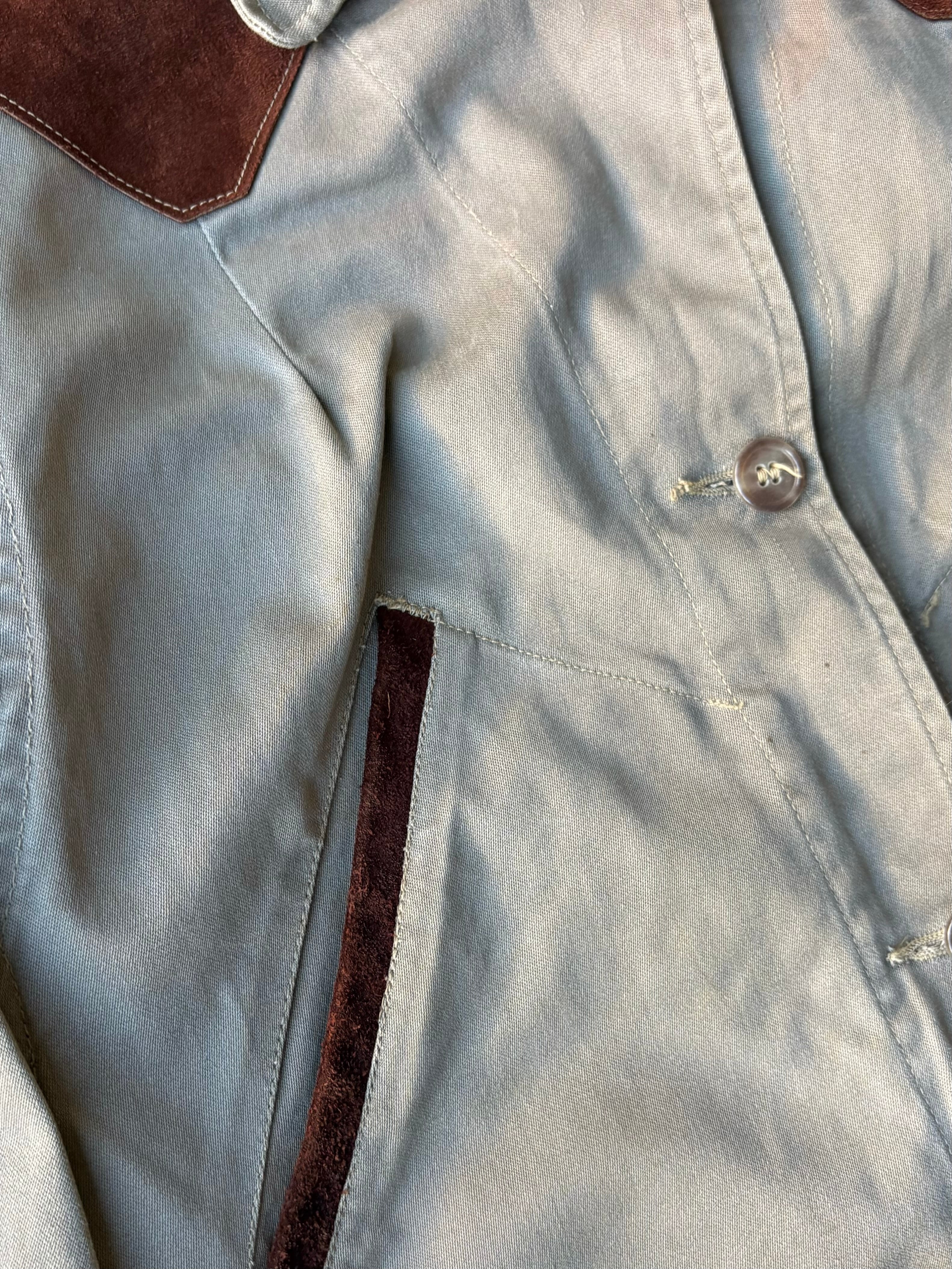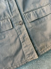 左裾、左ポケットフラップ、腹部左、右袖後、背面腰と裾付近に薄くシミがあります。