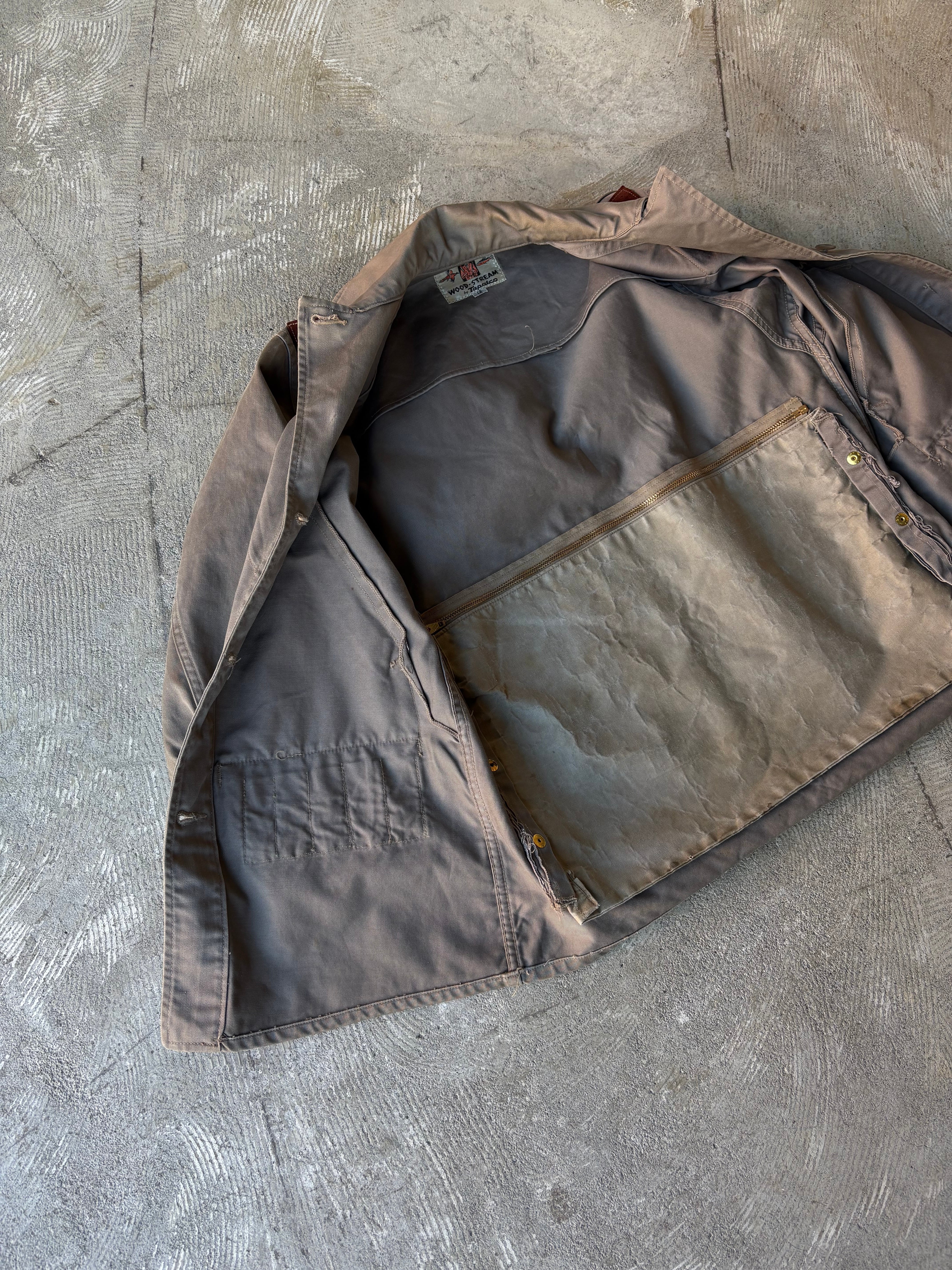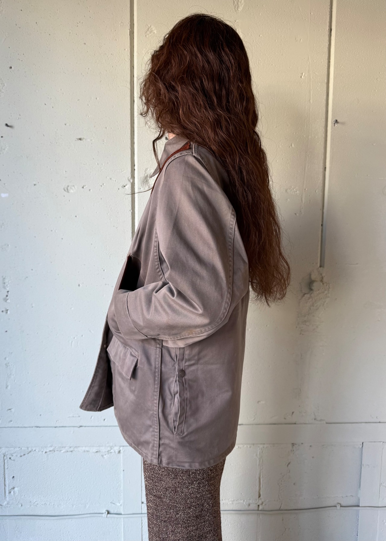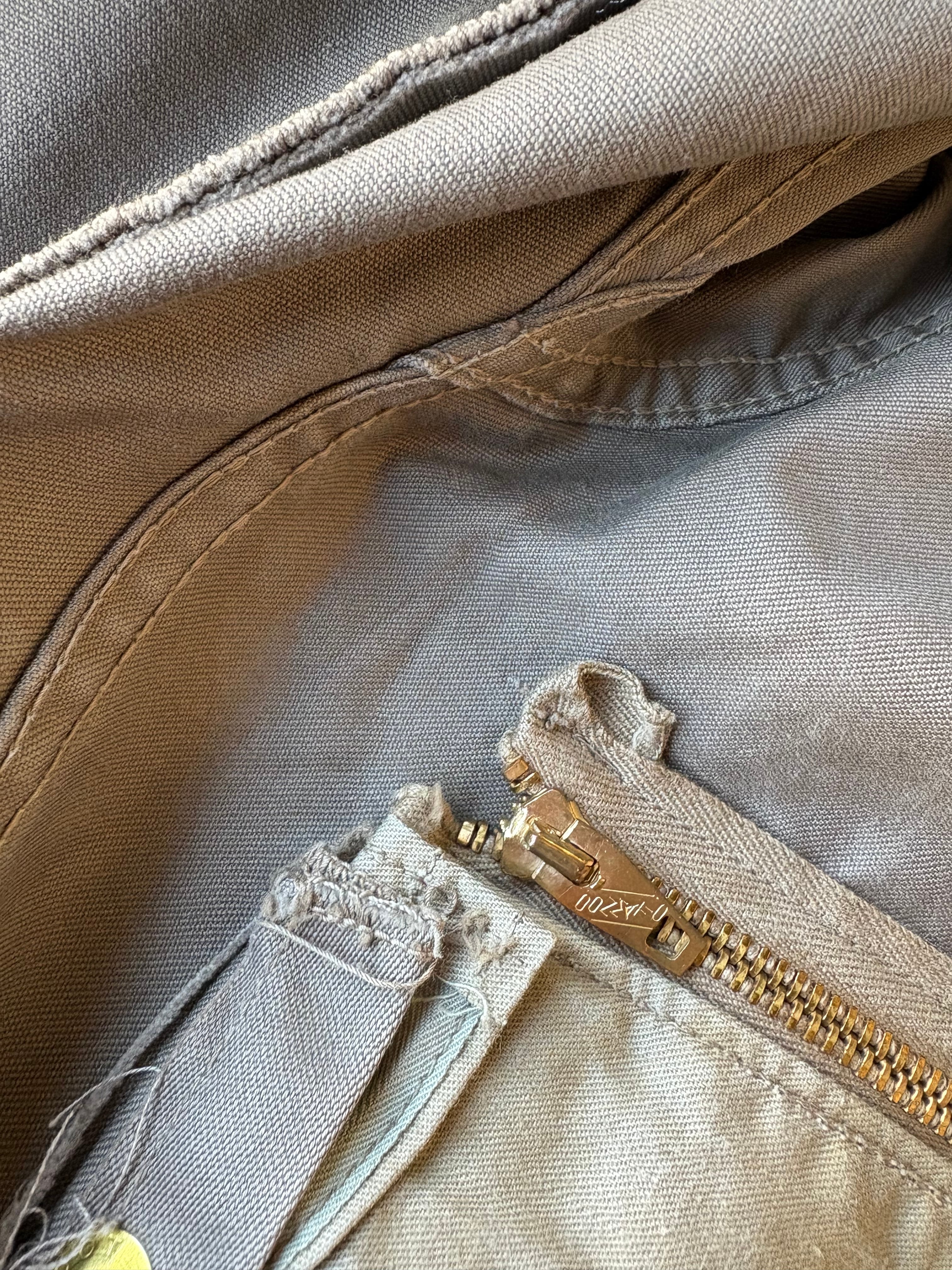 左裾、左ポケットフラップ、腹部左、右袖後、背面腰と裾付近に薄くシミがあります。
