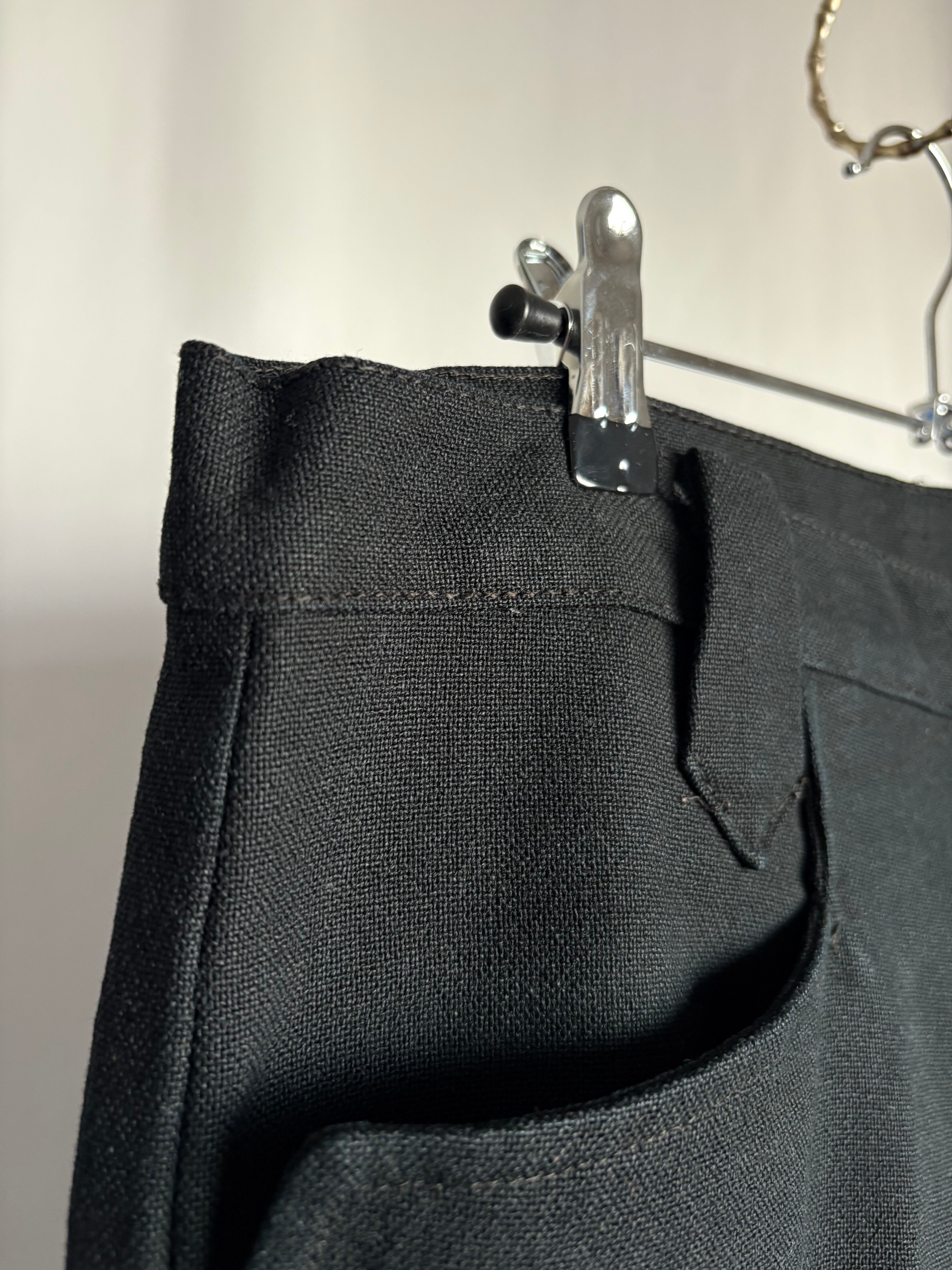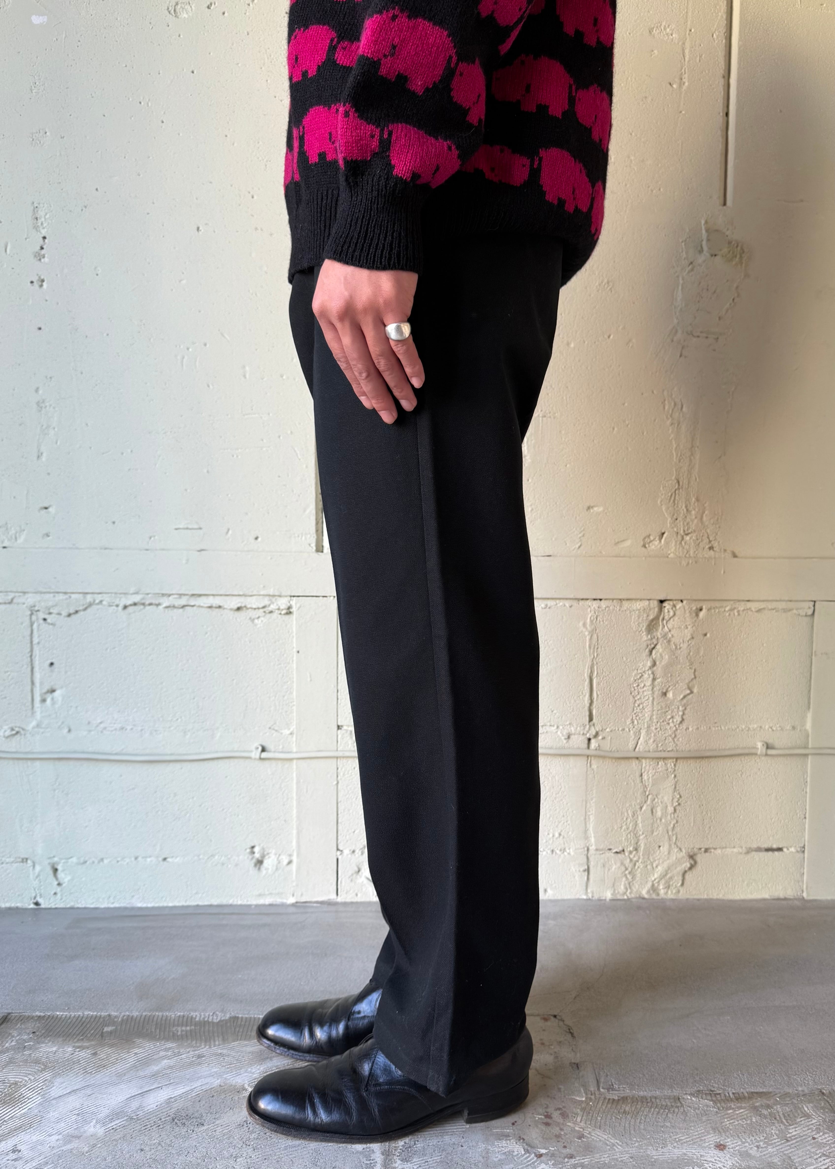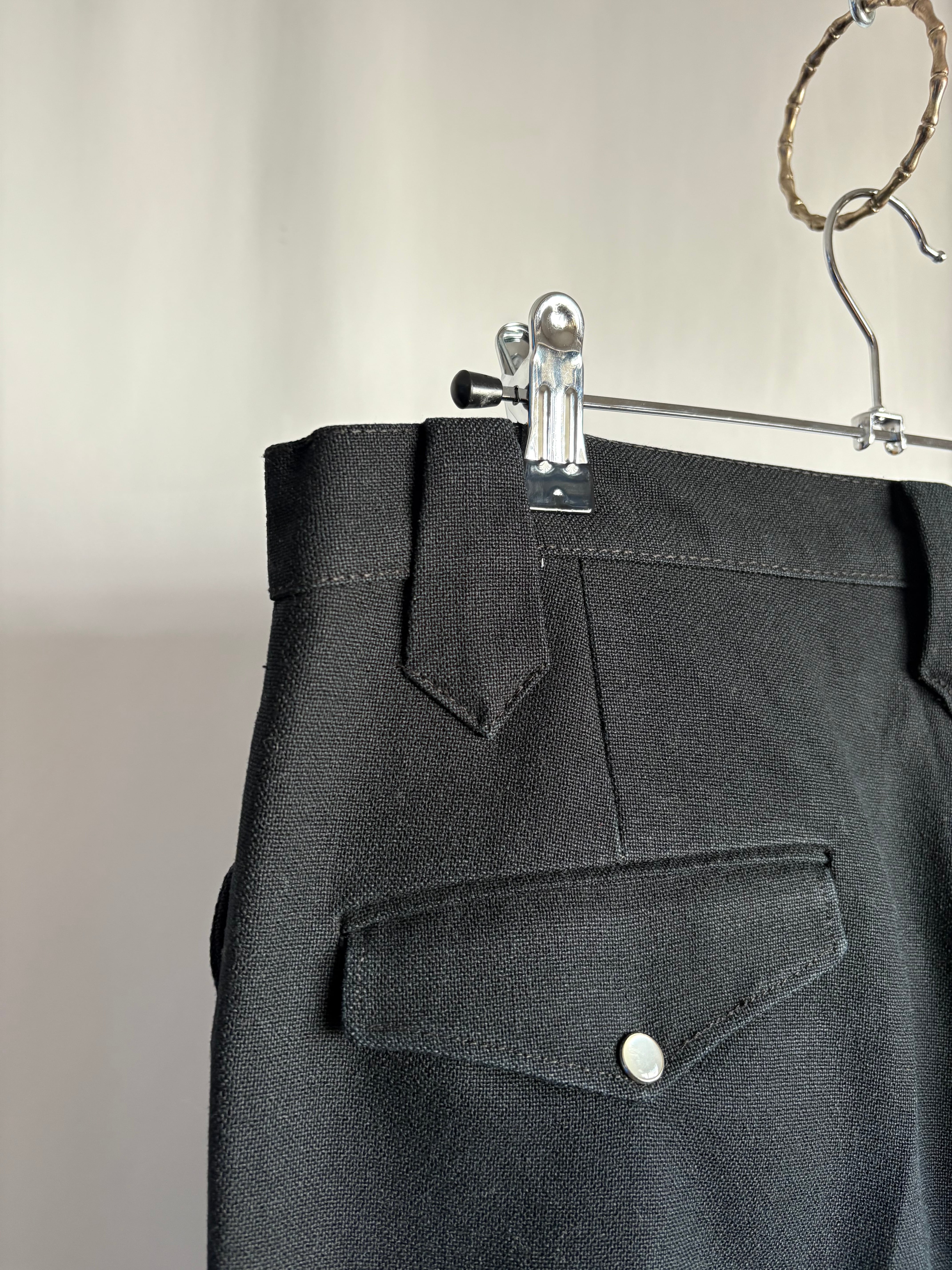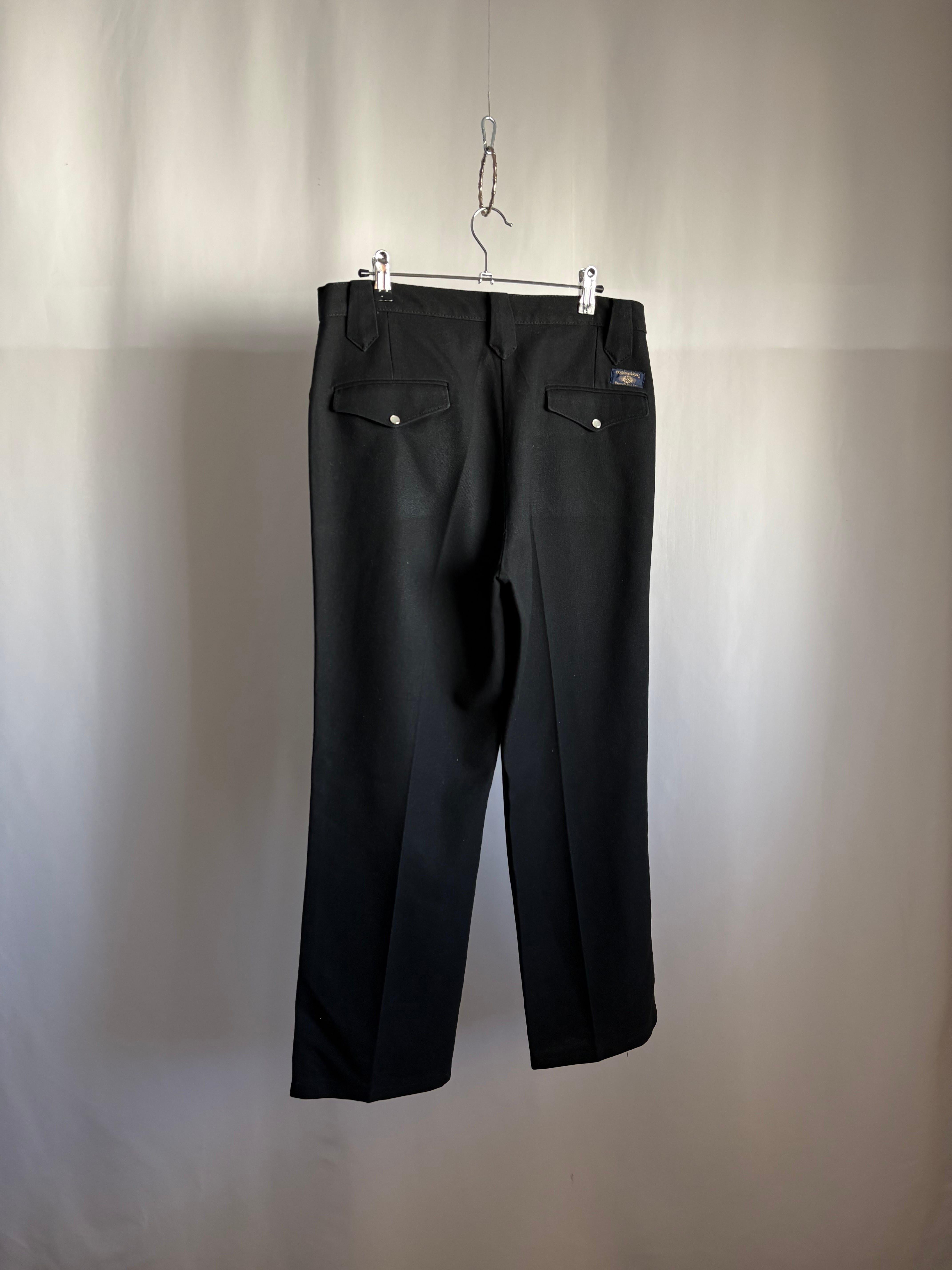 ウエスタンスタイルパンツ。化繊のミックスでよく見かけるタイプかと思いきや、レーヨン(ビスコース)混紡で生地を編んでいる糸がやや太めの為ギャバジンの様な程よい重みと、とろとろとしたドレープ感を感じ取れます。