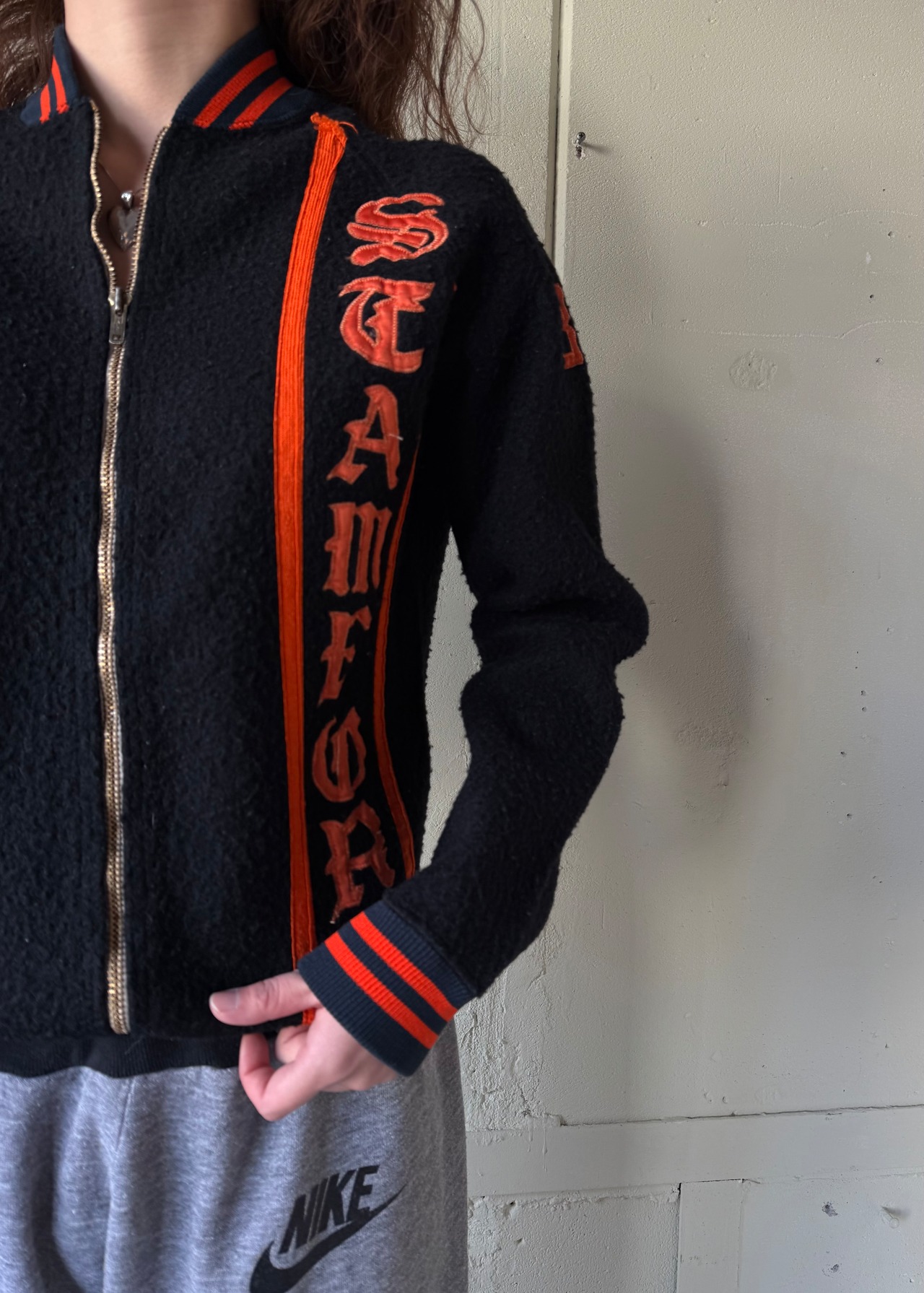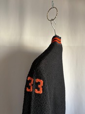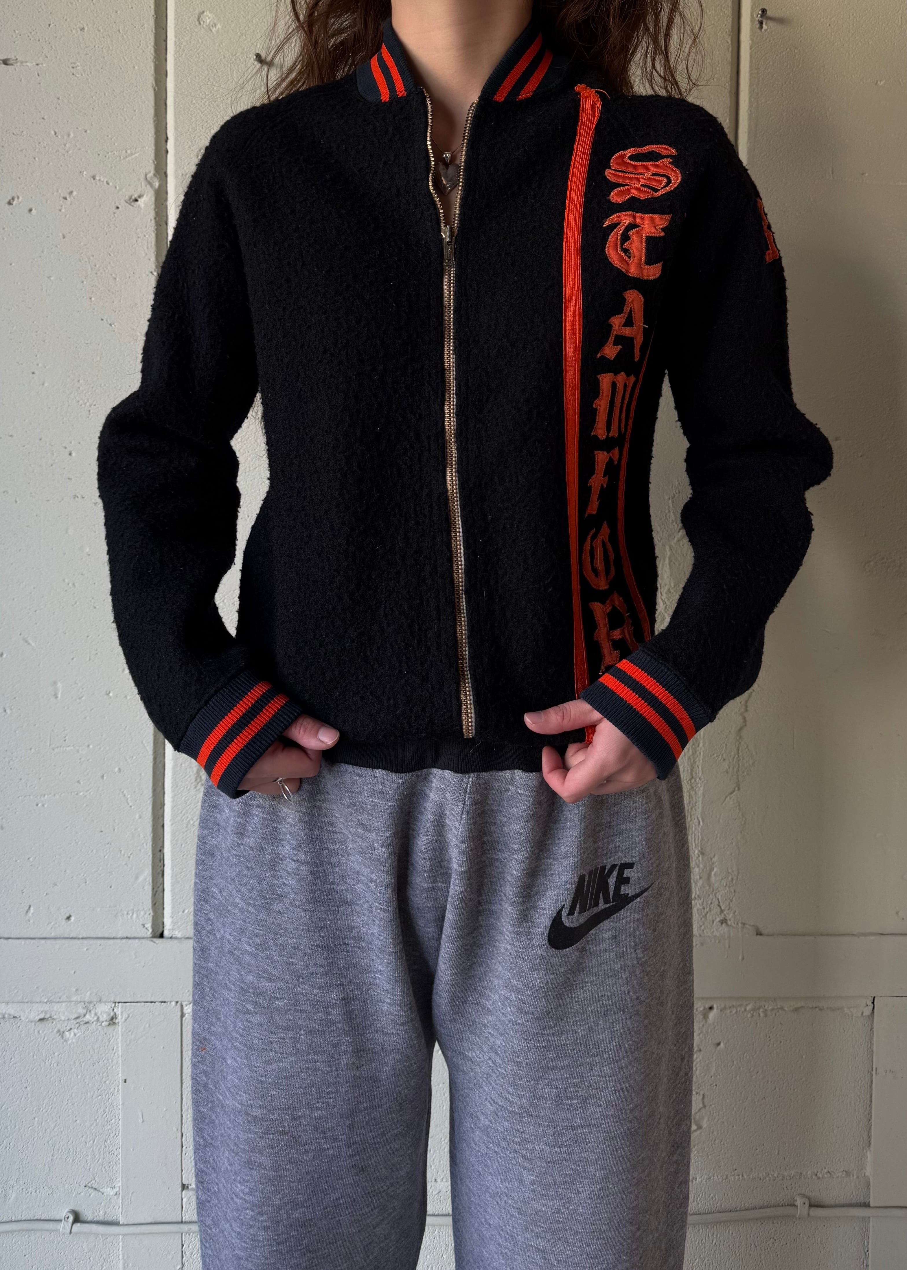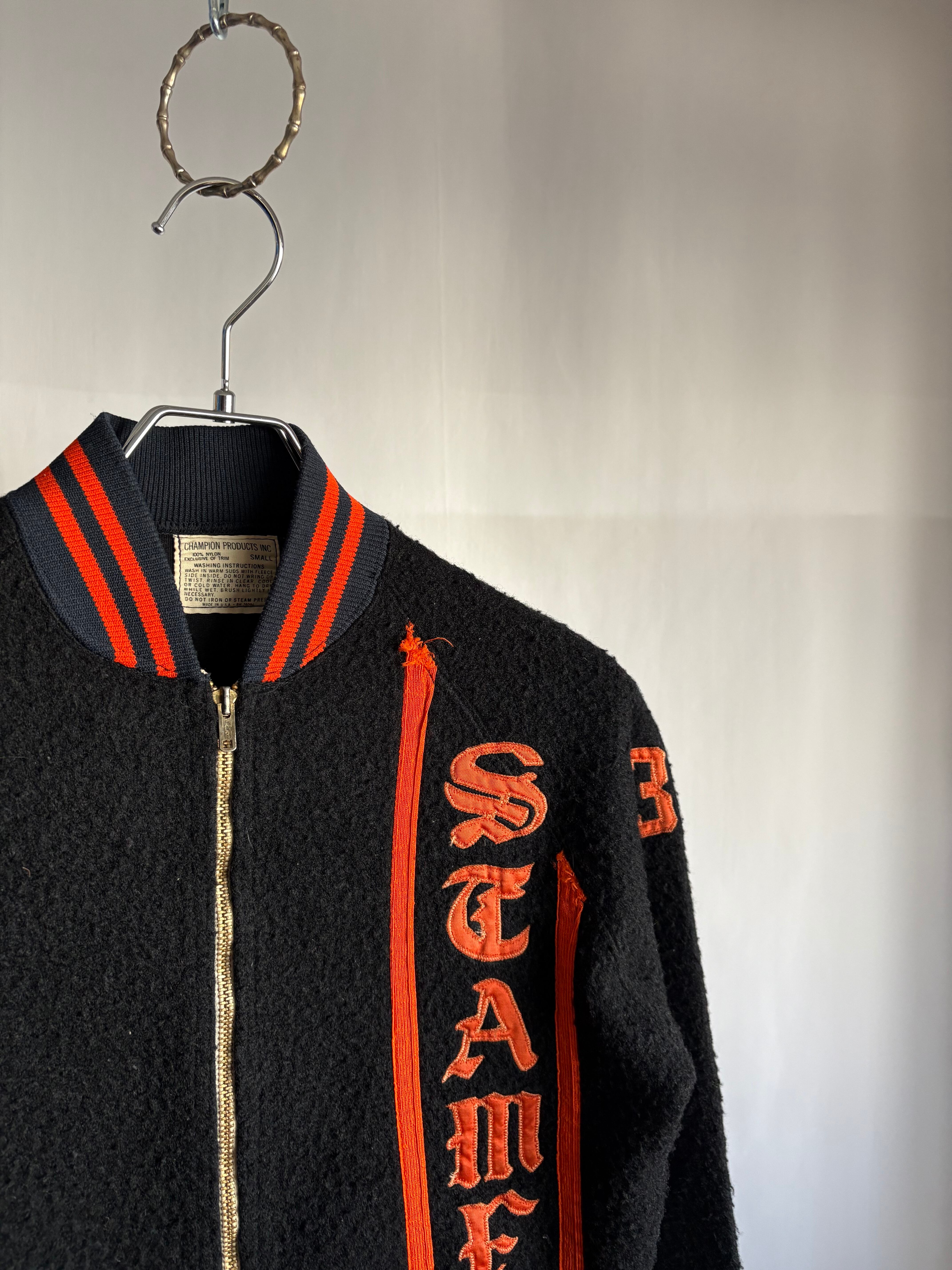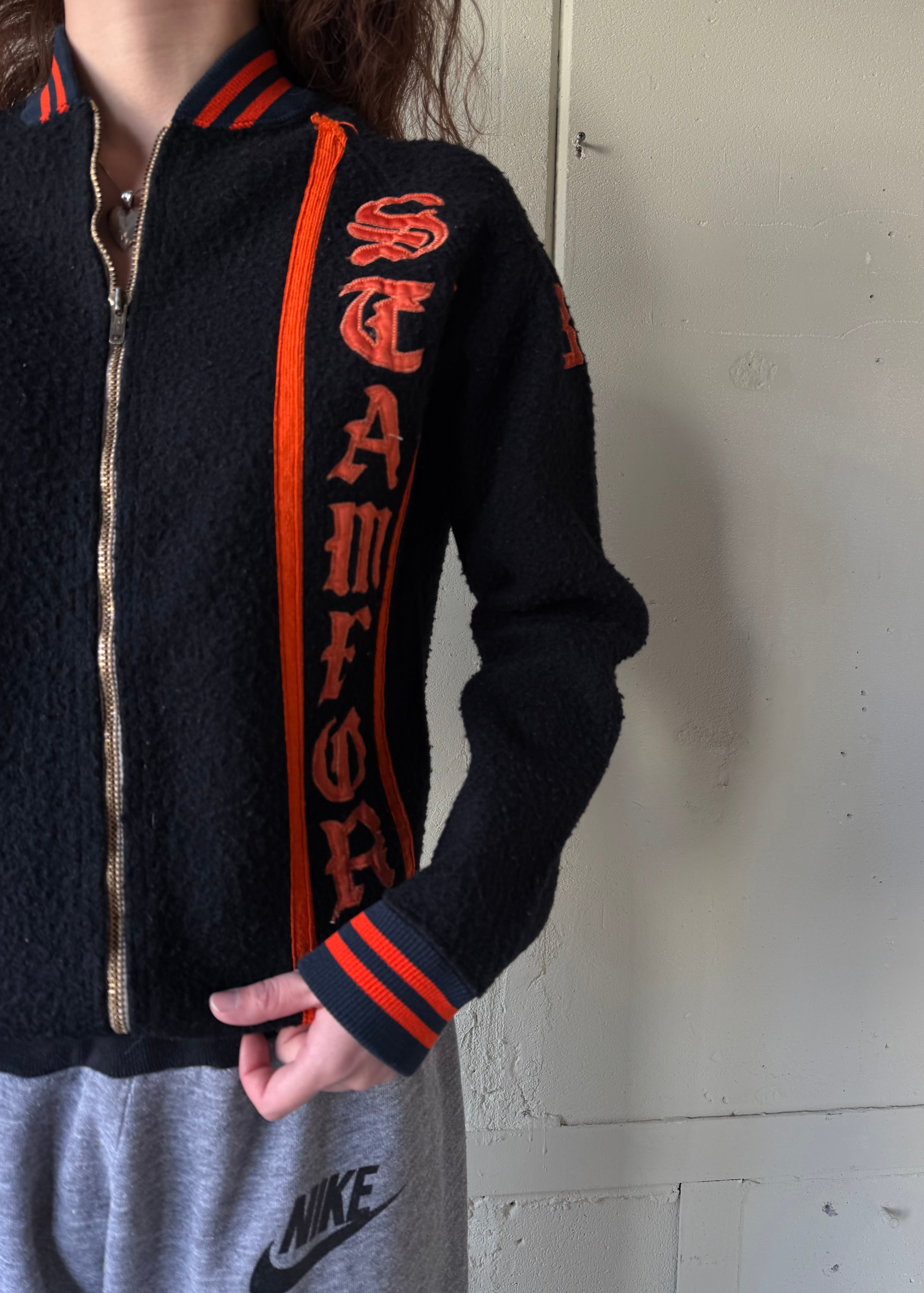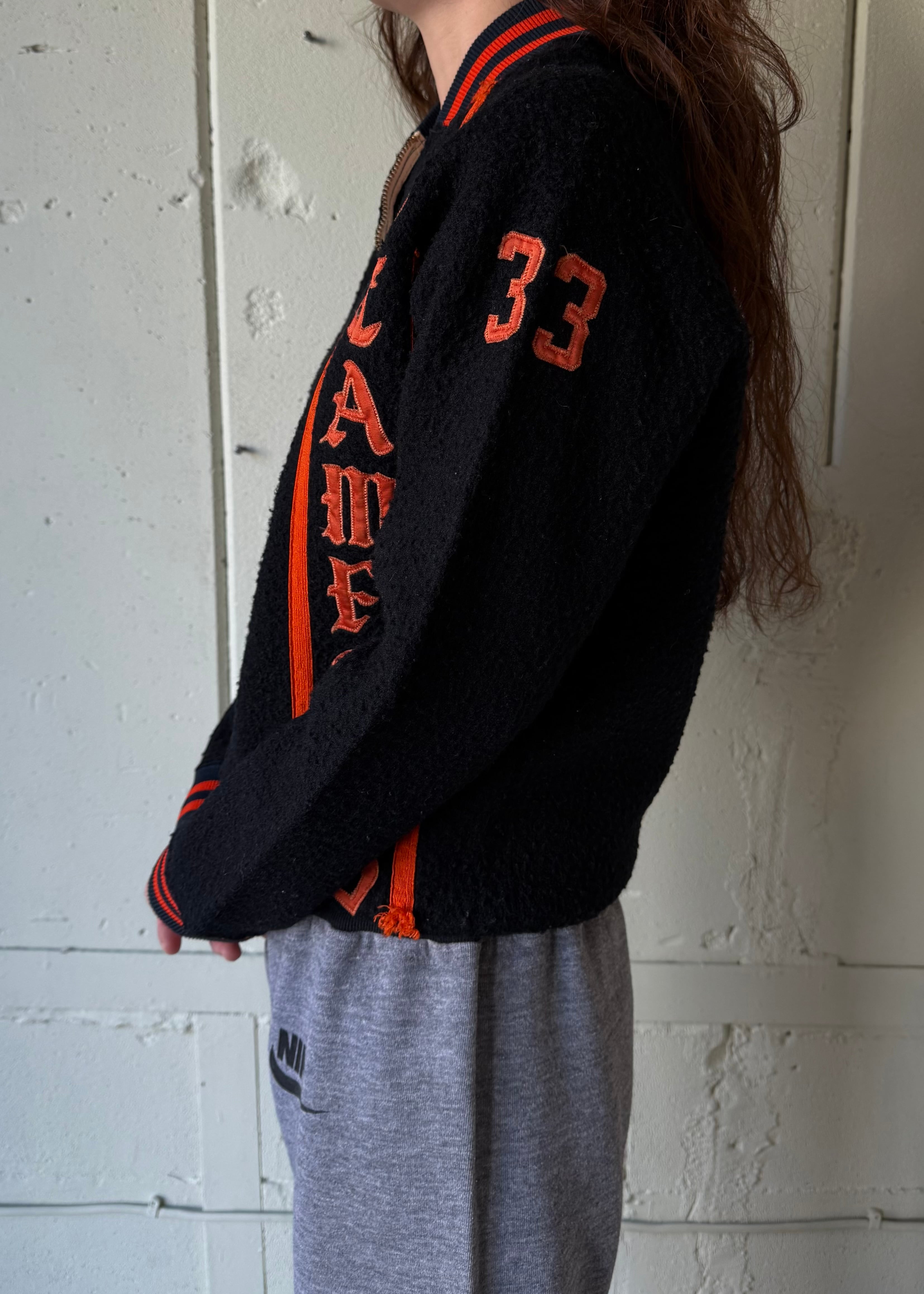 ブラックのオールドフリースボアのフルジップジャケットです。この手のカレッジ/スタジアムのチアジャケット、ハーフジップなどで派手な色味が多いですがブラックベースにオレンジのとてもかっこいい合わせです。