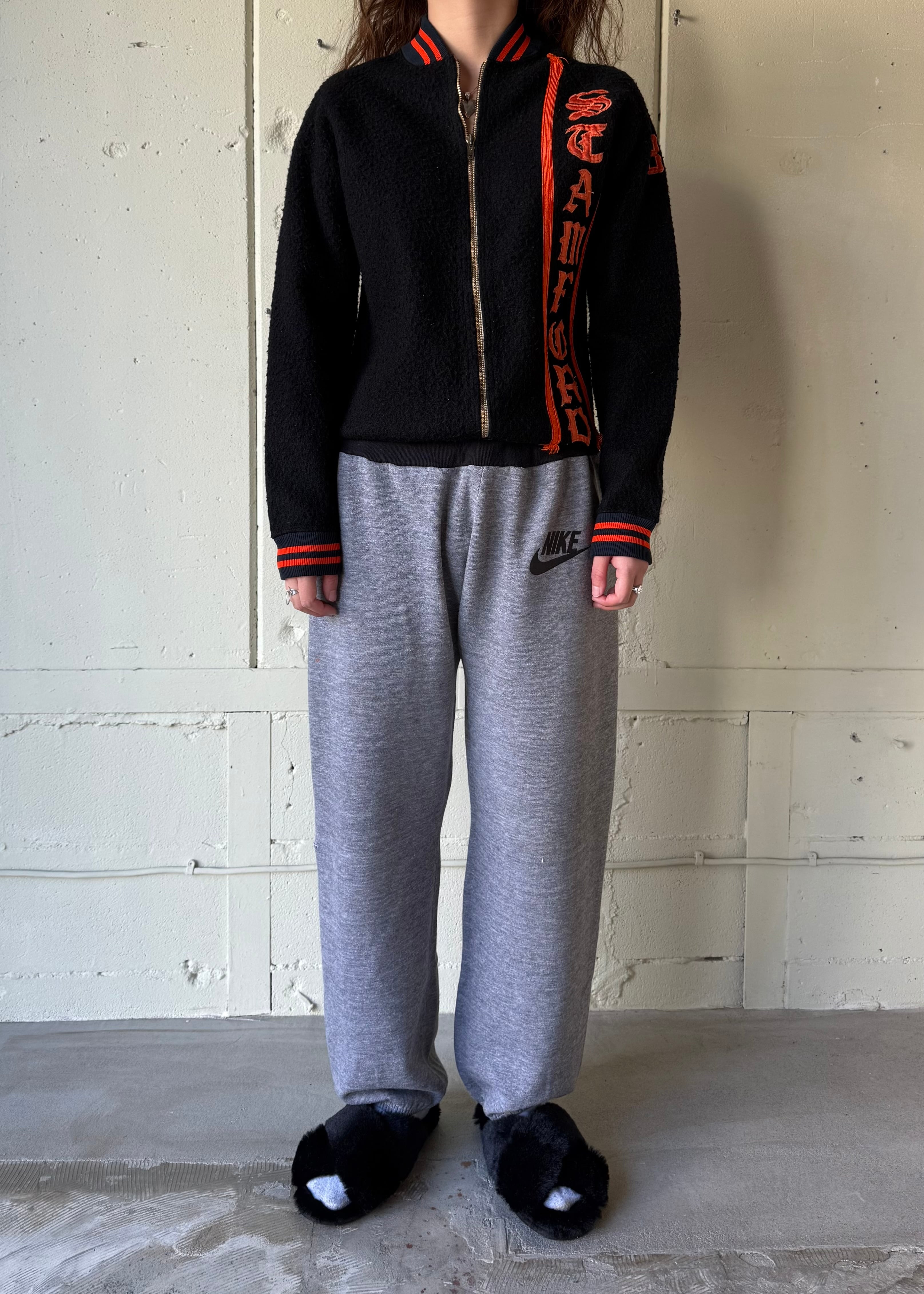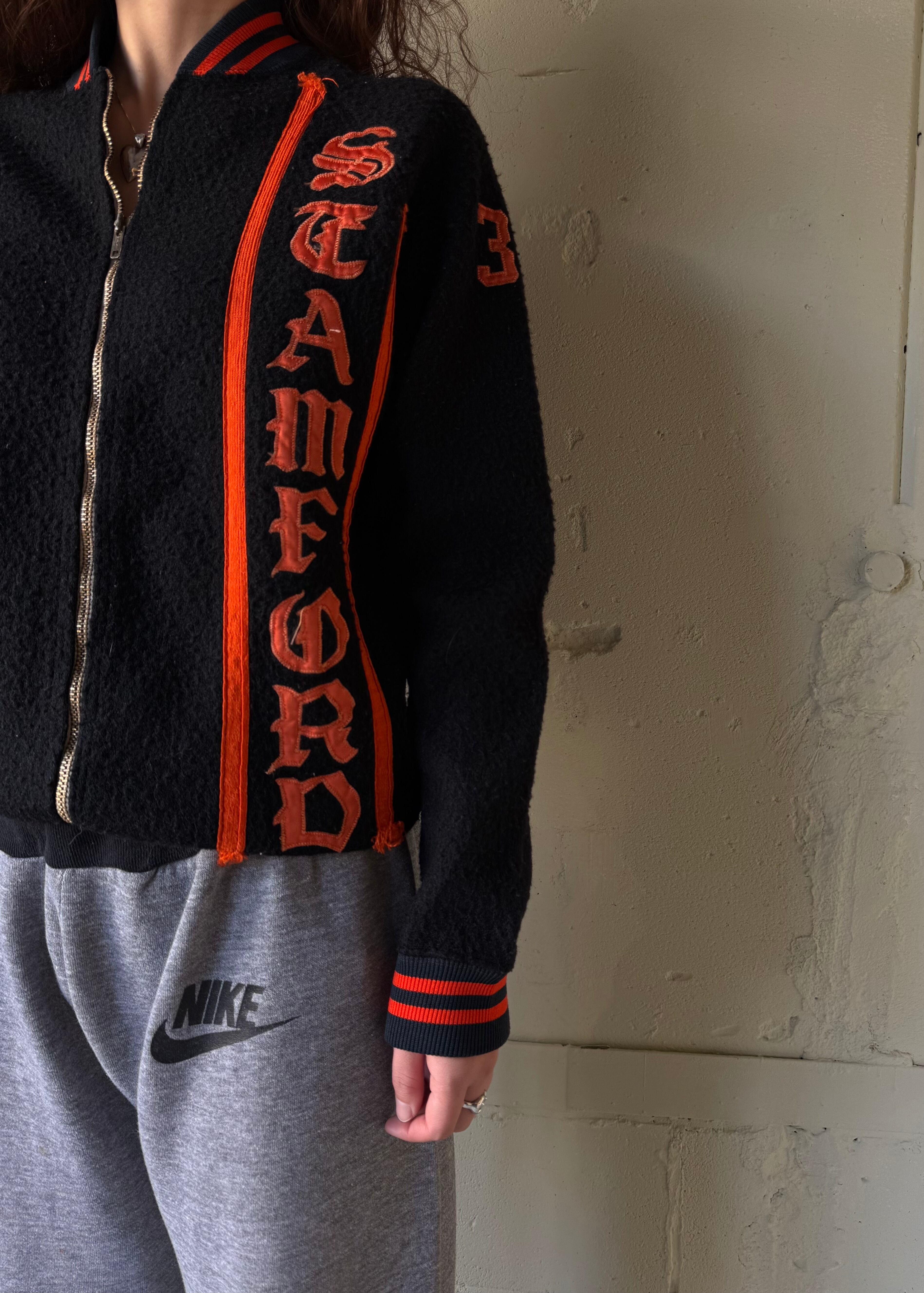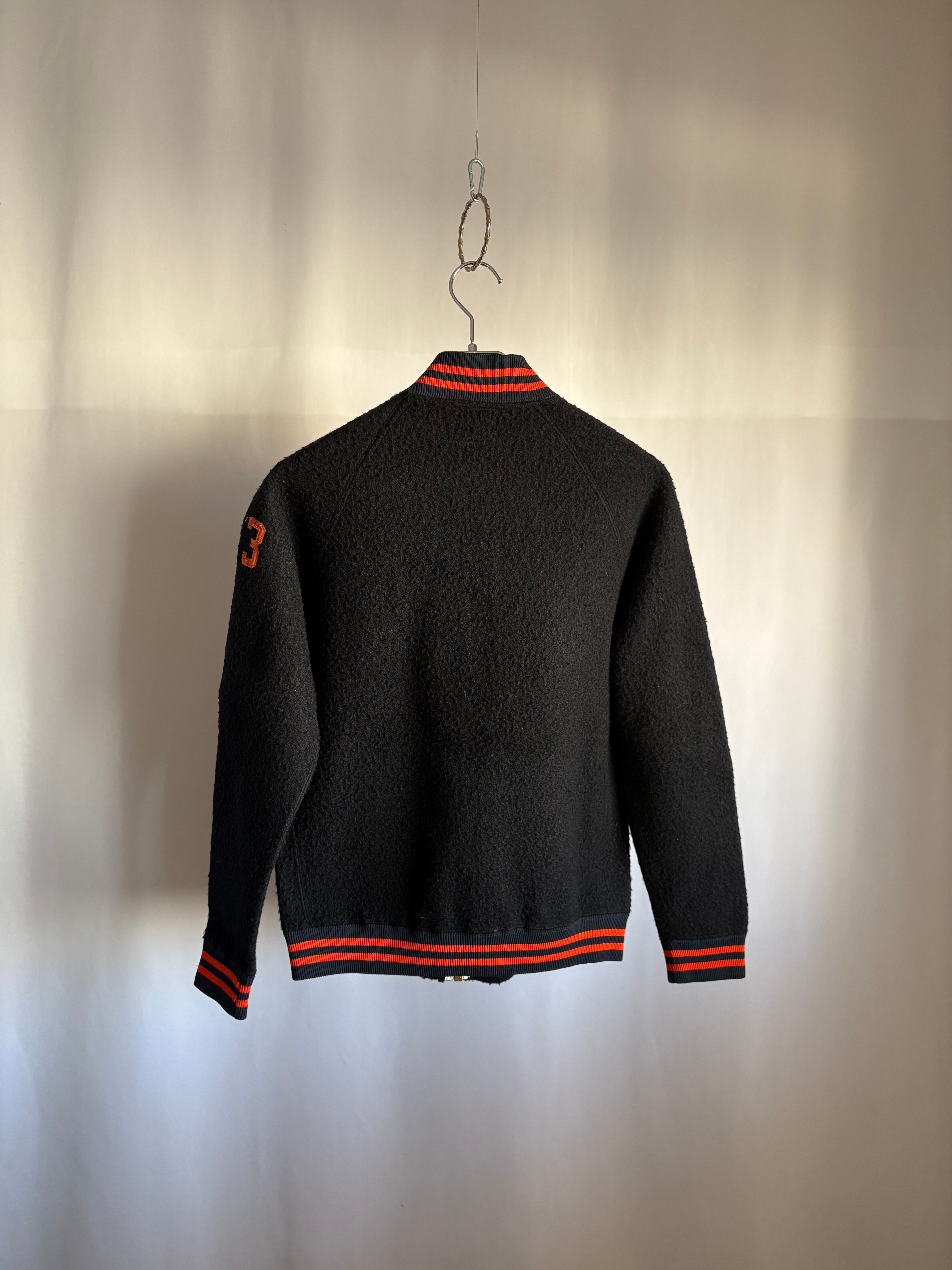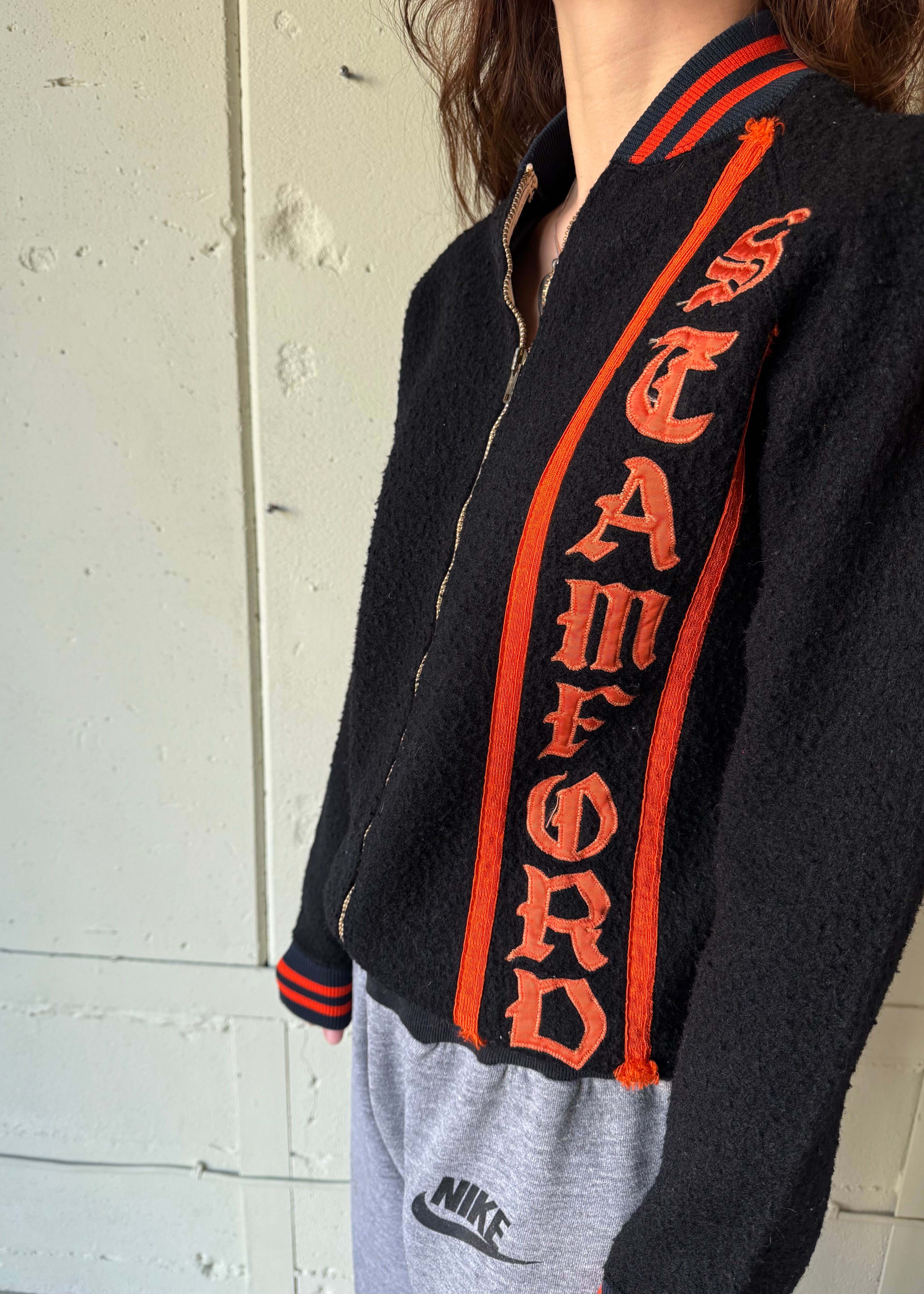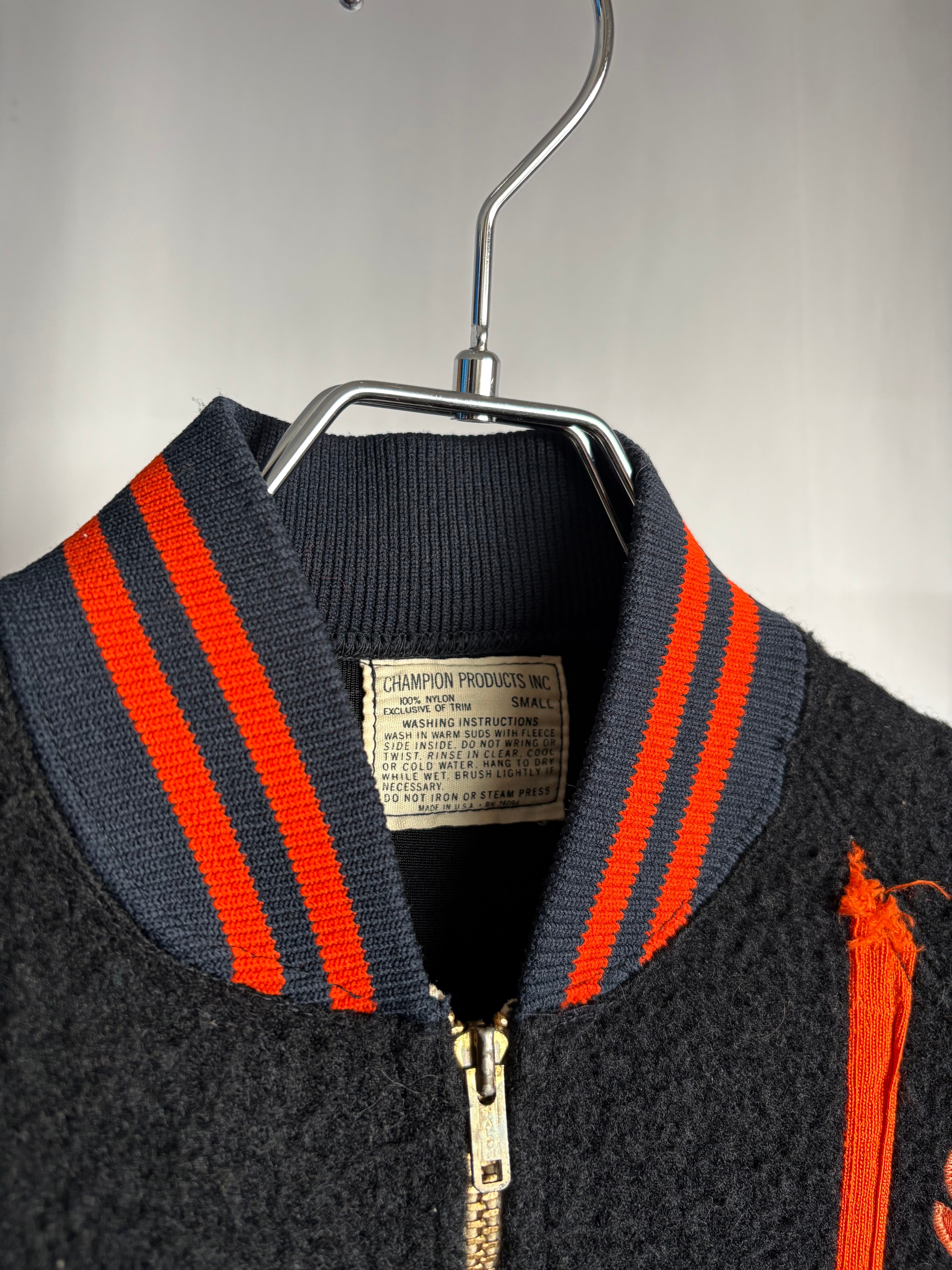 ブラックのオールドフリースボアのフルジップジャケットです。この手のカレッジ/スタジアムのチアジャケット、ハーフジップなどで派手な色味が多いですがブラックベースにオレンジのとてもかっこいい合わせです。