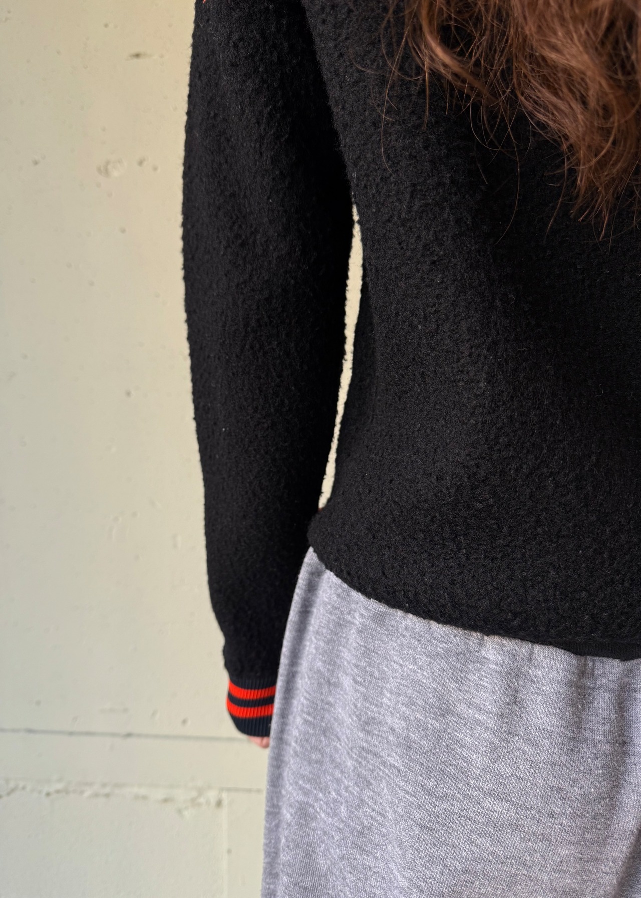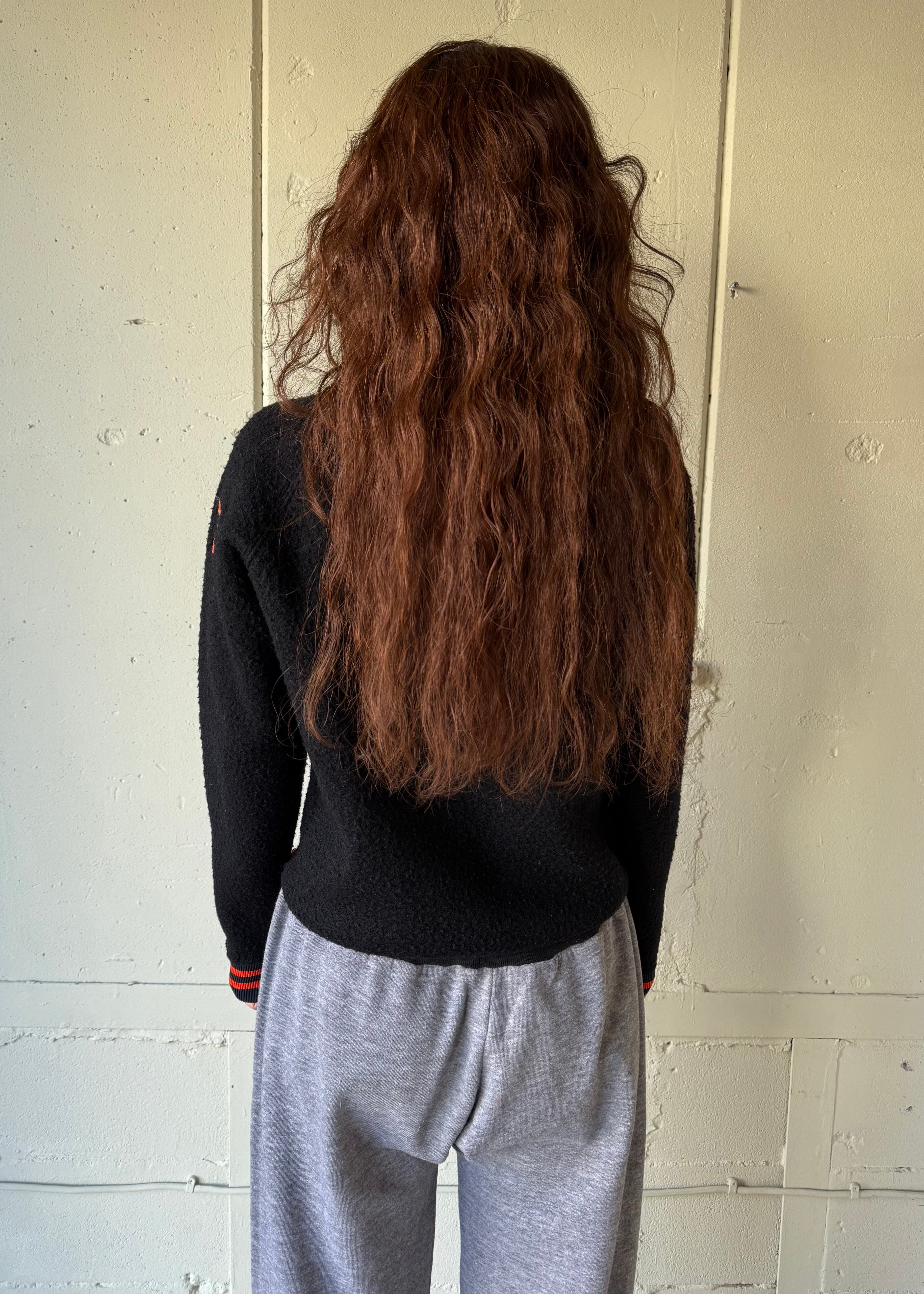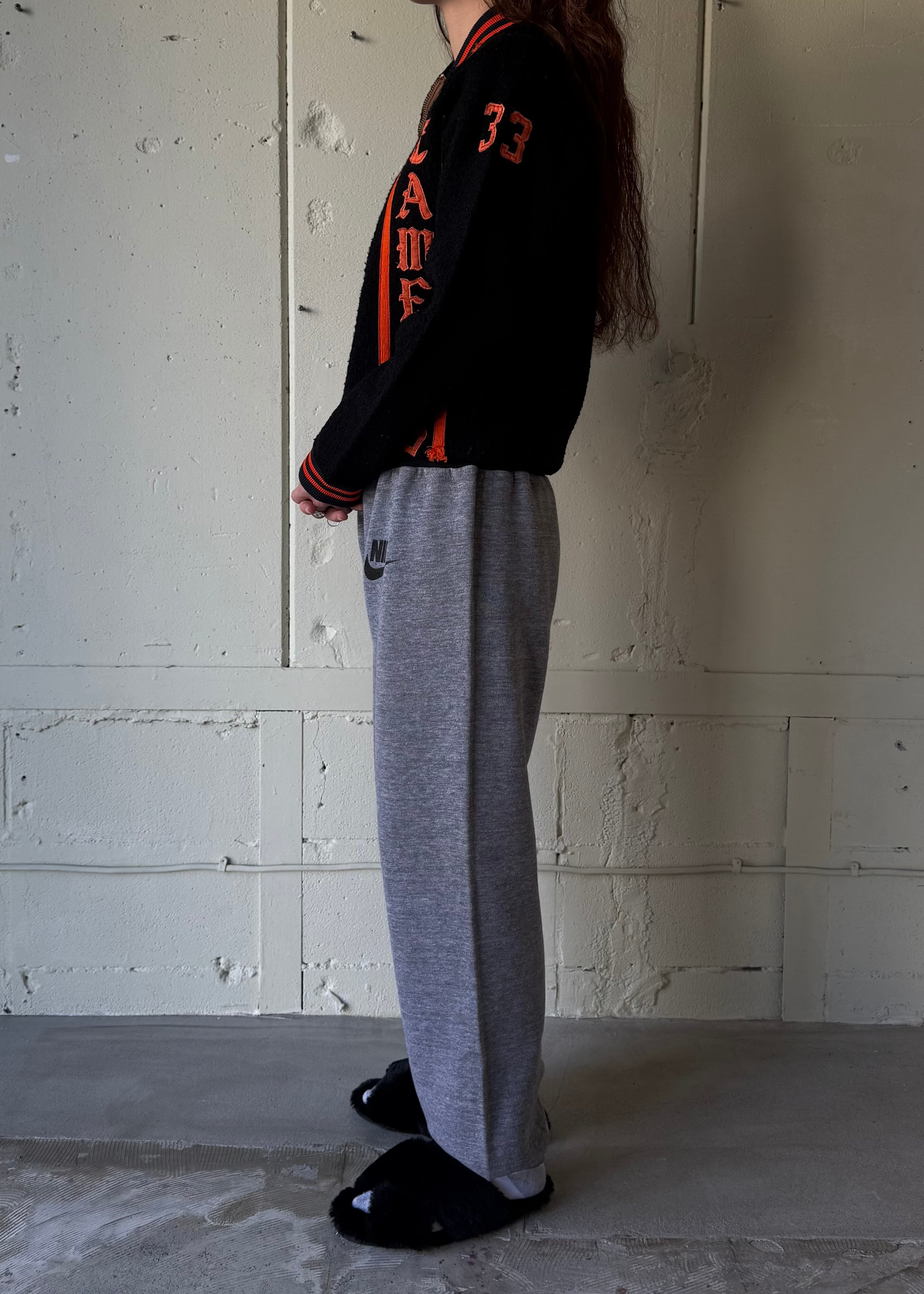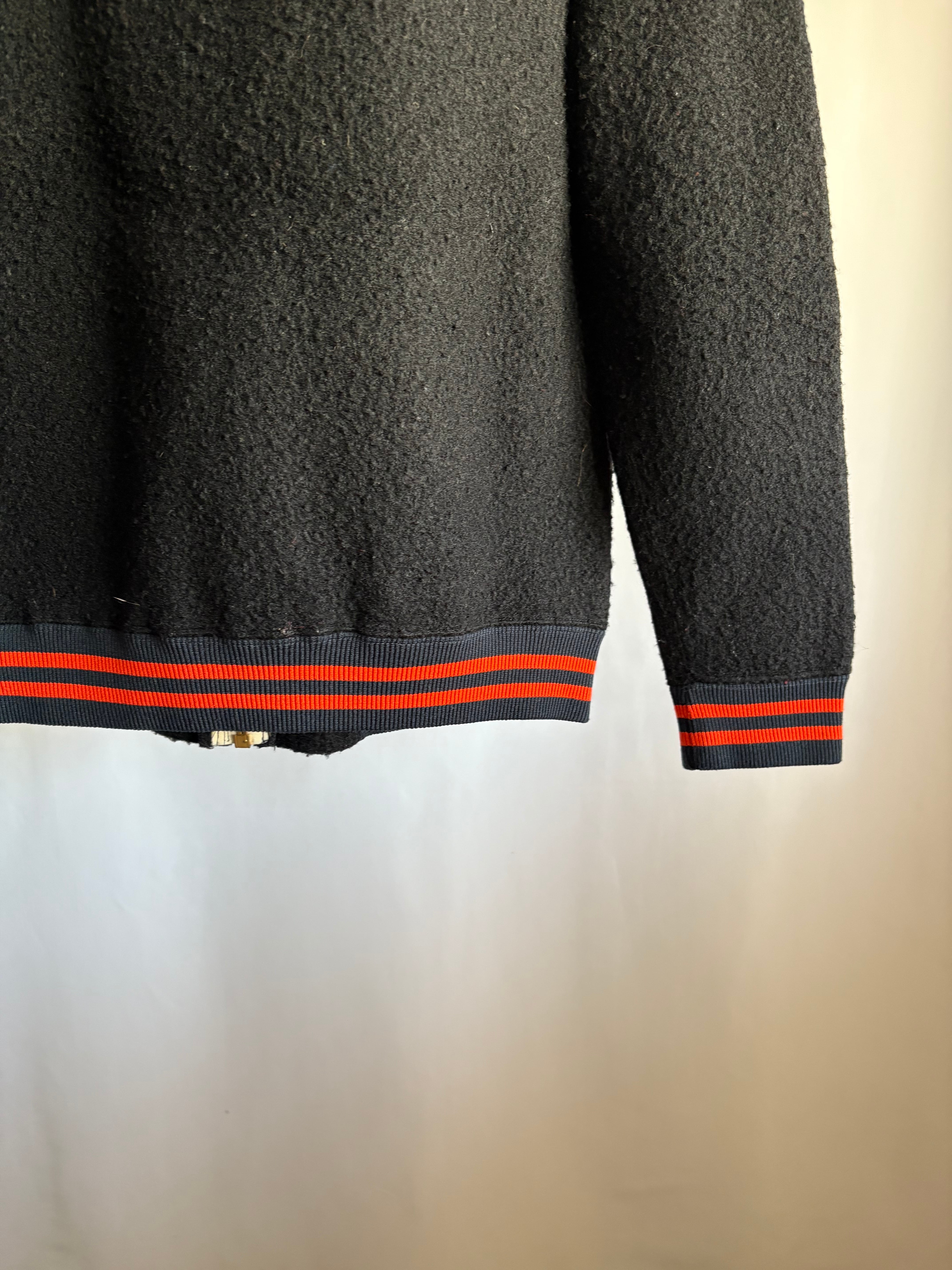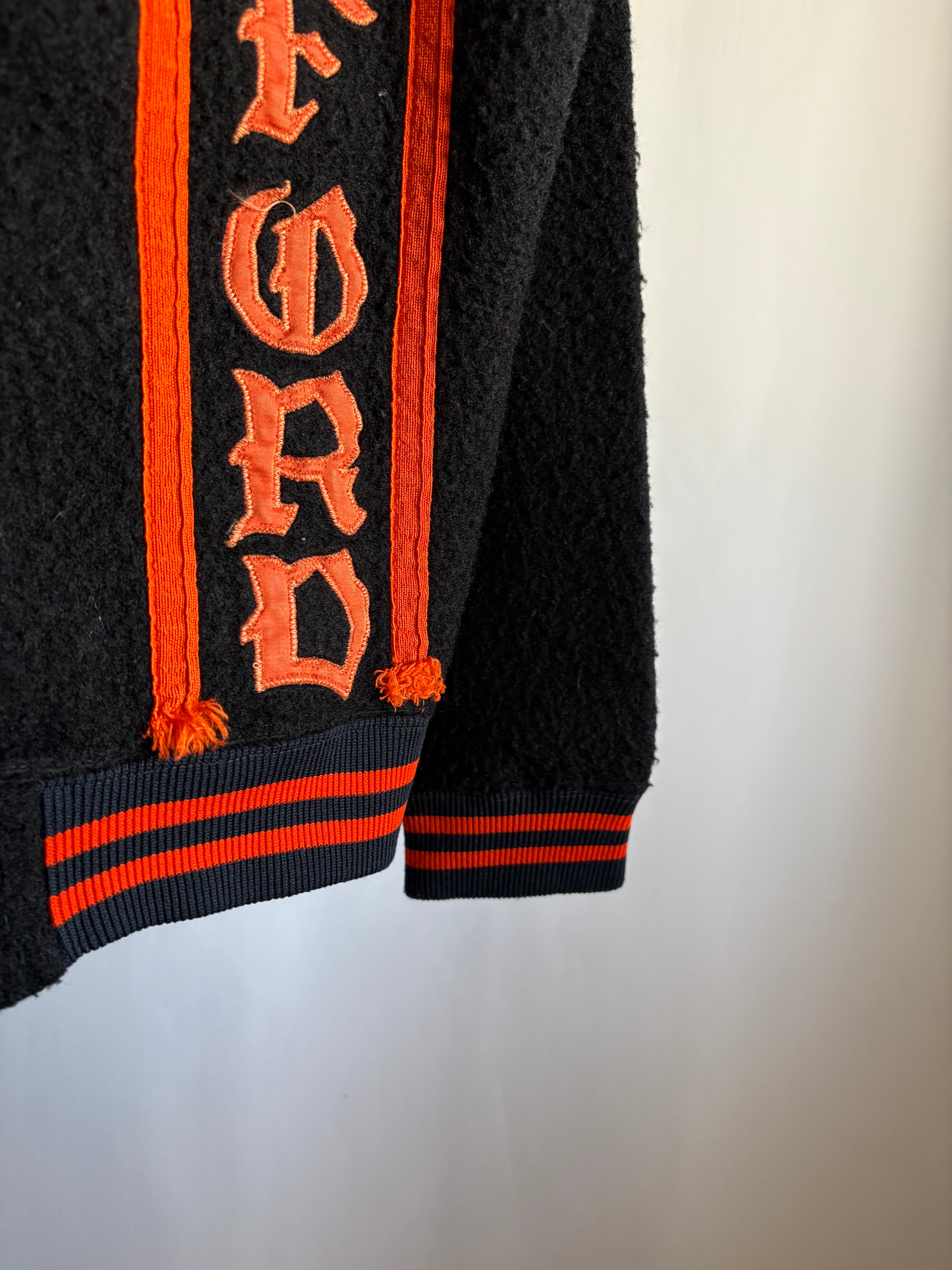 ブラックのオールドフリースボアのフルジップジャケットです。この手のカレッジ/スタジアムのチアジャケット、ハーフジップなどで派手な色味が多いですがブラックベースにオレンジのとてもかっこいい合わせです。