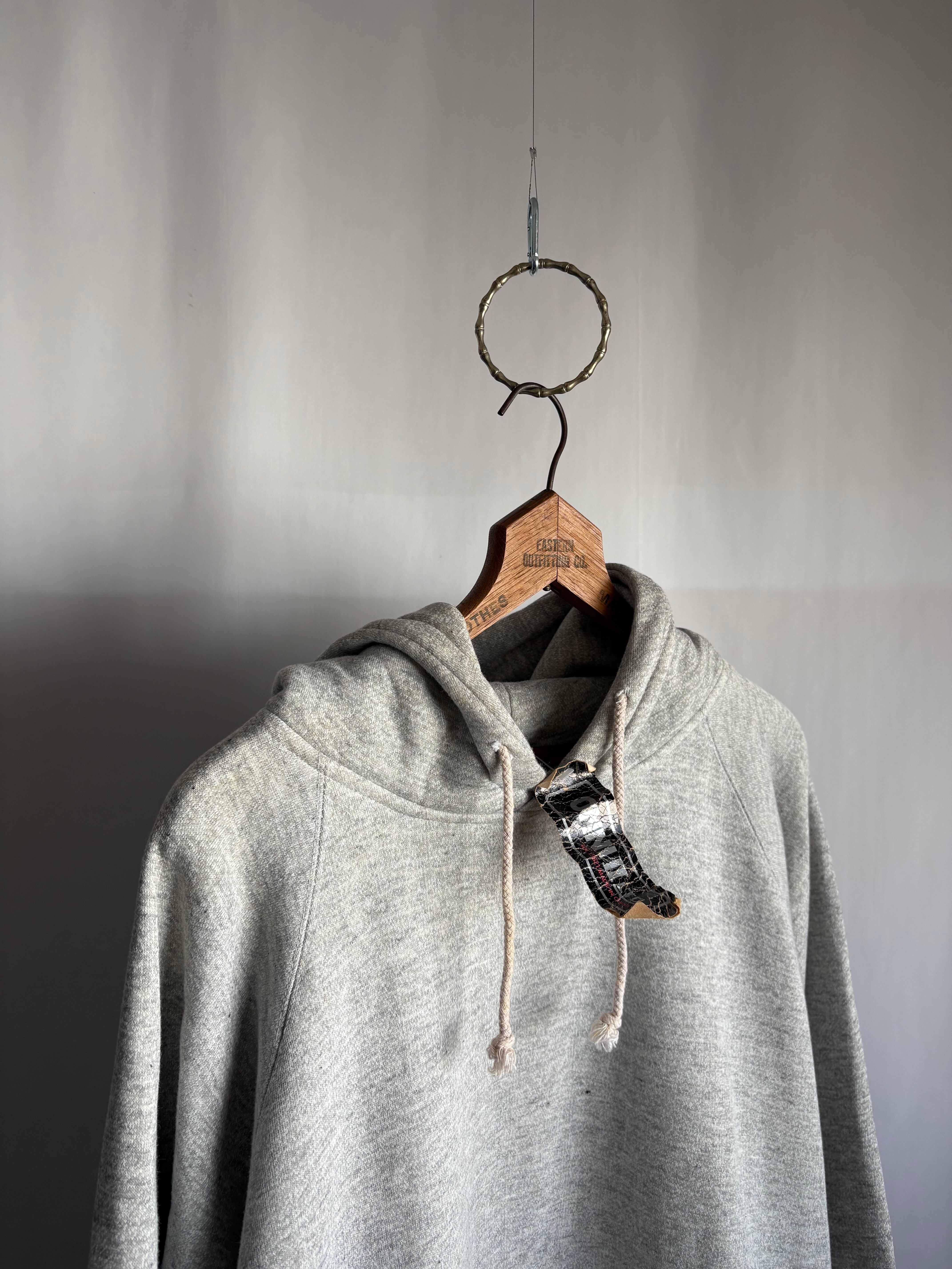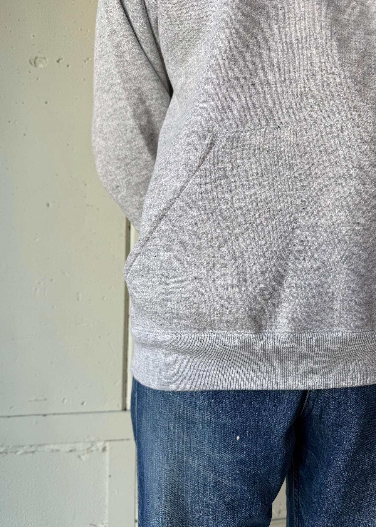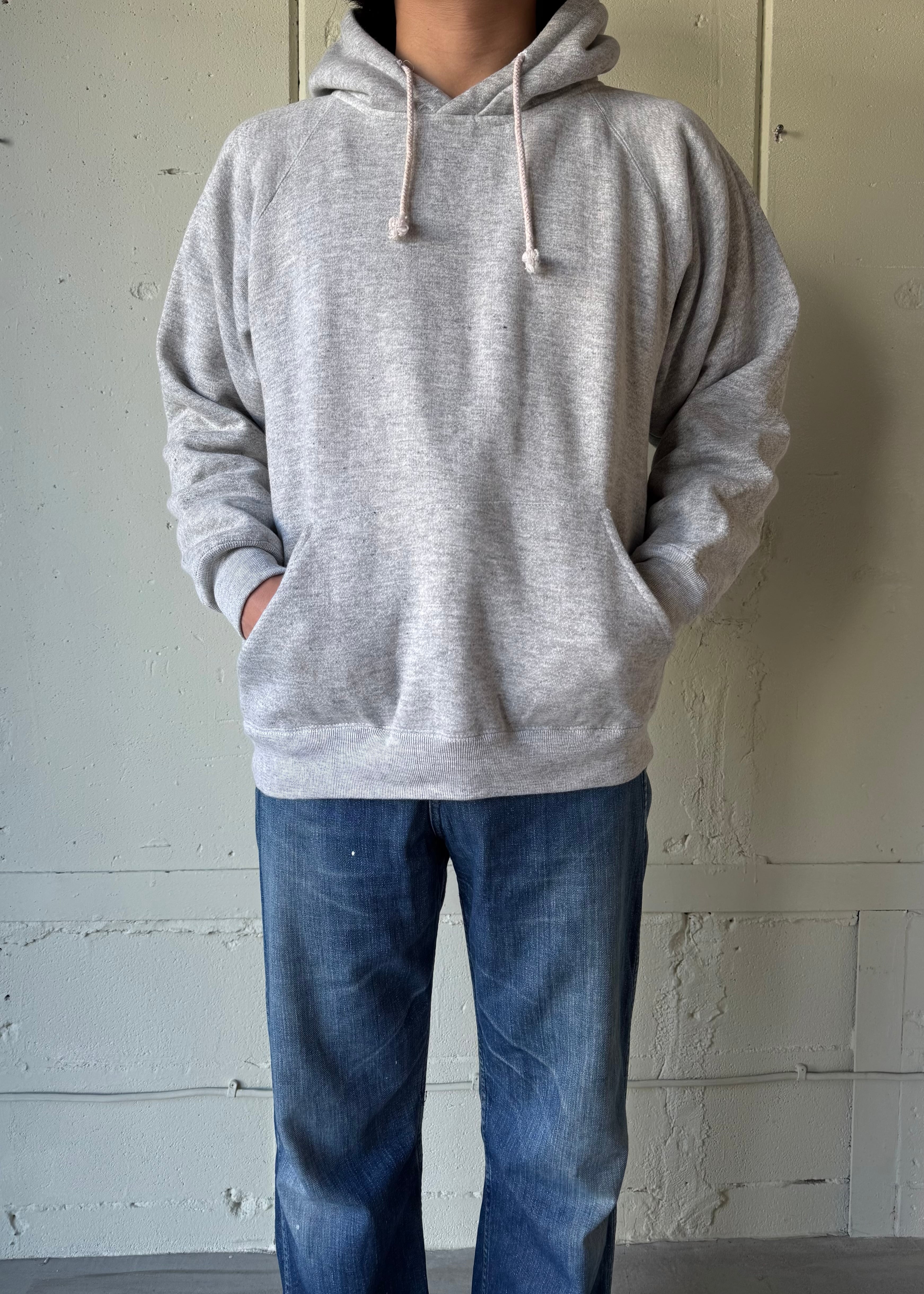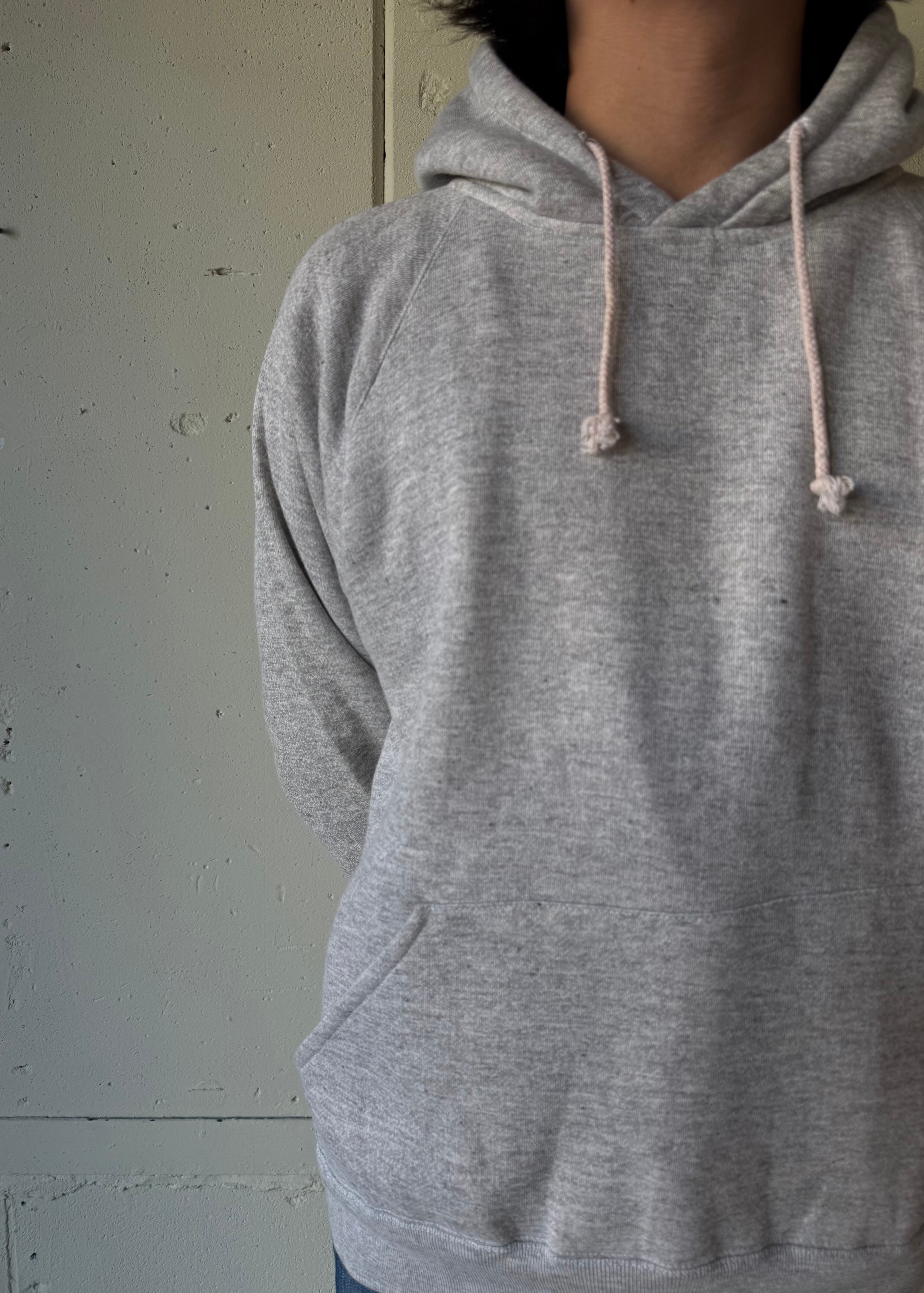 普通のグレーのパーカー、しかもチャイナ製。けれど1970s/80sあたりの未だ大量生産過ぎない自体のものです。ポケットやフードの大きさが地味ですが珍しい。どこかビンテージのフーディーを思い起こすものの、何故か化繊100%。そこも良いですね。