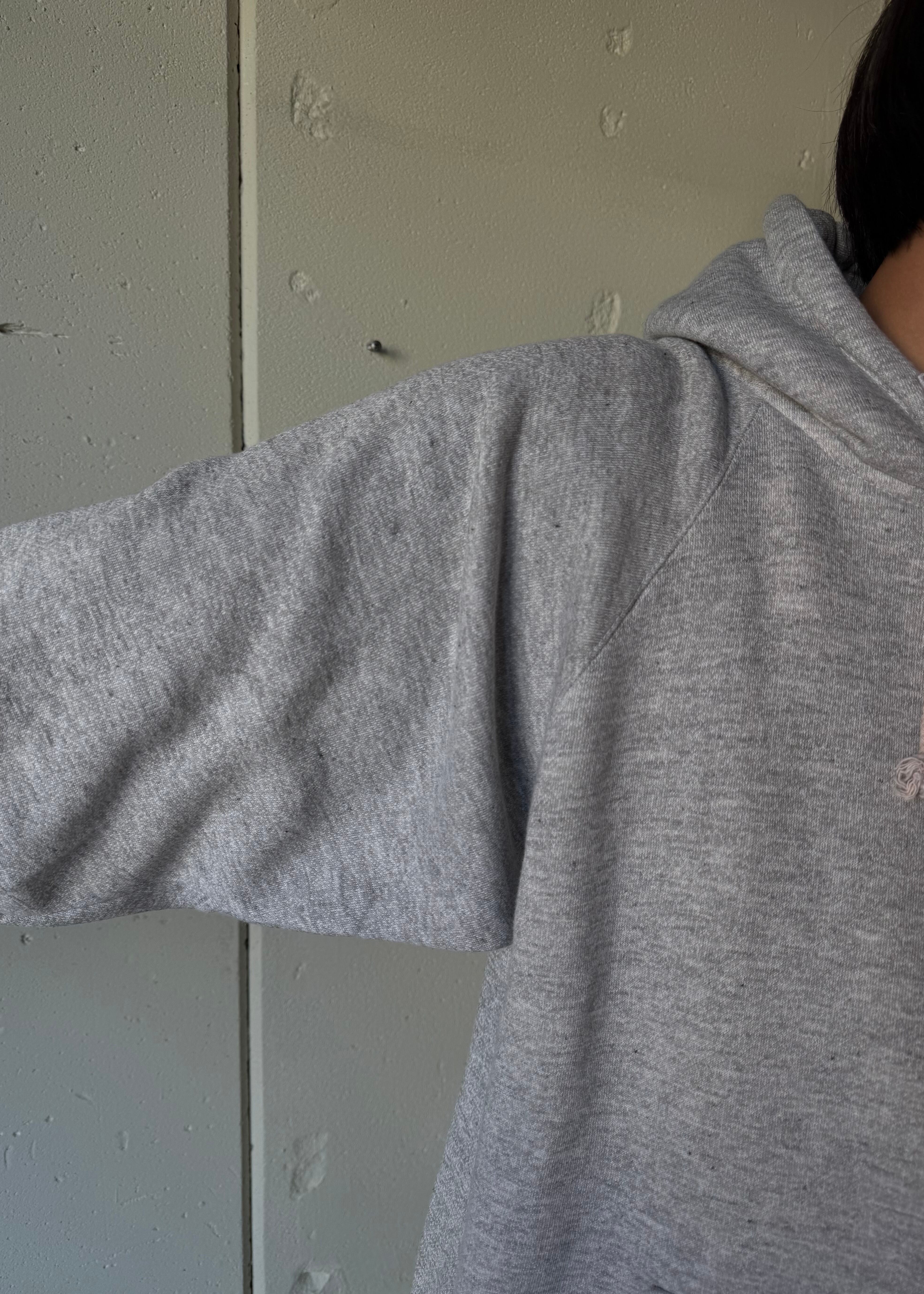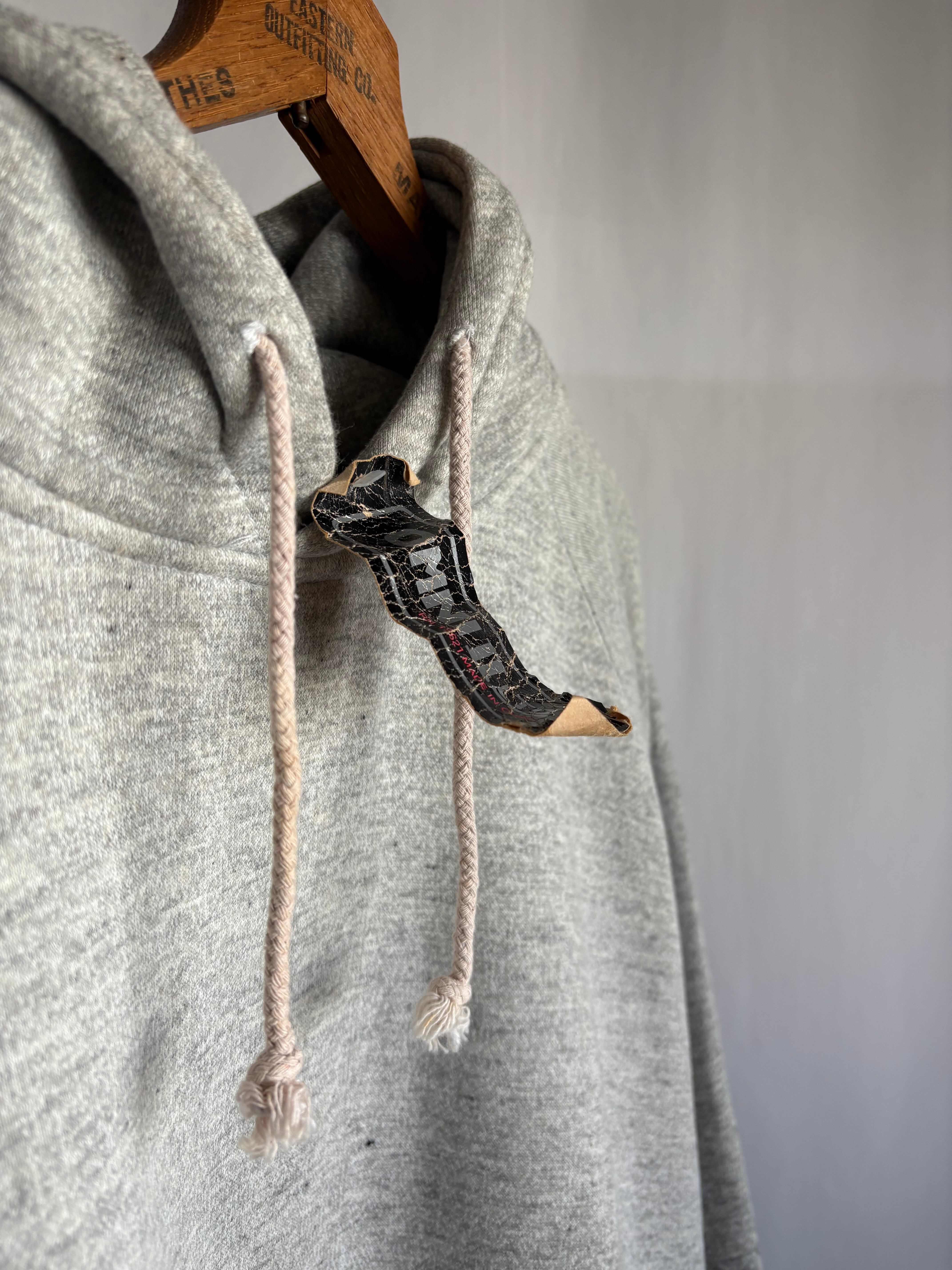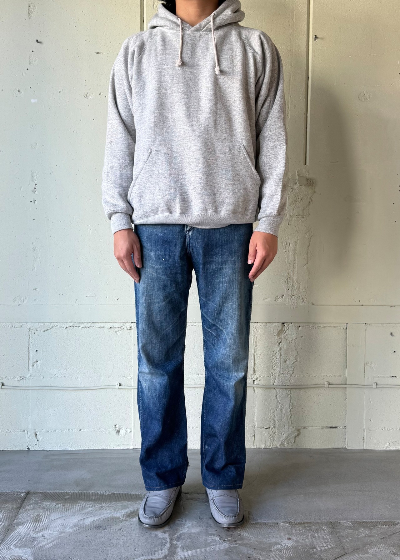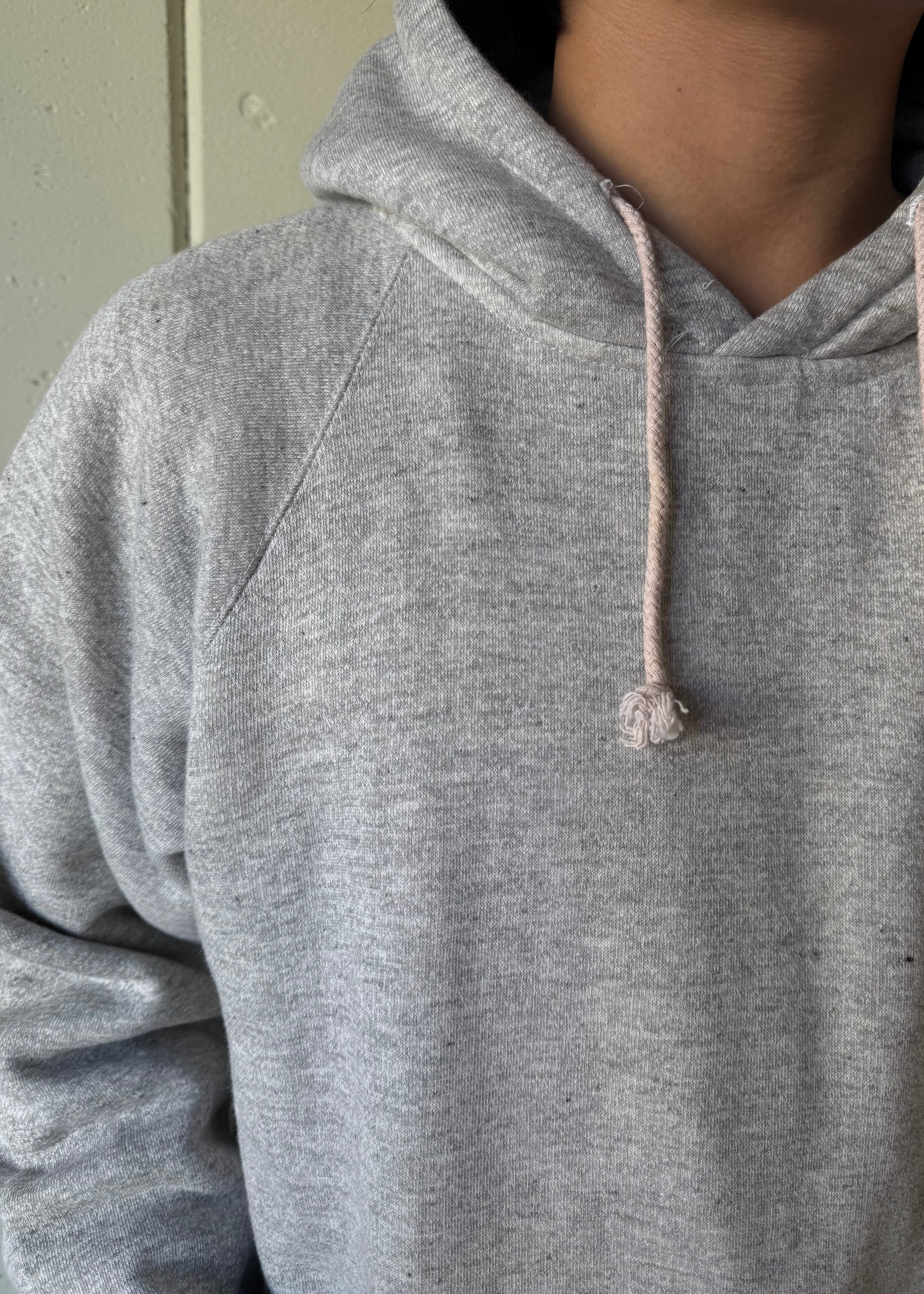 普通のグレーのパーカー、しかもチャイナ製。けれど1970s/80sあたりの未だ大量生産過ぎない自体のものです。ポケットやフードの大きさが地味ですが珍しい。どこかビンテージのフーディーを思い起こすものの、何故か化繊100%。そこも良いですね。