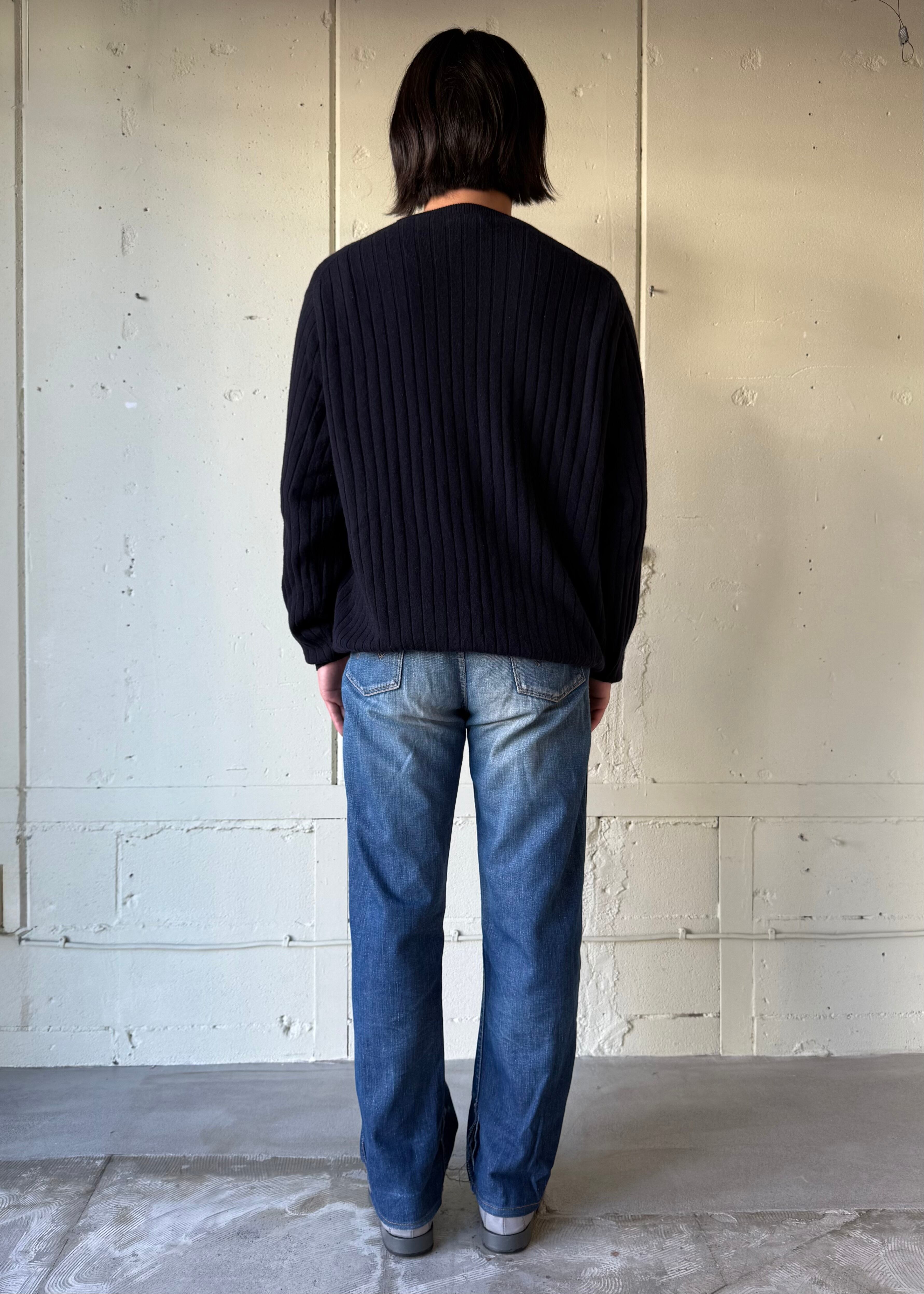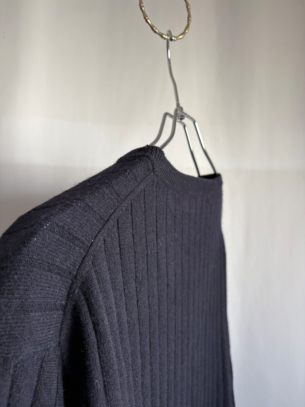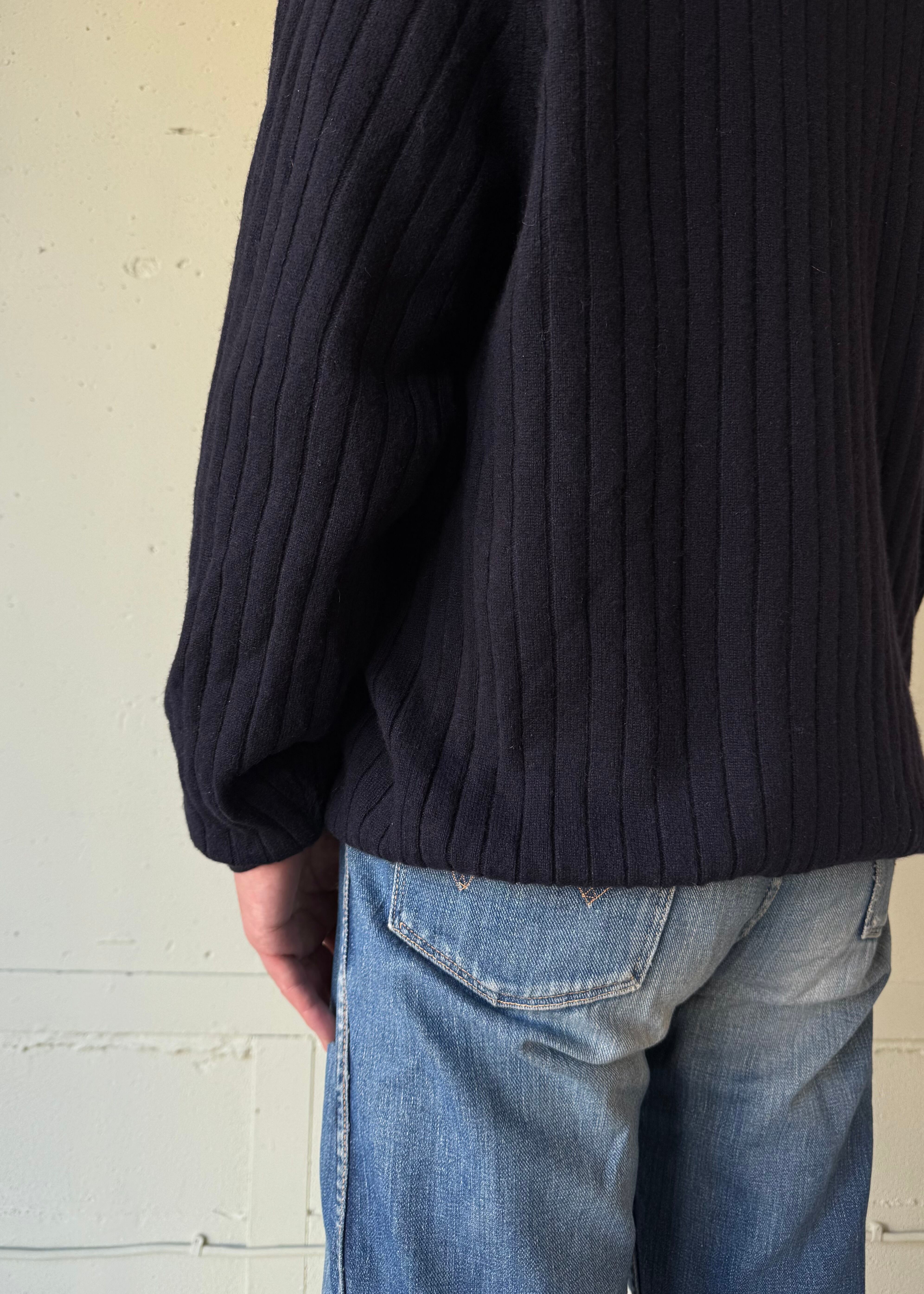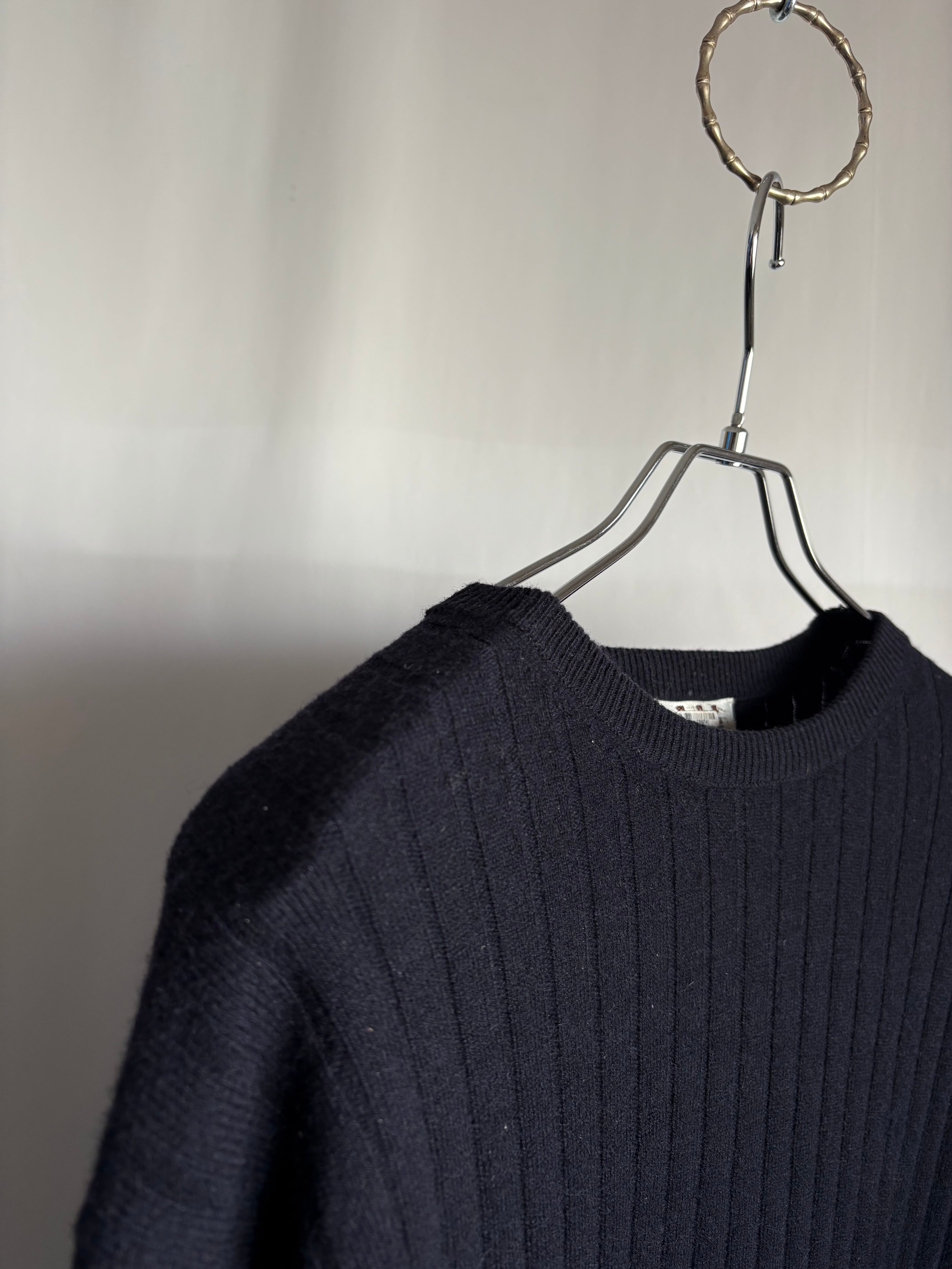 あぜ編みの中厚手-薄手の間位のカシミアセーターです。これぞベーシック。タグの社名もかっこいい。