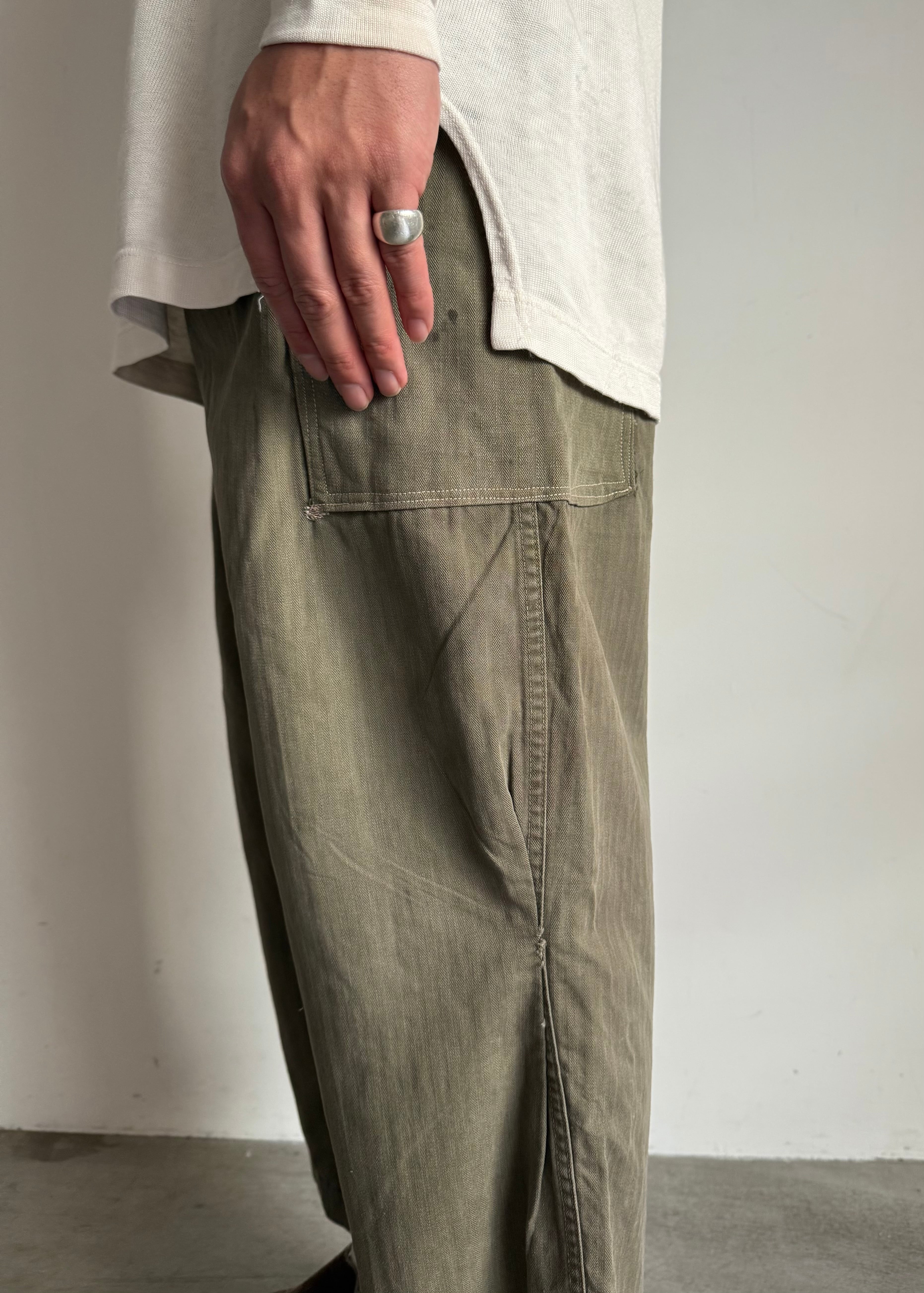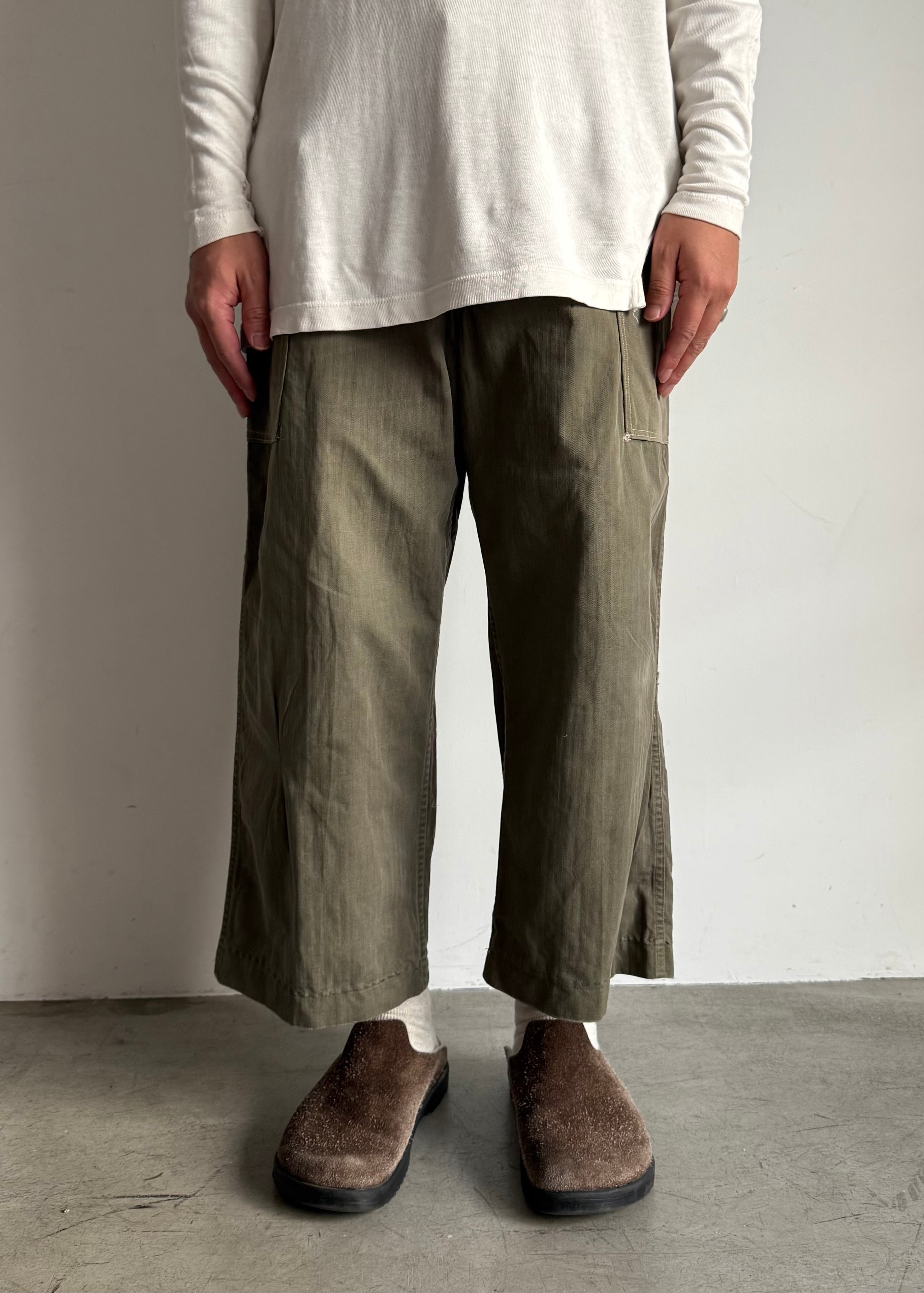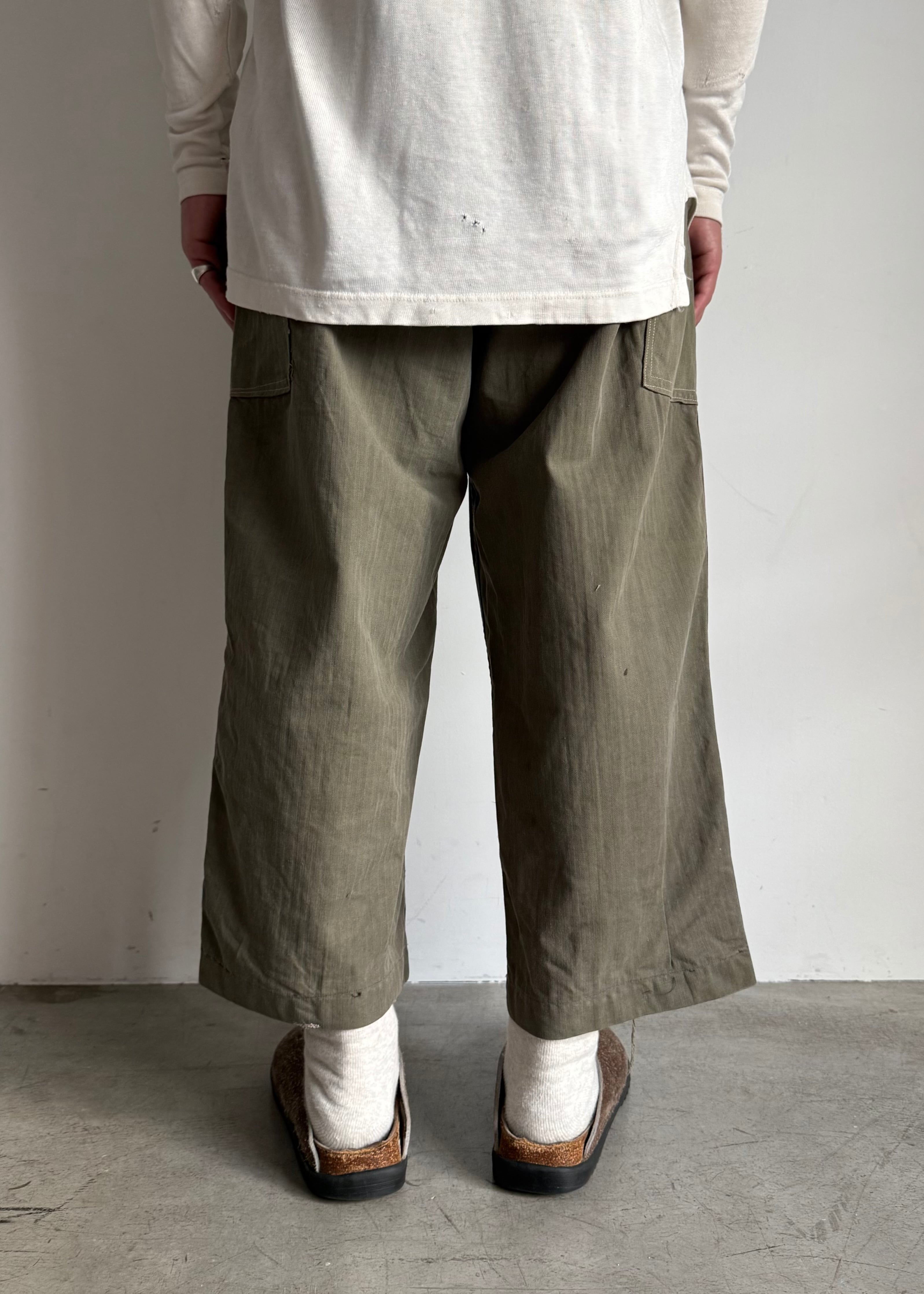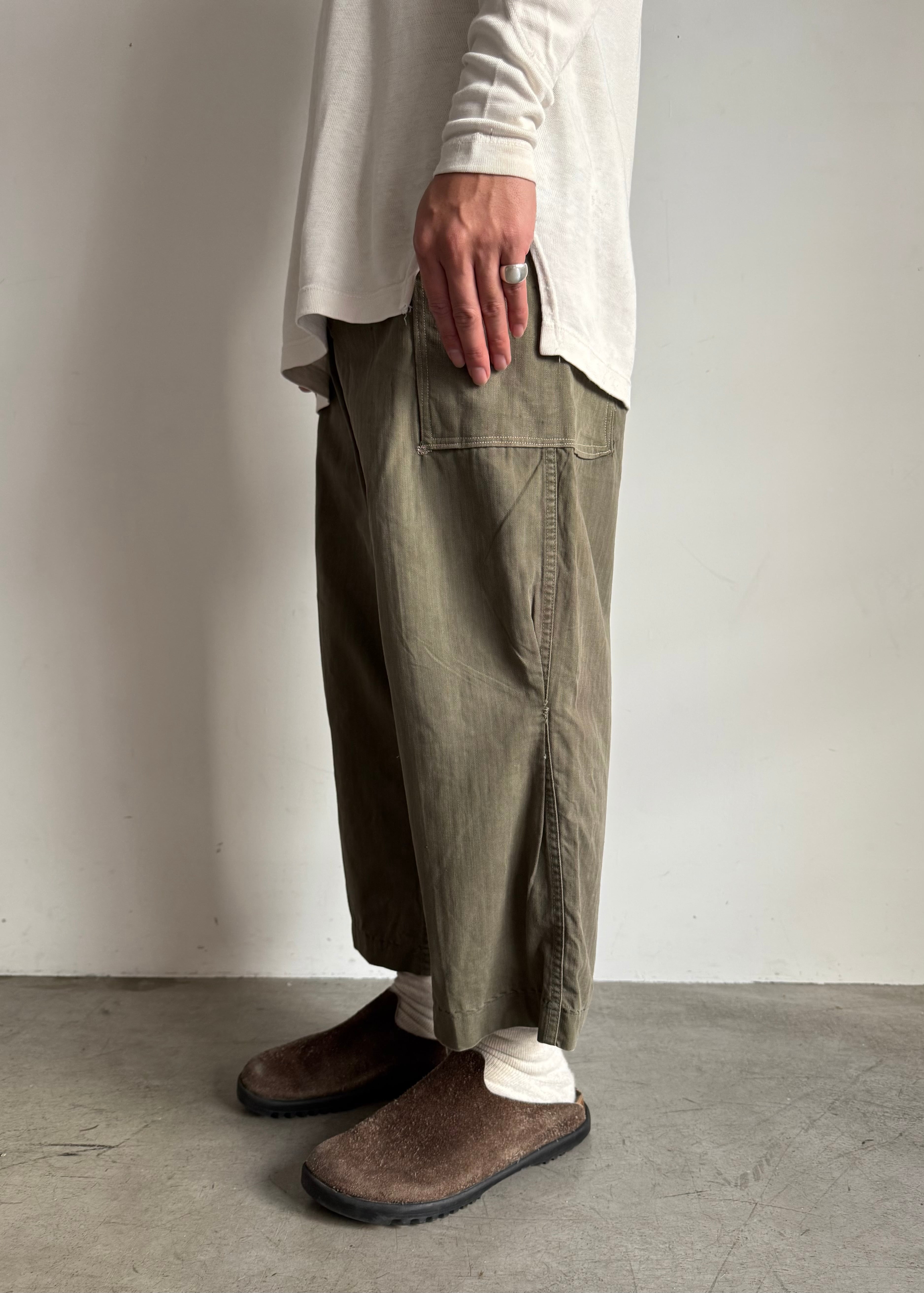 試しに履いてみたらミリタリー特有のマスキュラムな、ワークっぽい感じはあまり感じず綺麗なシルエット。しかもクロップド位の丈感もかっこいいなと思い普段は買い付けすることが多く無いジャンルですが買ってみました。
