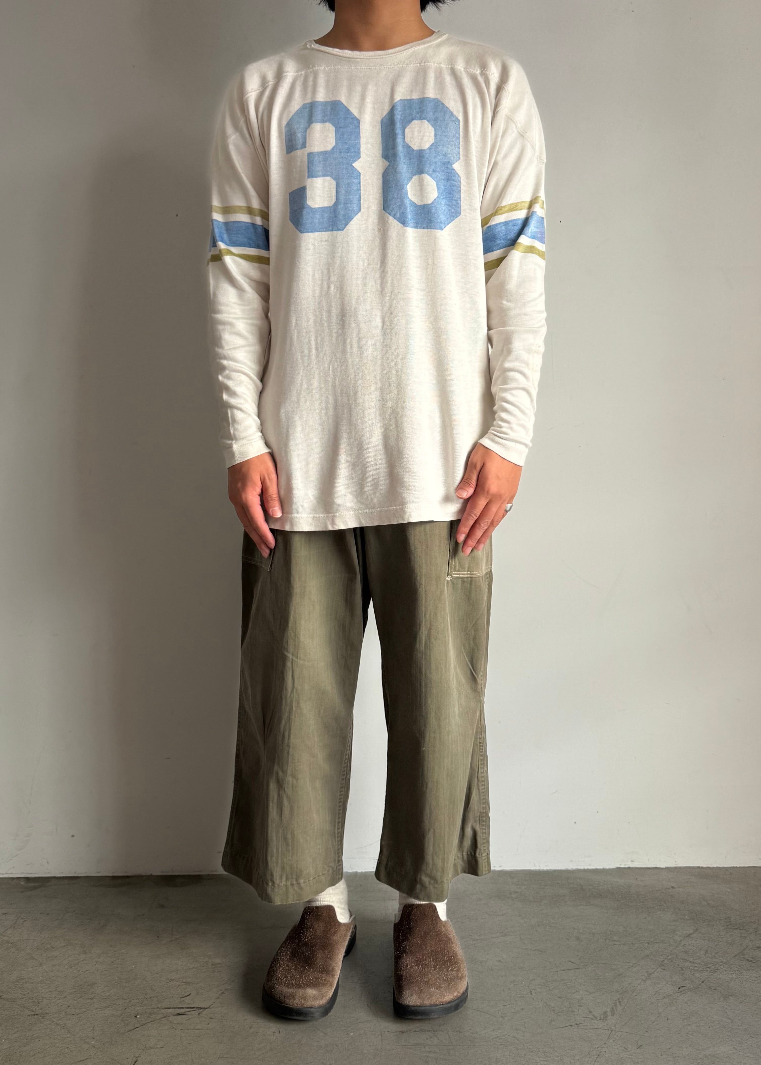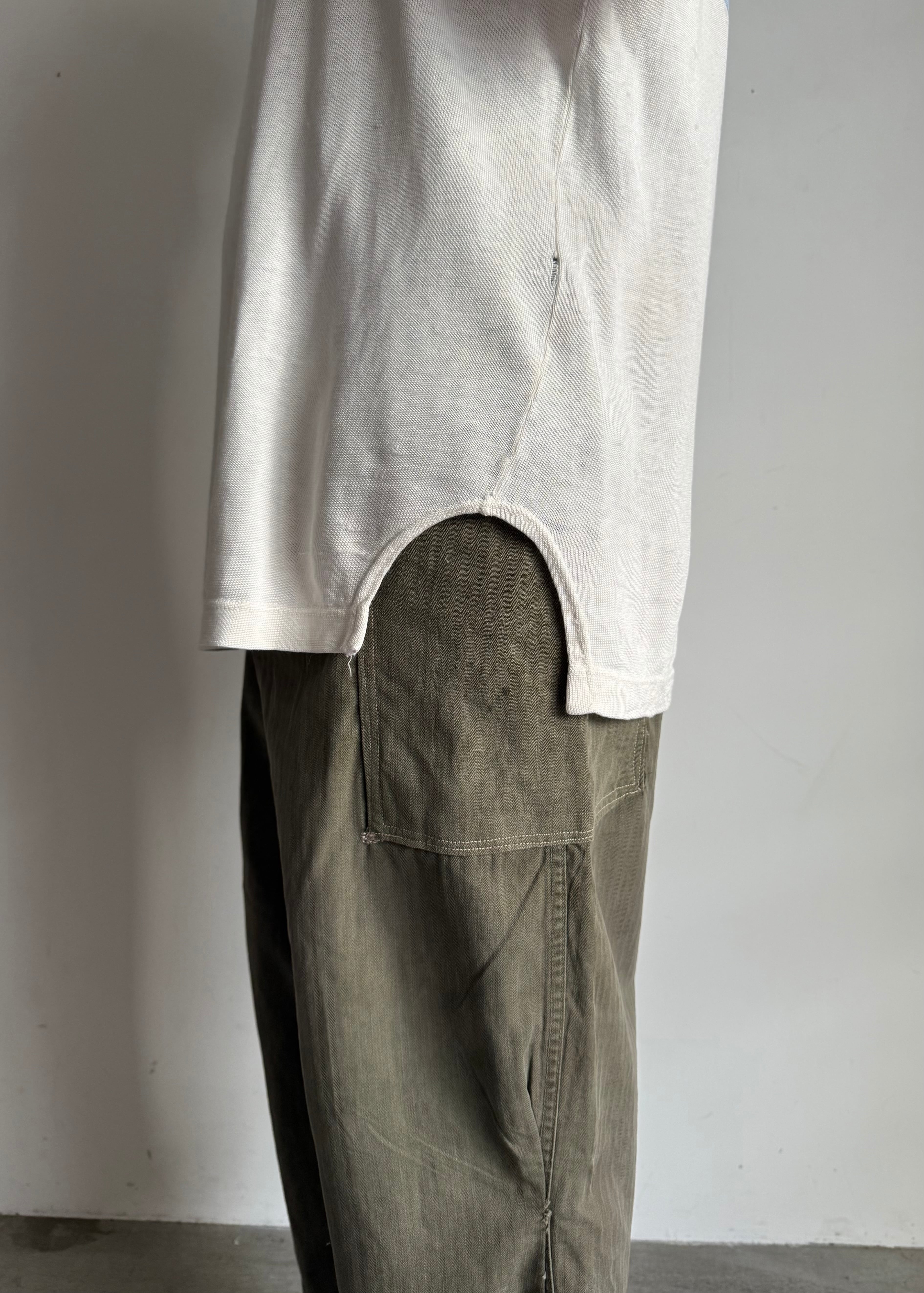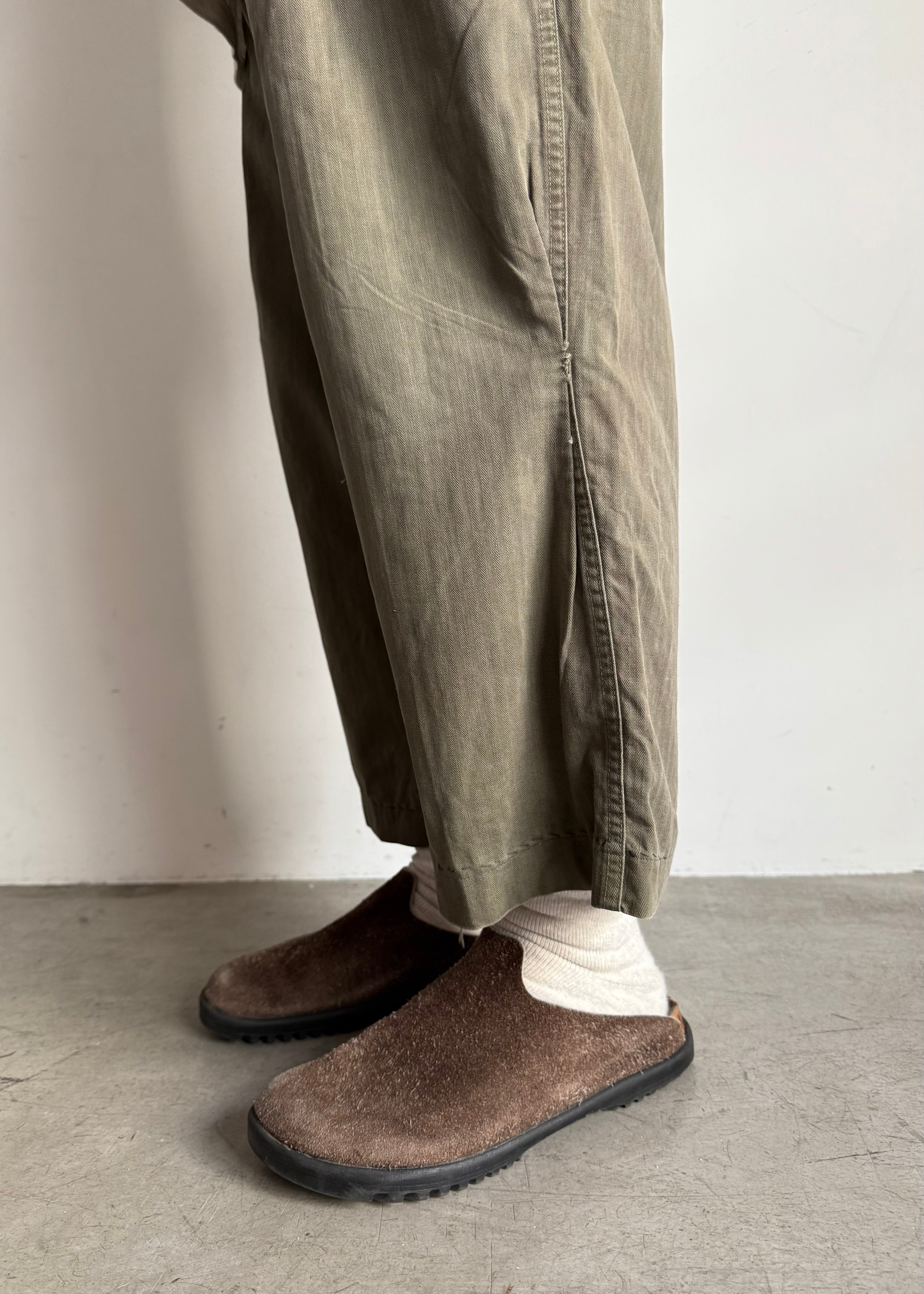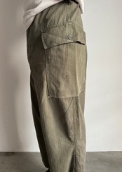 試しに履いてみたらミリタリー特有のマスキュラムな、ワークっぽい感じはあまり感じず綺麗なシルエット。しかもクロップド位の丈感もかっこいいなと思い普段は買い付けすることが多く無いジャンルですが買ってみました。