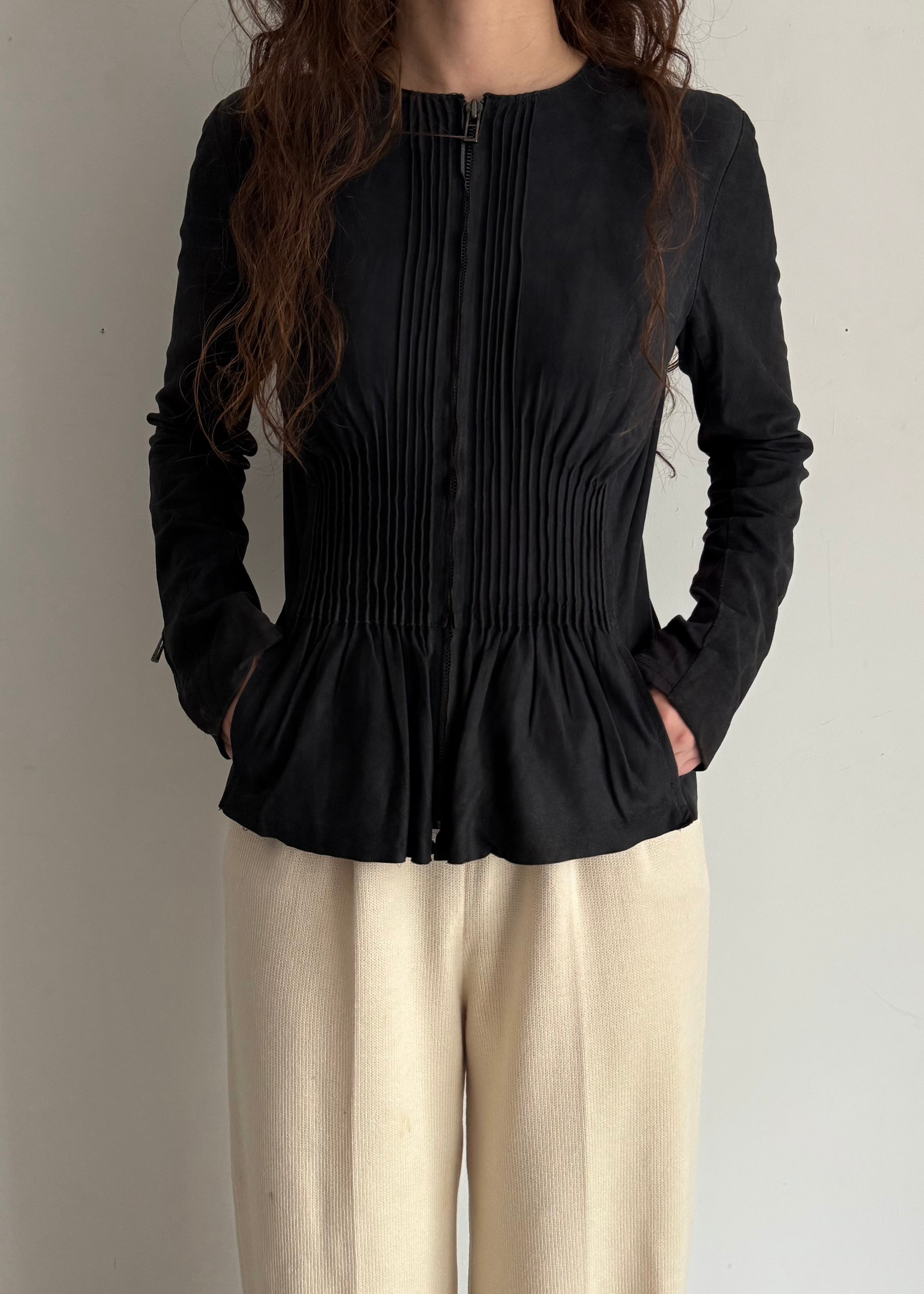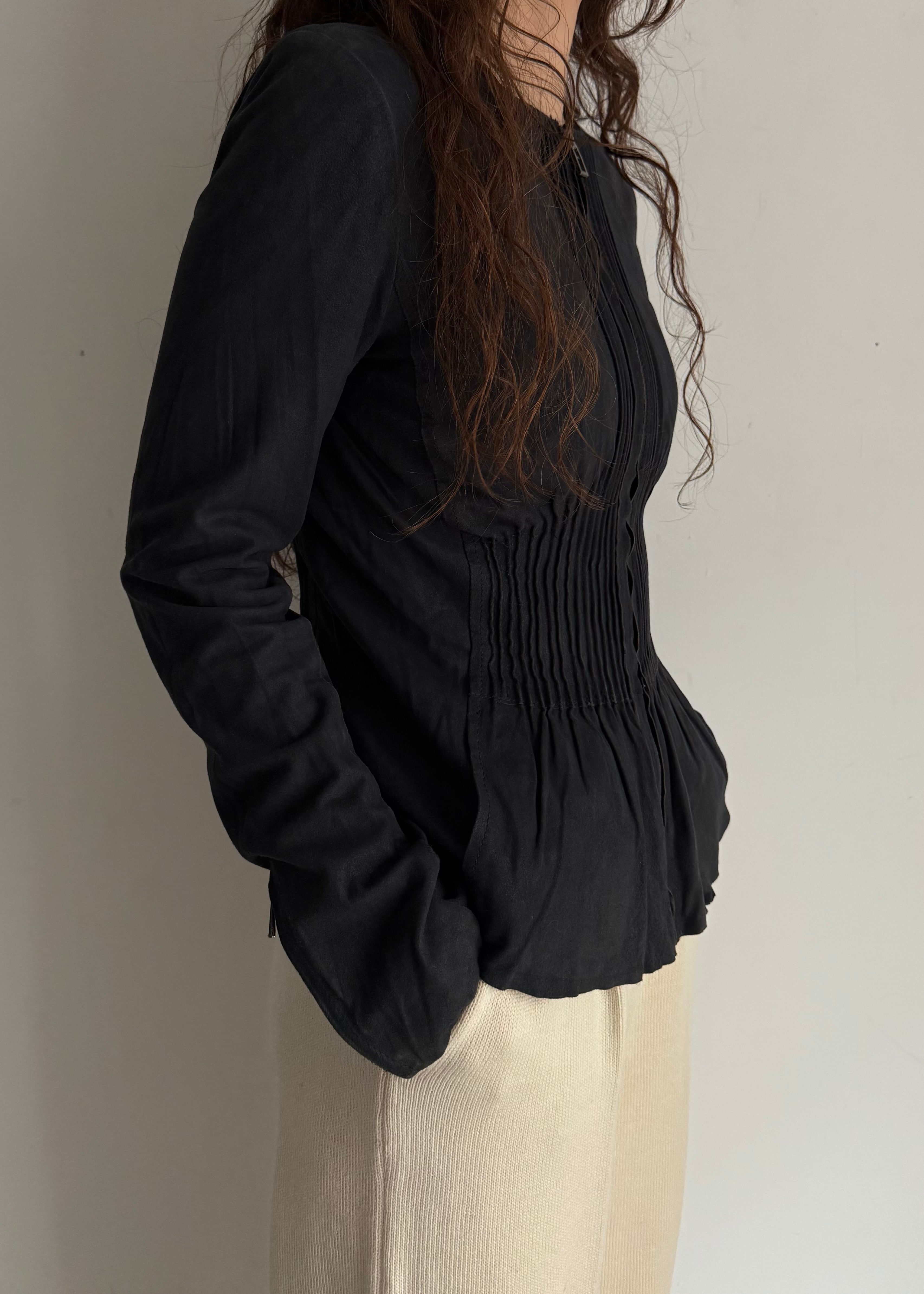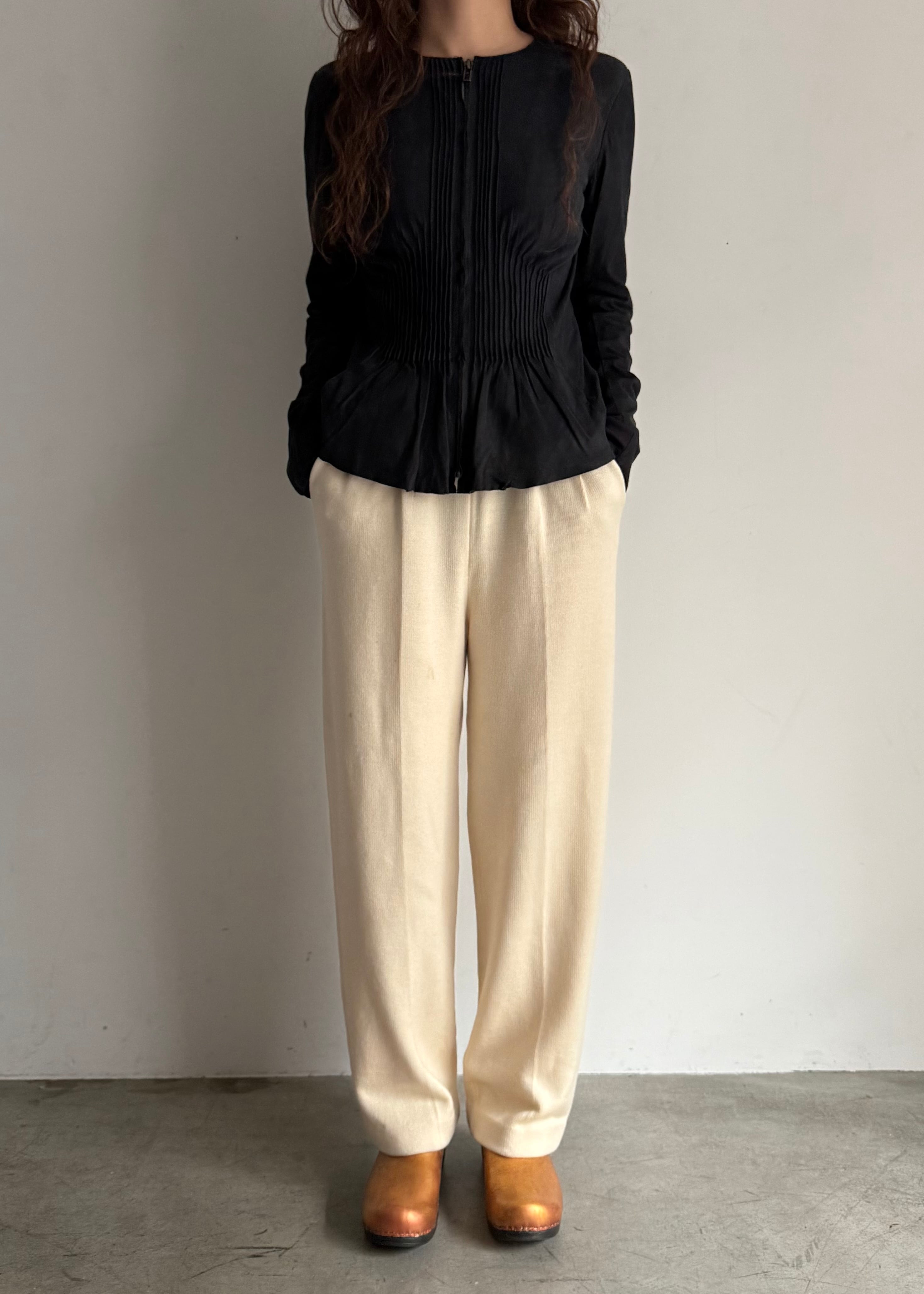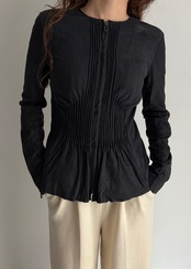 ギャザーとフリルの仕様がちょっとやり過ぎ寄りの真ん中でかつシルエットがとても綺麗なのでなんだか違和感が生まれるかっこいいトップス。
