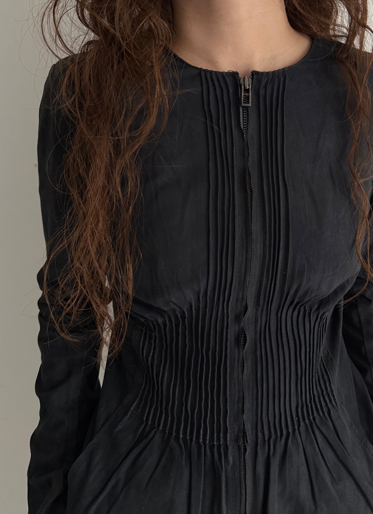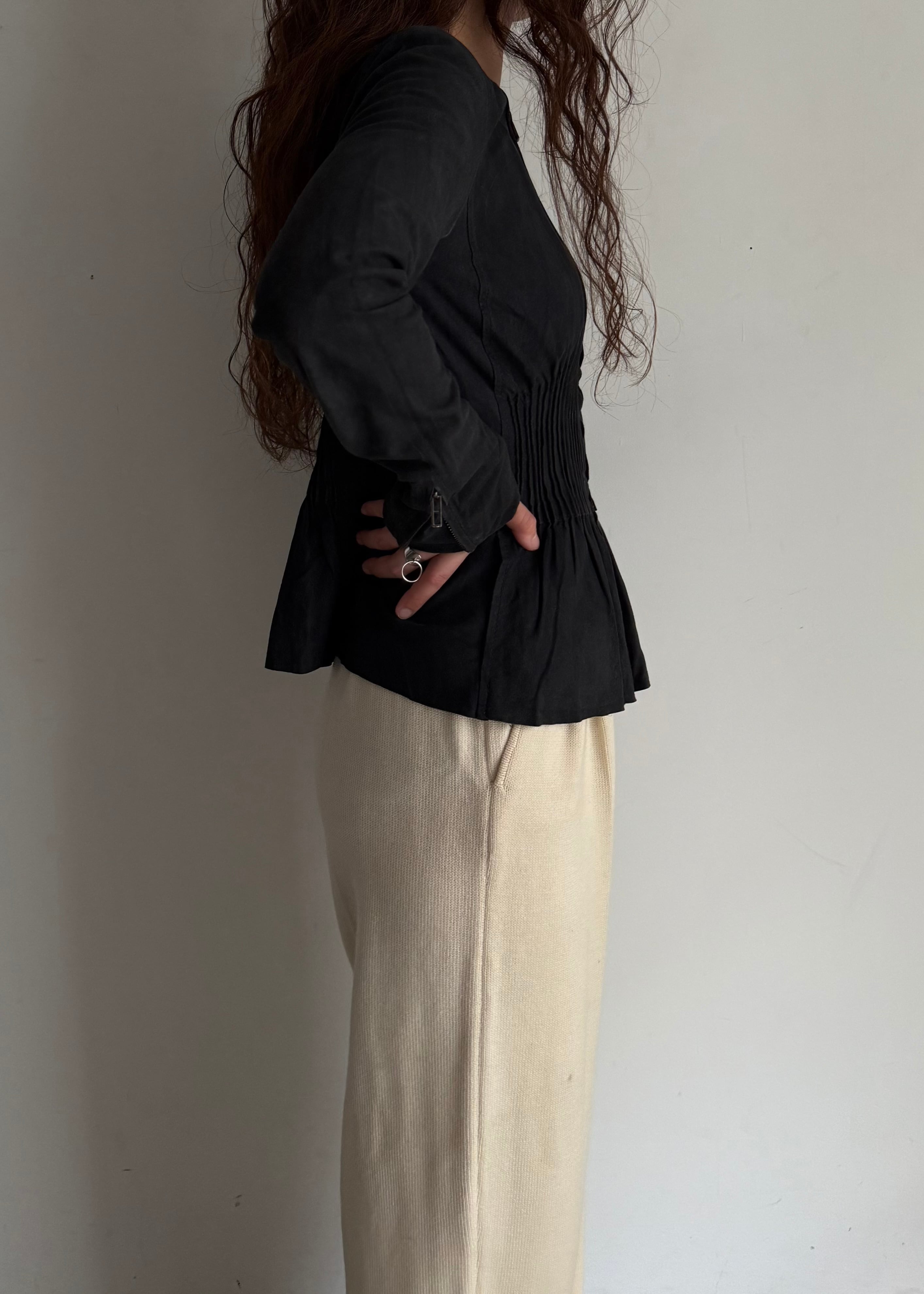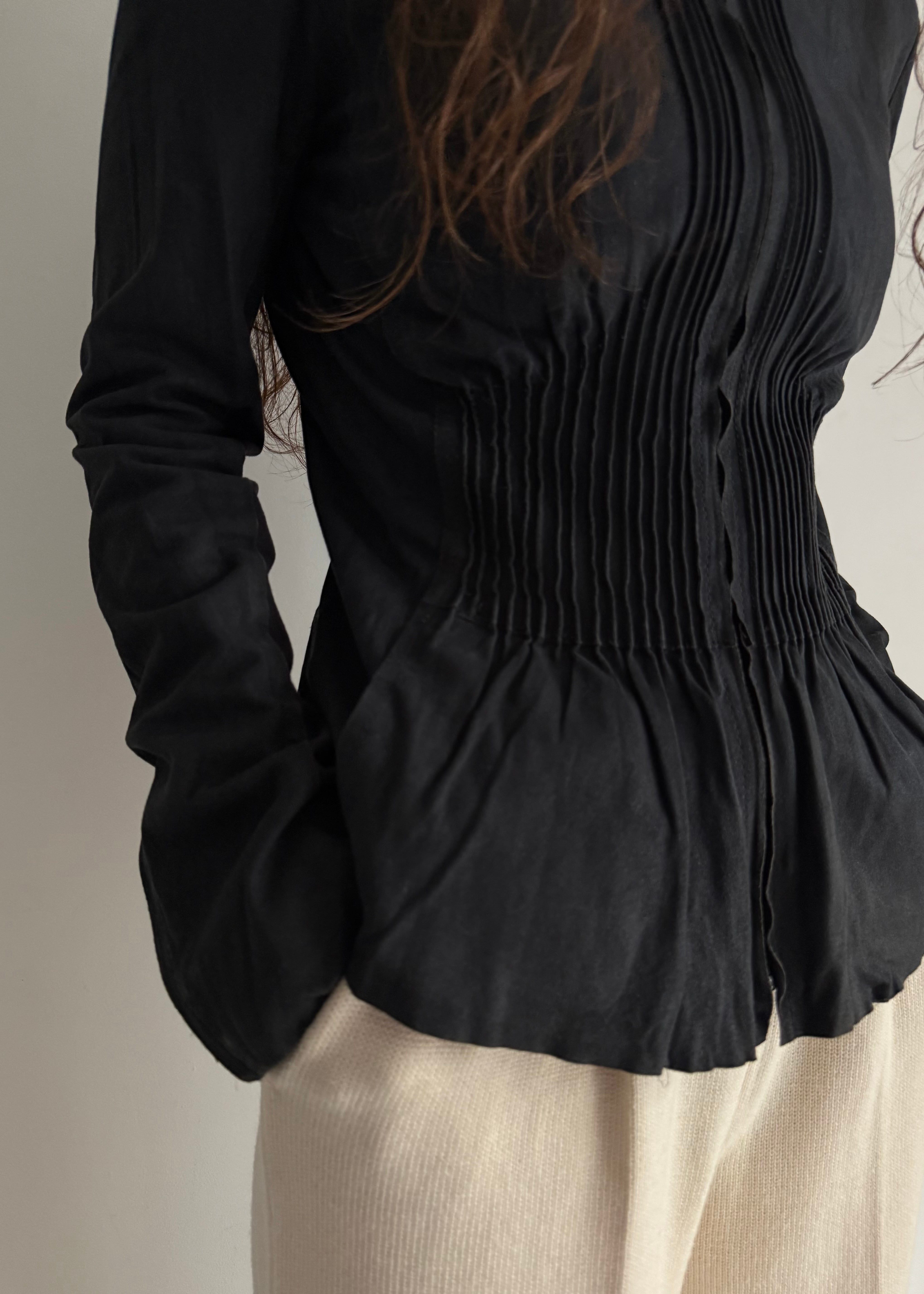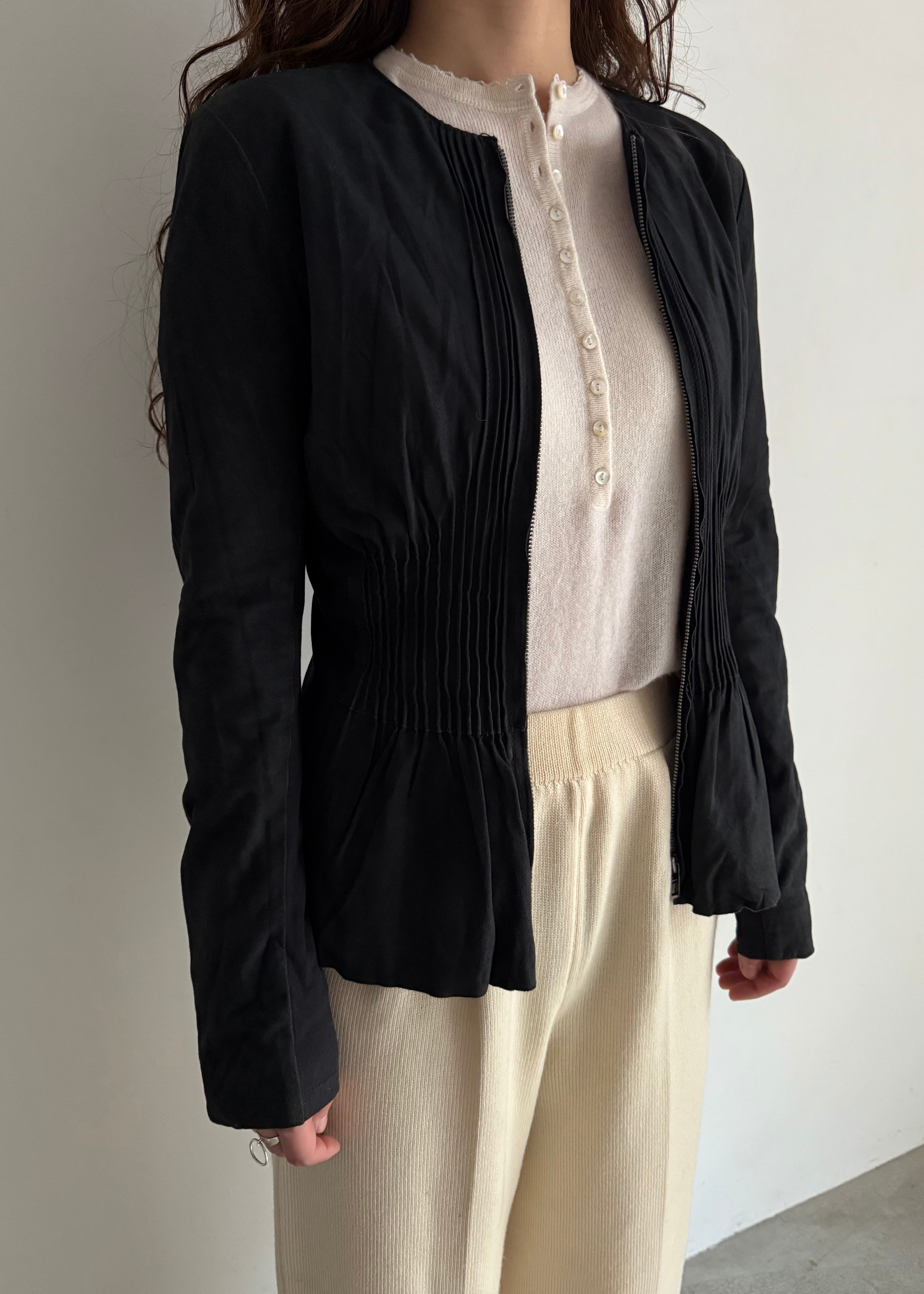 ギャザーとフリルの仕様がちょっとやり過ぎ寄りの真ん中でかつシルエットがとても綺麗なのでなんだか違和感が生まれるかっこいいトップス。