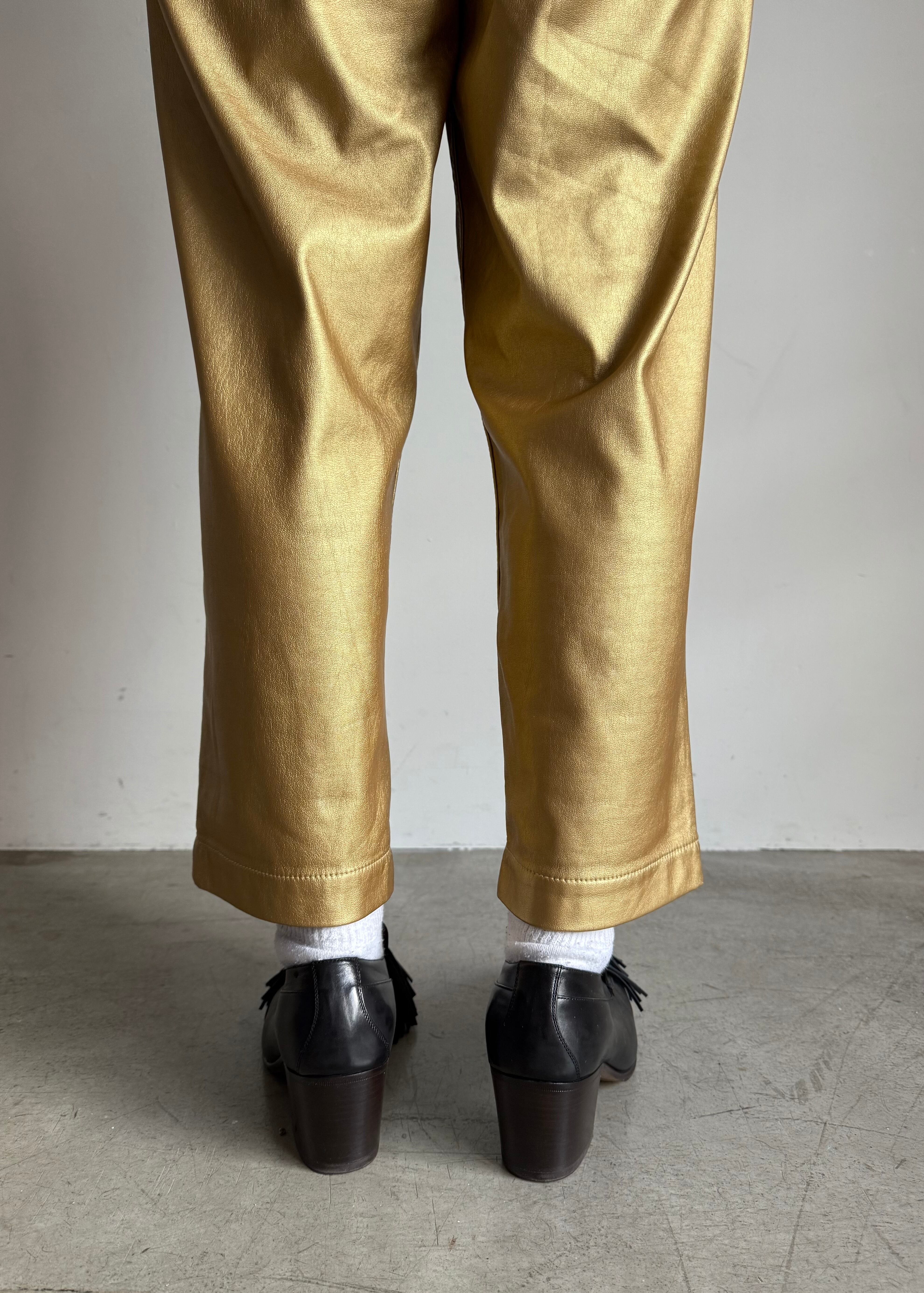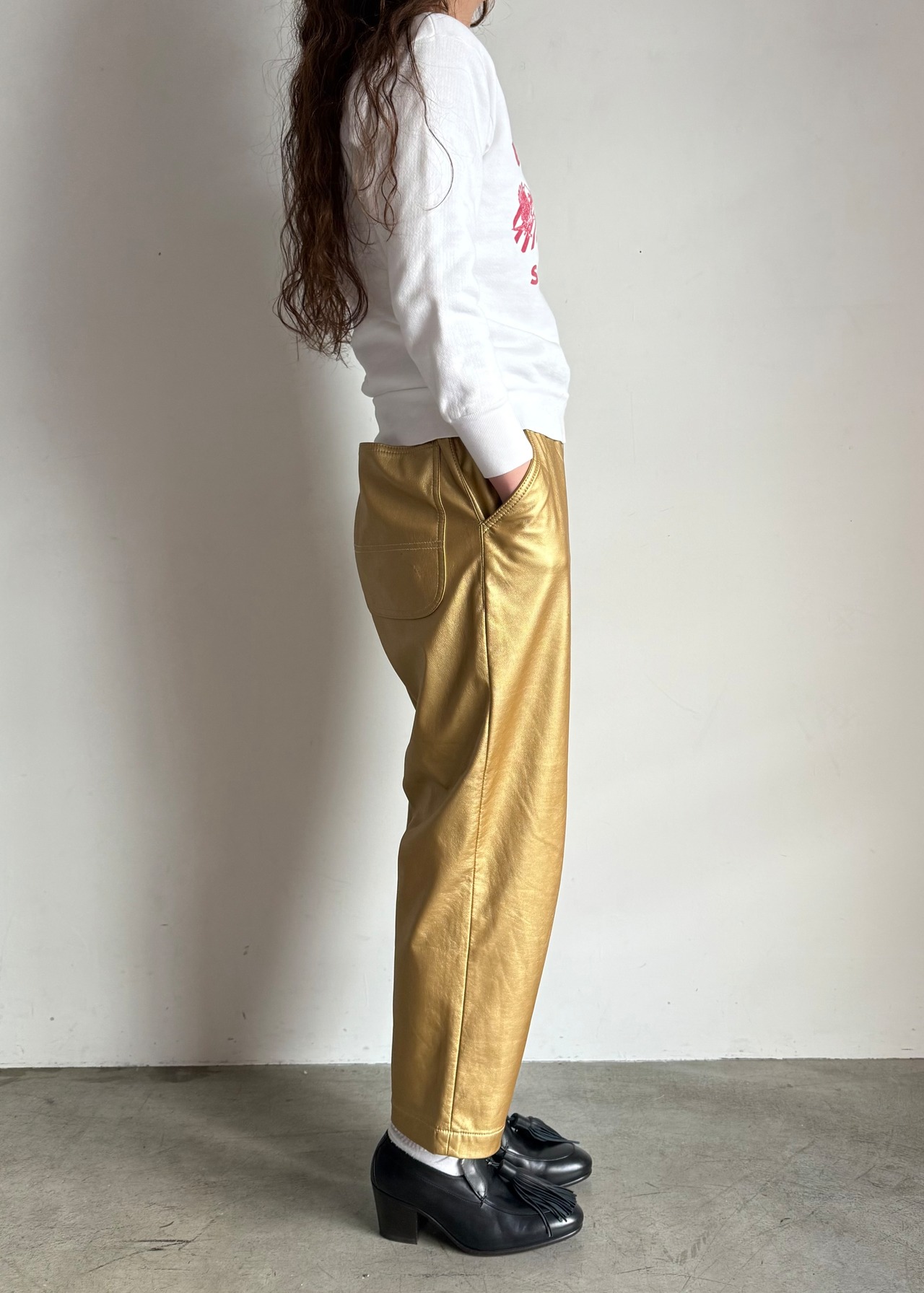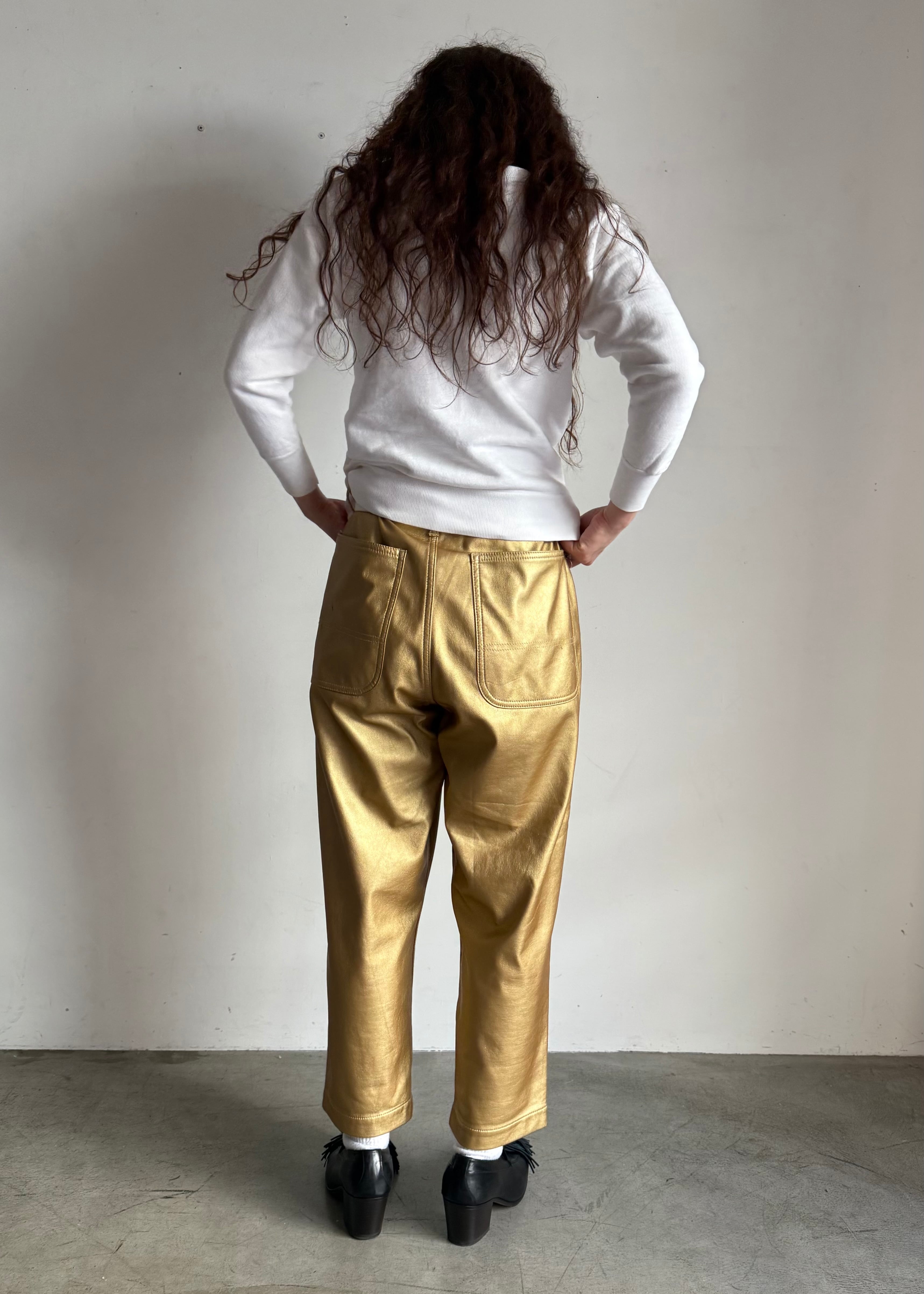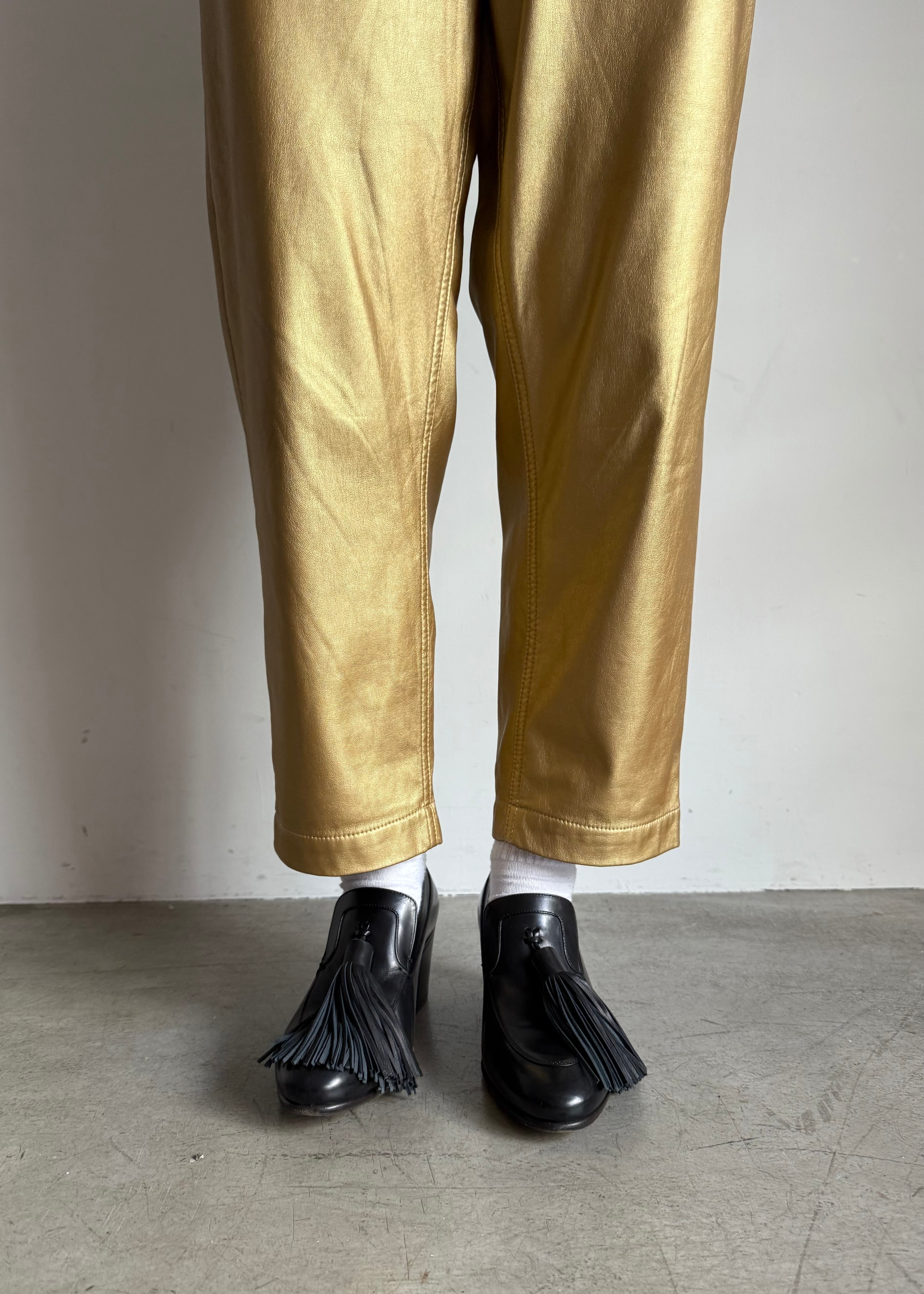 色と素材以外はワークパンツのディテールなのが良いですね。フロントののボタンも靴のソールの様な素材。