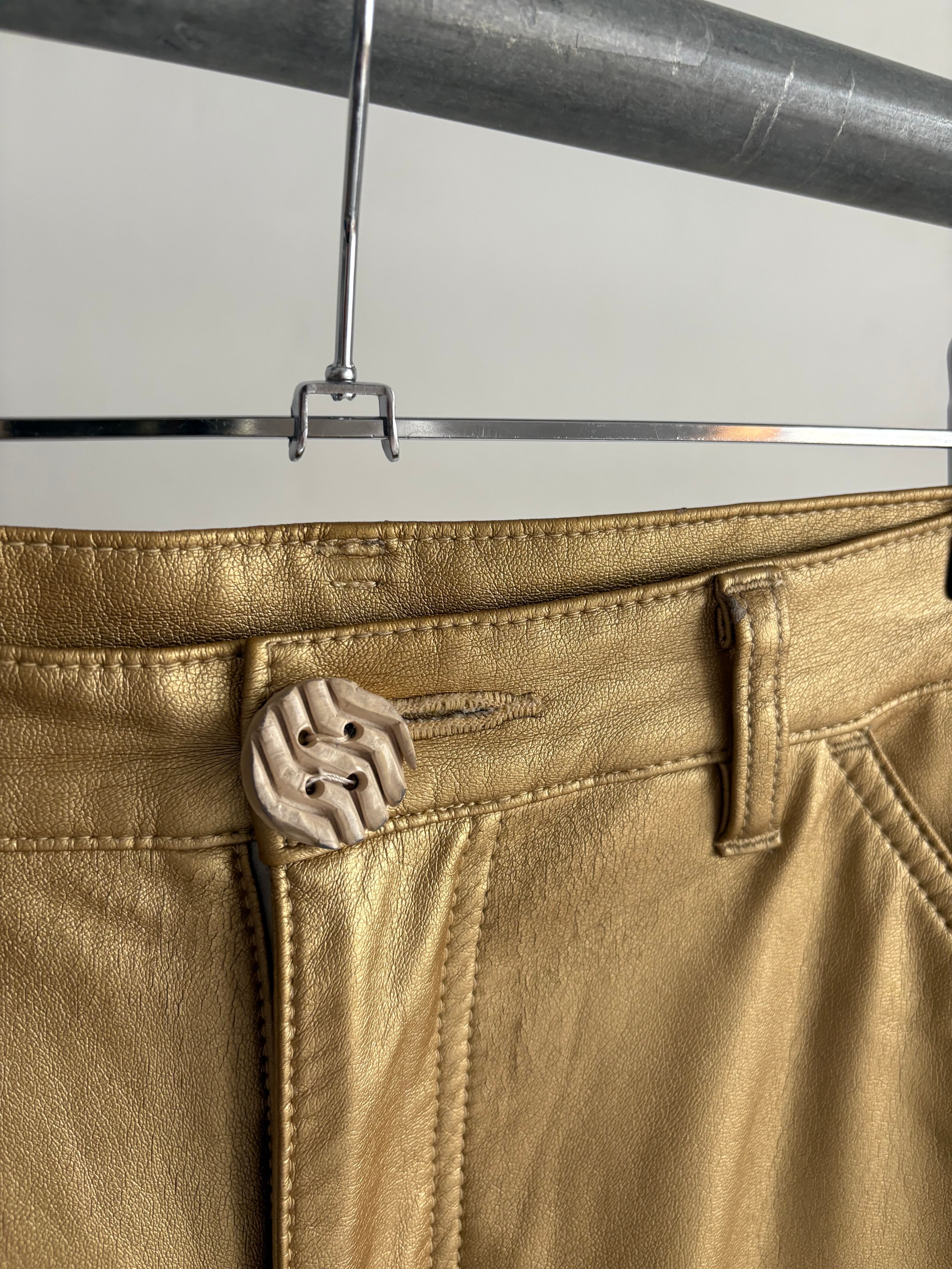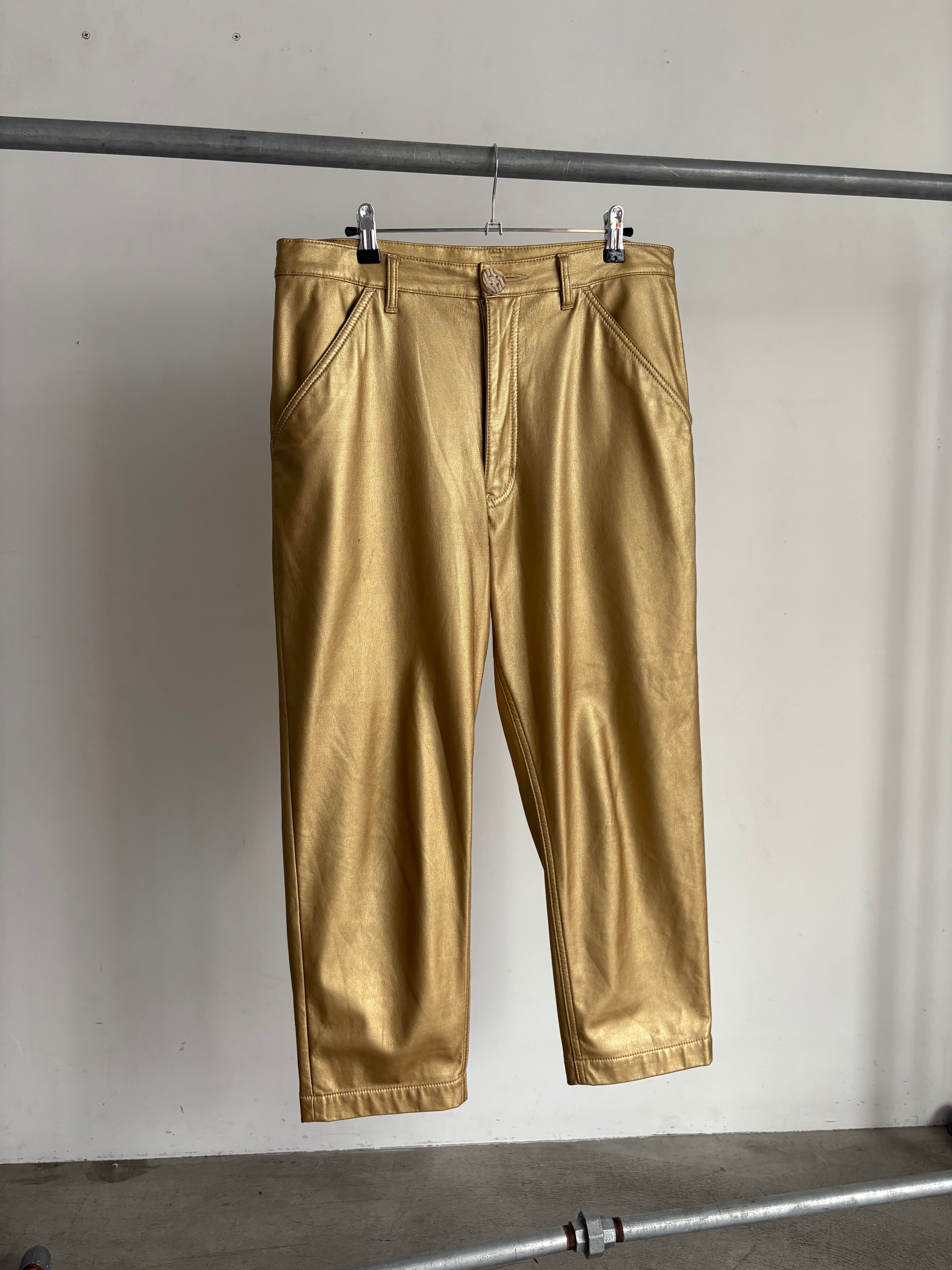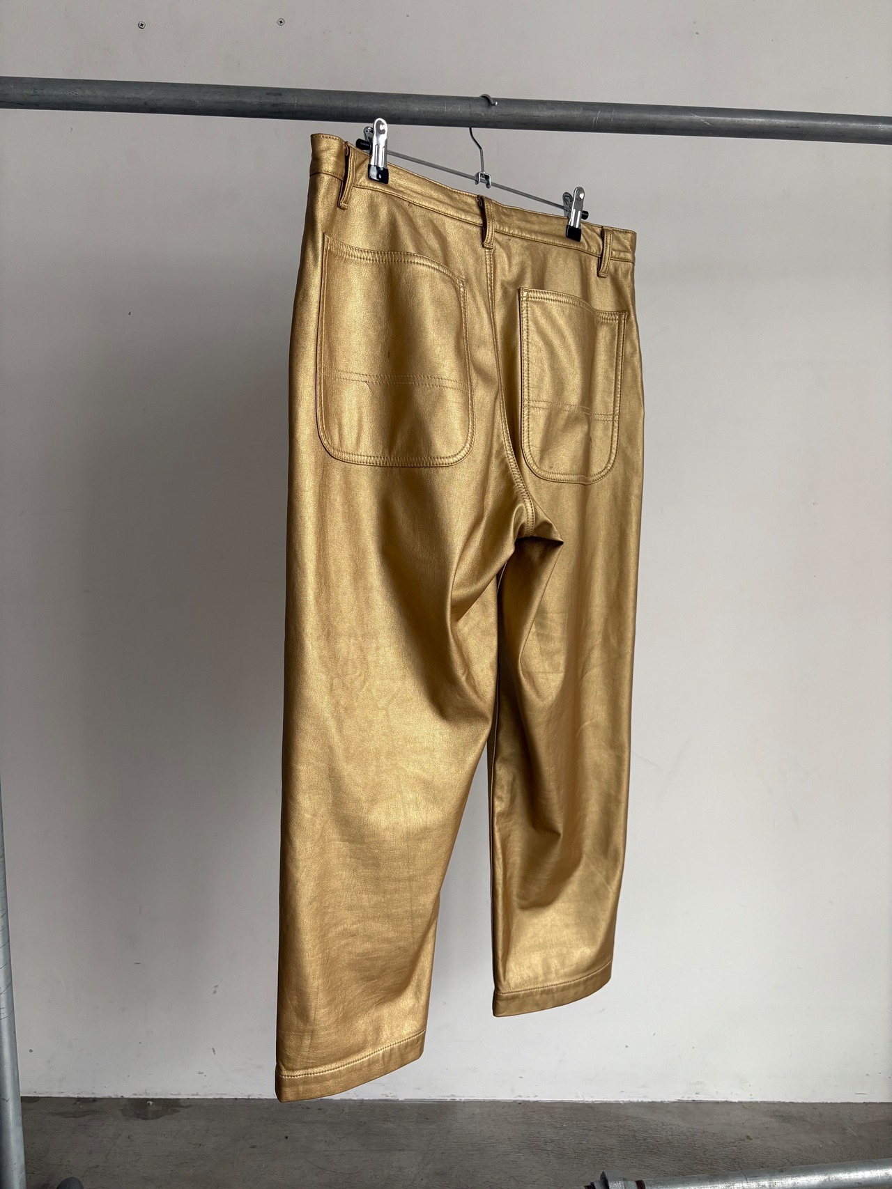 色と素材以外はワークパンツのディテールなのが良いですね。フロントののボタンも靴のソールの様な素材。