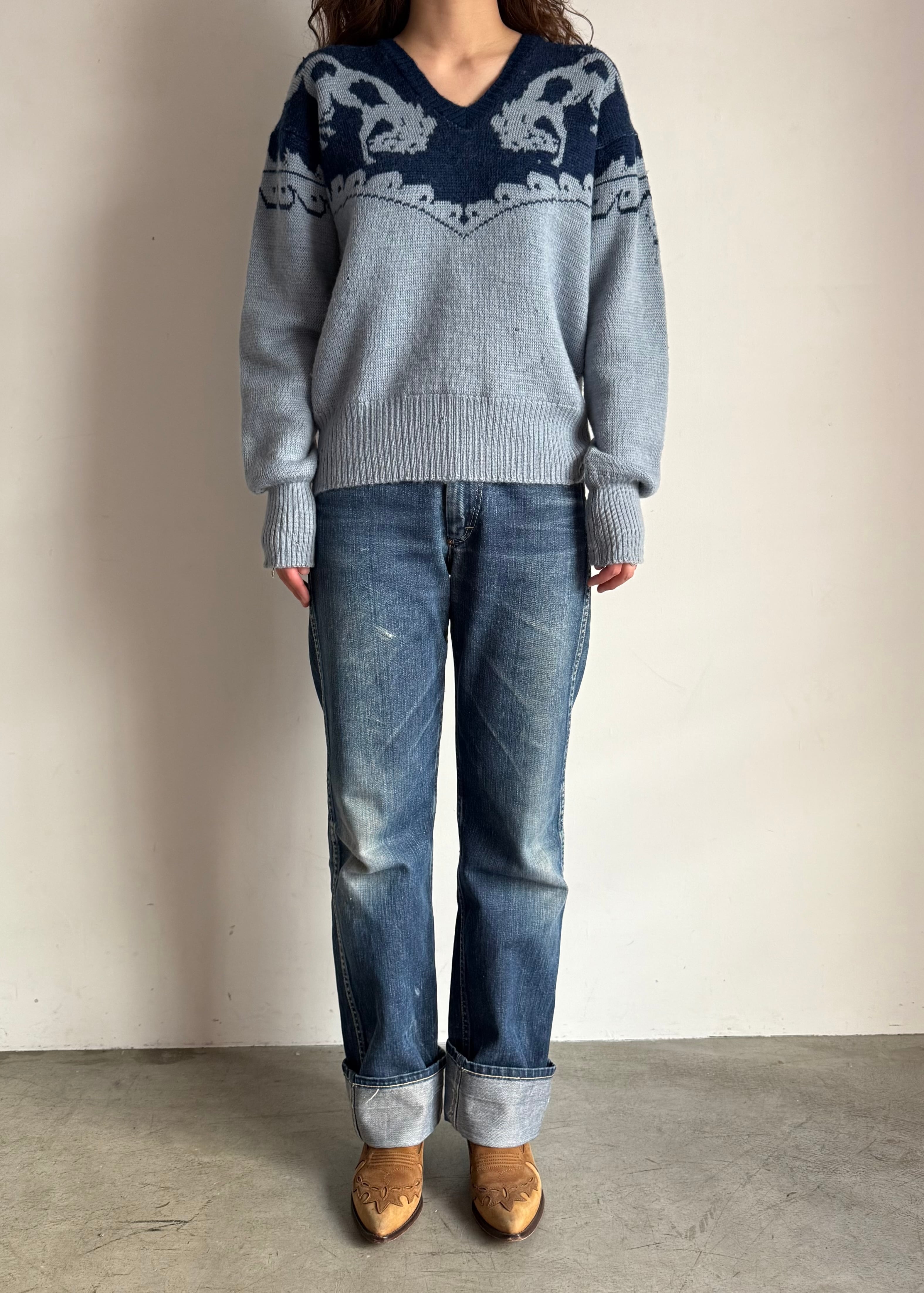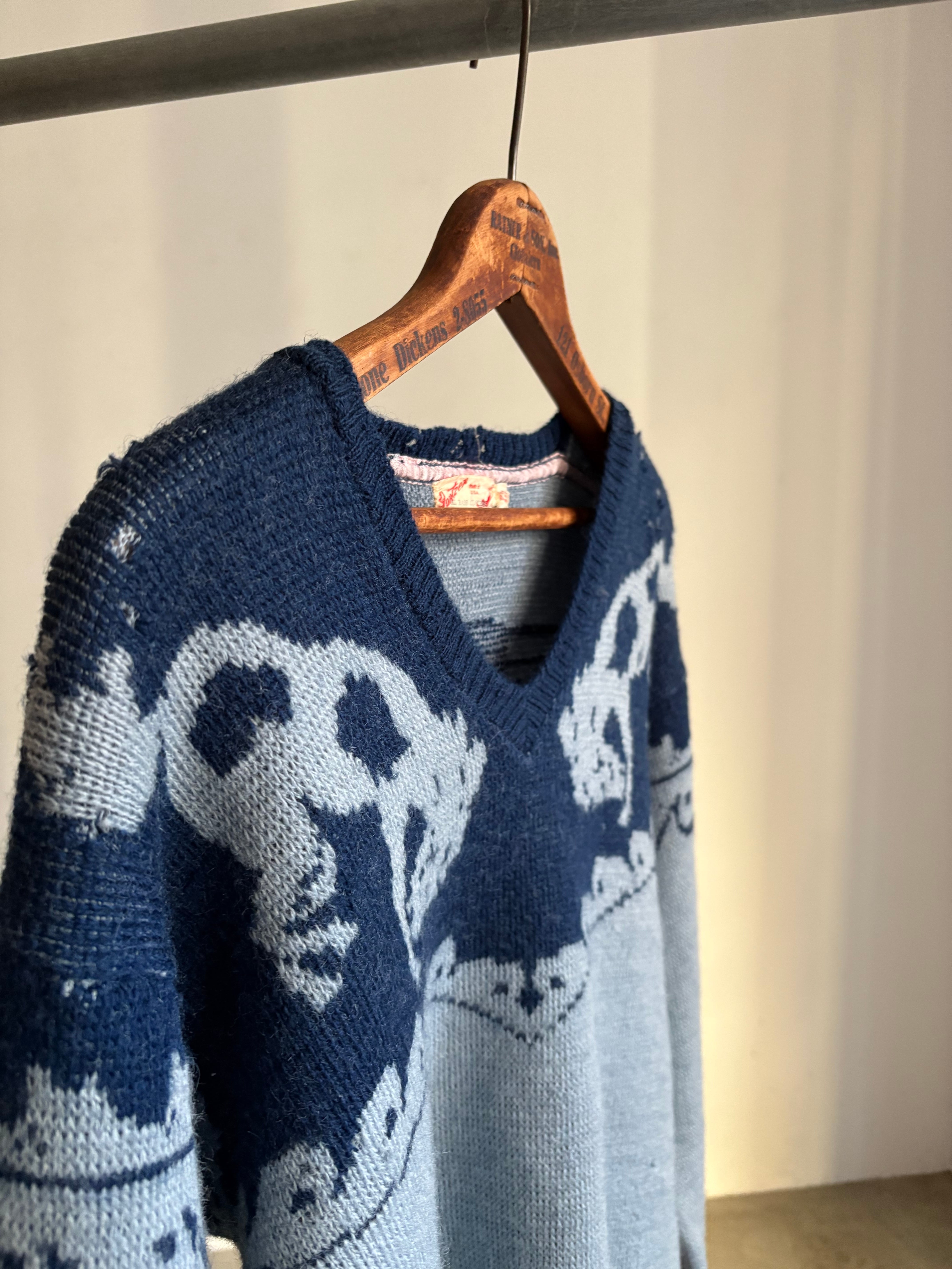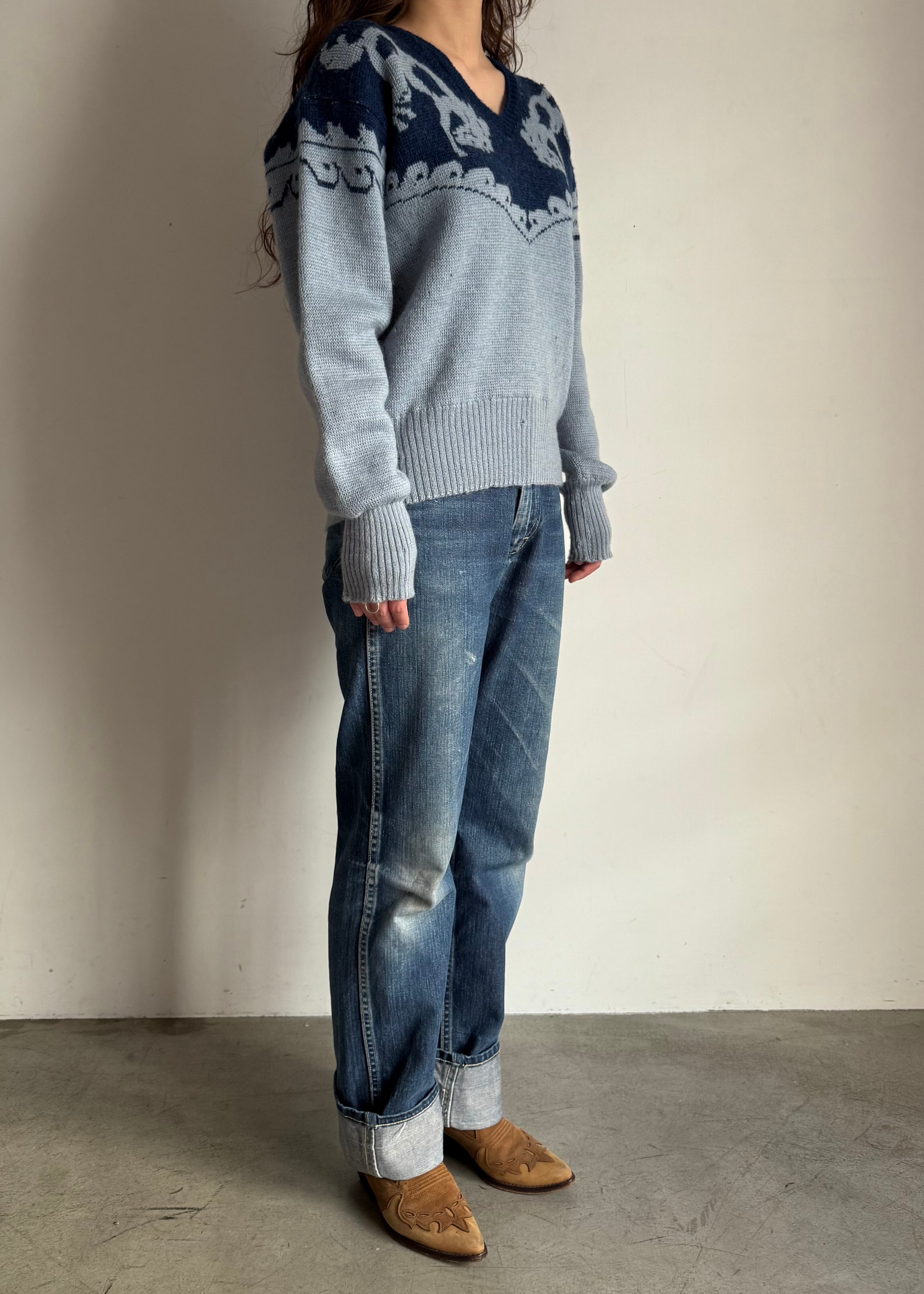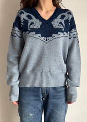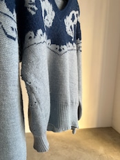 デザインだけにフォーカスするととてもアメリカンなセーターなのですが、シャンブレーの様なブルーとインディゴの様な青の合わせのせいでしょうか、何処か爽やかでこってりしすぎない印象です。