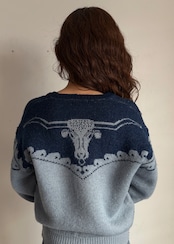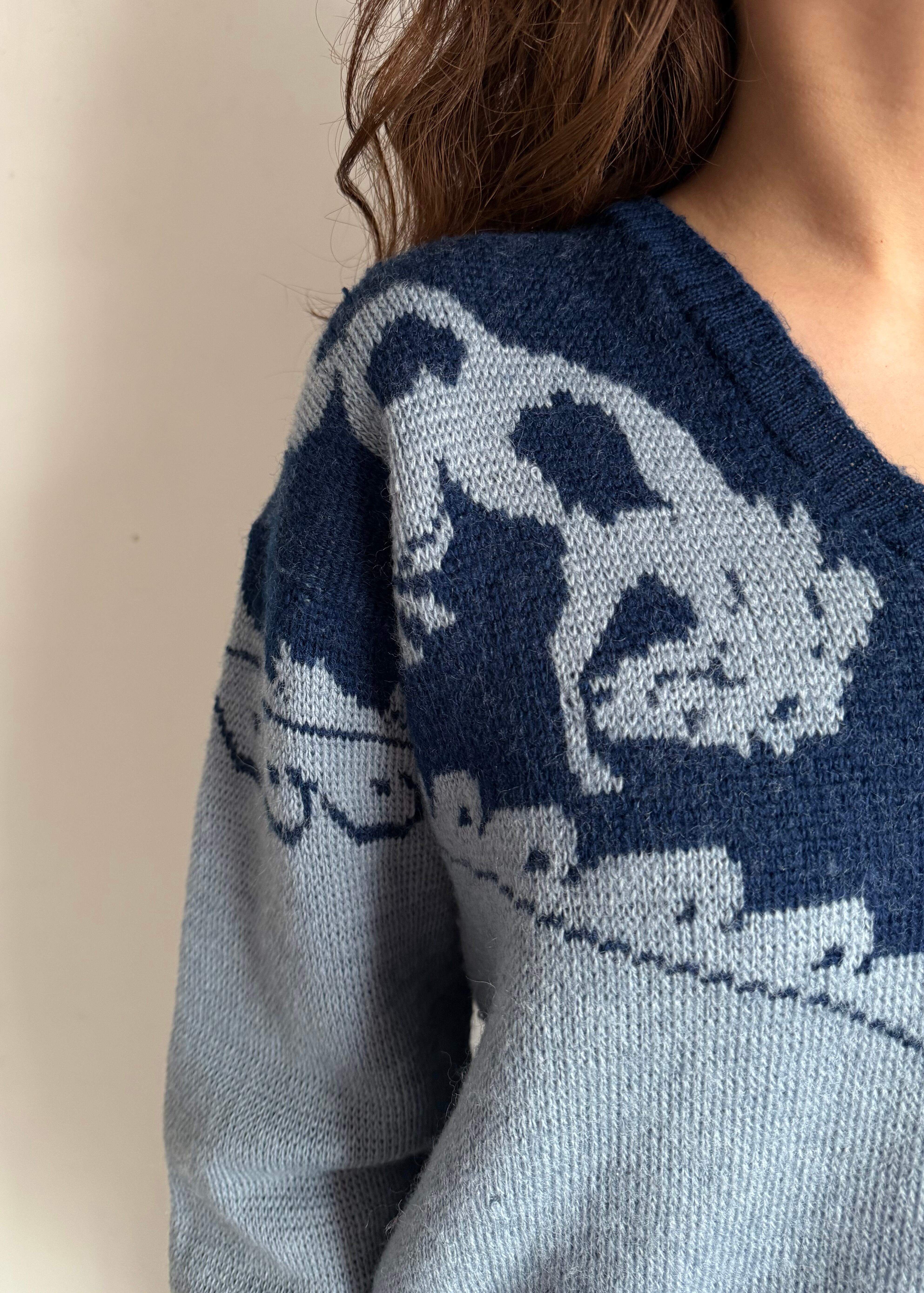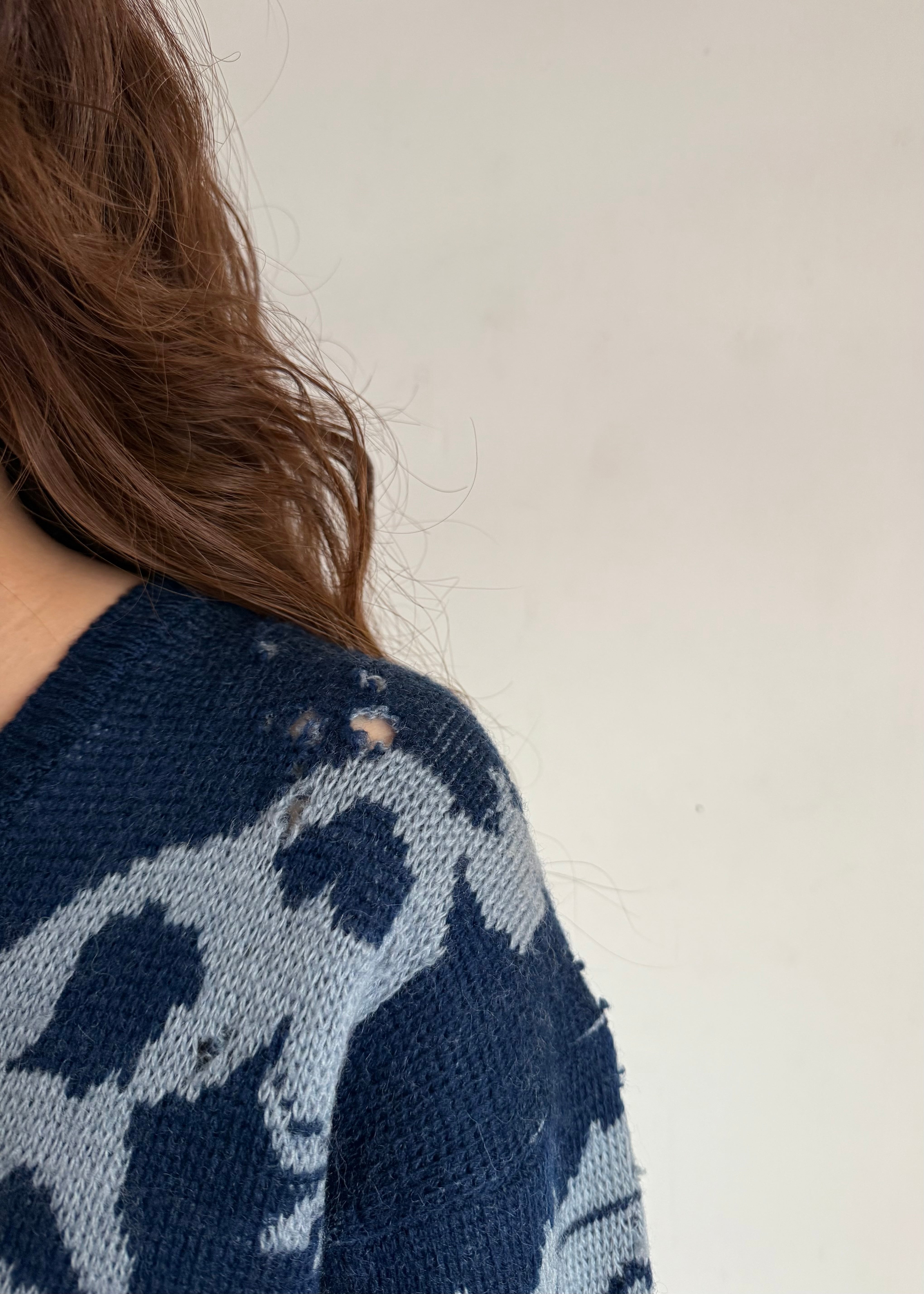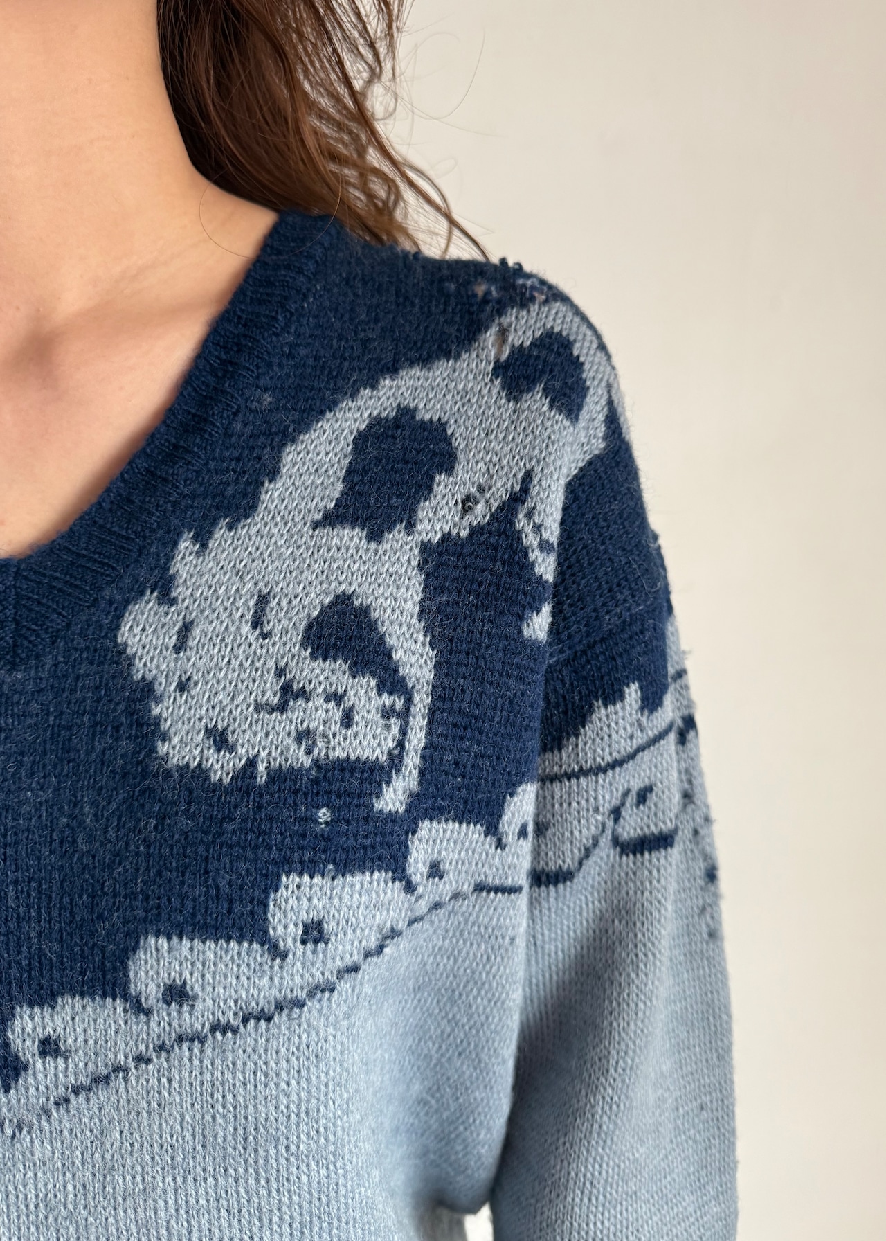デザインだけにフォーカスするととてもアメリカンなセーターなのですが、シャンブレーの様なブルーとインディゴの様な青の合わせのせいでしょうか、何処か爽やかでこってりしすぎない印象です。