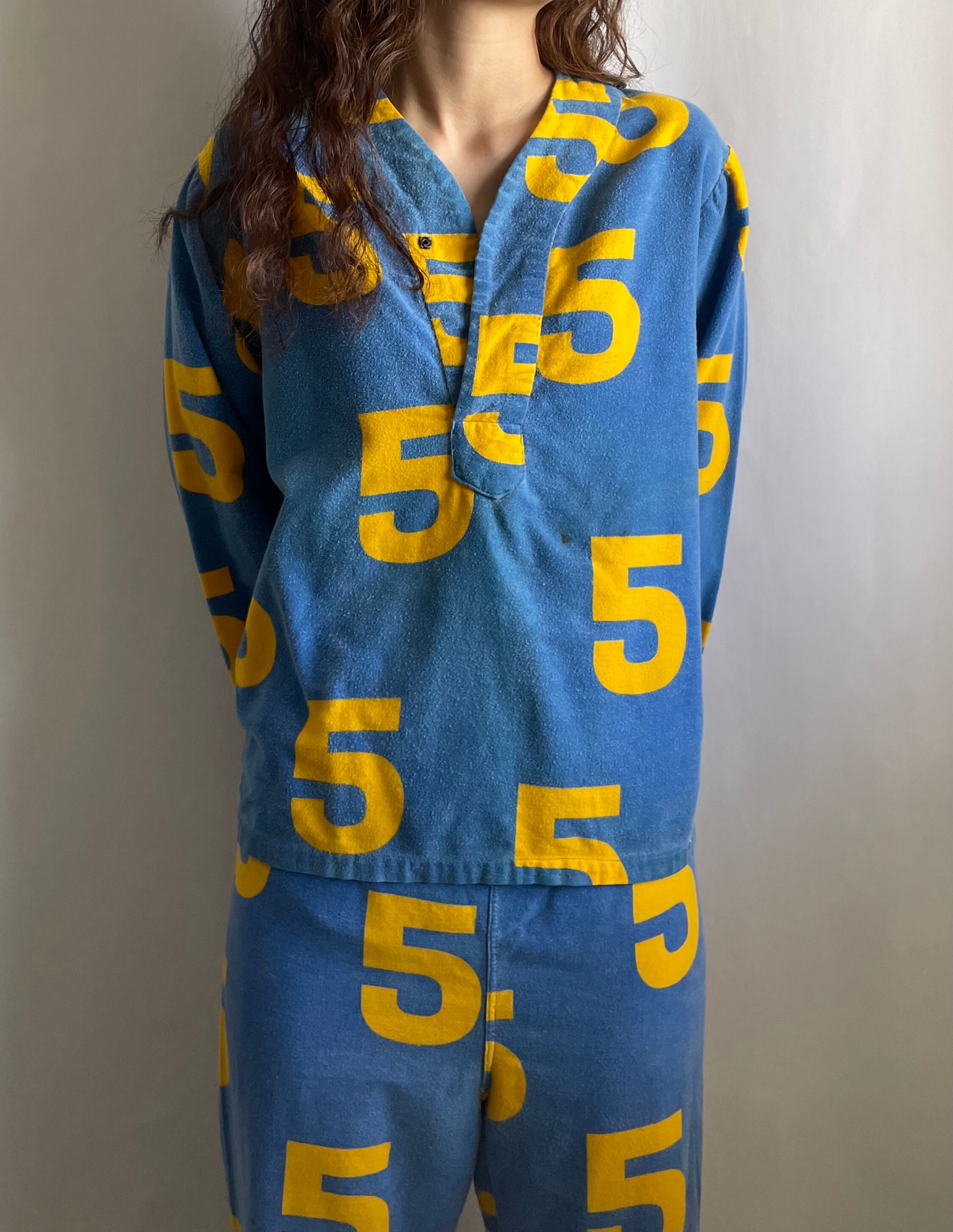 当時の手作りパジャマ?見たことのないファブリックのパターンです。