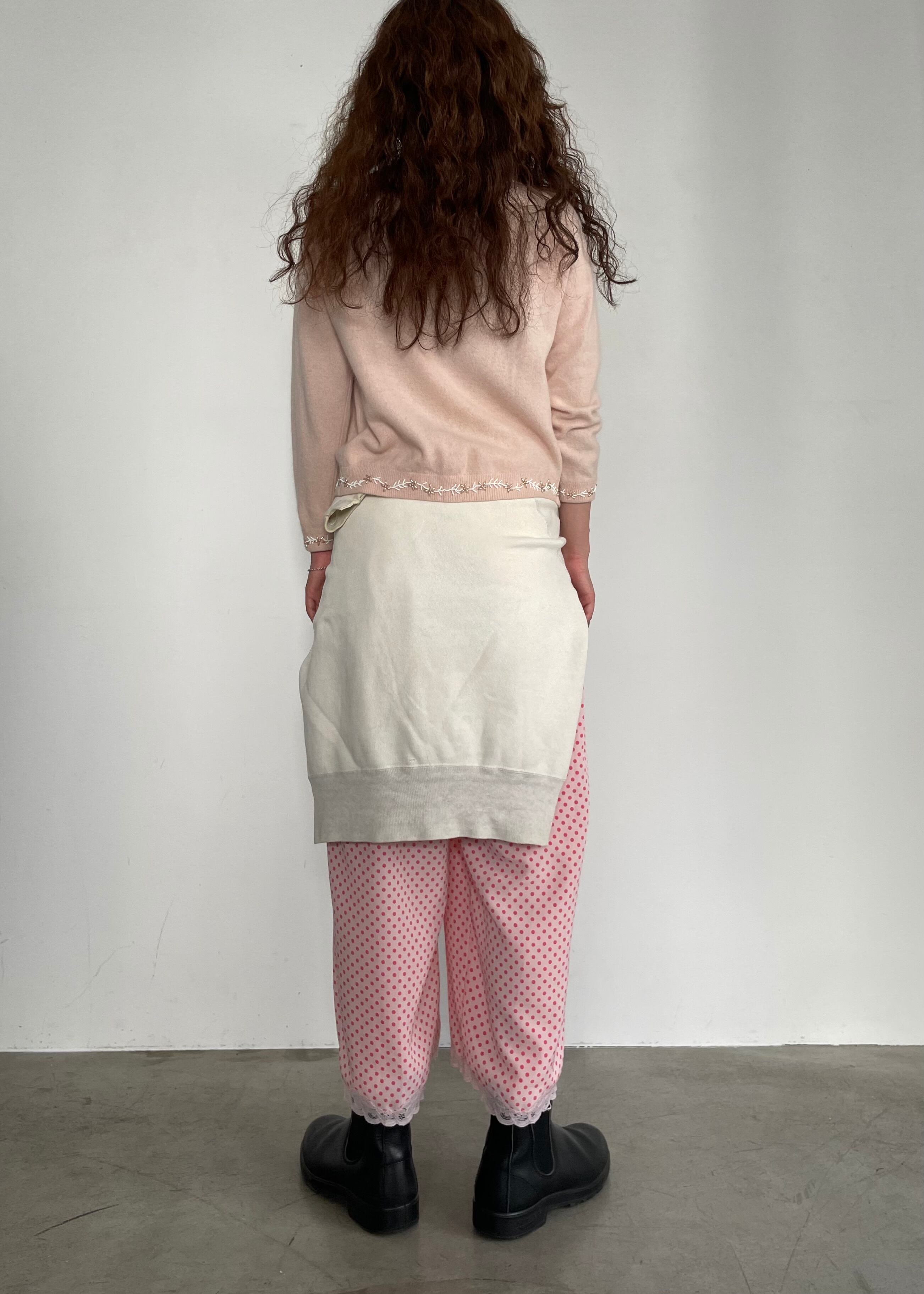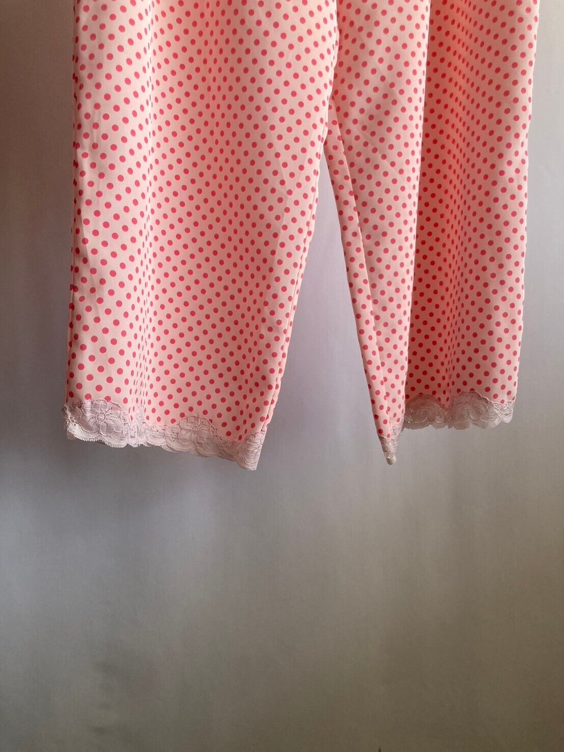 ピンク×ピンクのドッド模様。しかも裾にはレースまで。重たくなりそうなイメージなのですが、とっても纏まりのあるオシャレパンツ