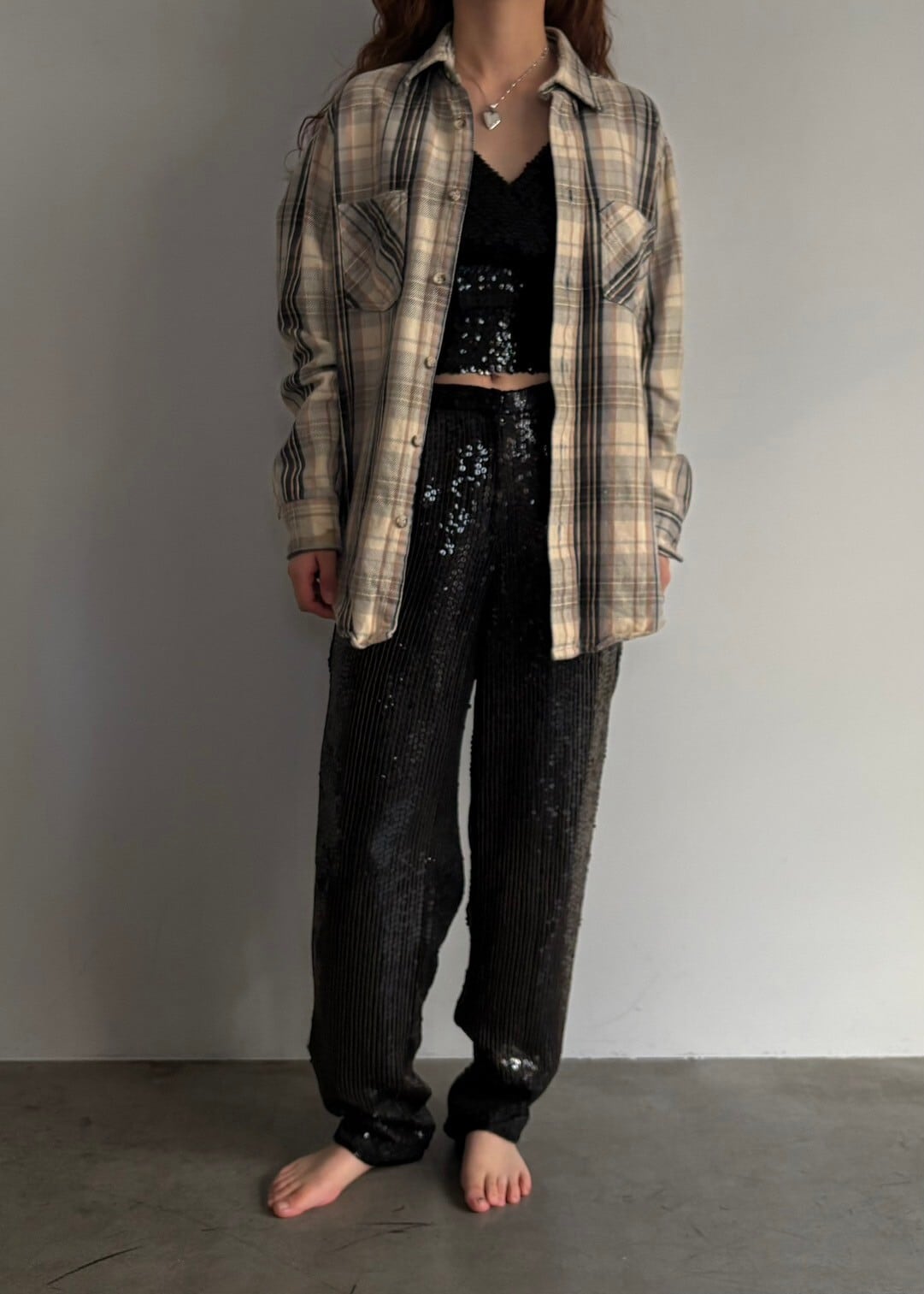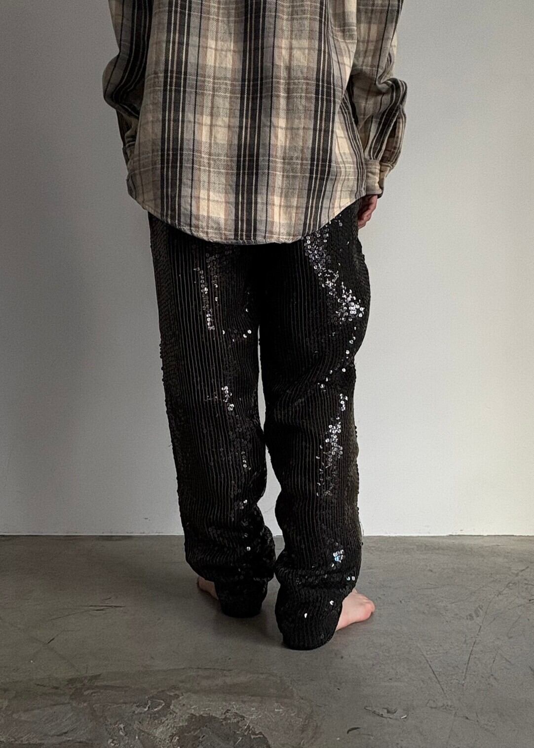 縫製やスパンコールも比較的しっかりしておりまして、チープじゃない少し古いやつです。それに加えて形のいいパンツ。