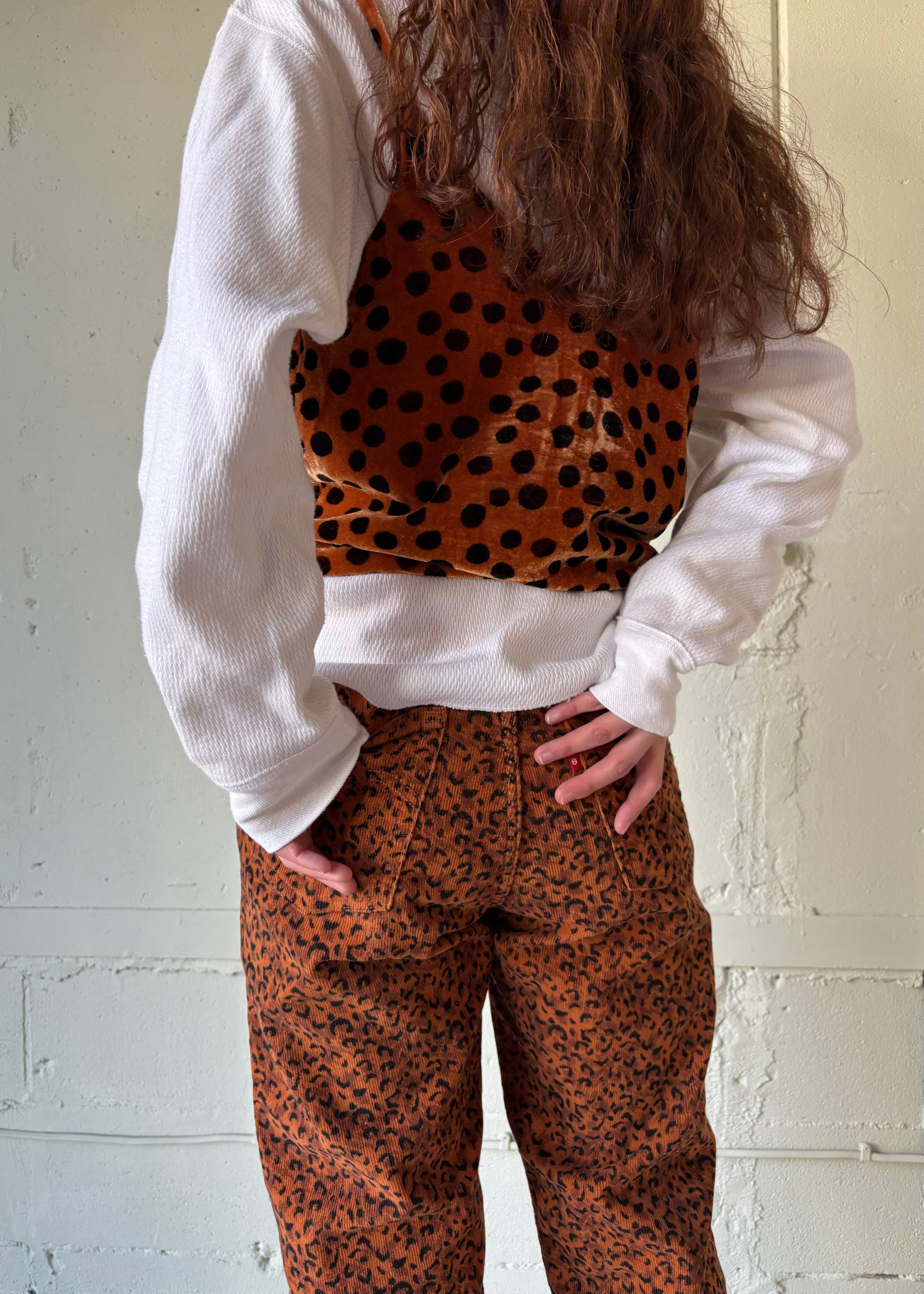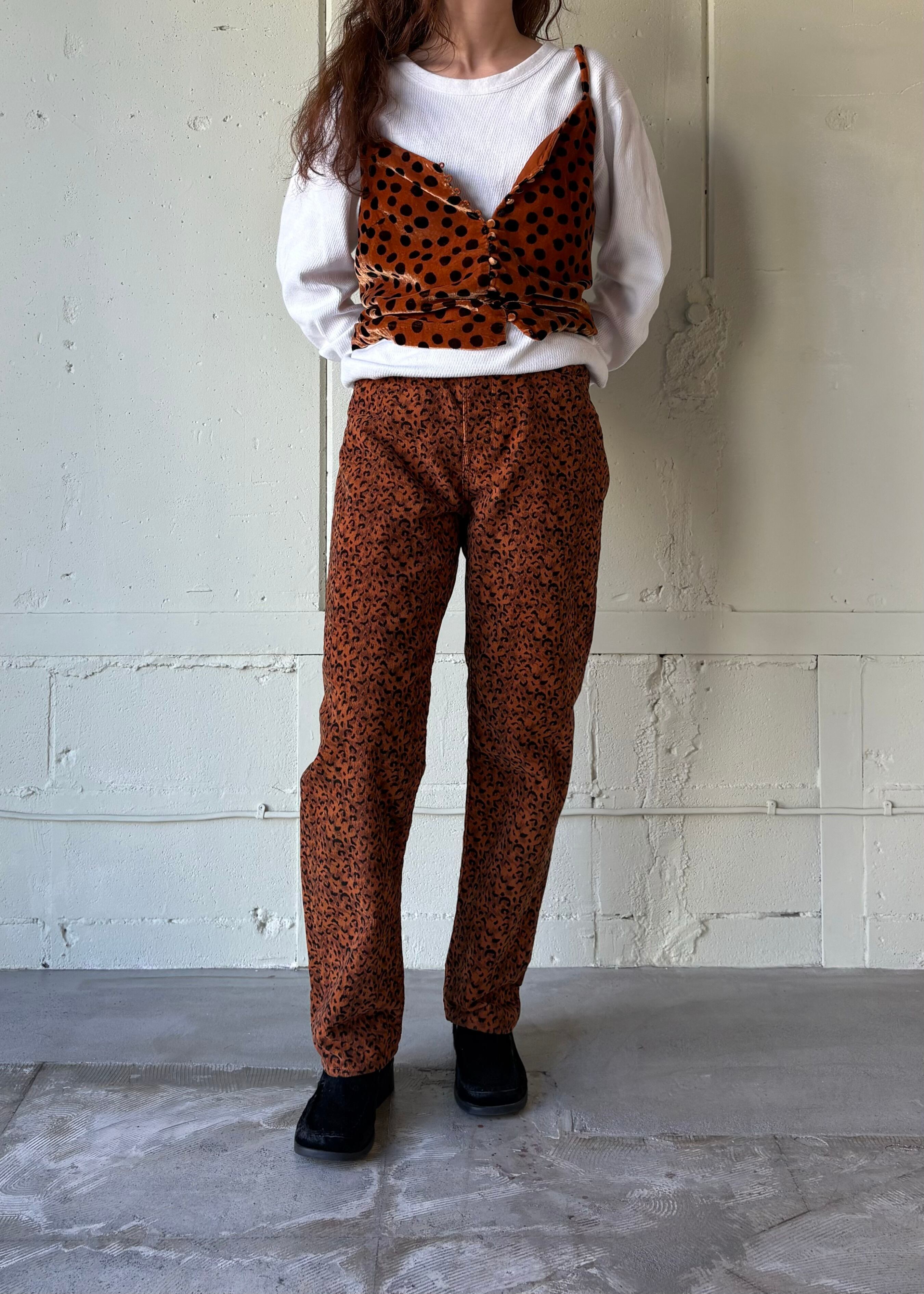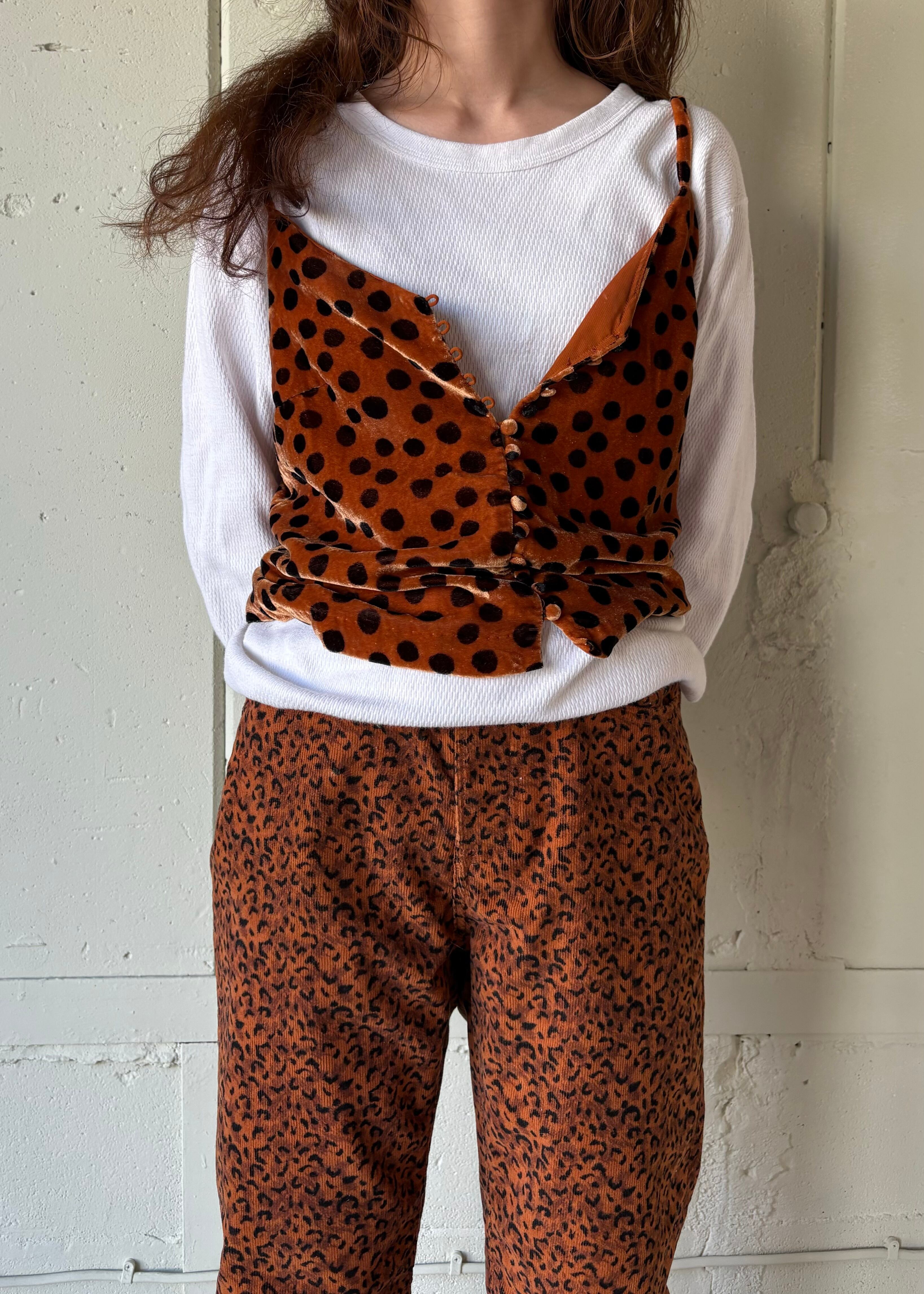 ベロアのドッド柄ですが、レオパードのようですね。ボロい服や古い服、評価の高いような類の古着etc…そういう服の角をとってくれる服だと思います。