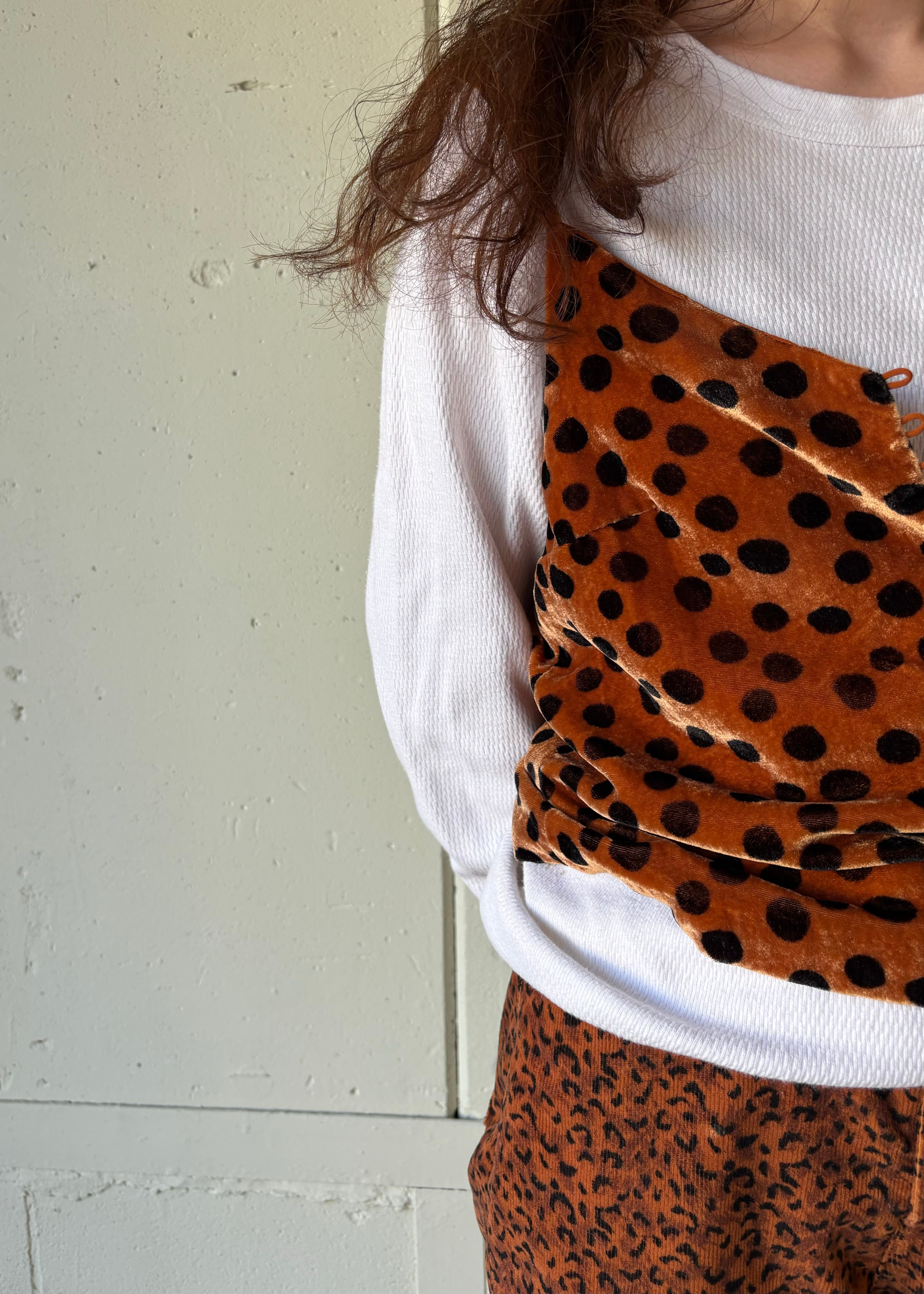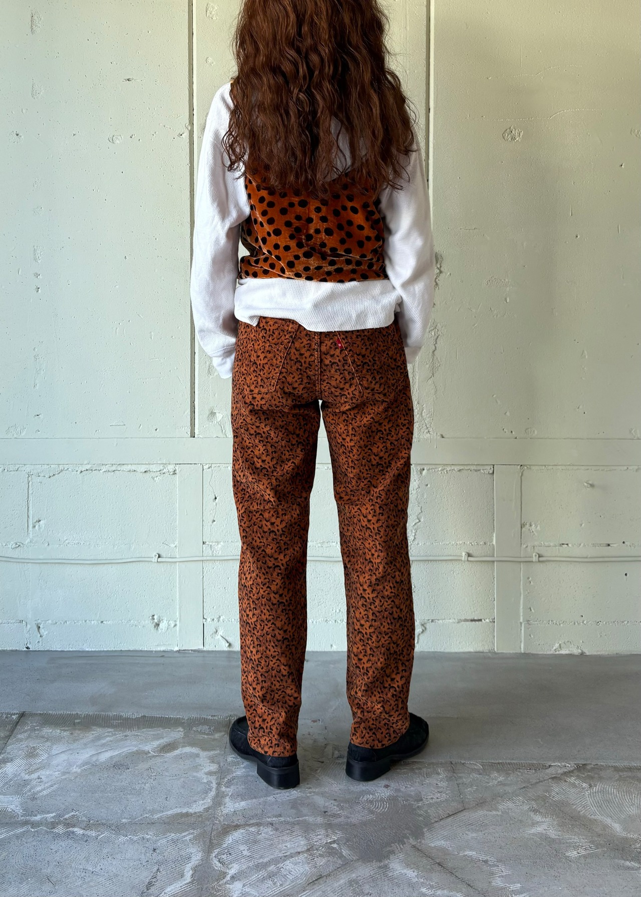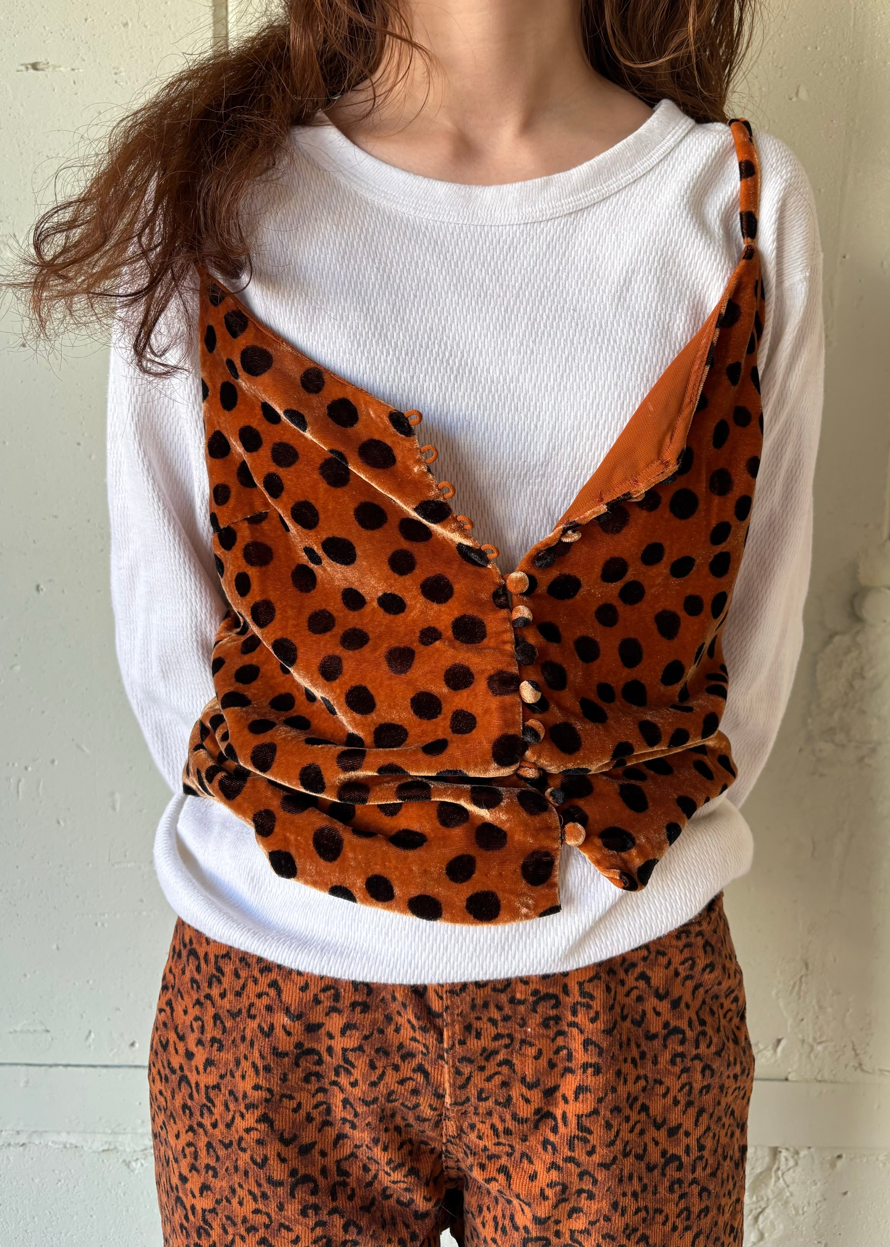 ベロアのドッド柄ですが、レオパードのようですね。ボロい服や古い服、評価の高いような類の古着etc…そういう服の角をとってくれる服だと思います。